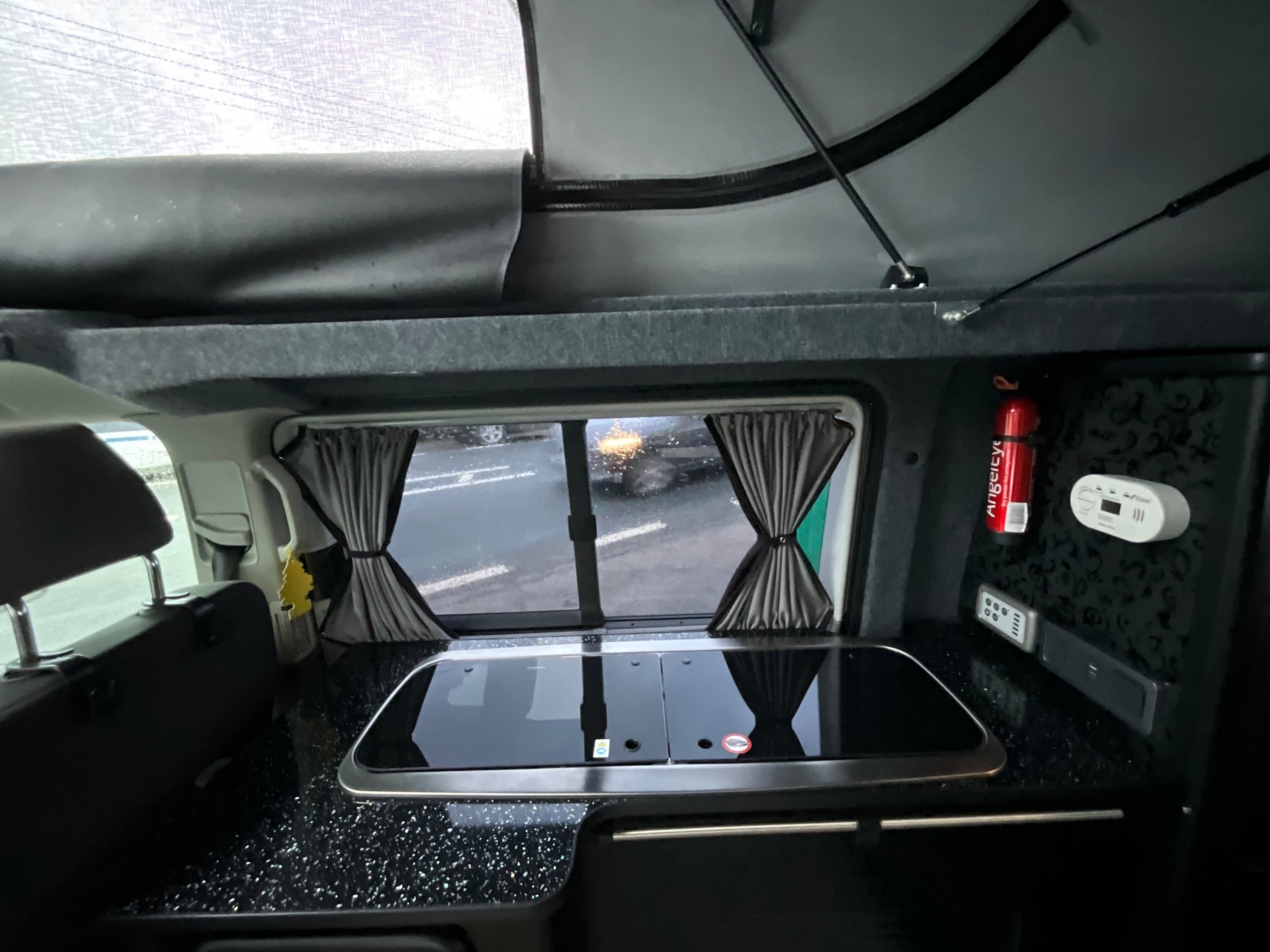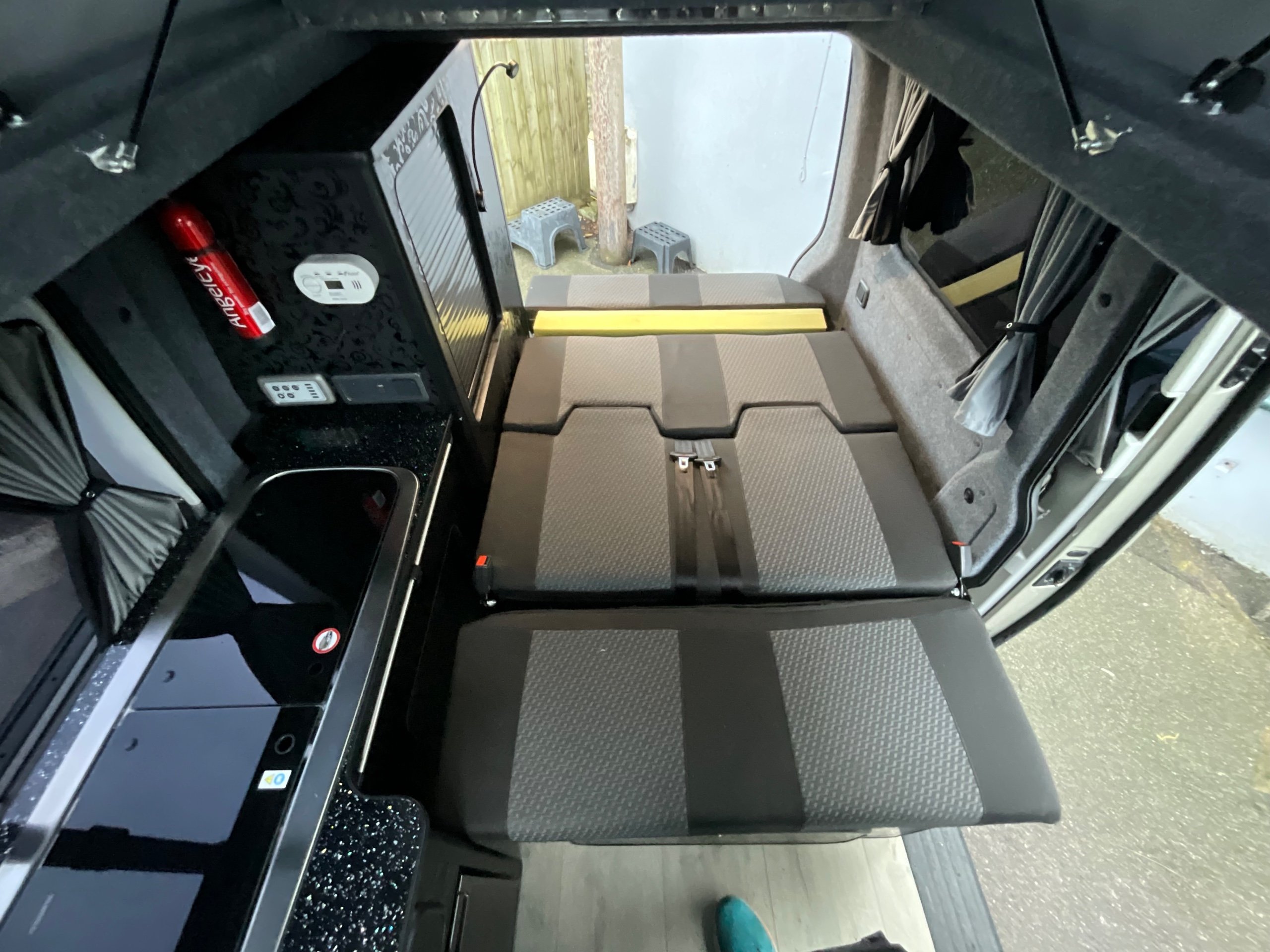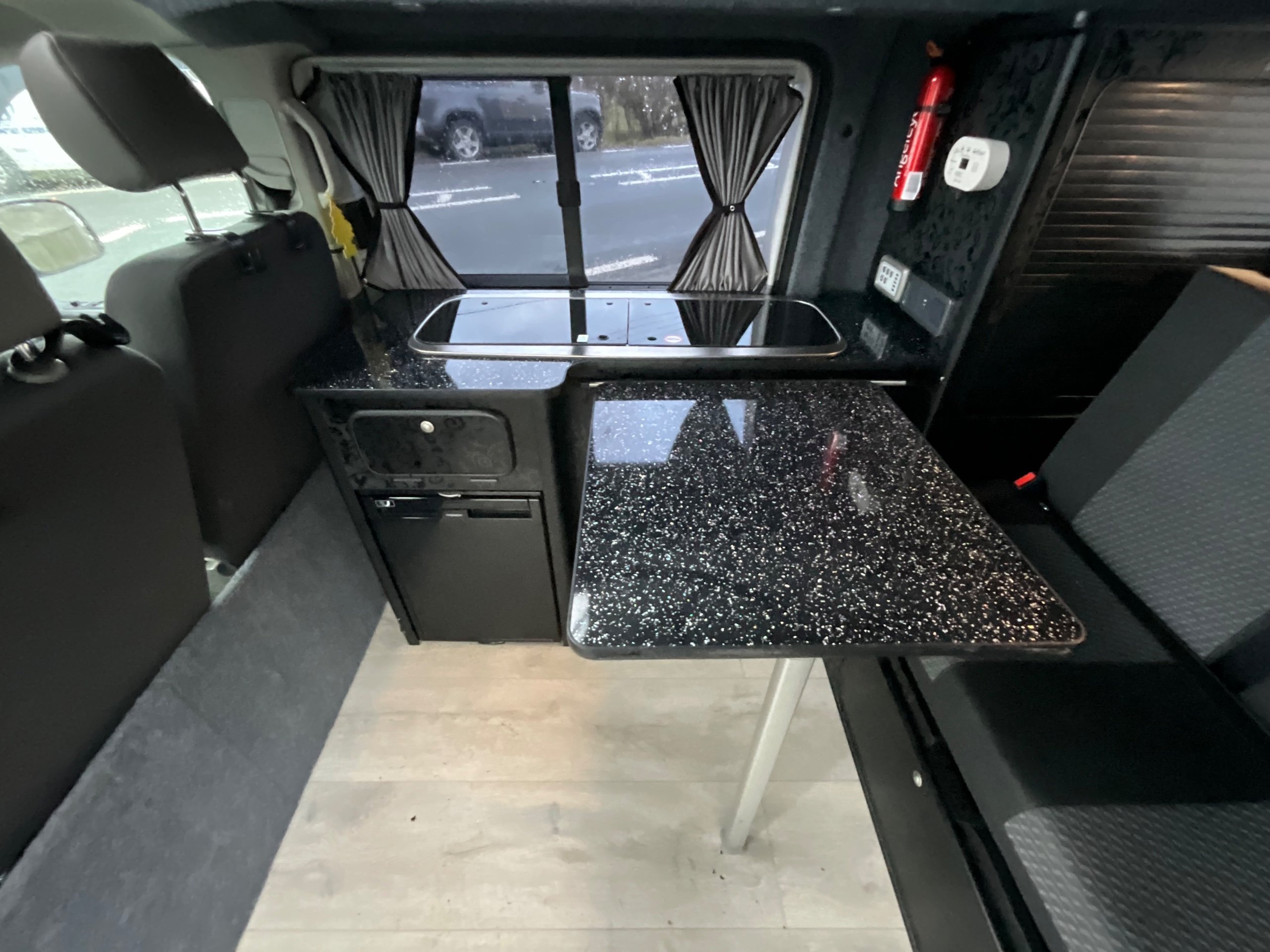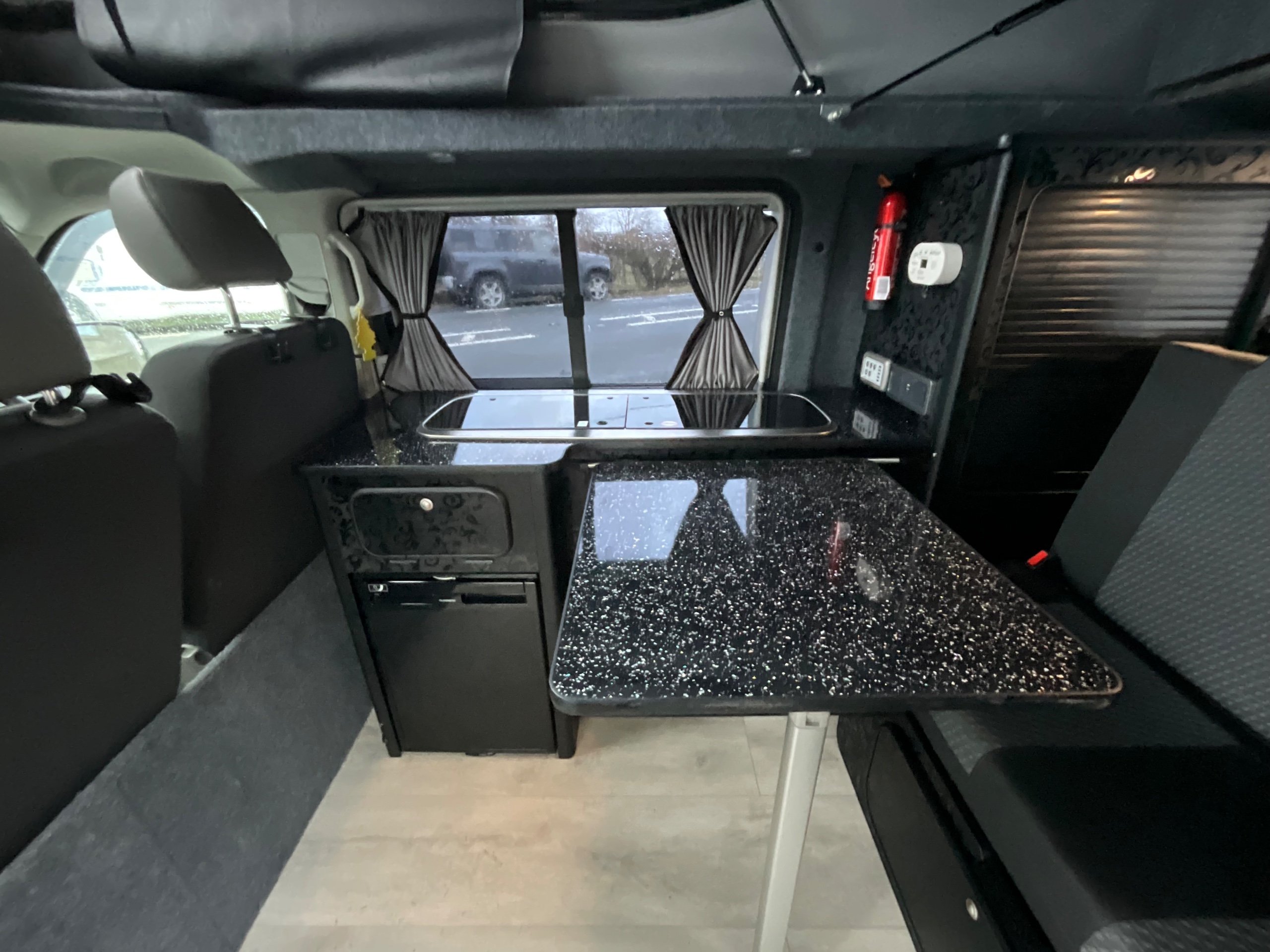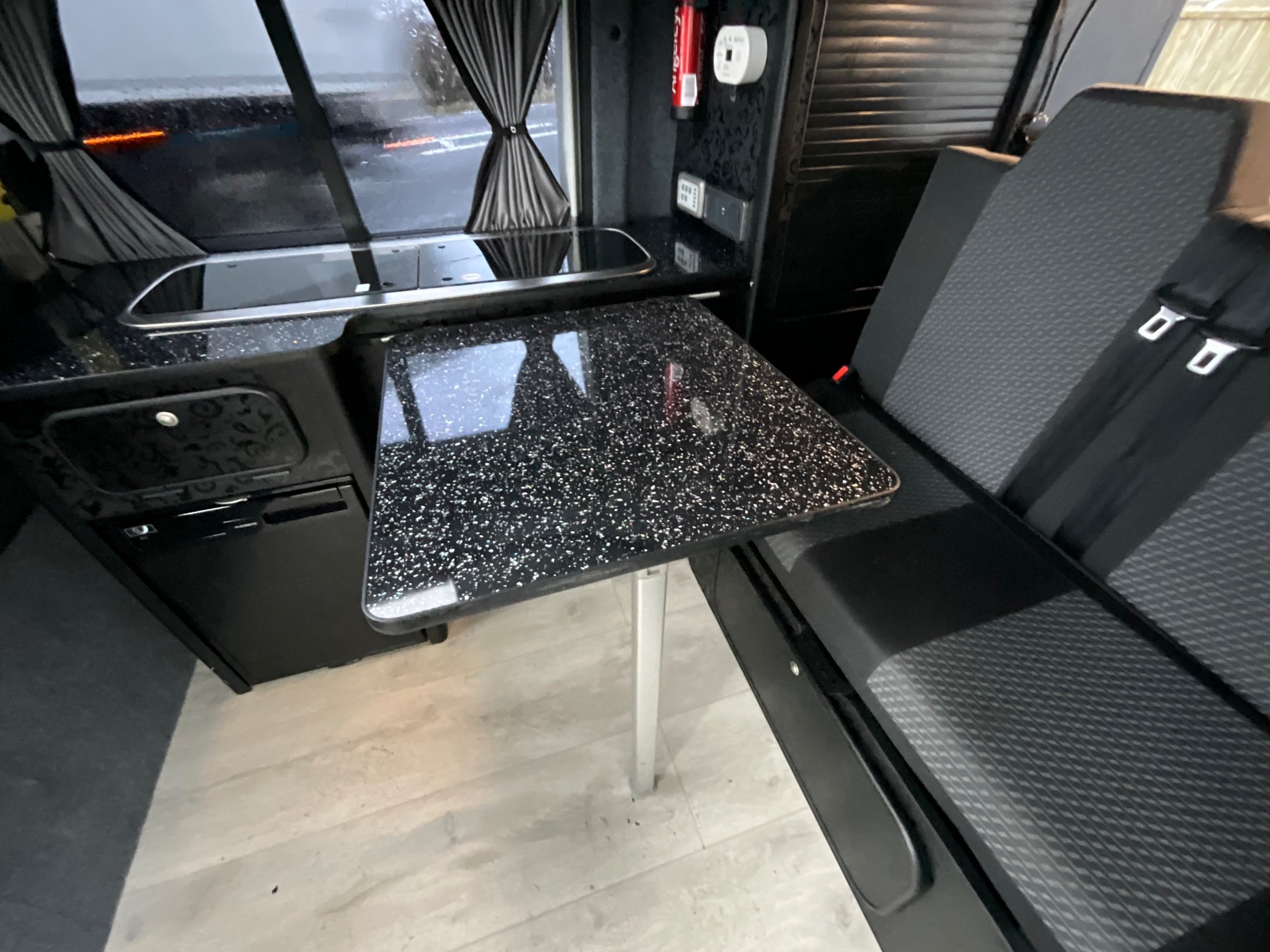 The seats in the back are created out of the crash tested and approved Rock ‘n’ Roll bed (forming a spacious doubled bed) to have the classic VW layout inside, while still having the all the standard comforts as well as belted seats. The fridge is 12V, with the fridge having a freezer box. There is also a removeable table. A double swivel seat for extending the social space and ease of sleeping upstairs. There is also a domestic double gas hob (working off a camping gas bottle), and a sink with an electrical water pump which is connected to a fresh water container. There is also 240V hook up. The van has plenty of storage throughout the motorhome as well.