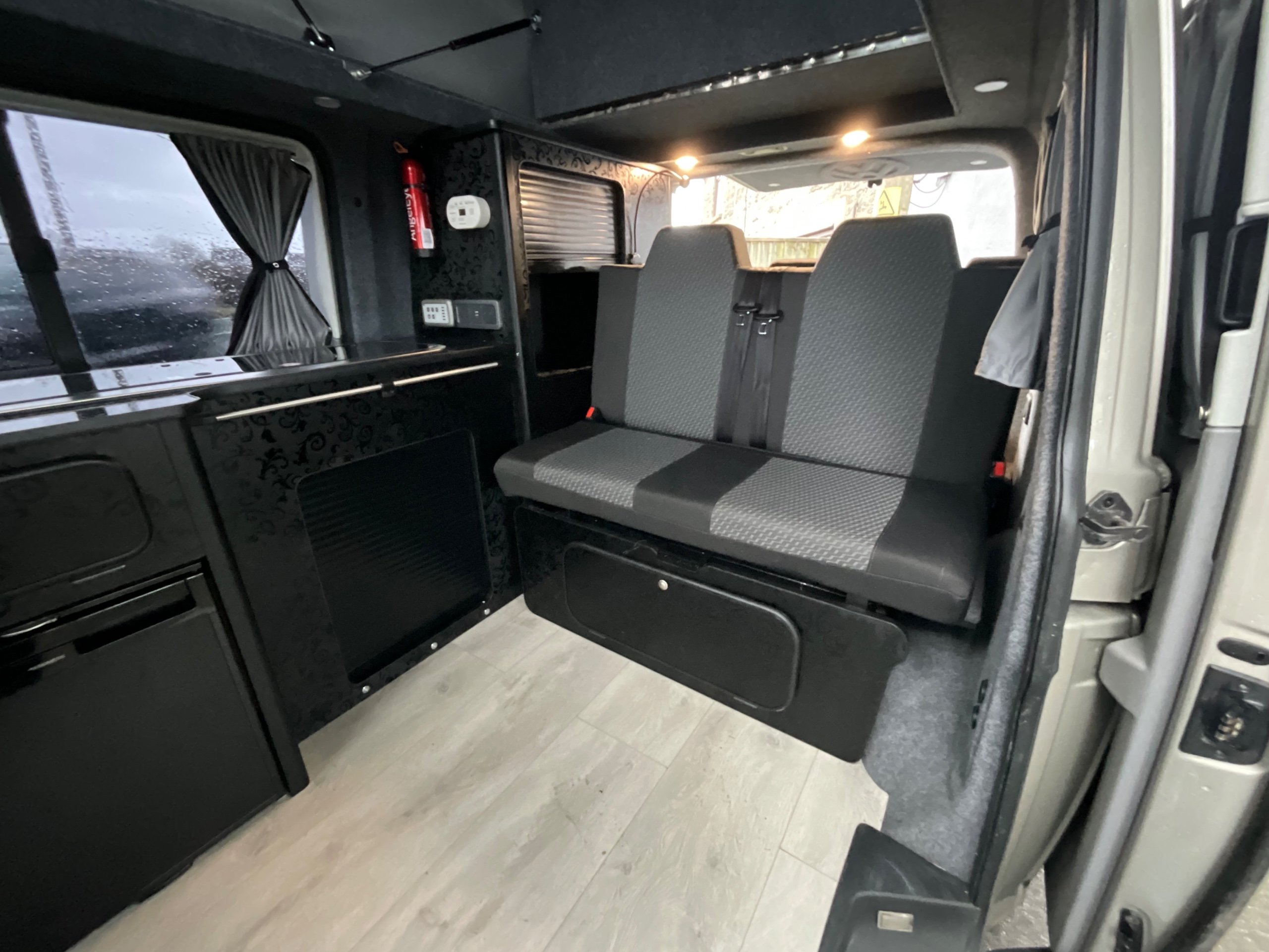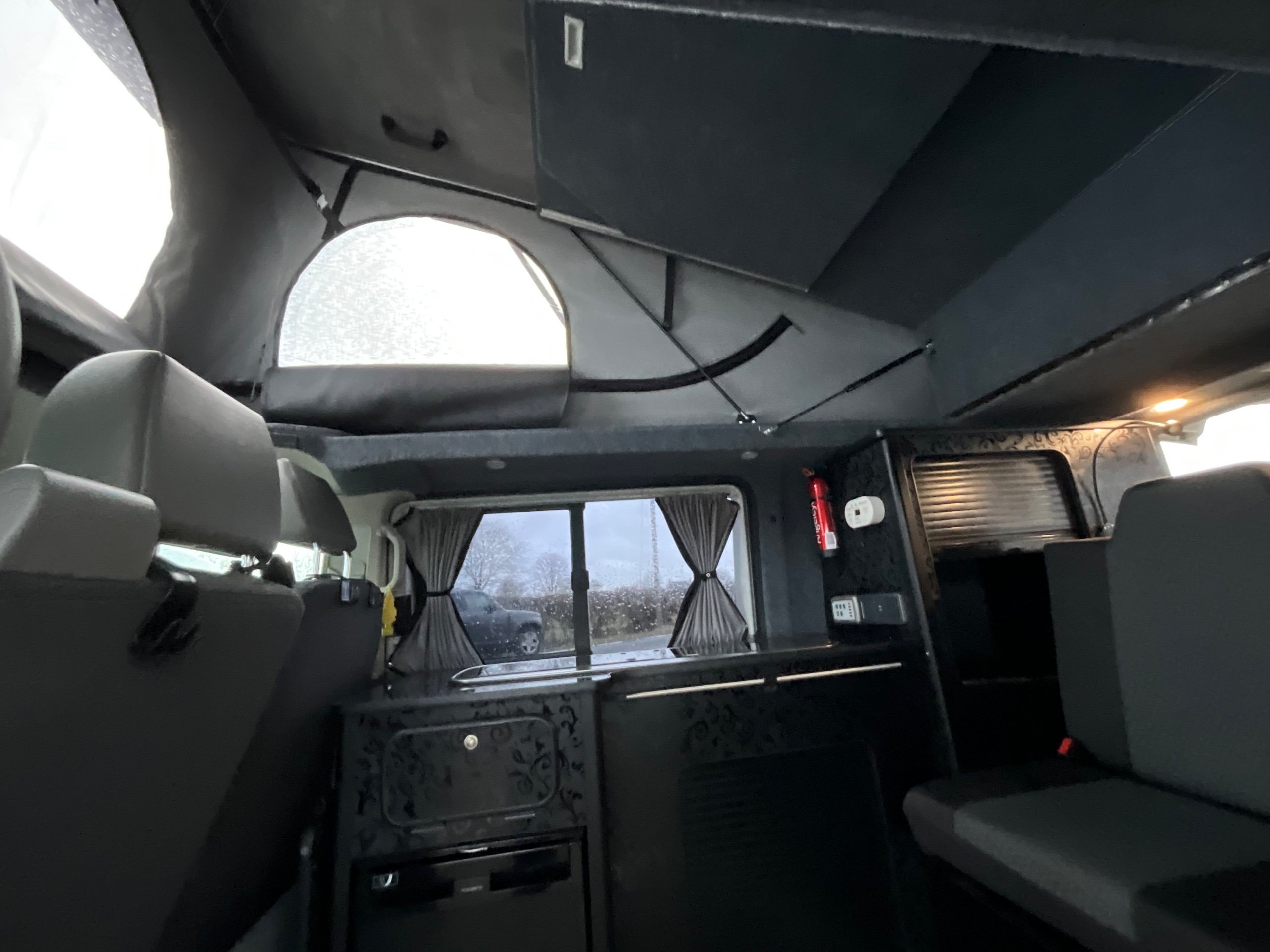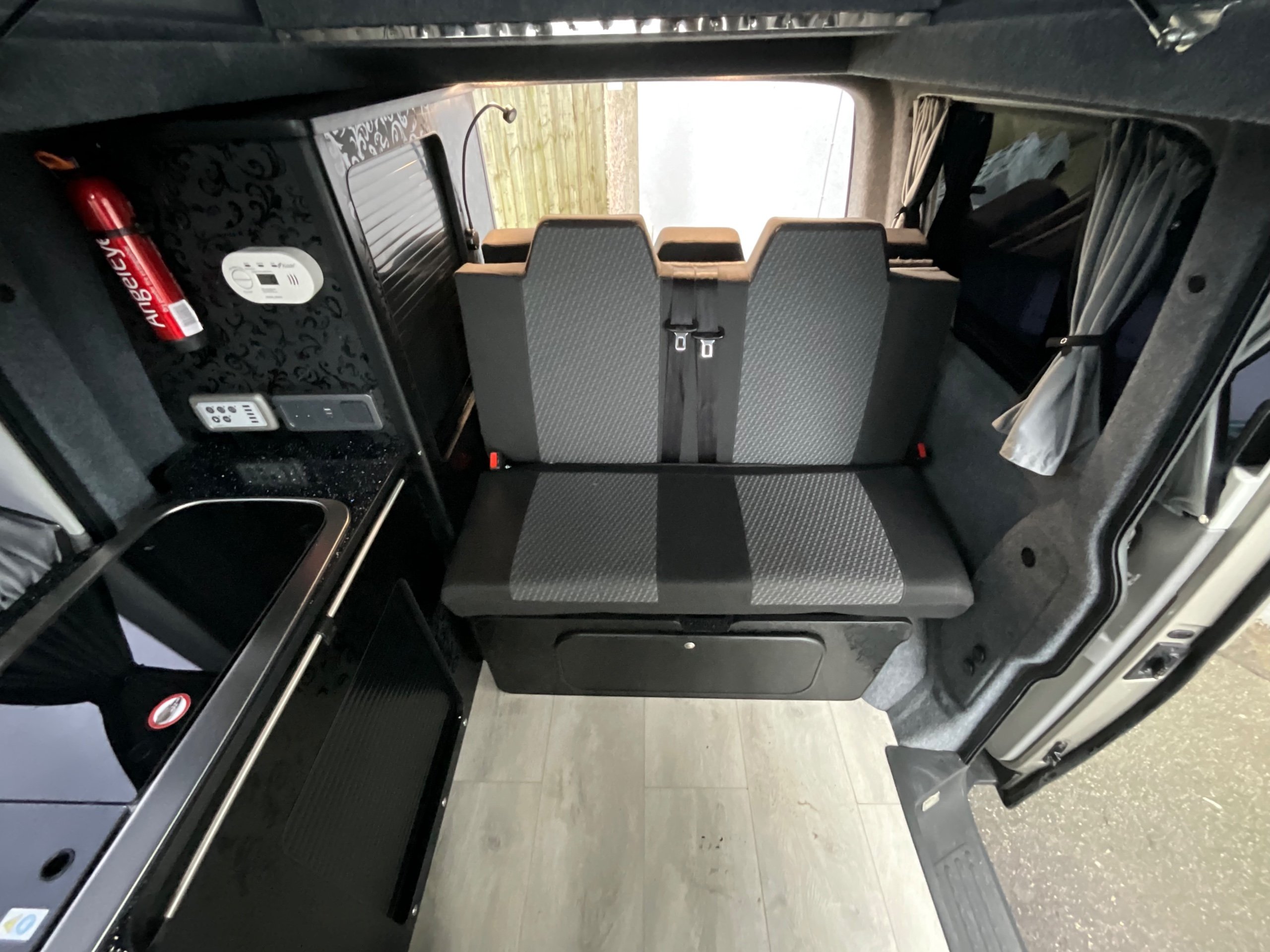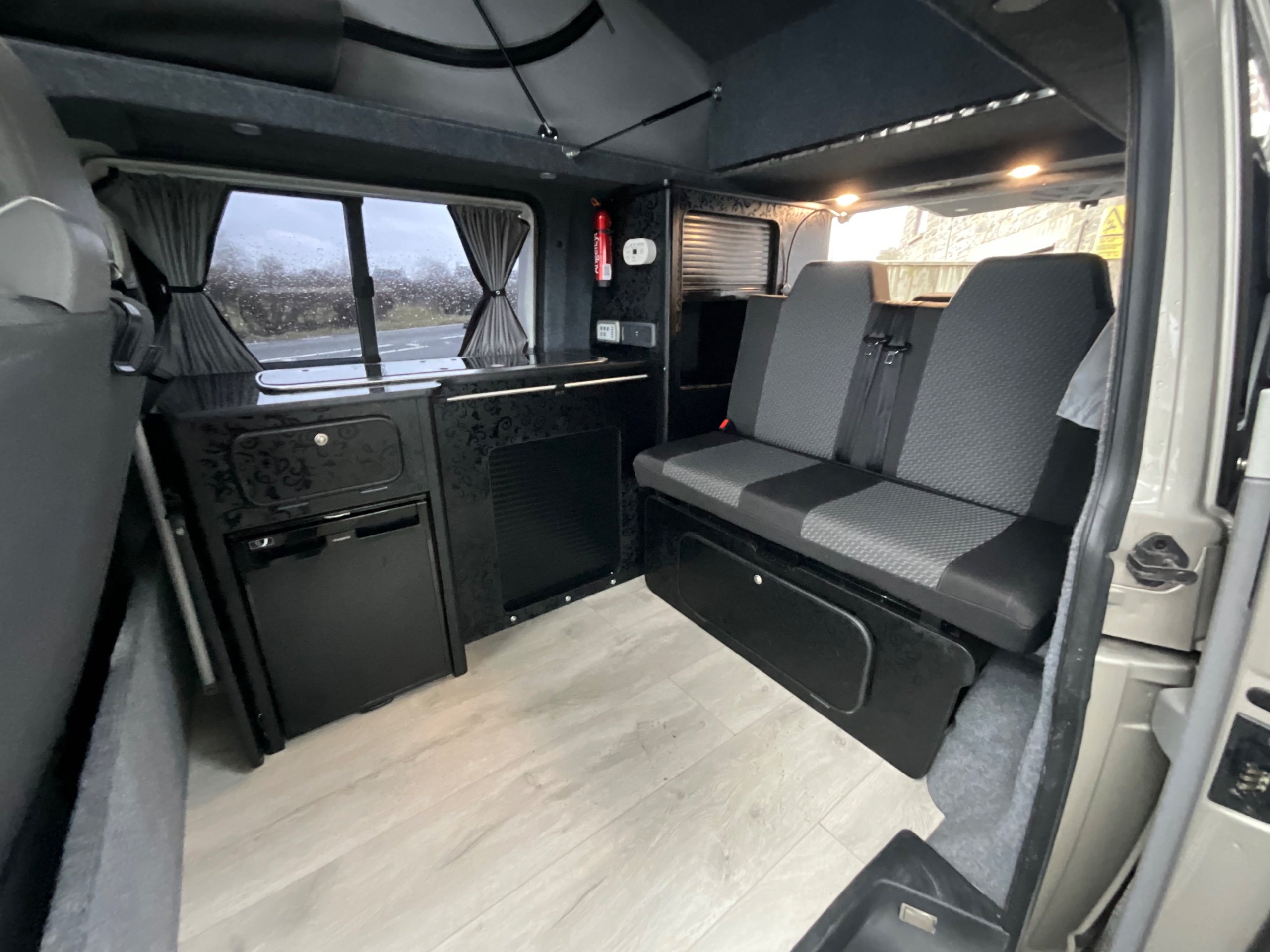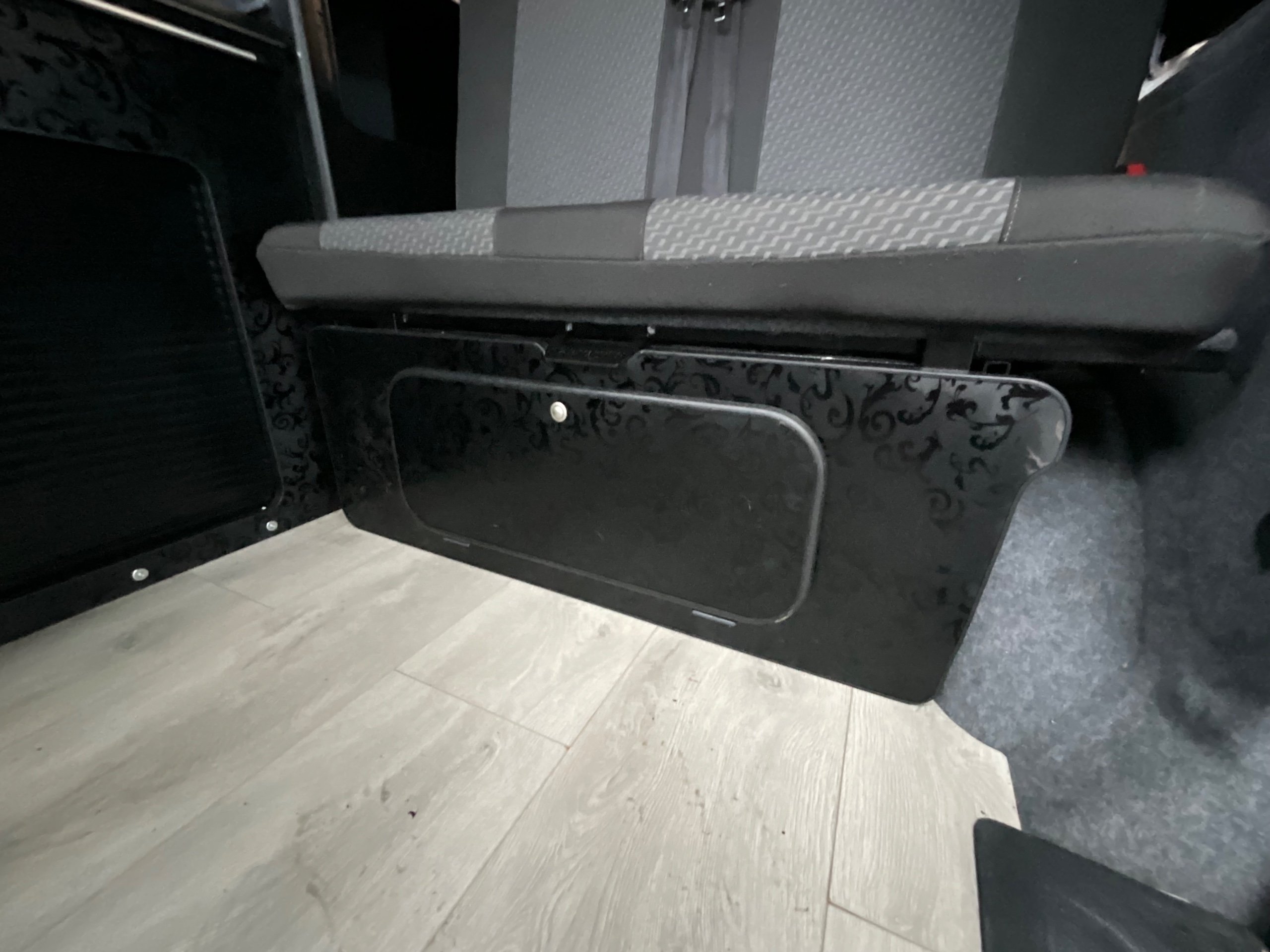 The seats in the back are created out of the crash tested and approved Rock ‘n’ Roll bed (forming a spacious doubled bed) to have the classic VW layout inside, while still having the all the standard comforts as well as belted seats. The fridge is 12V, with the fridge having a freezer box. There is also a removeable table. A double swivel seat for extending the social space and ease of sleeping upstairs. There is also a domestic double gas hob (working off a camping gas bottle), and a sink with an electrical water pump which is connected to a fresh water container. There is also 240V hook up. The van has plenty of storage throughout the motorhome as well.