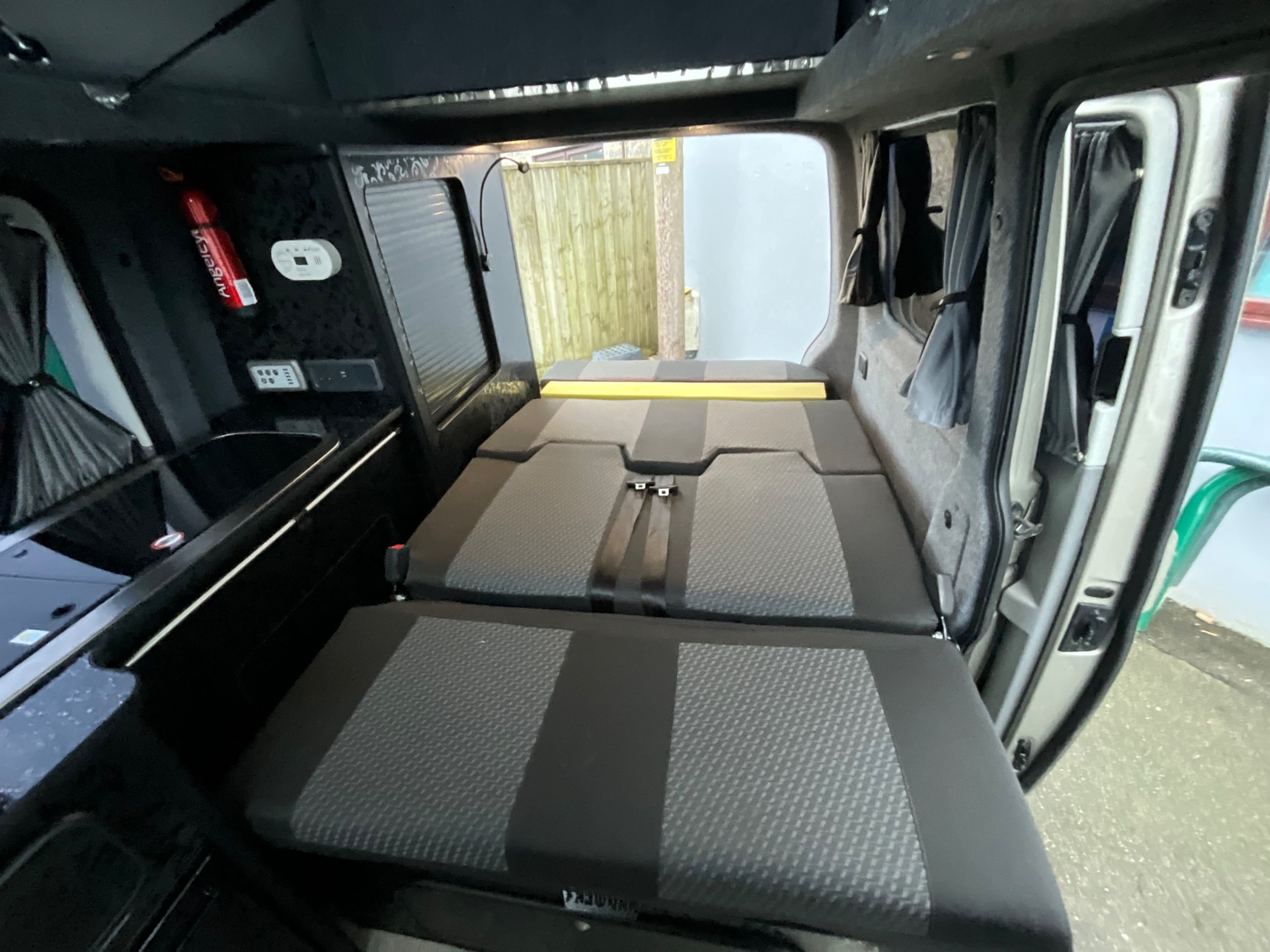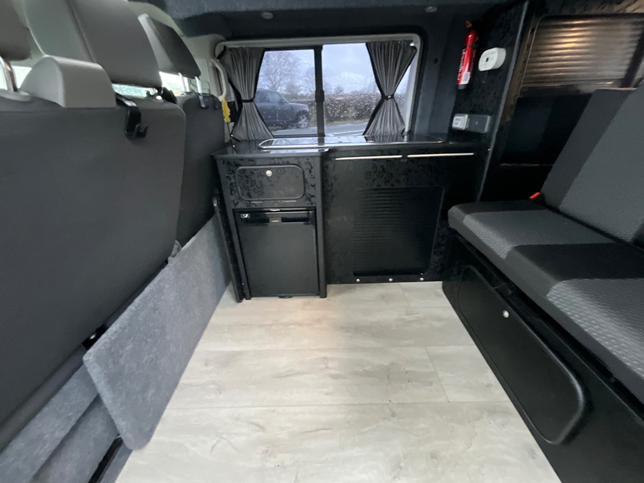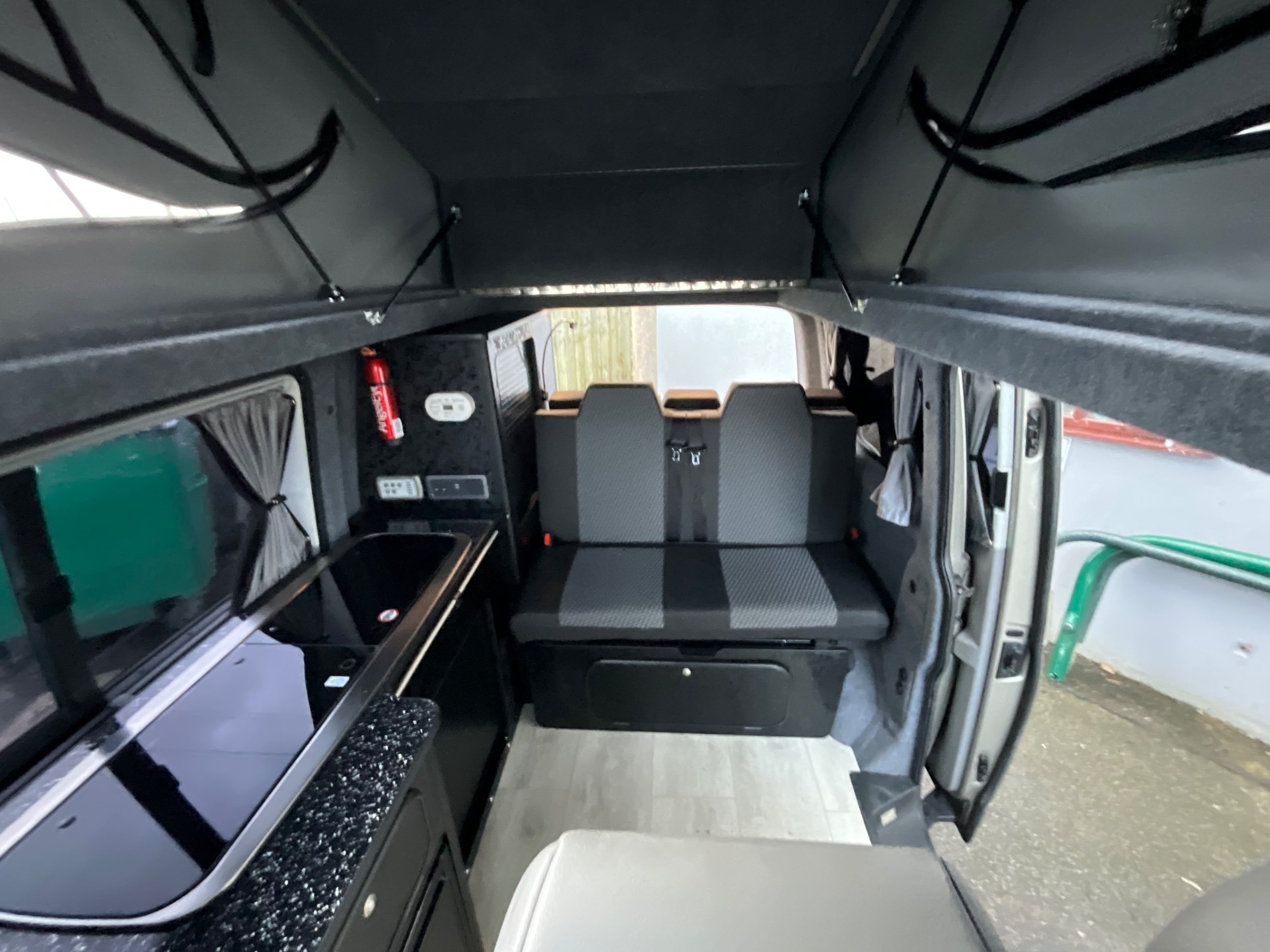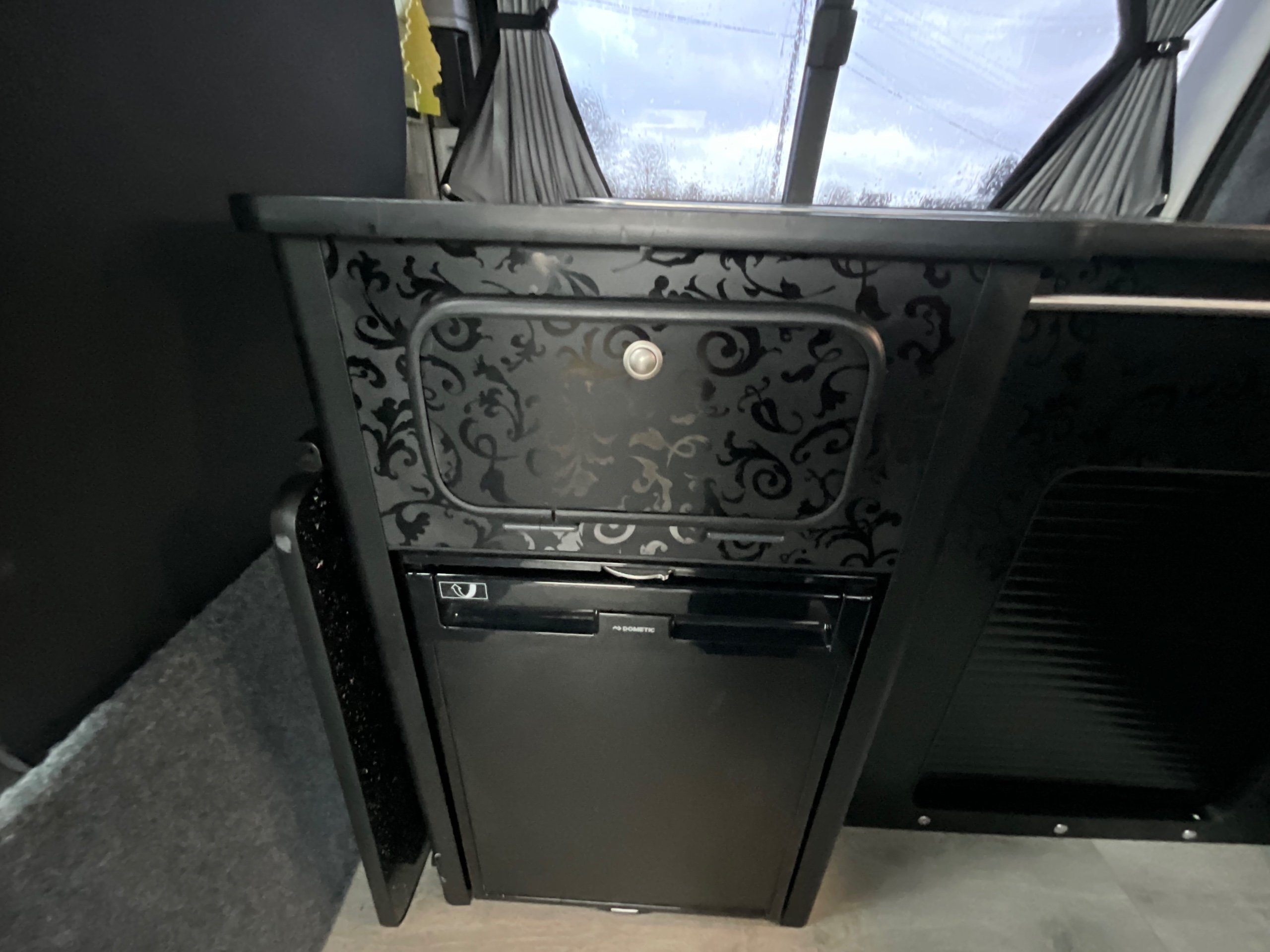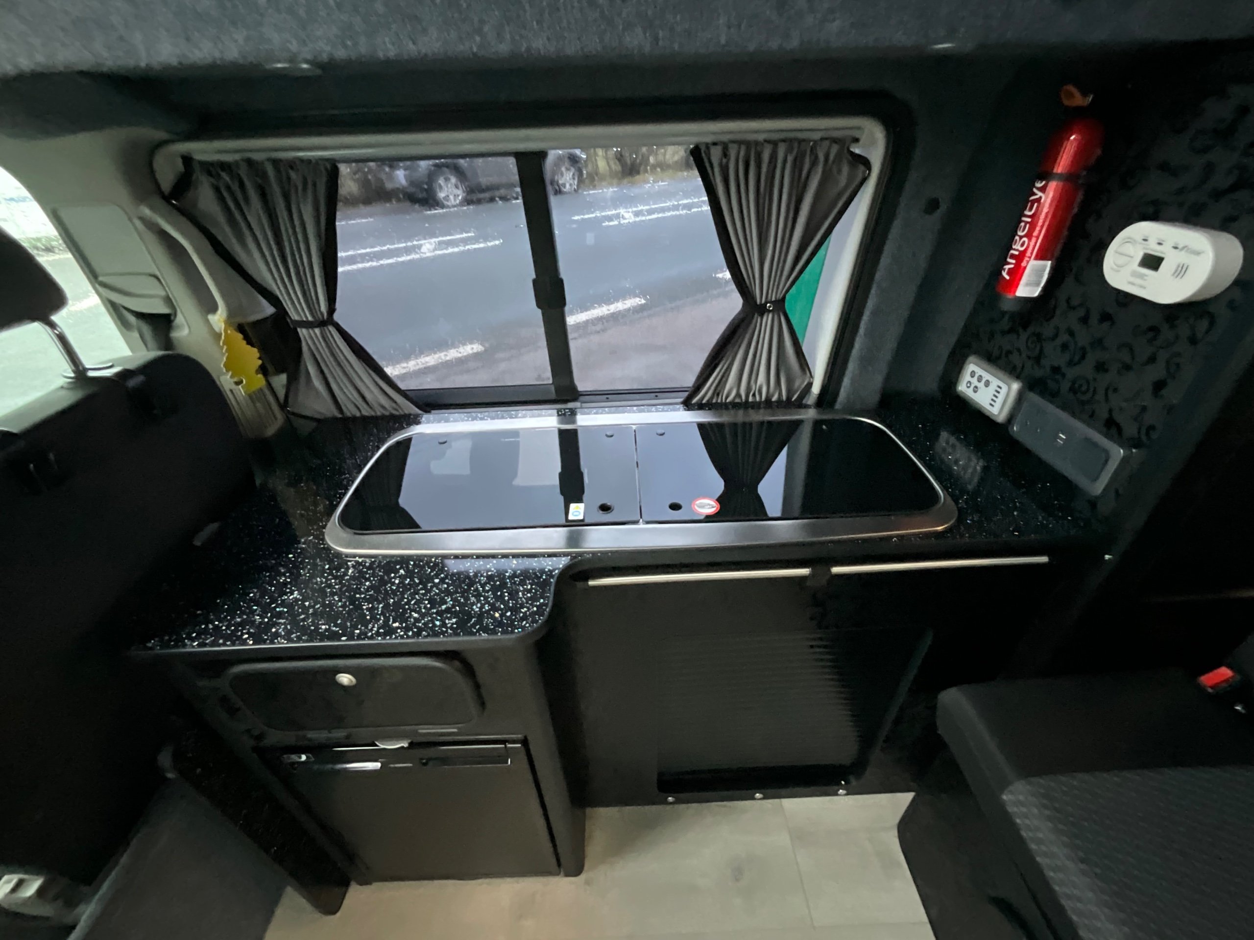 The seats in the back are created out of the crash tested and approved Rock ‘n’ Roll bed (forming a spacious doubled bed) to have the classic VW layout inside, while still having the all the standard comforts as well as belted seats. The fridge is 12V, with the fridge having a freezer box. There is also a removeable table. A double swivel seat for extending the social space and ease of sleeping upstairs. There is also a domestic double gas hob (working off a camping gas bottle), and a sink with an electrical water pump which is connected to a fresh water container. There is also 240V hook up. The van has plenty of storage throughout the motorhome as well.