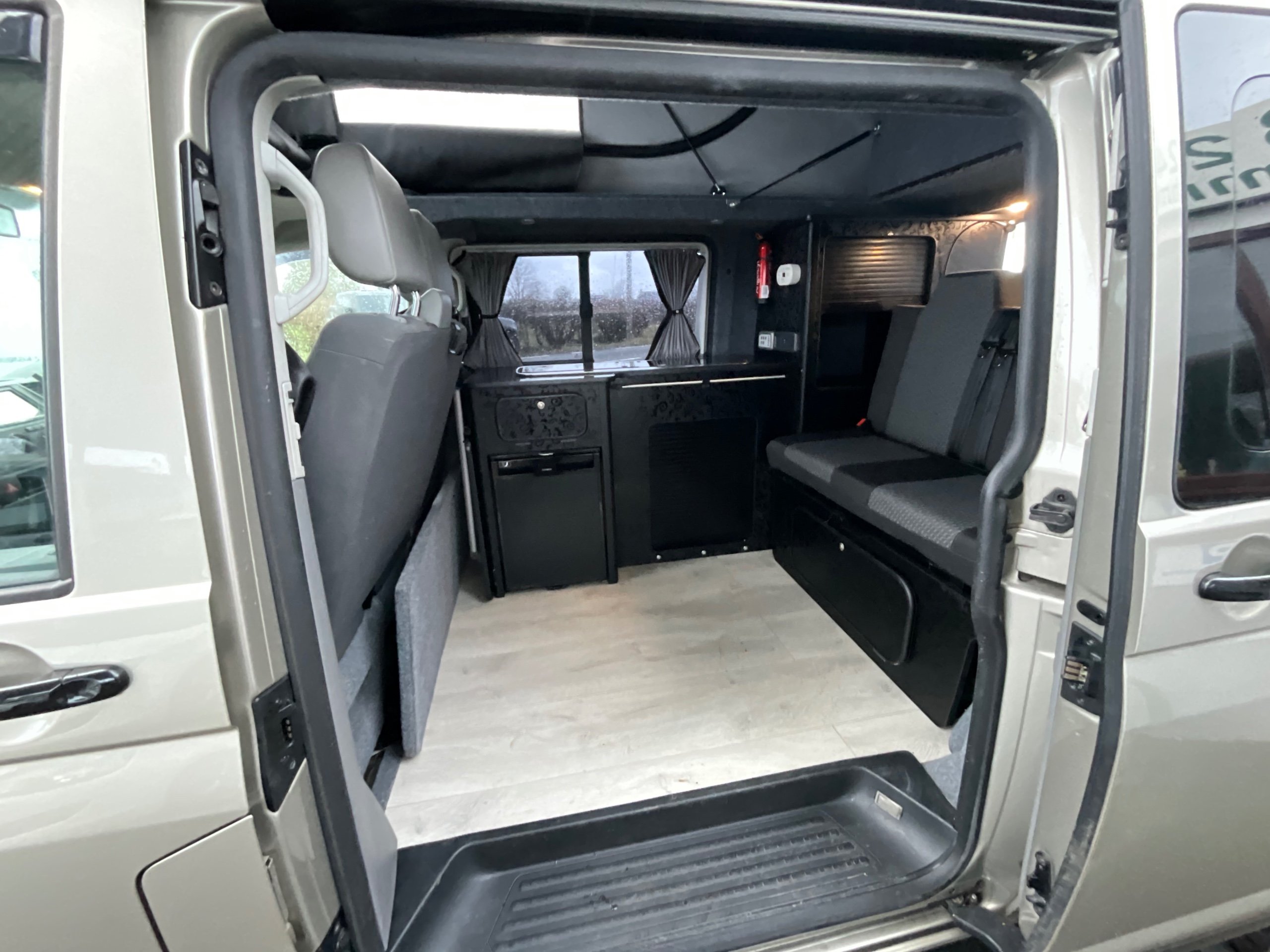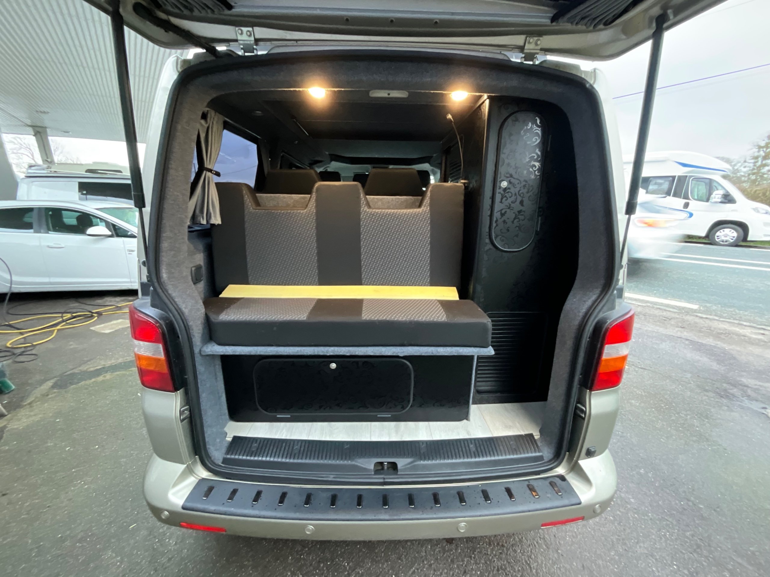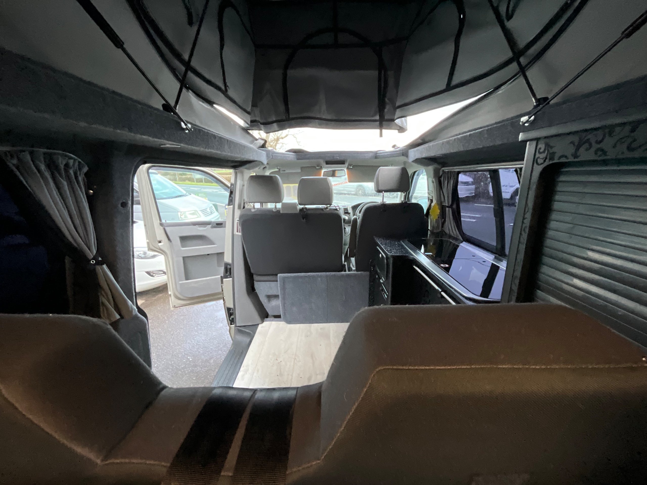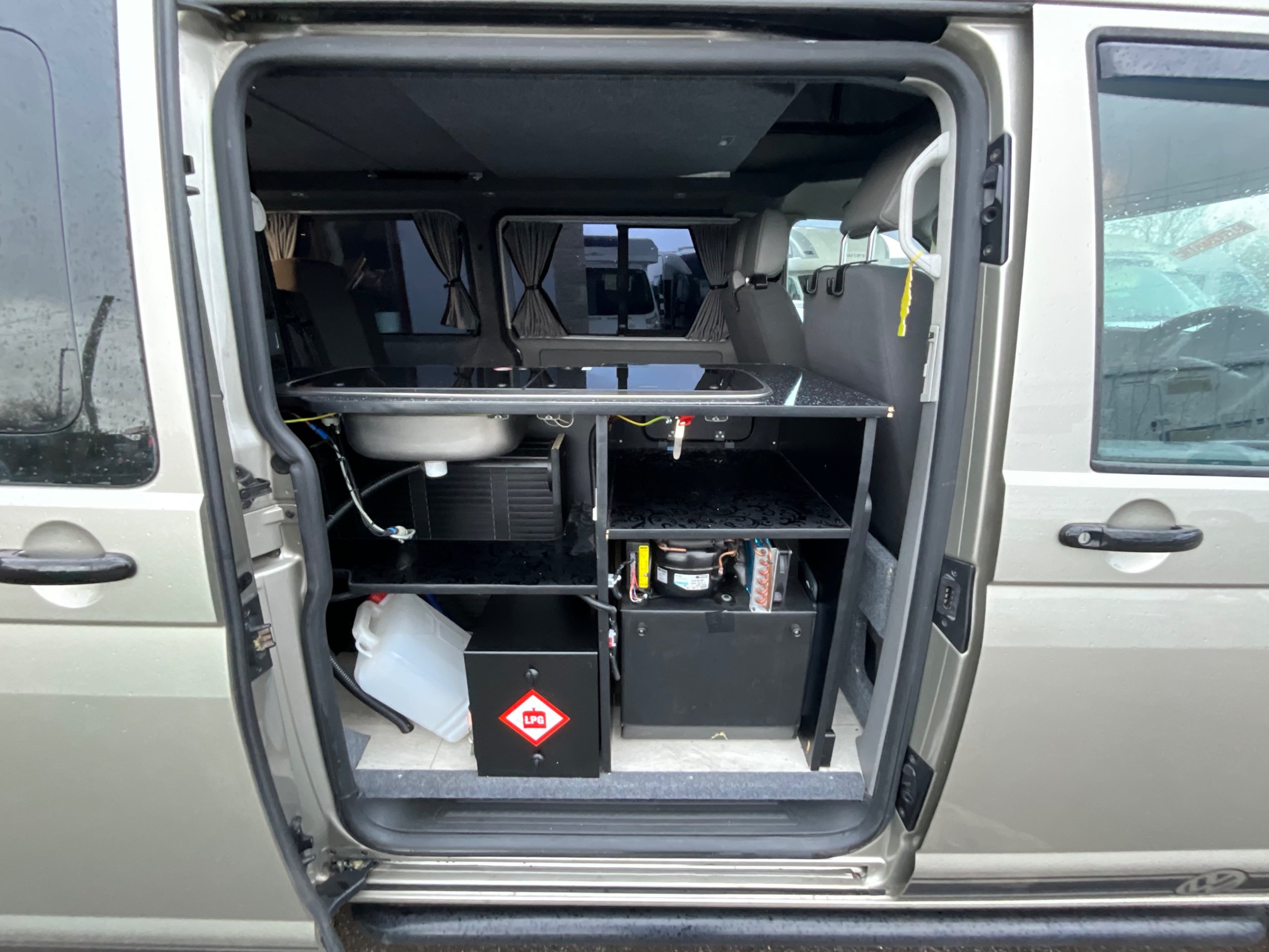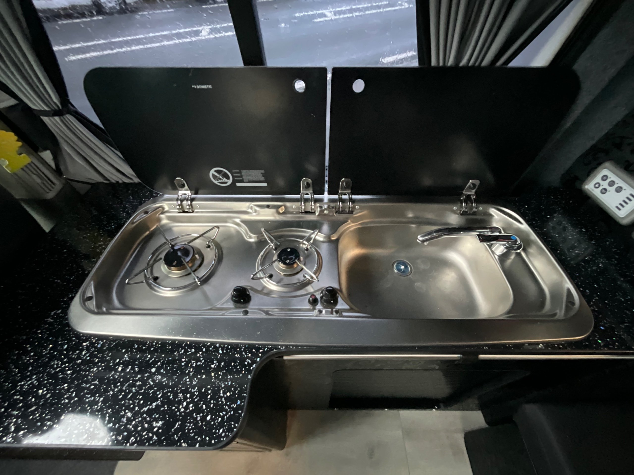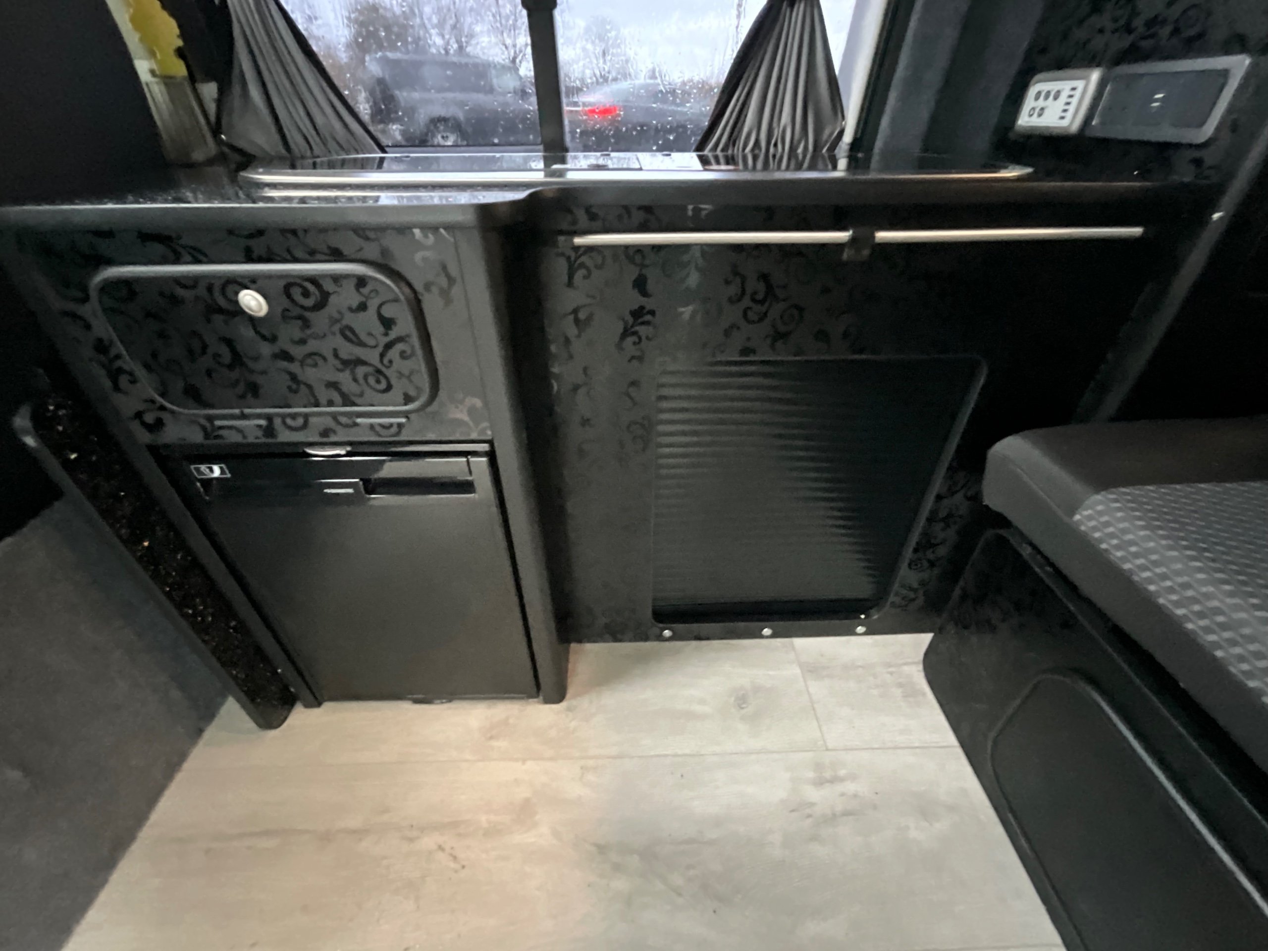 The seats in the back are created out of the crash tested and approved Rock ‘n’ Roll bed (forming a spacious doubled bed) to have the classic VW layout inside, while still having the all the standard comforts as well as belted seats. The fridge is 12V, with the fridge having a freezer box. There is also a removeable table. A double swivel seat for extending the social space and ease of sleeping upstairs. There is also a domestic double gas hob (working off a camping gas bottle), and a sink with an electrical water pump which is connected to a fresh water container. There is also 240V hook up. The van has plenty of storage throughout the motorhome as well.