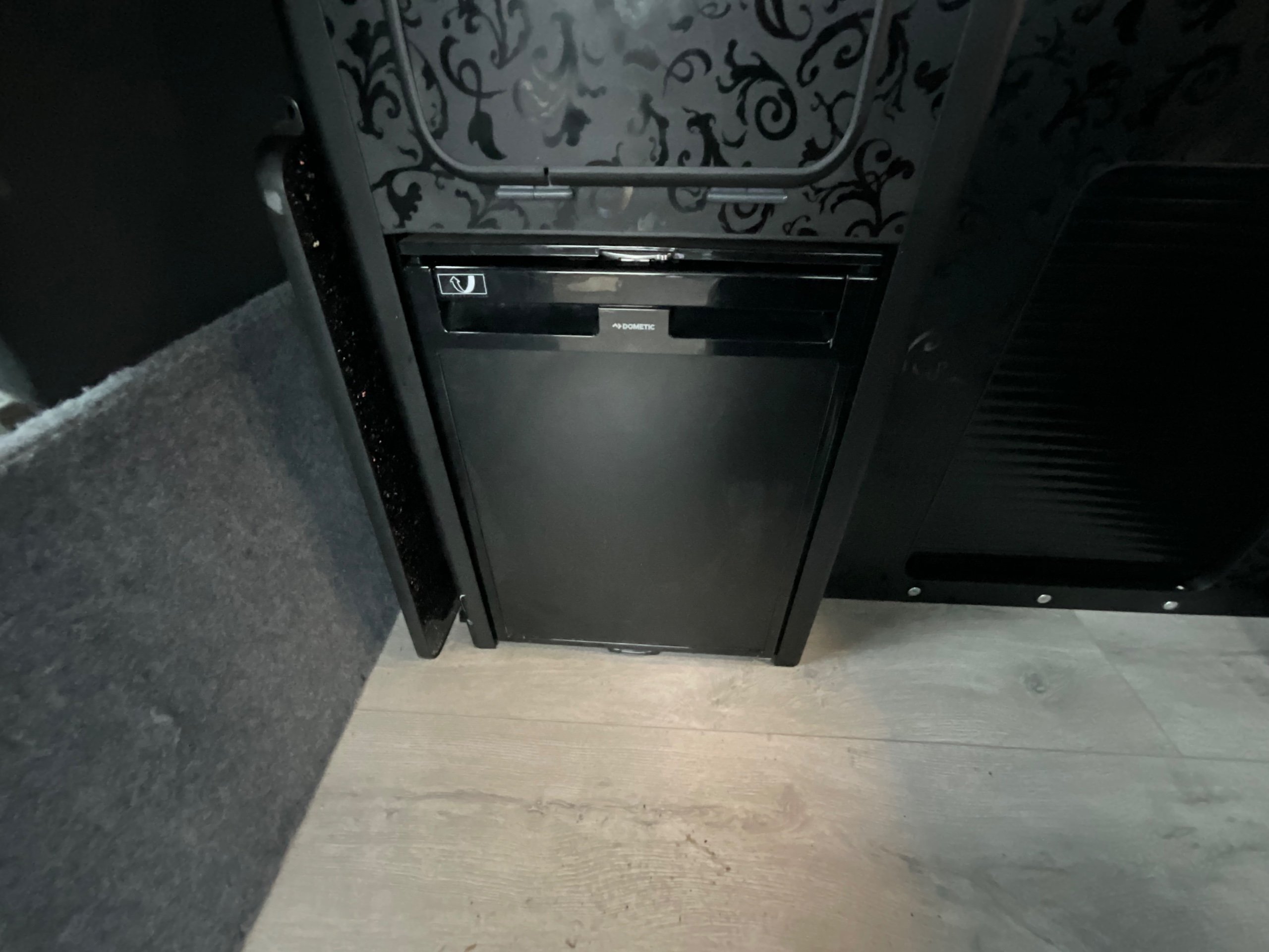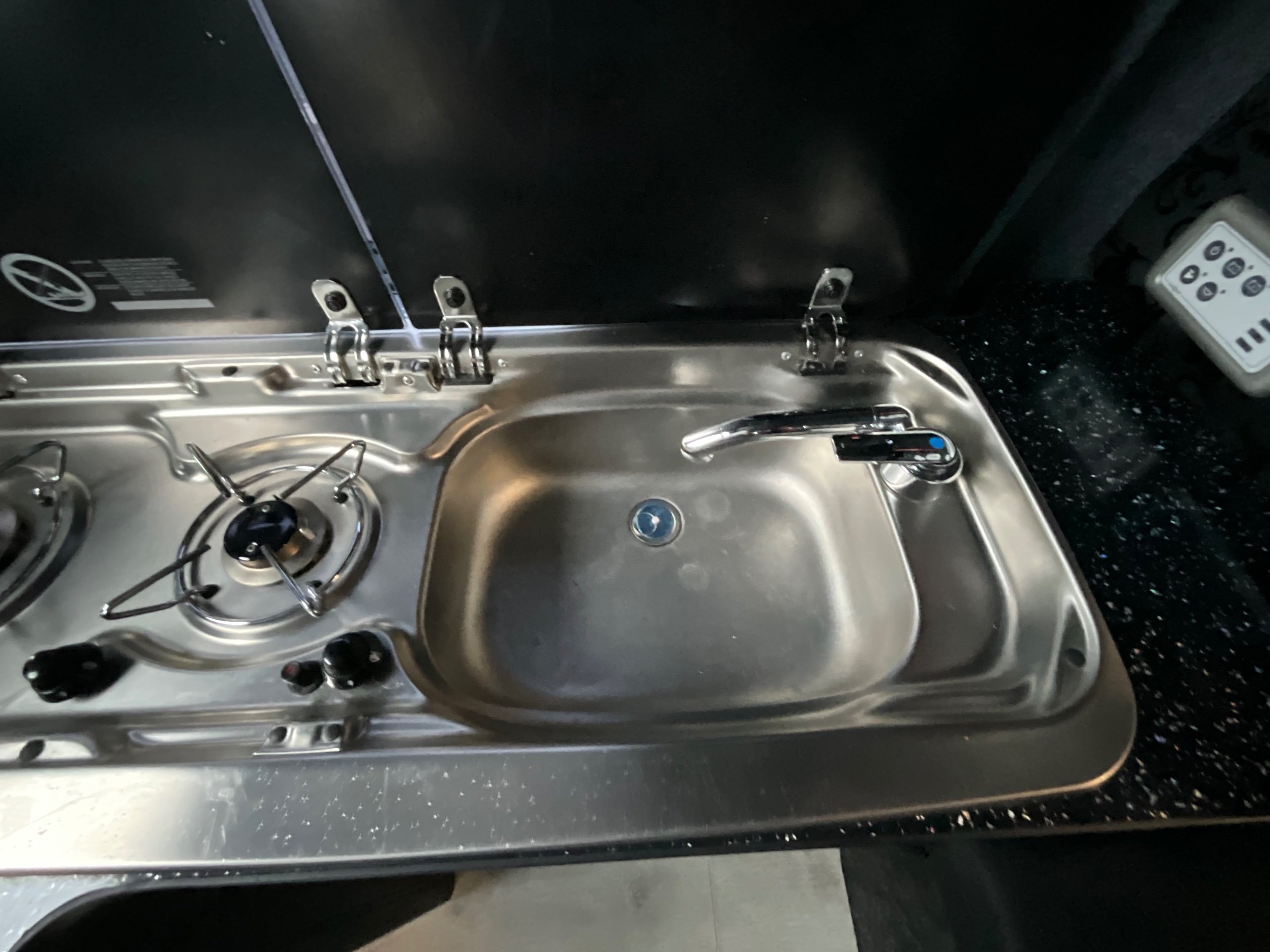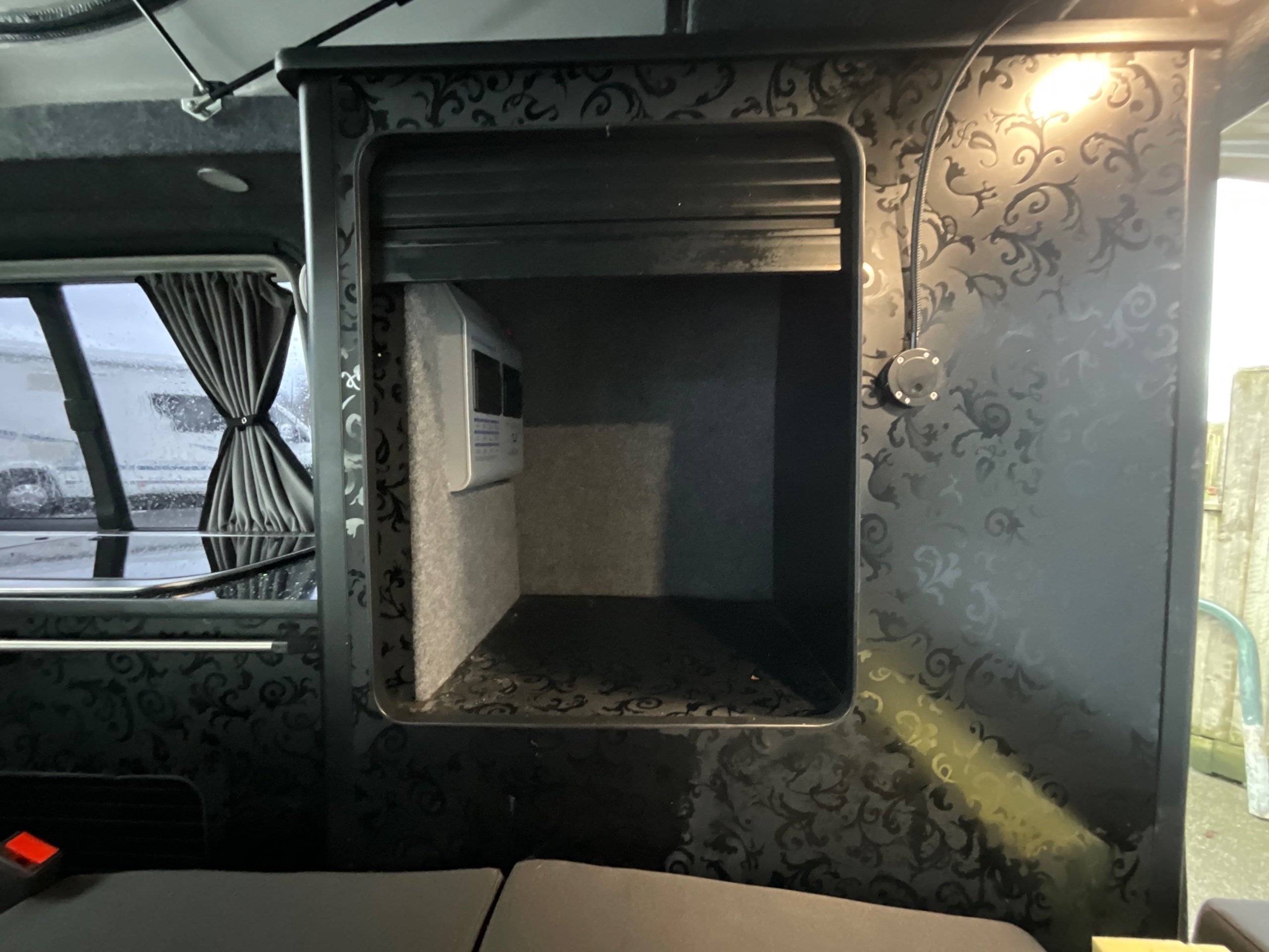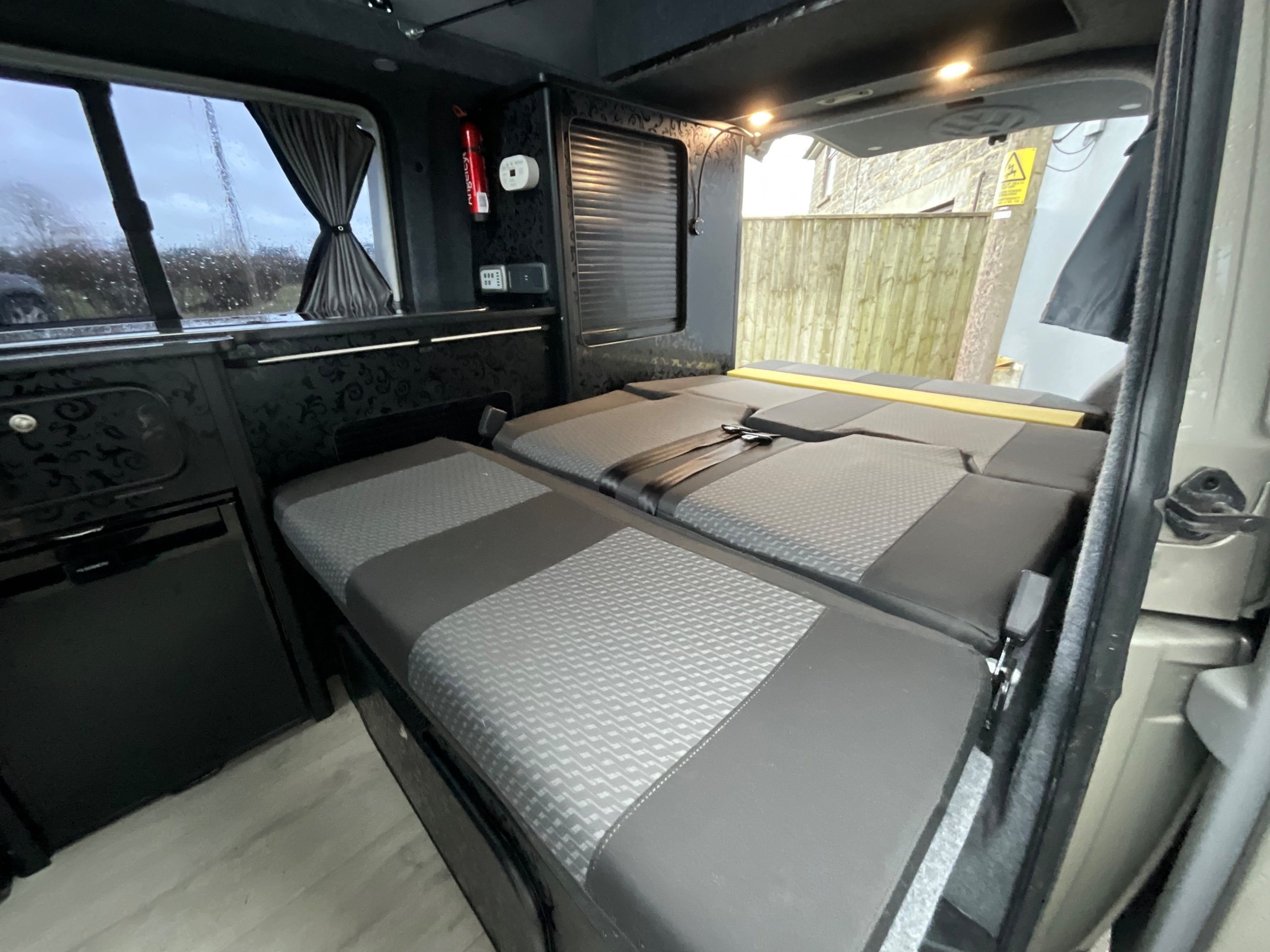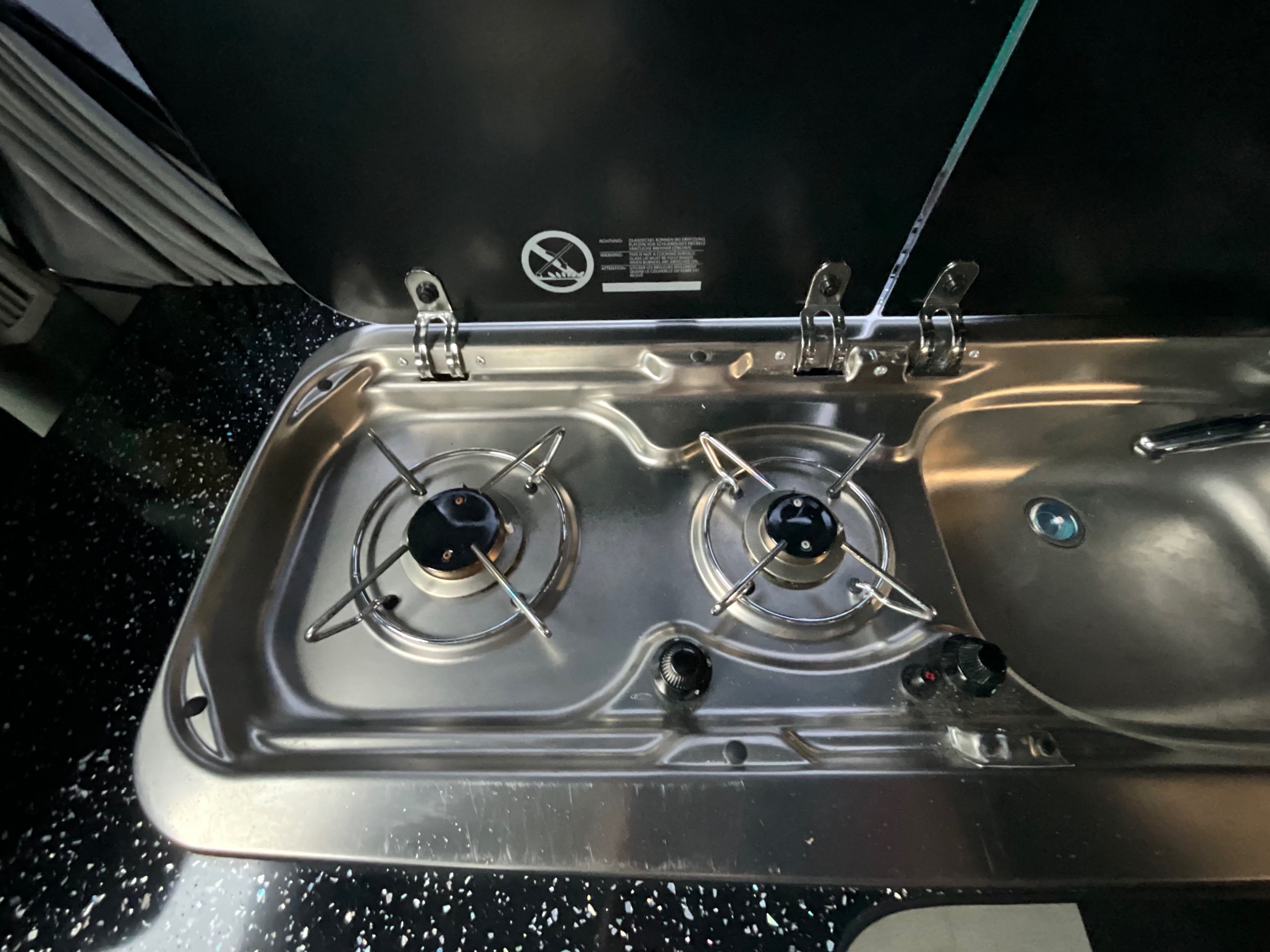 The seats in the back are created out of the crash tested and approved Rock ‘n’ Roll bed (forming a spacious doubled bed) to have the classic VW layout inside, while still having the all the standard comforts as well as belted seats. The fridge is 12V, with the fridge having a freezer box. There is also a removeable table. A double swivel seat for extending the social space and ease of sleeping upstairs. There is also a domestic double gas hob (working off a camping gas bottle), and a sink with an electrical water pump which is connected to a fresh water container. There is also 240V hook up. The van has plenty of storage throughout the motorhome as well.