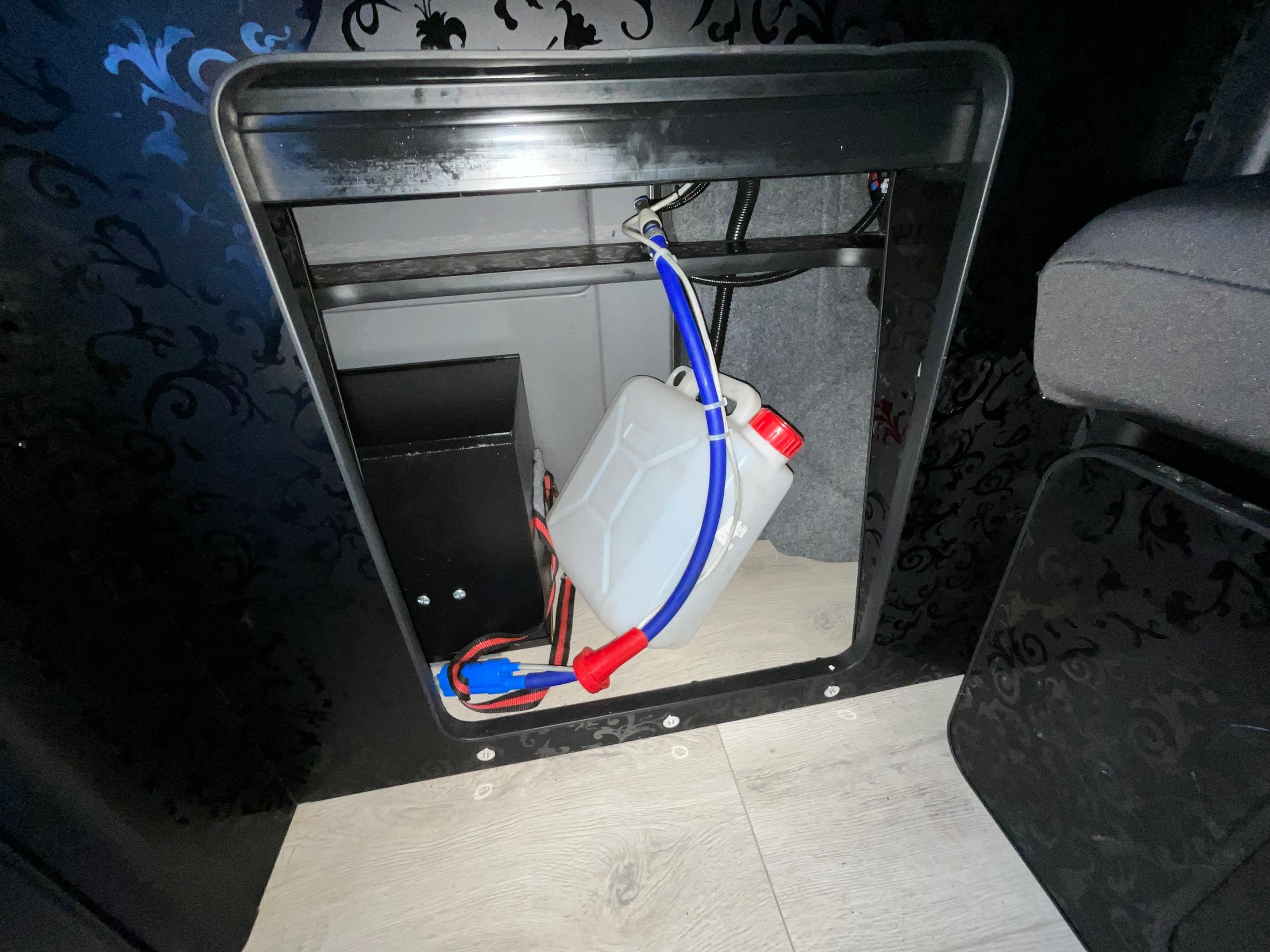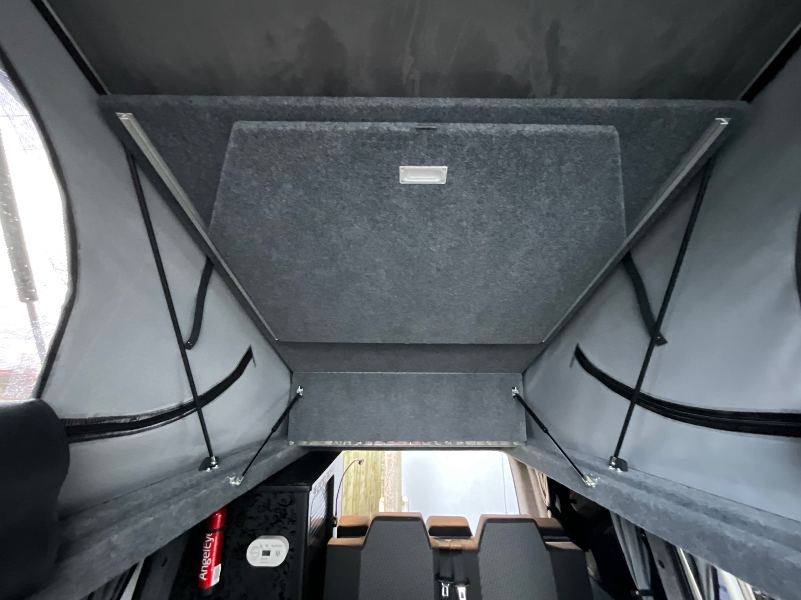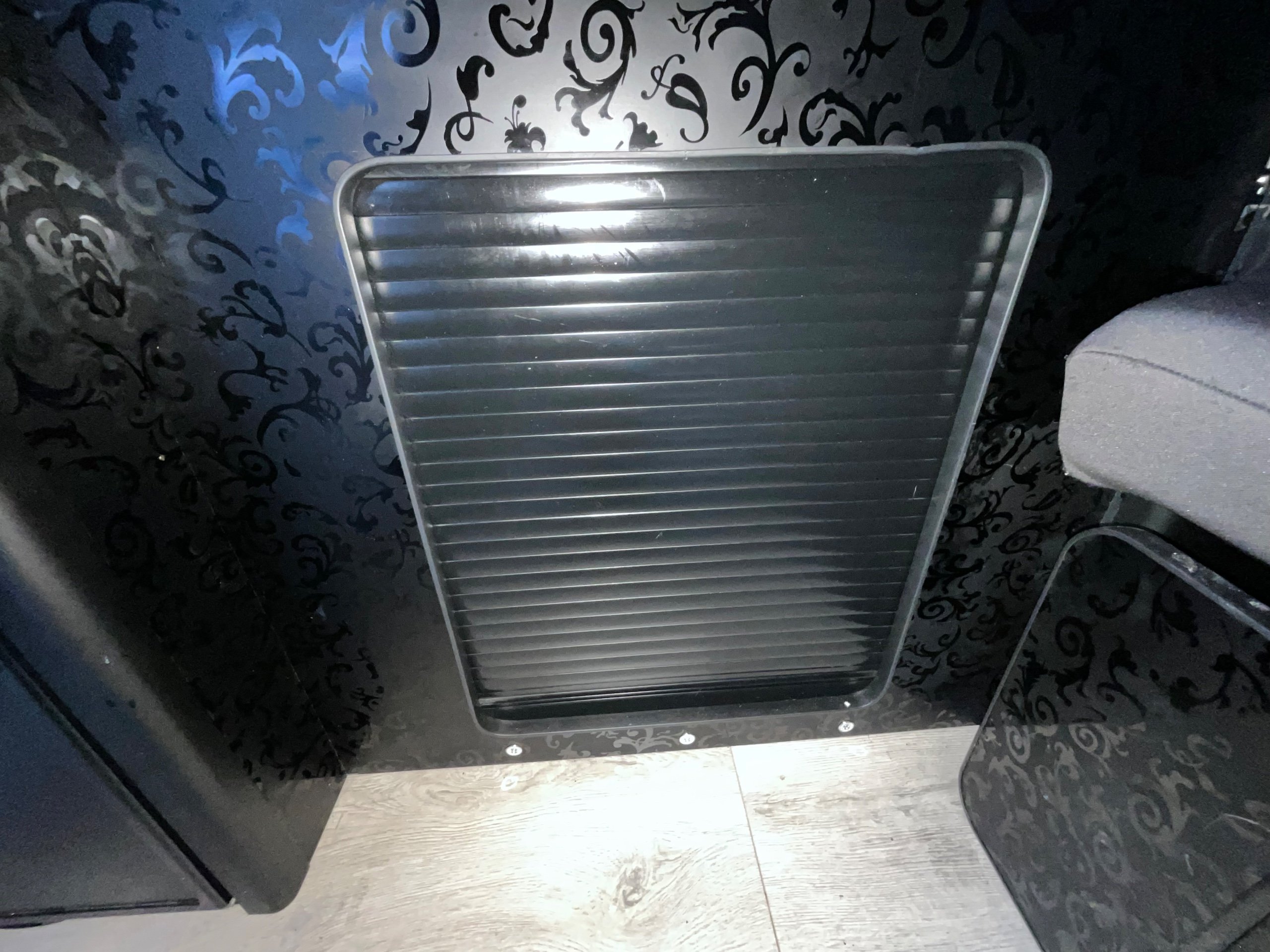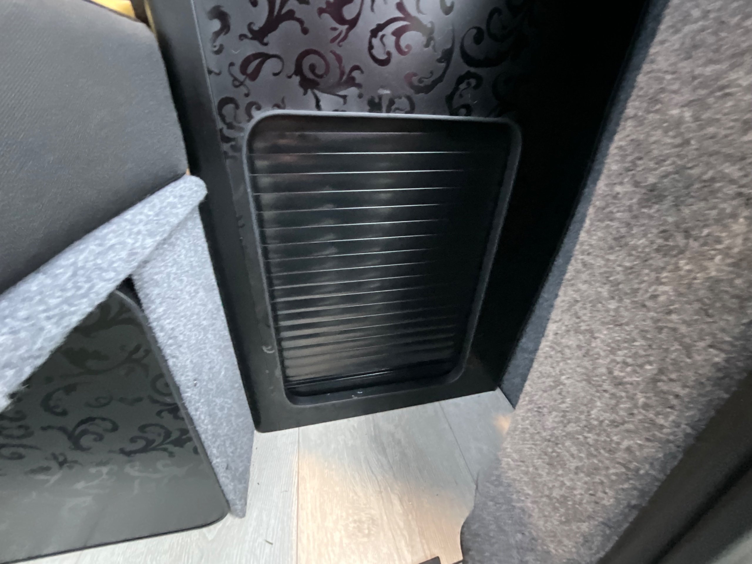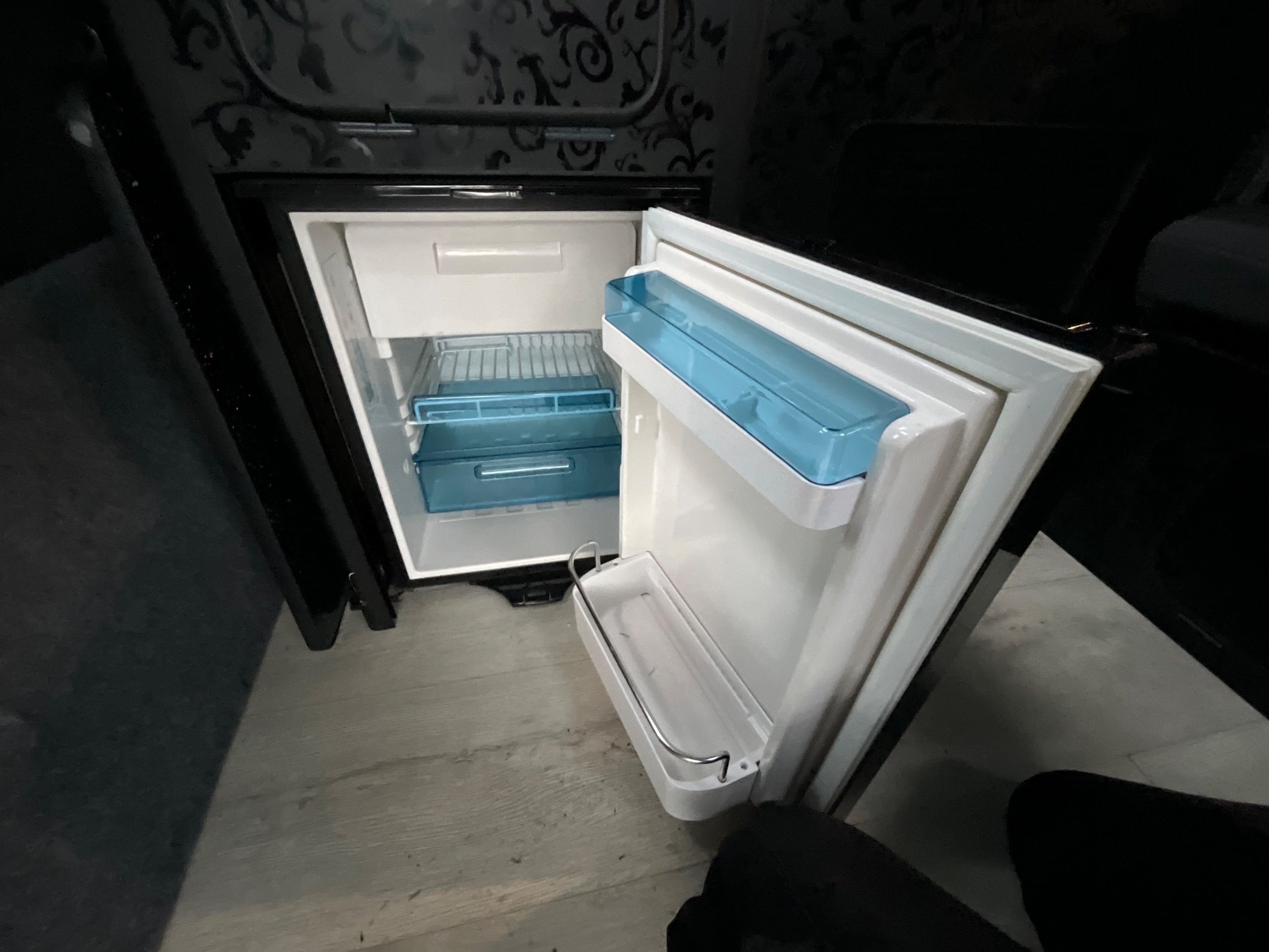 The seats in the back are created out of the crash tested and approved Rock ‘n’ Roll bed (forming a spacious doubled bed) to have the classic VW layout inside, while still having the all the standard comforts as well as belted seats. The fridge is 12V, with the fridge having a freezer box. There is also a removeable table. A double swivel seat for extending the social space and ease of sleeping upstairs. There is also a domestic double gas hob (working off a camping gas bottle), and a sink with an electrical water pump which is connected to a fresh water container. There is also 240V hook up. The van has plenty of storage throughout the motorhome as well.