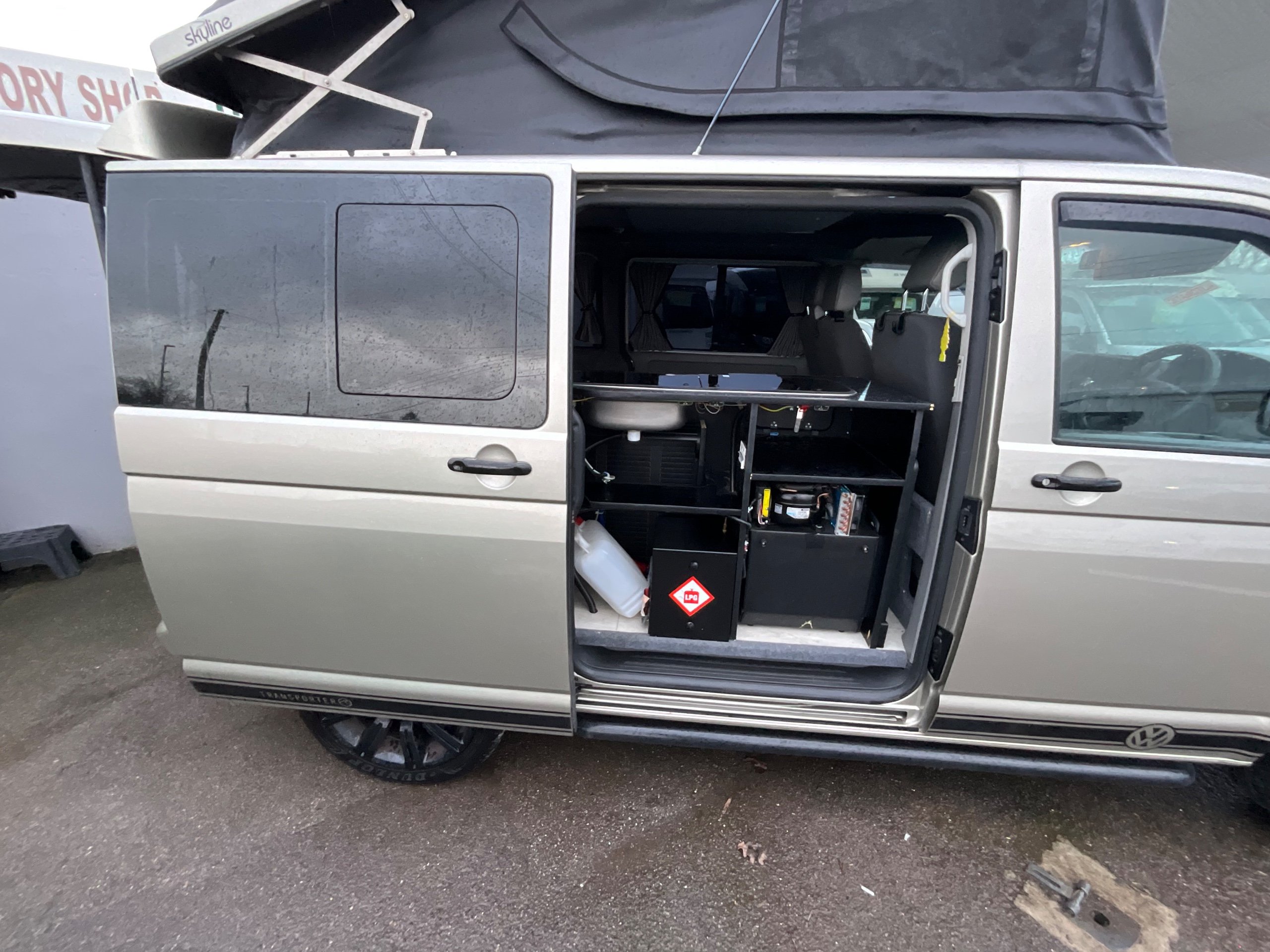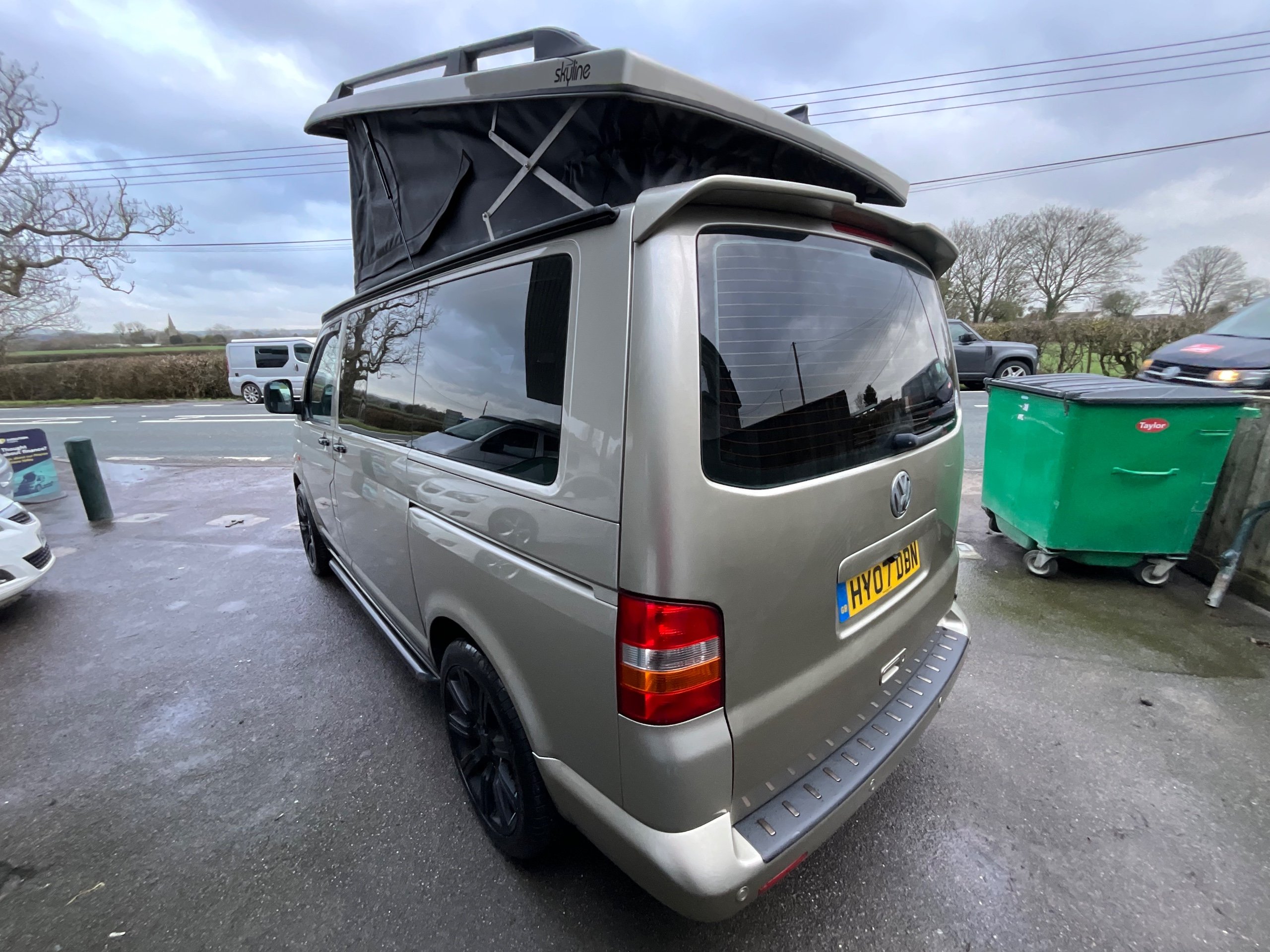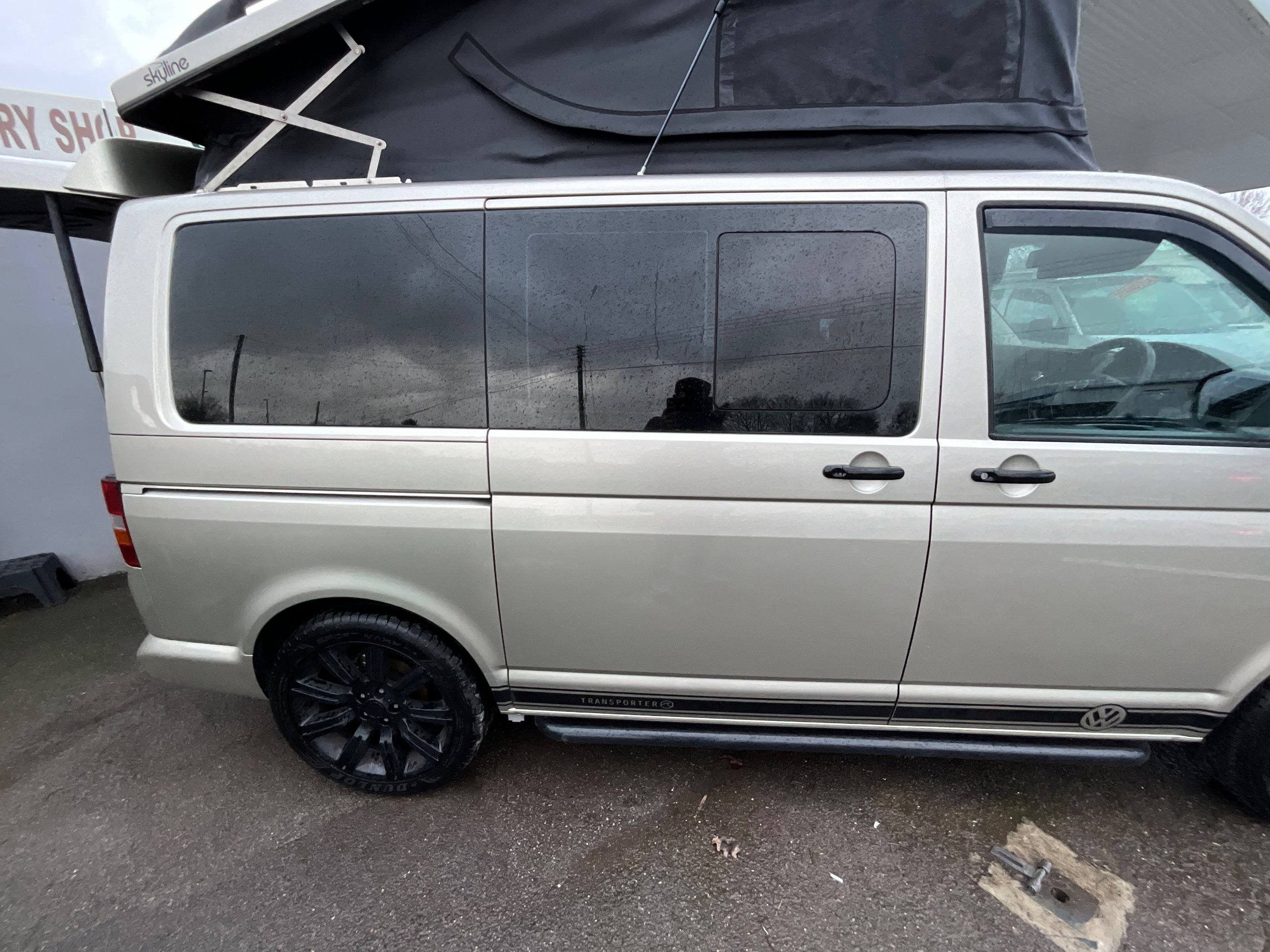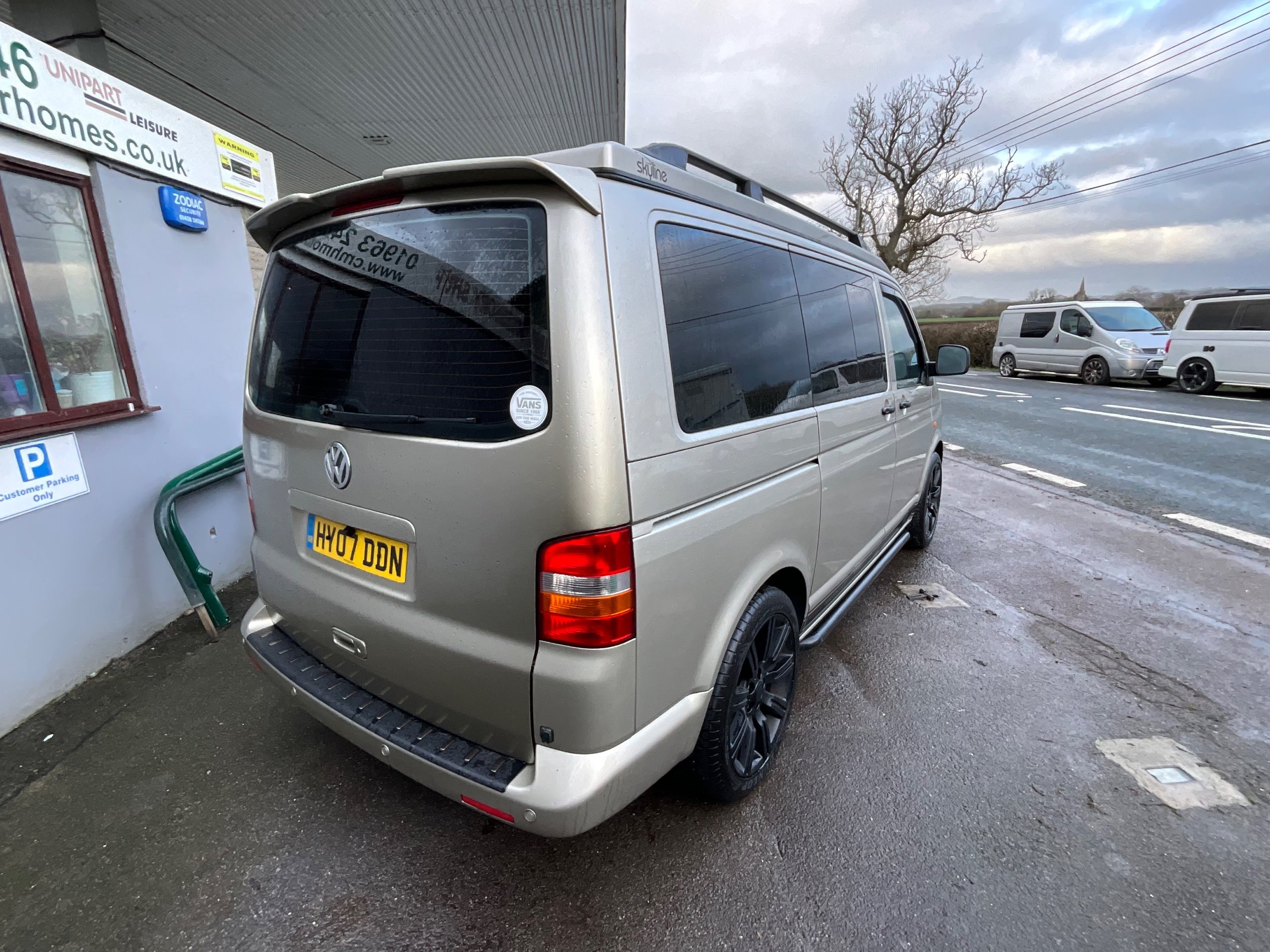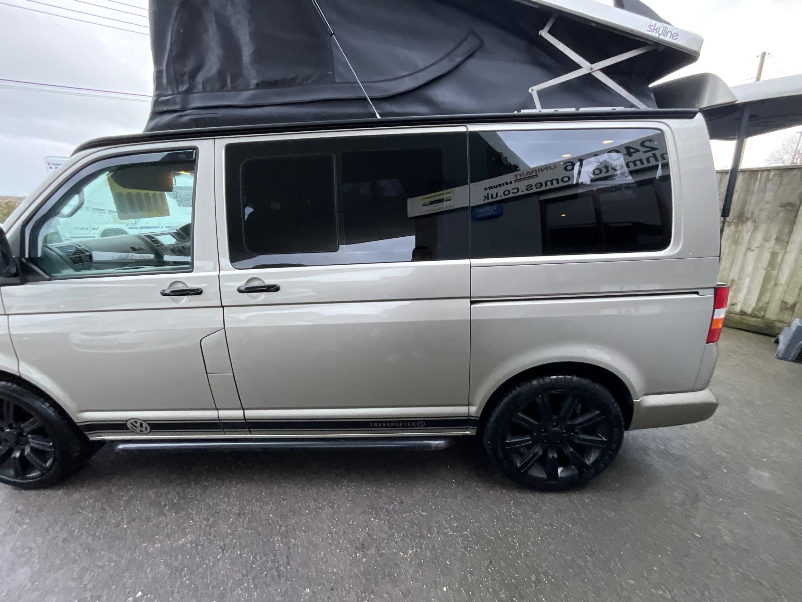 2007 VW camper-van offers everything from comfort to practicality. There is an upgraded touch screen Sony radio system with Bluetooth, DAB capability shows its quality. It has been fully converted with grey interior fabric, black patterned units, fabric lined walls with beige non slip flooring. There is also interior light fittings. The VW has been fitted with a top of the line SKYLINE ROOF with a coloured canvas and struts, three windows with insect proof netting for the sides and clear fabric at the front as well as the ability to fully open up the fabric canvas. This van is registered as a 5-seater and sleeps 4.