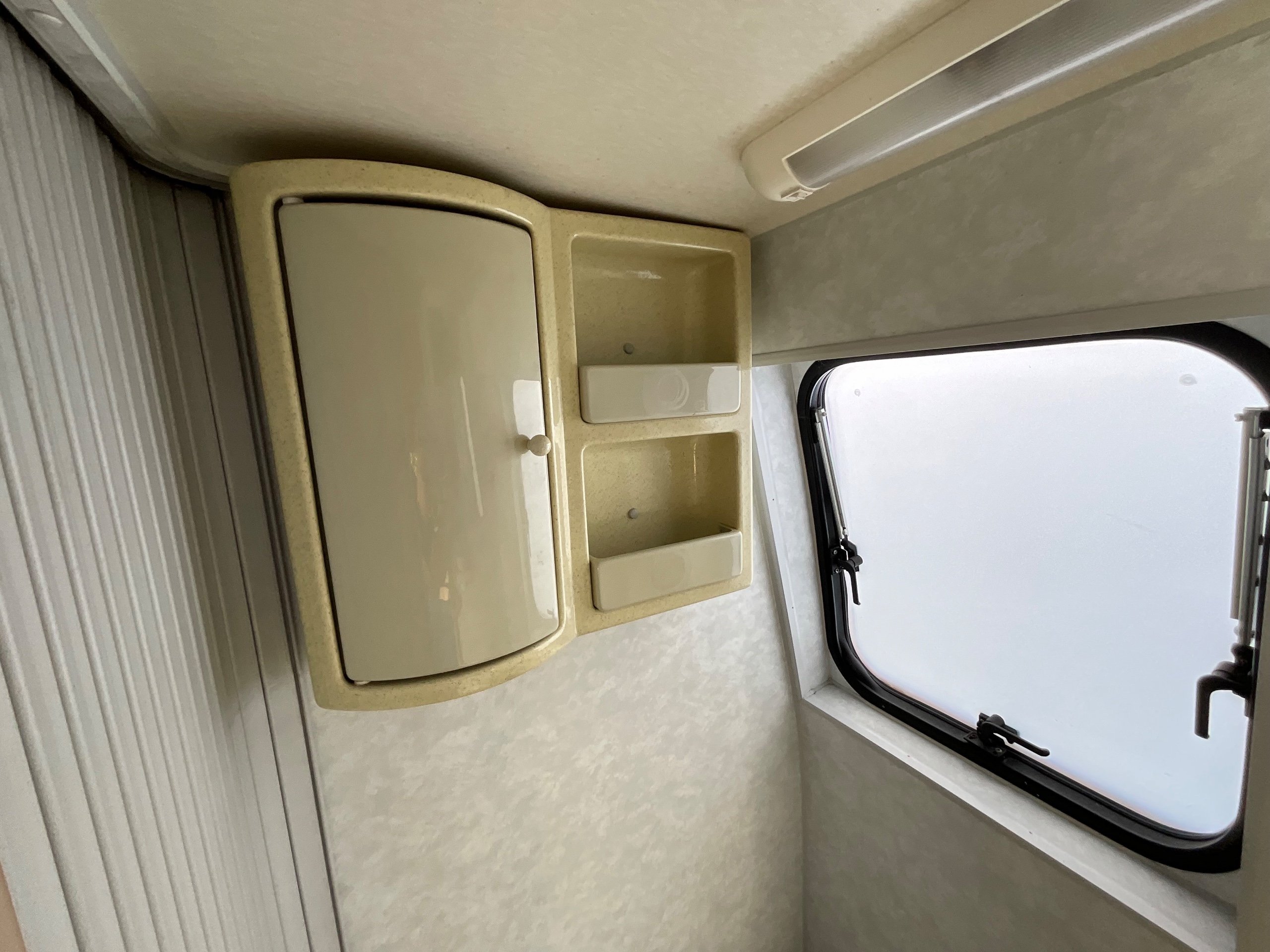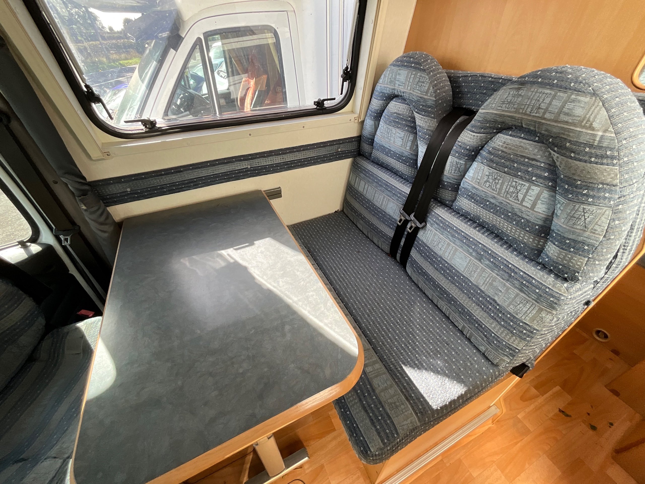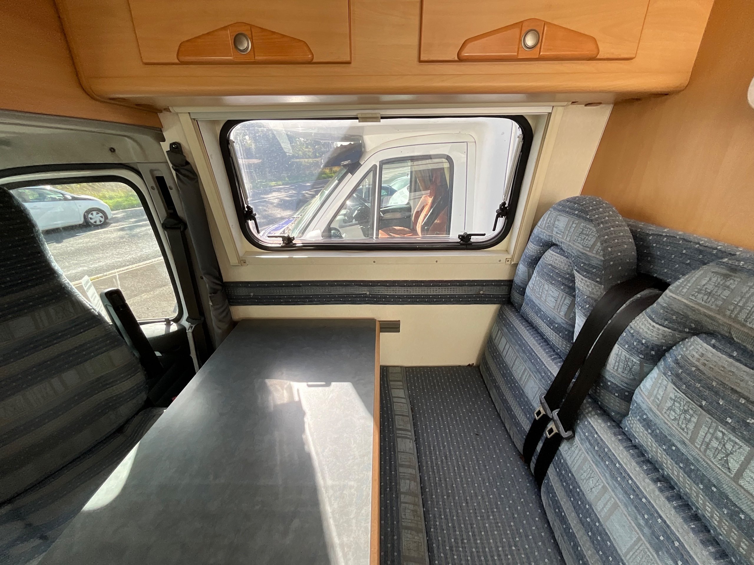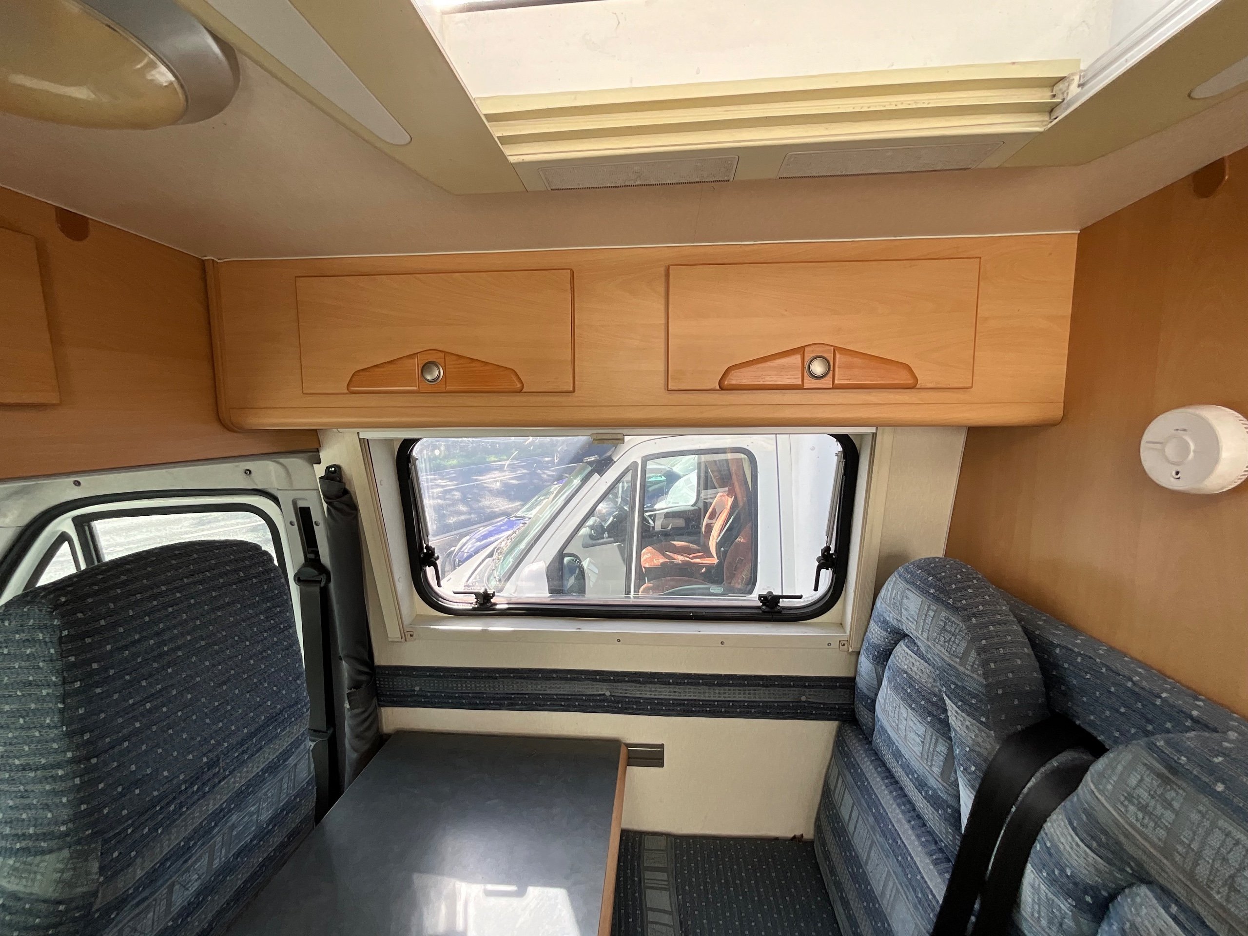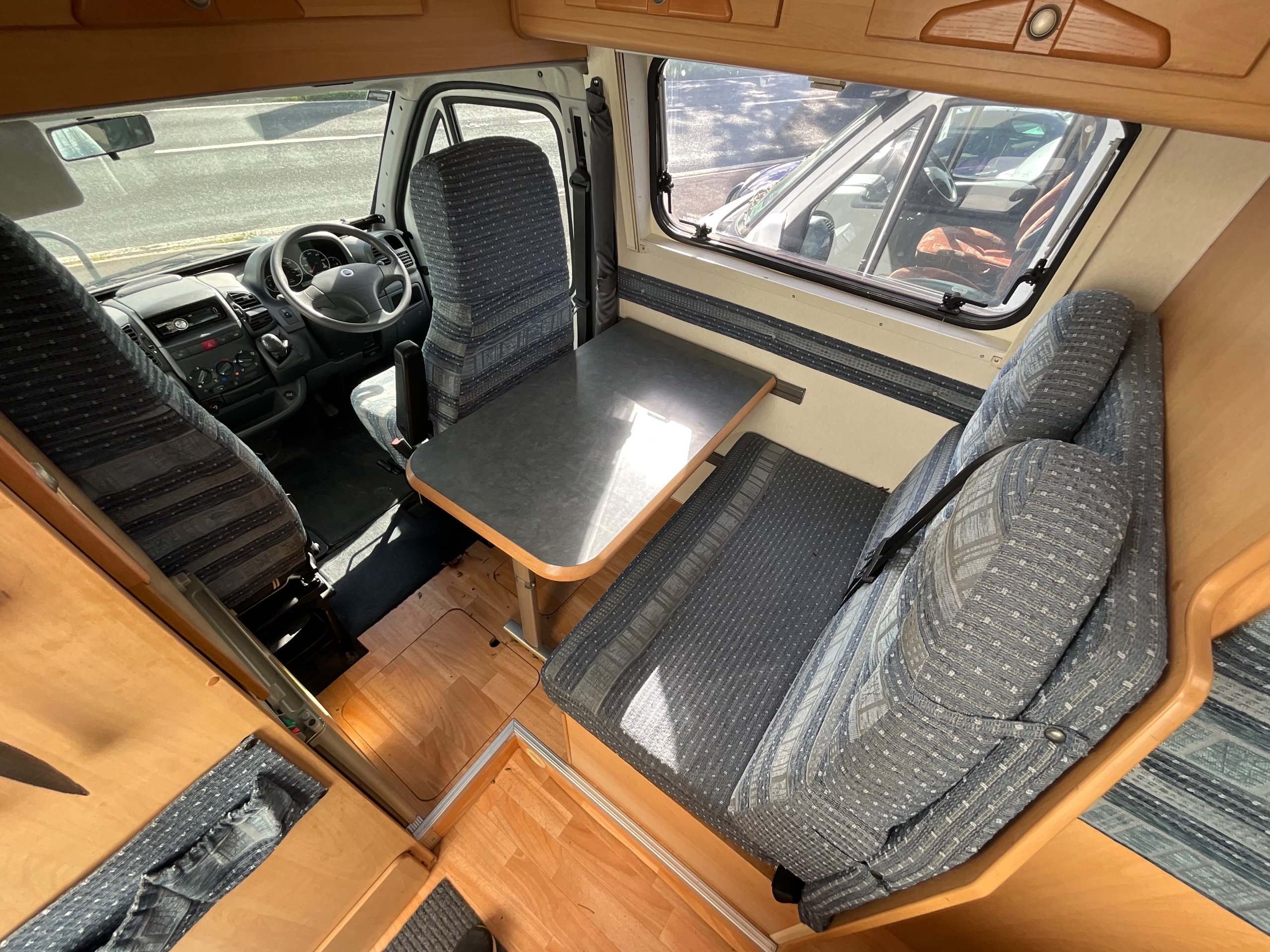 This Adria twin has the ability to sleep 3 and travel with 4 people full belted in. The Adria twin is a 3 Berth motorhome, with a rear fixed transverse bed layout offering plenty of storage underneath plus comfort with a proper Mattress. The central area offers flexible options of two forward facing seats (With inertia seat belts for travelling) with a table. This area then can be transformed into a dinette area with the use of the two swivel seats in the front cab to further enhance this area. Above the cab is a little storage