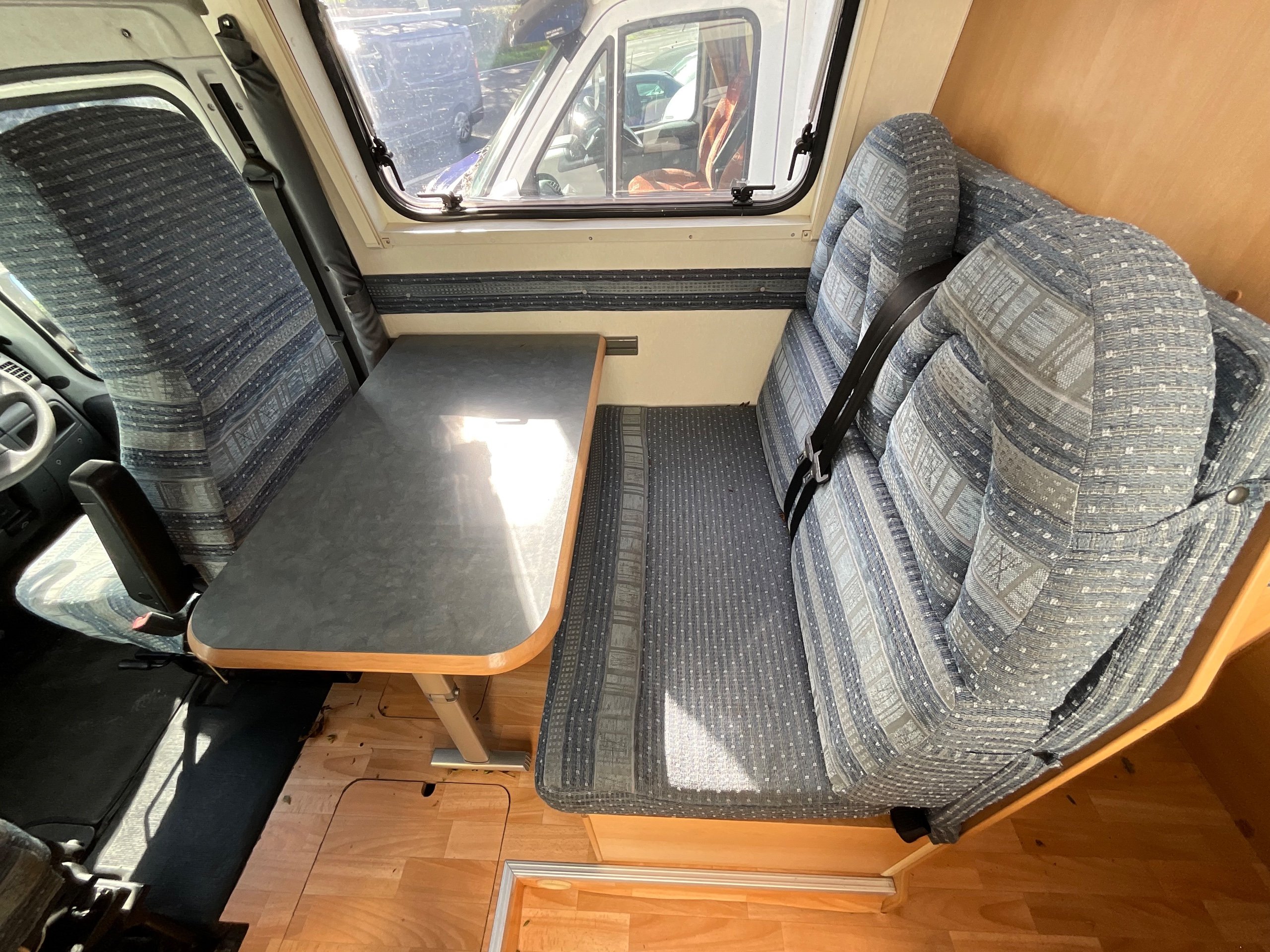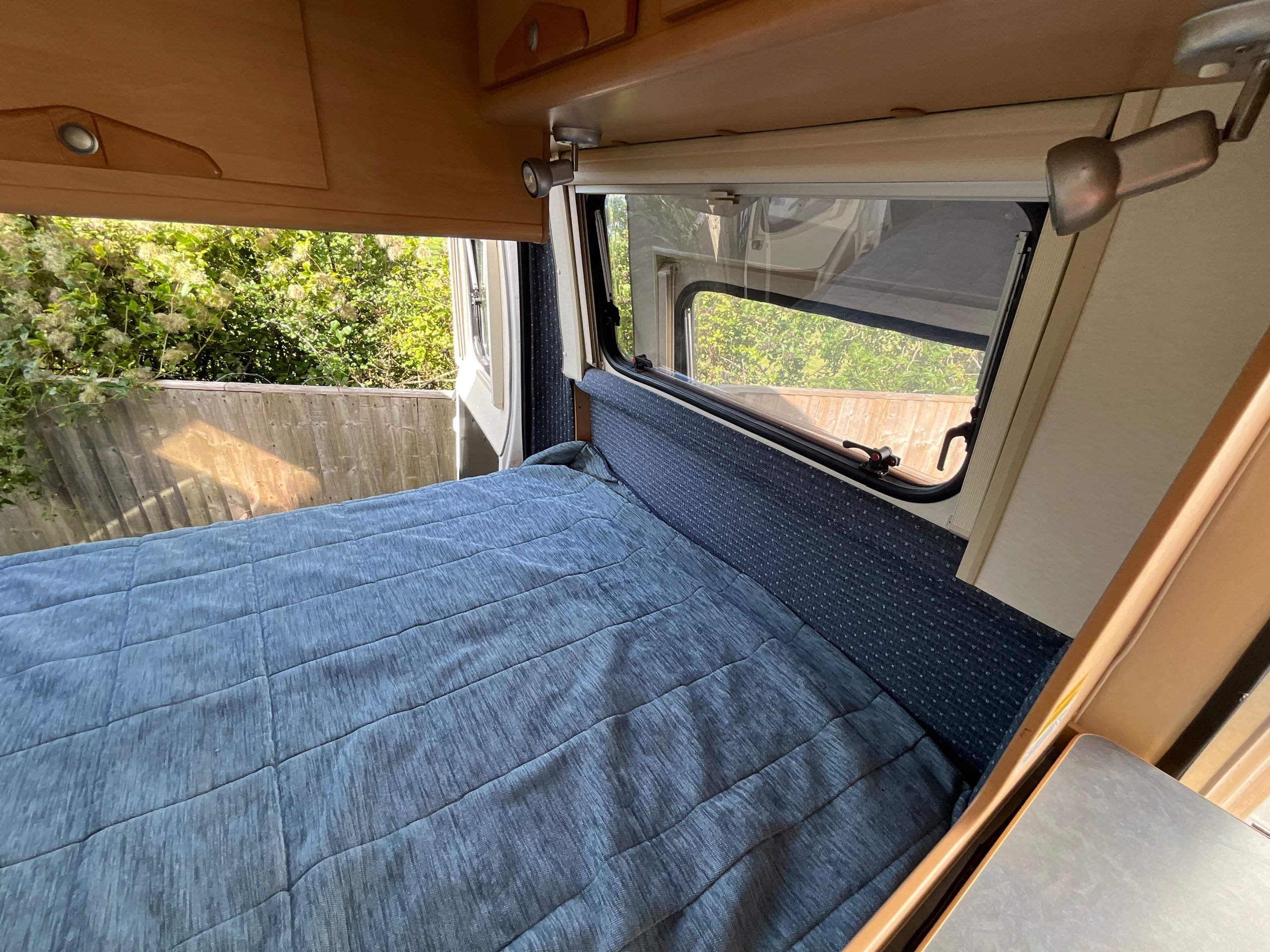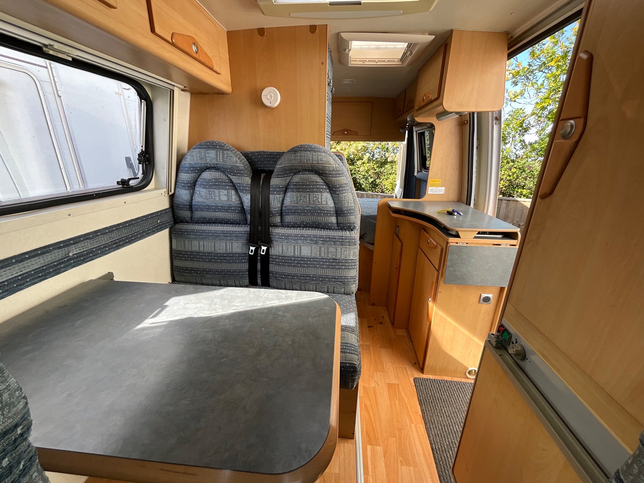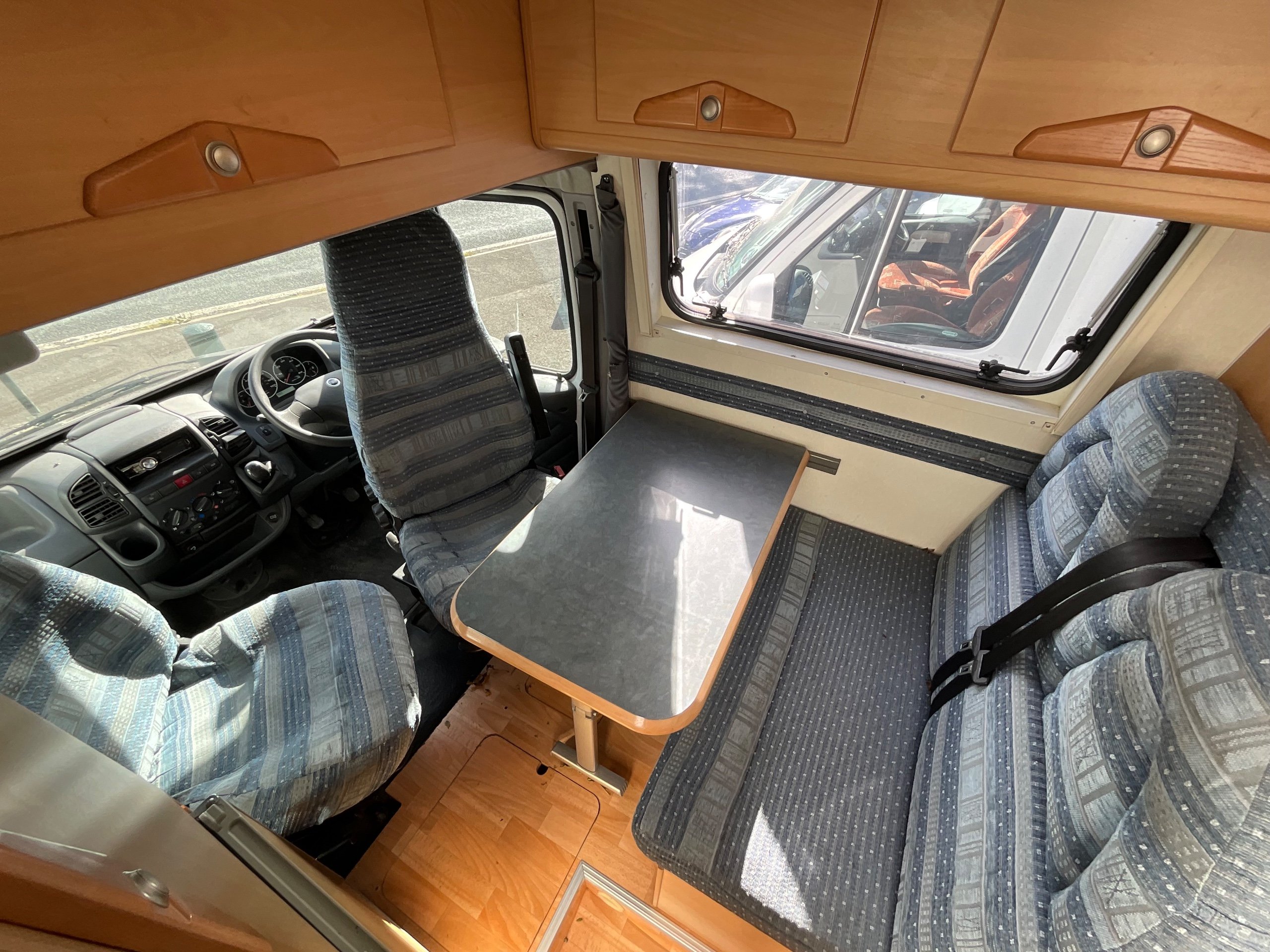 This Adria twin has the ability to sleep 3 and travel with 4 people full belted in. The Adria twin is a 3 Berth motorhome, with a rear fixed transverse bed layout offering plenty of storage underneath plus comfort with a proper Mattress. The central area offers flexible options of two forward facing seats (With inertia seat belts for travelling) with a table. This area then can be transformed into a dinette area with the use of the two swivel seats in the front cab to further enhance this area. Above the cab is a little storage