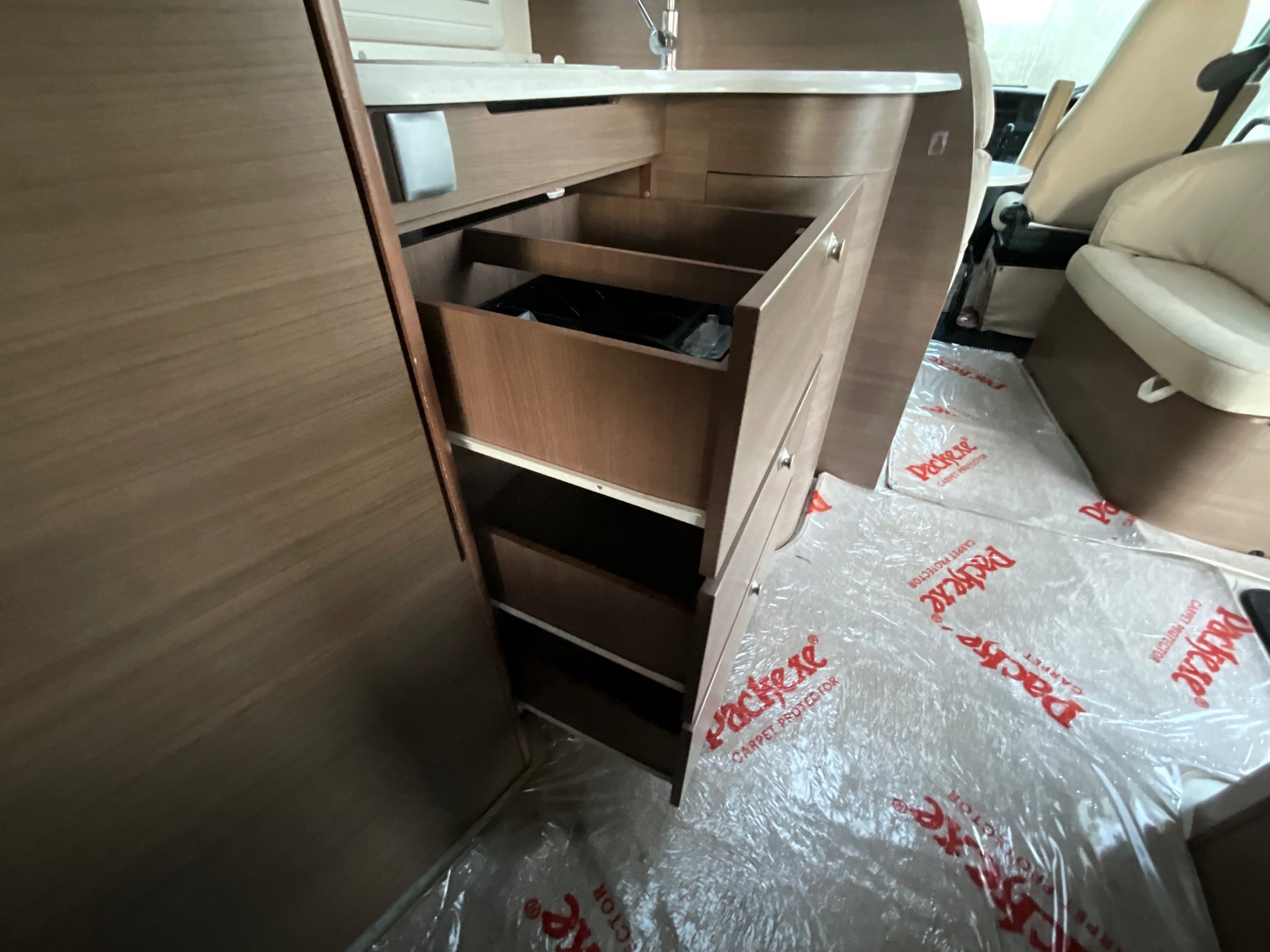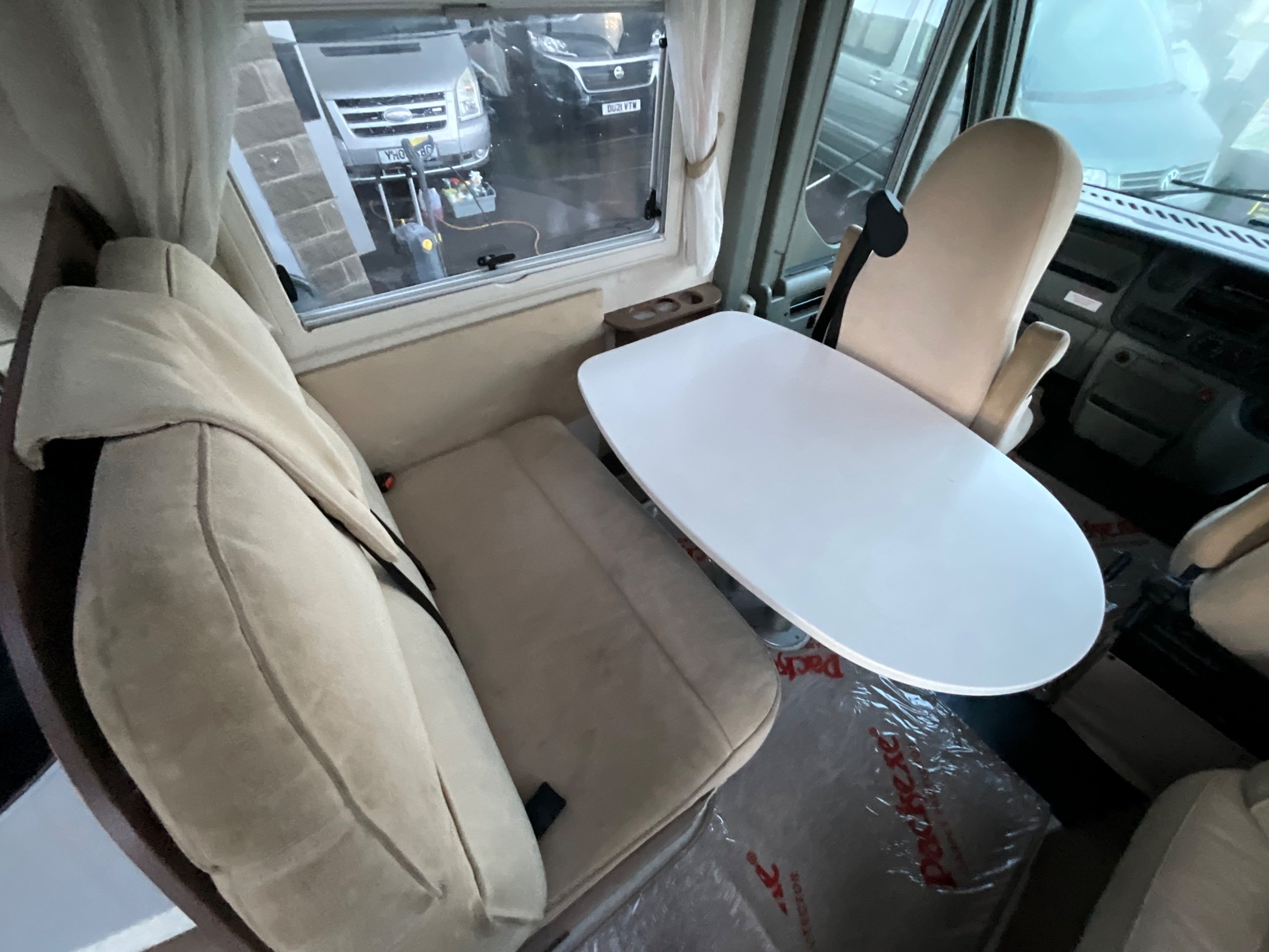 The Adria Vision i677SP is a A - Class, 4 Berth motorhome with a Fixed Rear French Bed offering plenty of storage underneath, which can be accessed from outside with a garage door on the drivers side with the other double bed an electric drop down bed at the front. The central area offers many flexible options of two travelling seat belts so this Adria can travel with 4 people fully belted in. Then also, a relaxing Dinette seating area with a bench seat on one side and then a dinette opposite for a large dining area, which then can be enlarged with both front seats working on swivelling mechanisms to enhance the seating available for dinning.