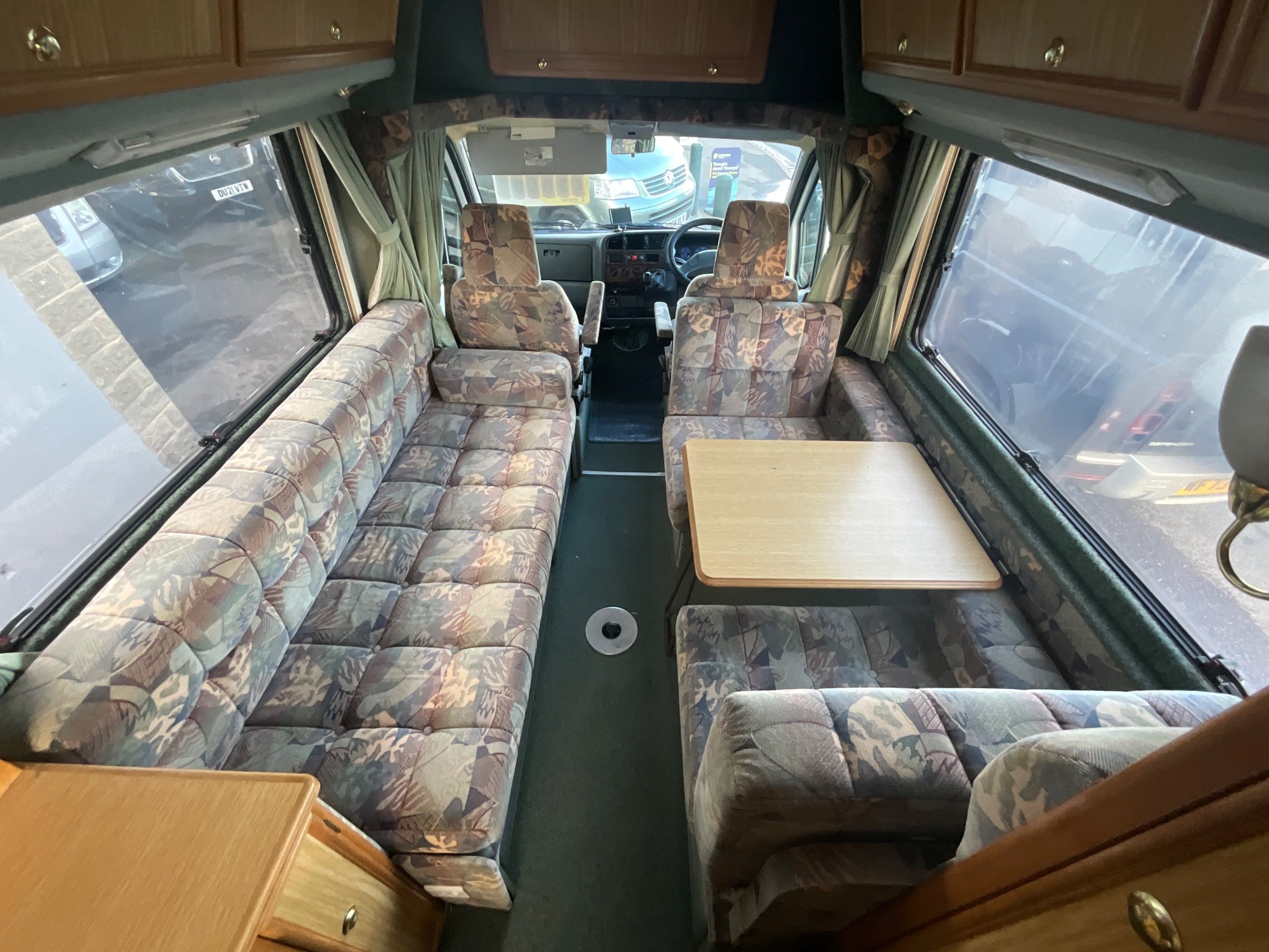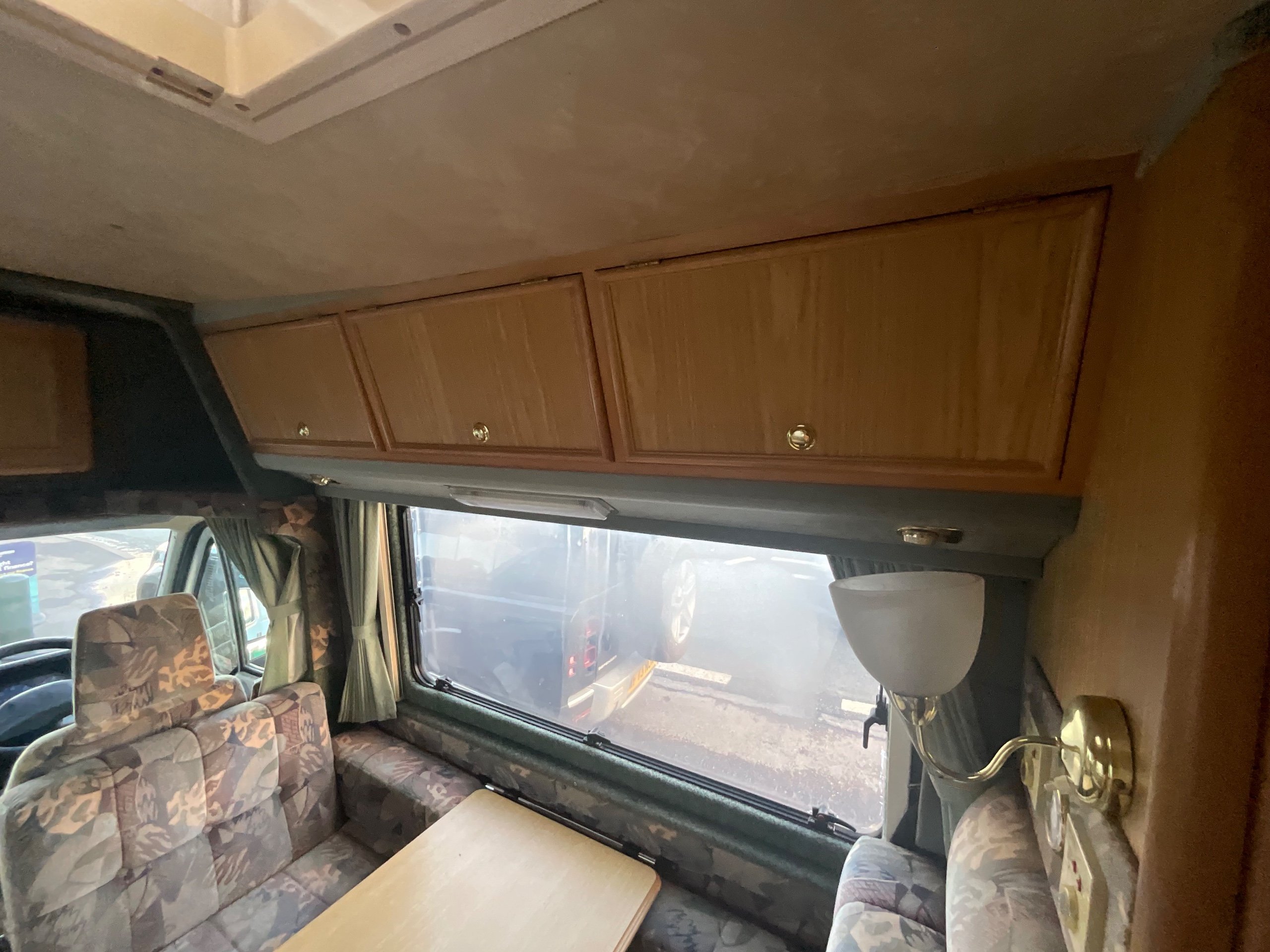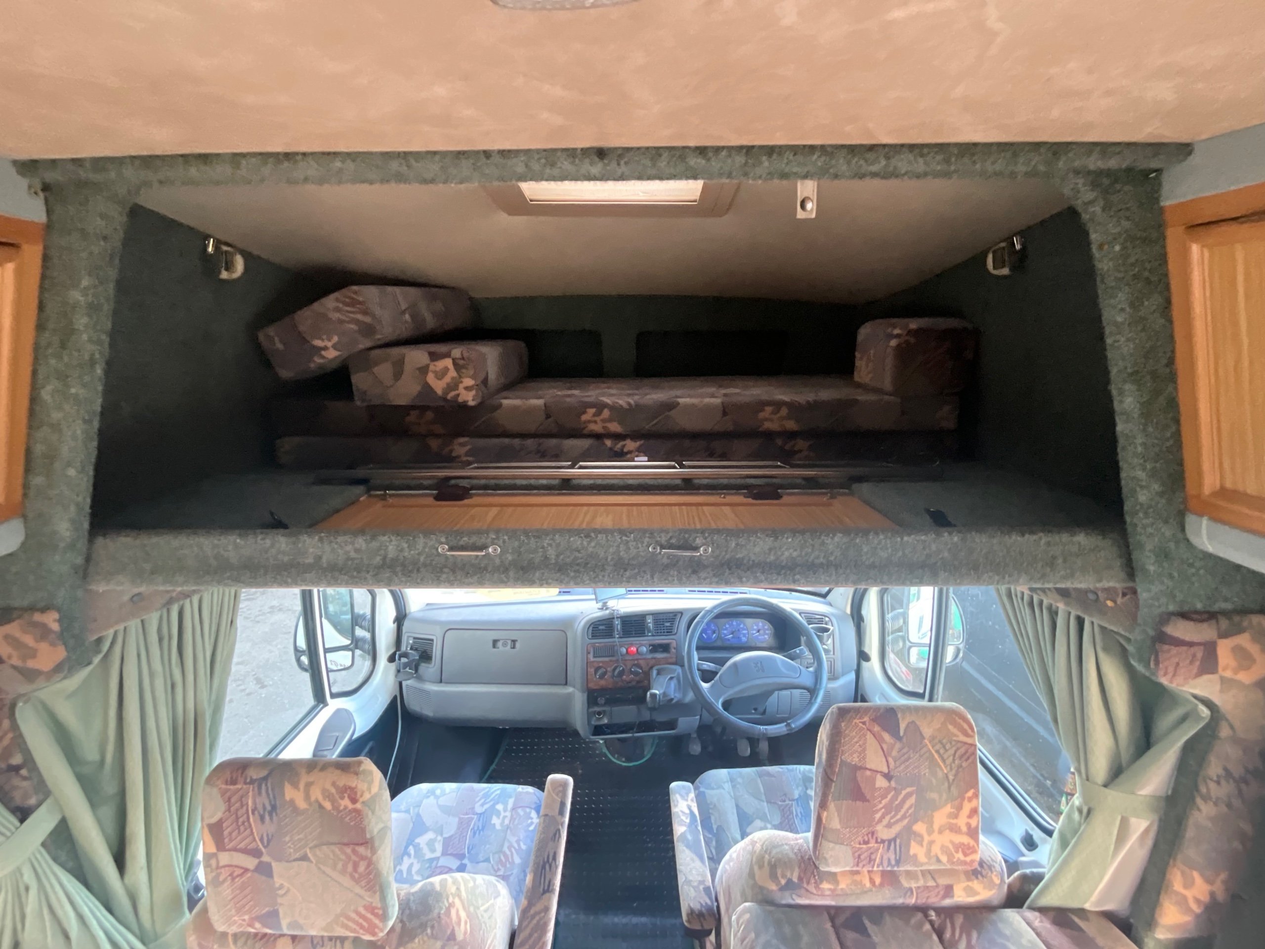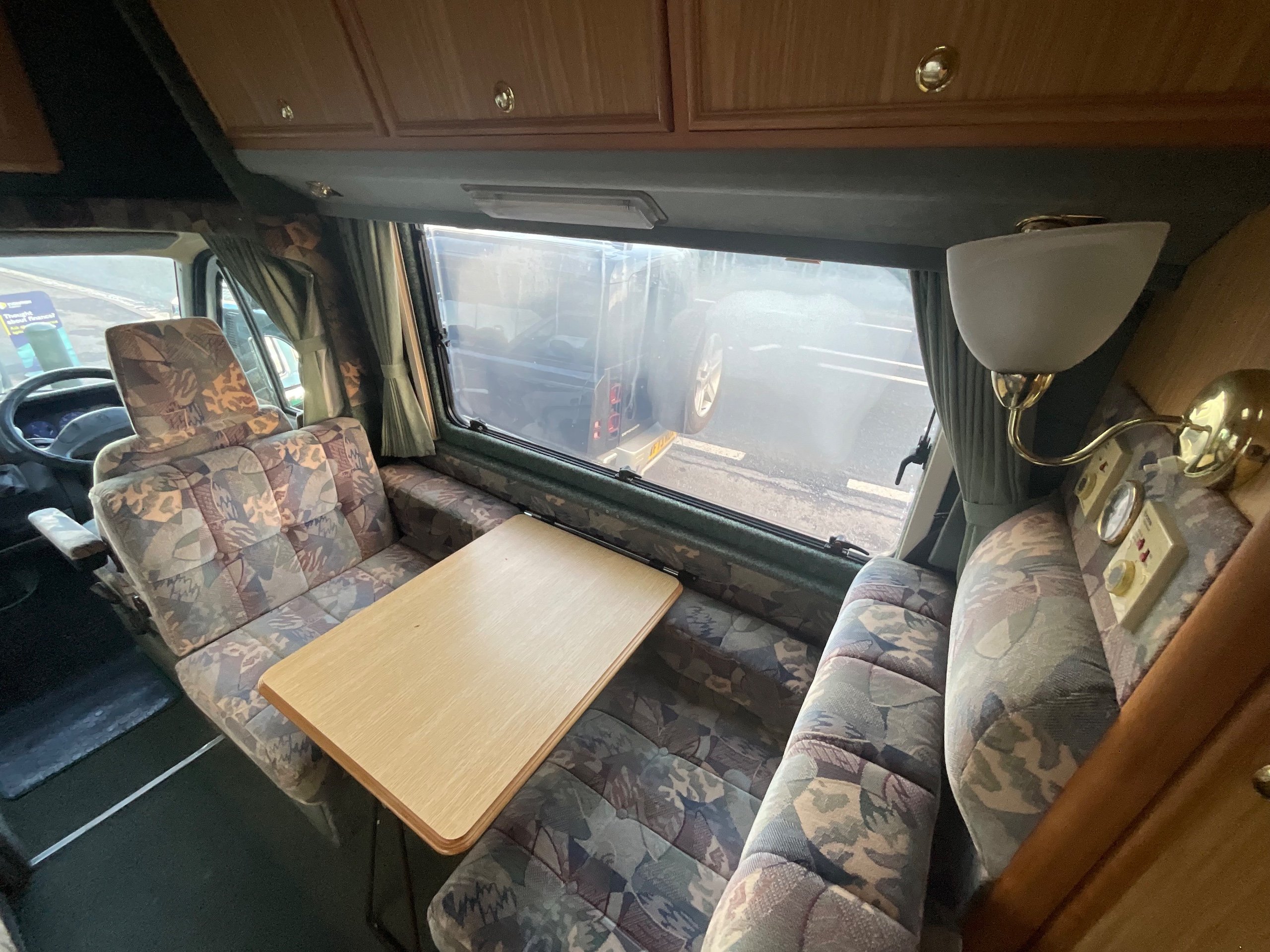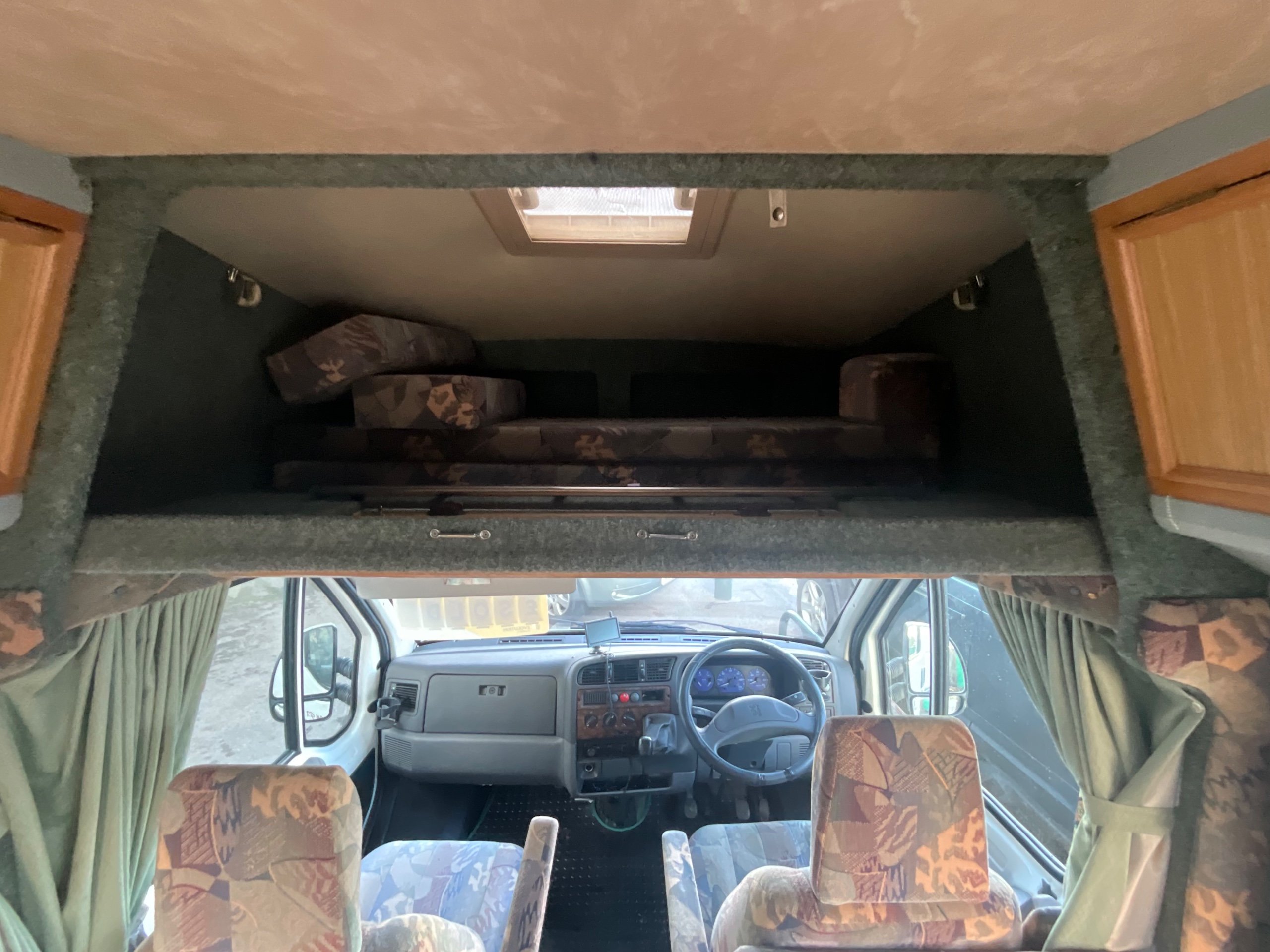 For the sleeping arrangement the bench seat forms one large single bed over 6ft in length with the dinette forming the other single bed, with both front seating sliding forwards to further enhance the single beds length. Alternatively this area can form into a large double bed. The overhead cab area offers storage or forms another double bed.