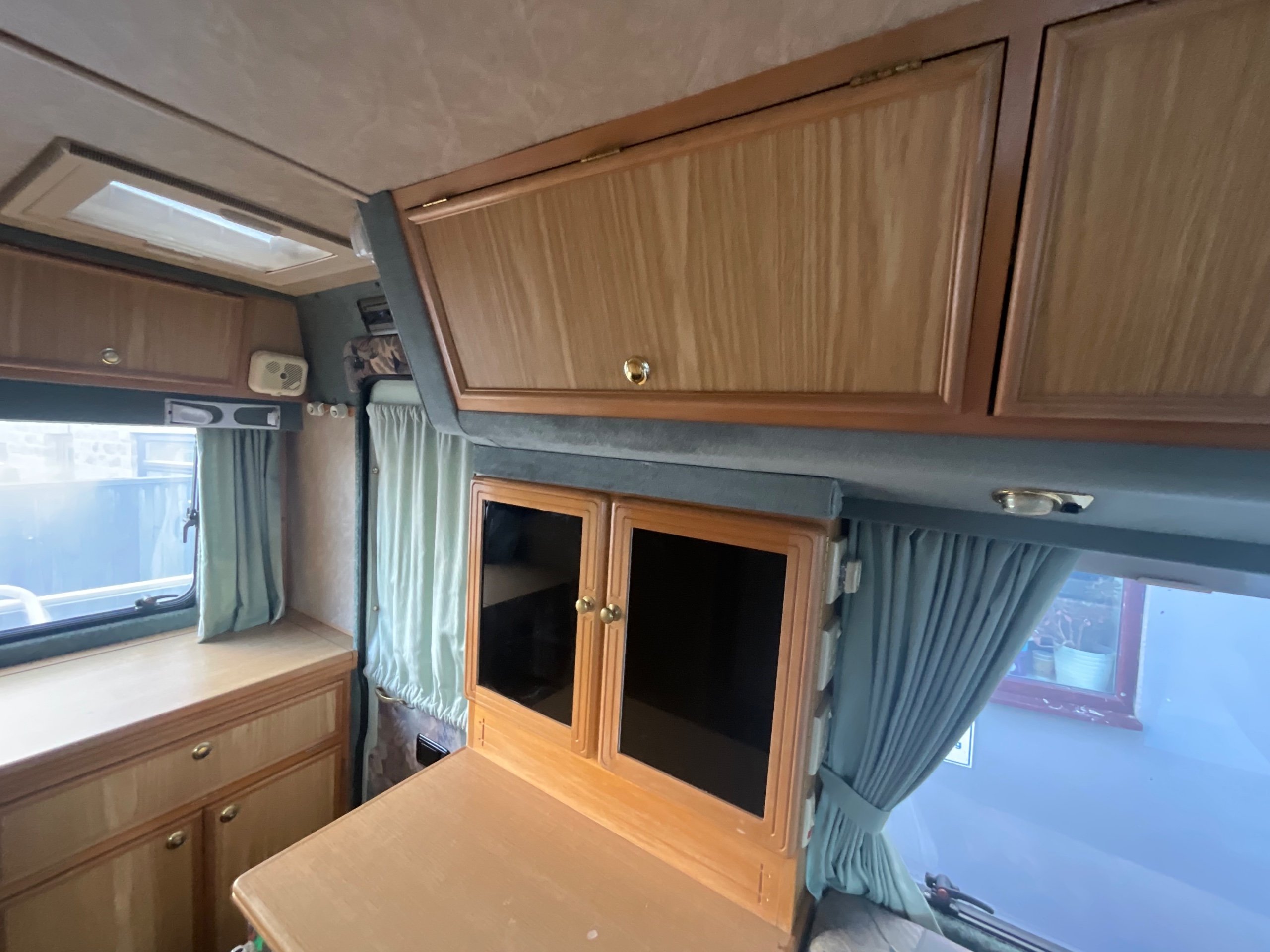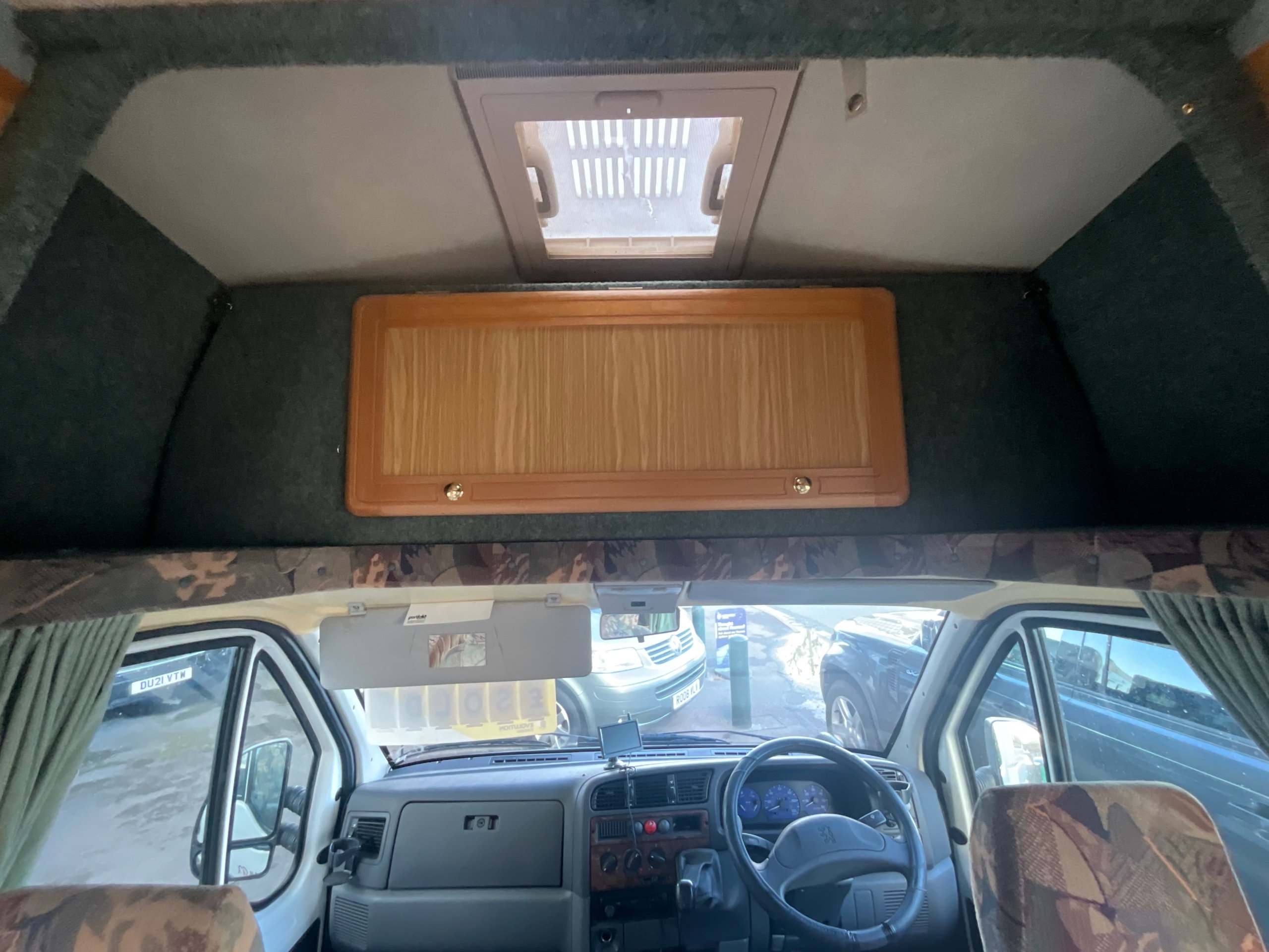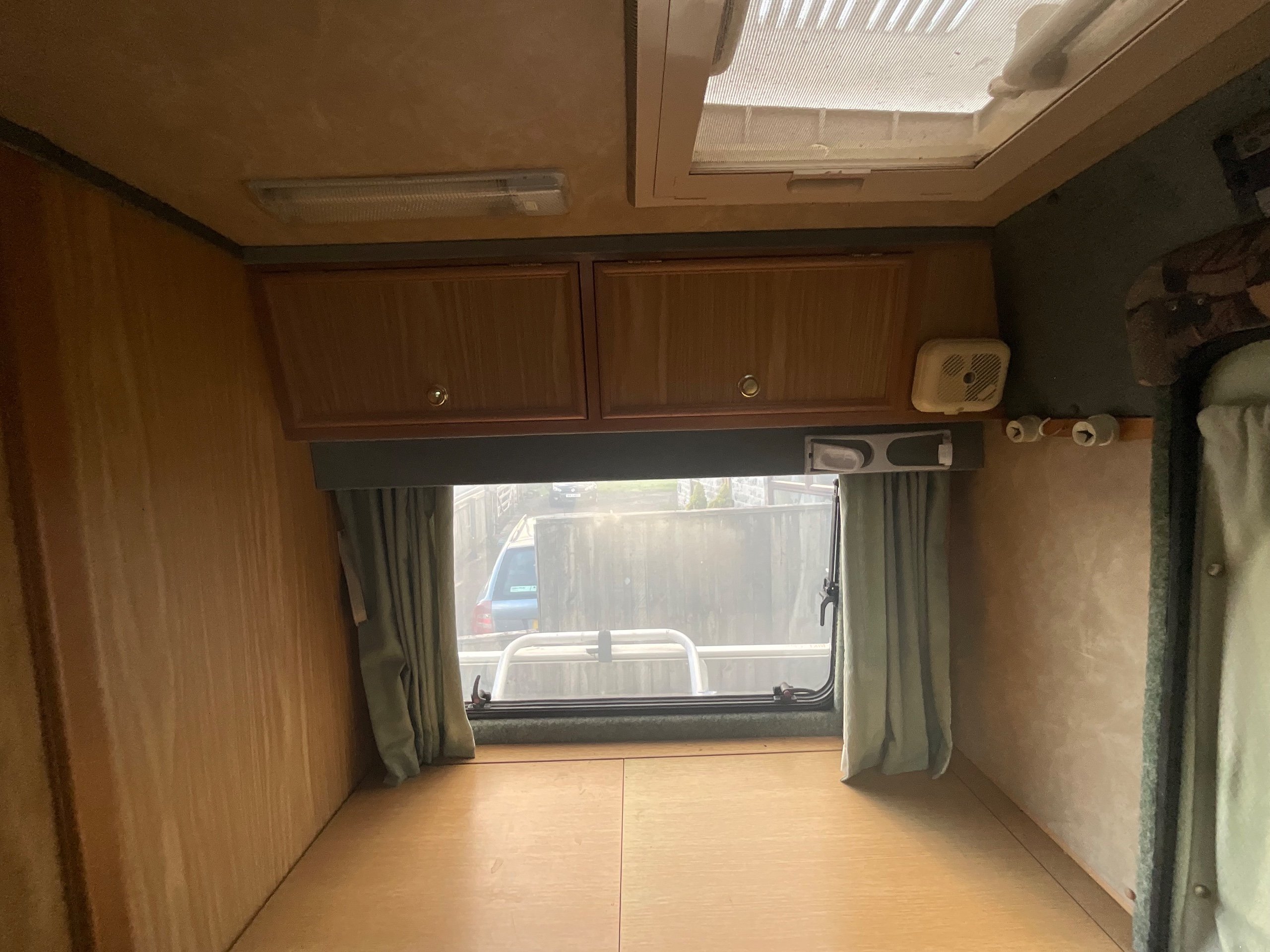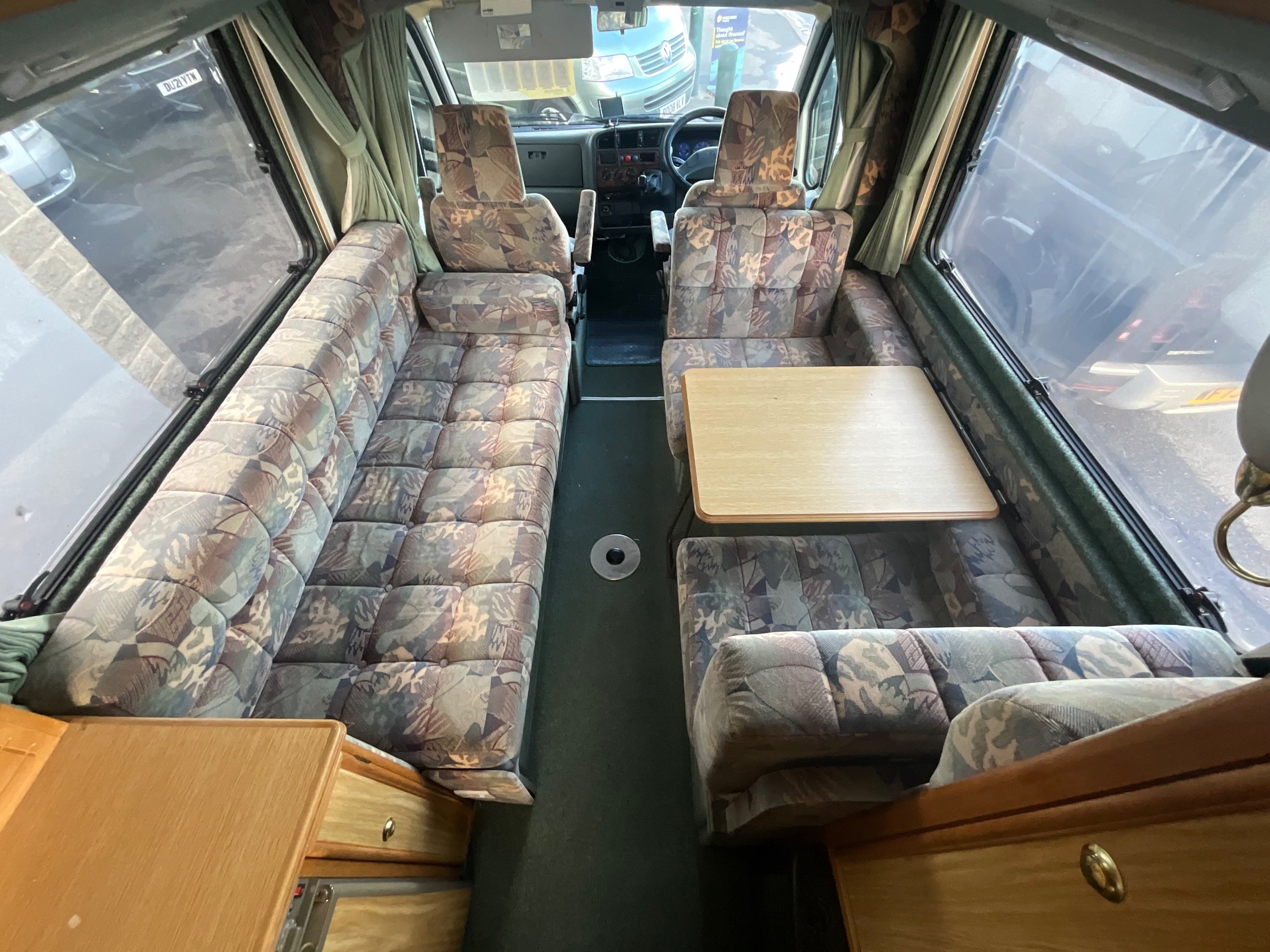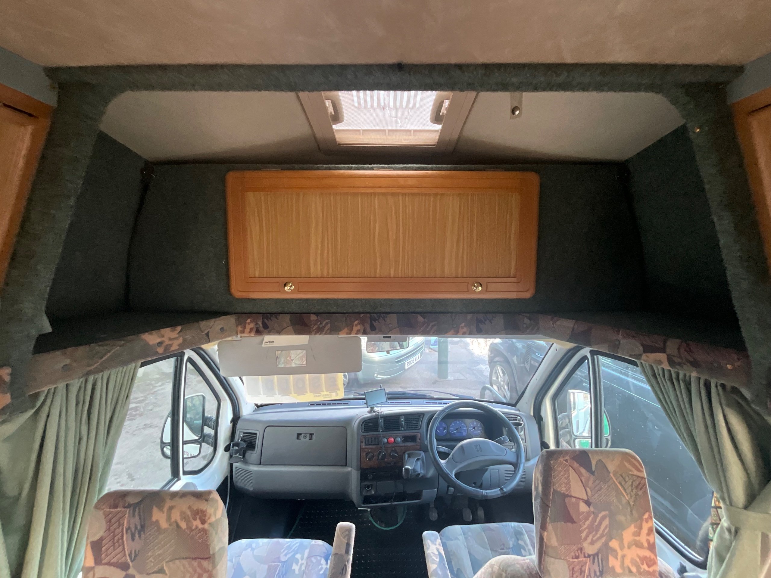 For the sleeping arrangement the bench seat forms one large single bed over 6ft in length with the dinette forming the other single bed, with both front seating sliding forwards to further enhance the single beds length. Alternatively this area can form into a large double bed. The overhead cab area offers storage or forms another double bed.