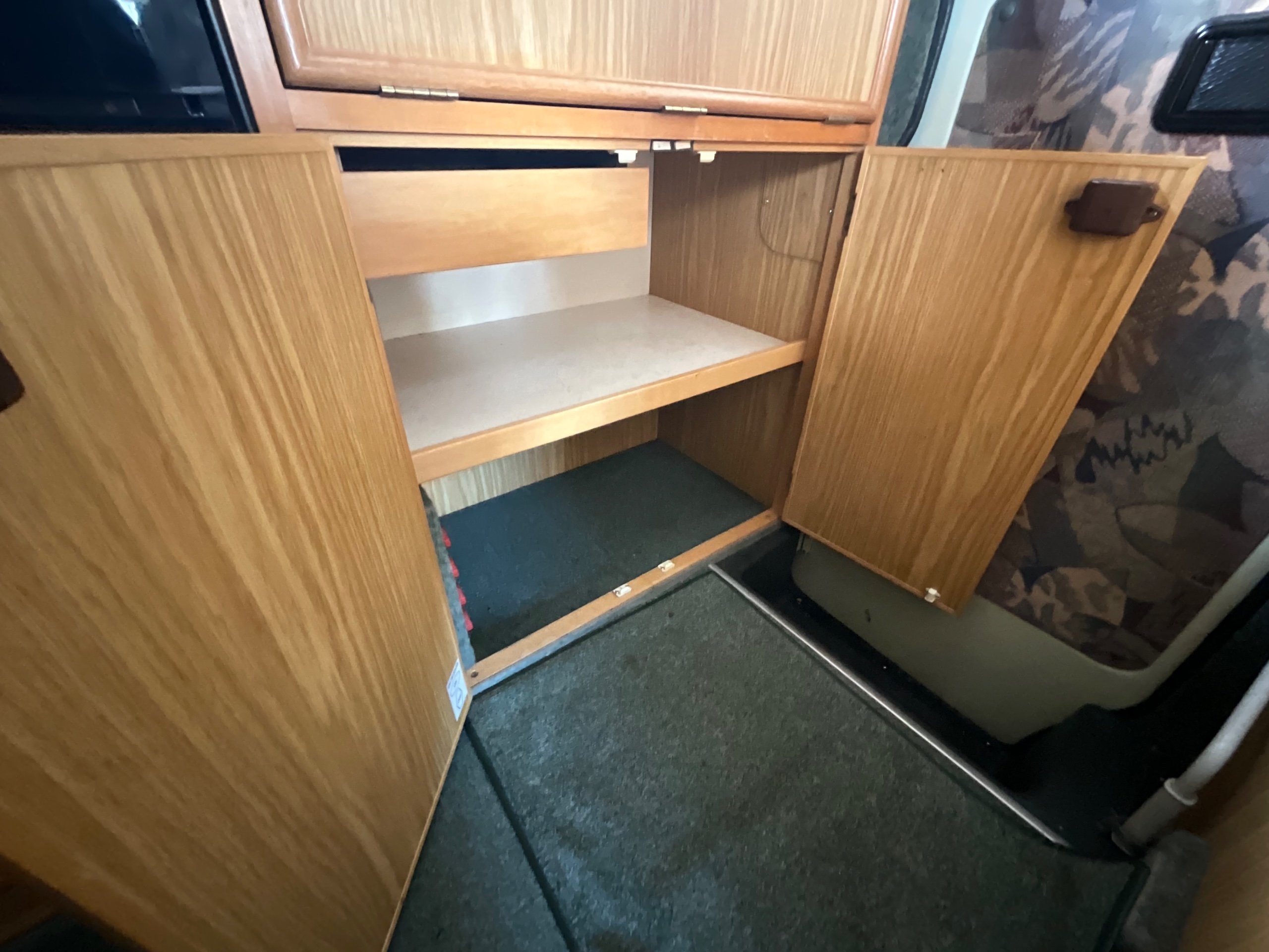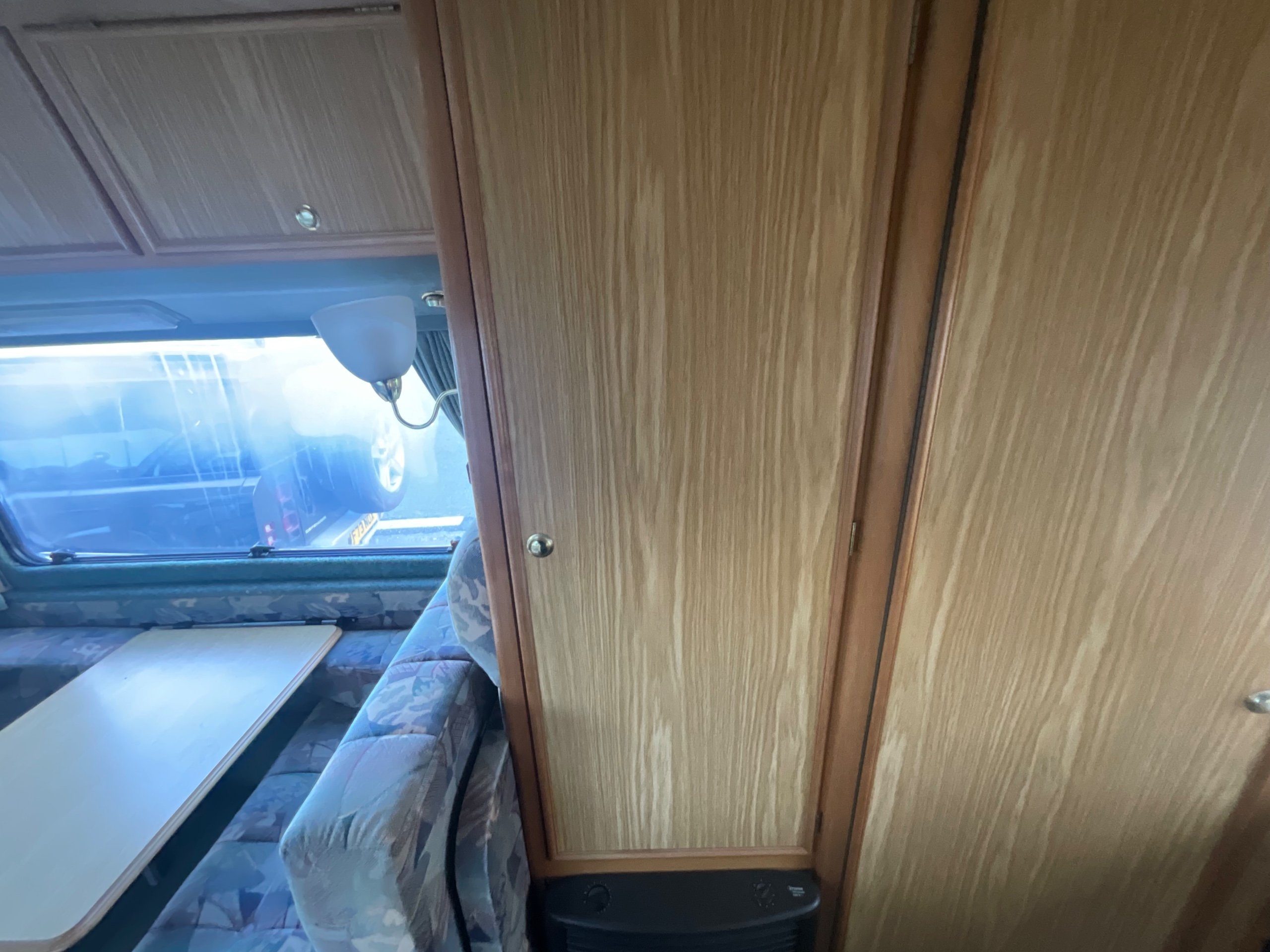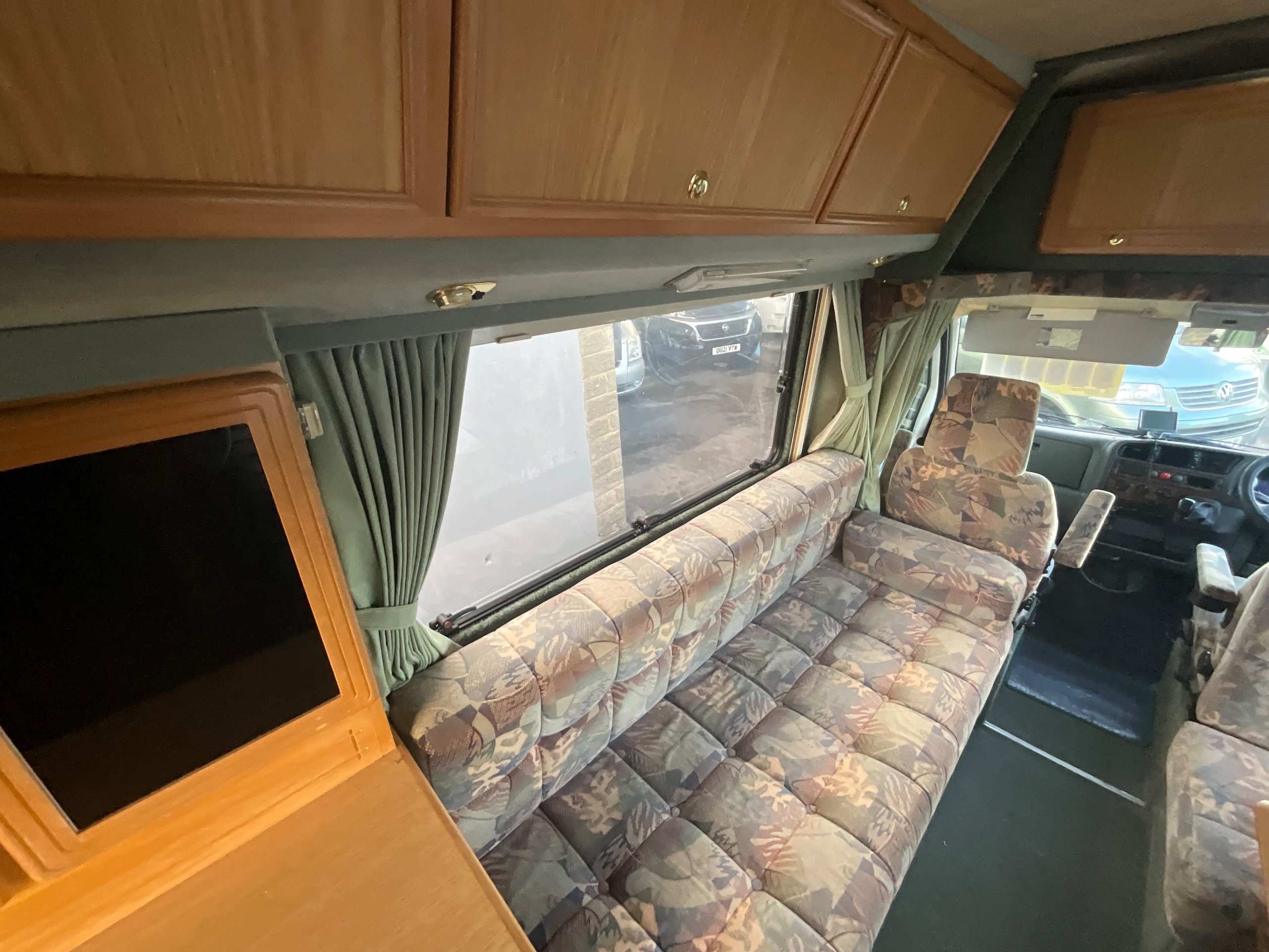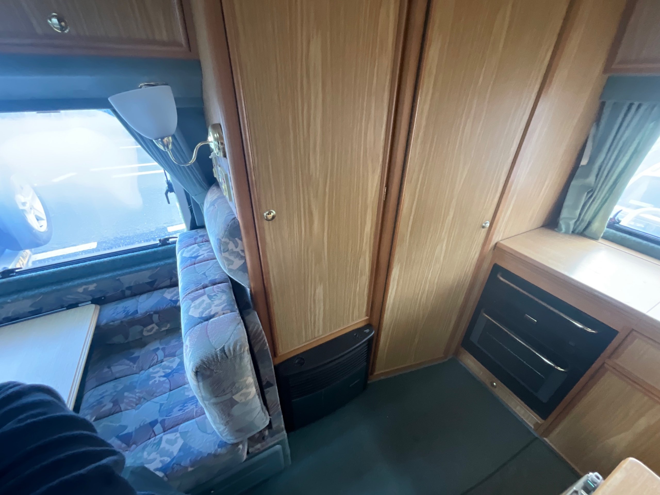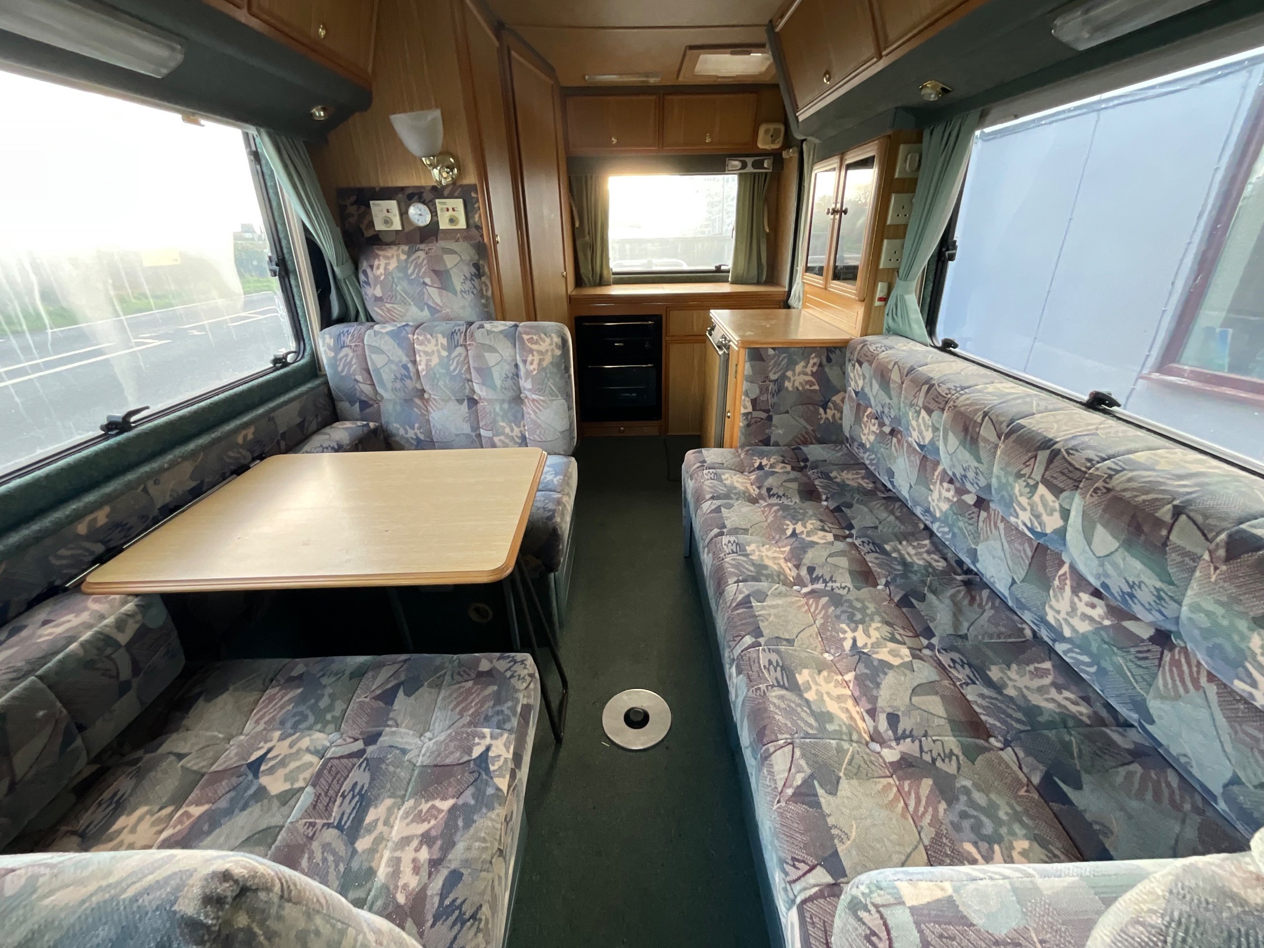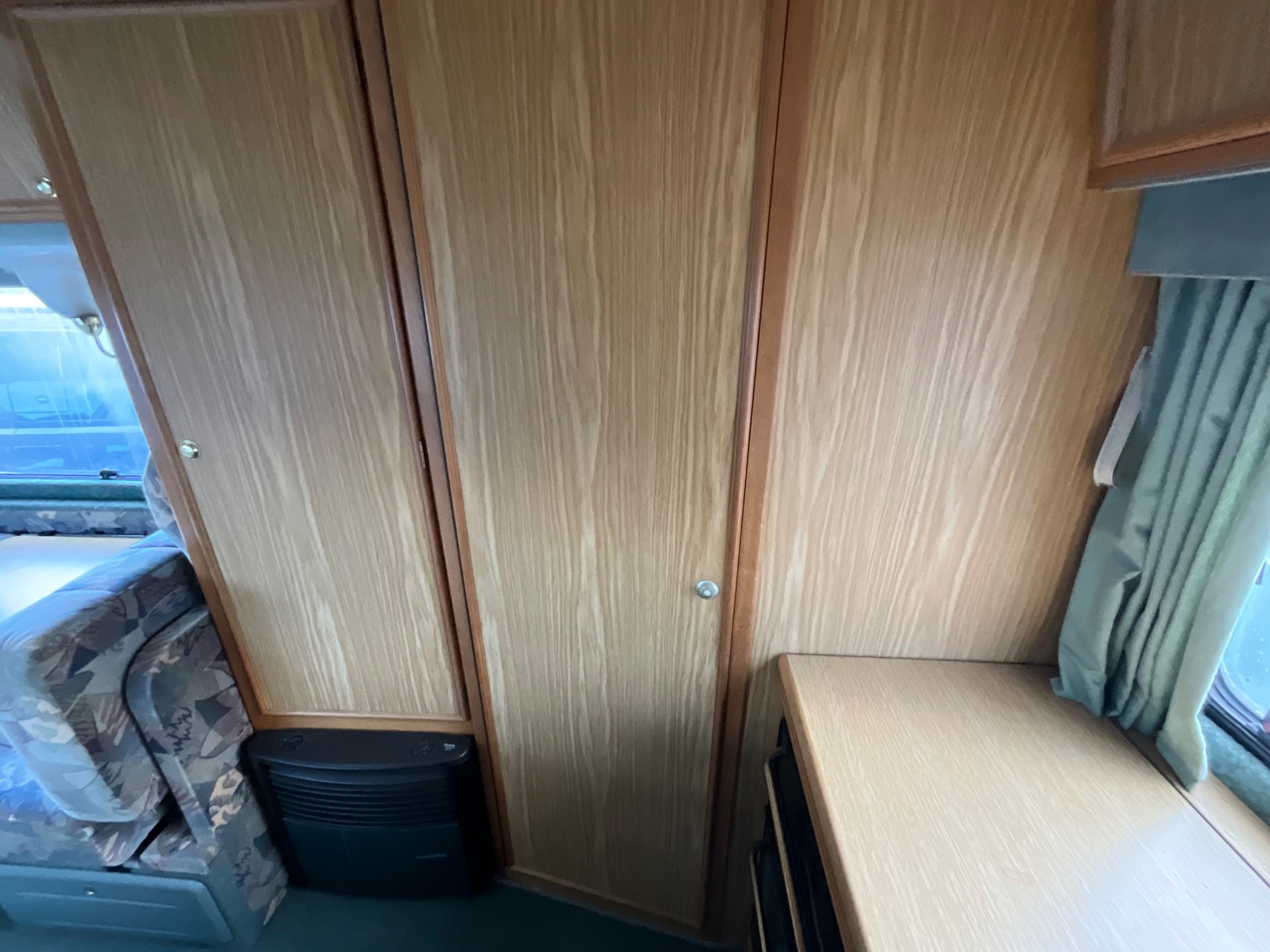 For the sleeping arrangement the bench seat forms one large single bed over 6ft in length with the dinette forming the other single bed, with both front seating sliding forwards to further enhance the single beds length. Alternatively this area can form into a large double bed. The overhead cab area offers storage or forms another double bed.