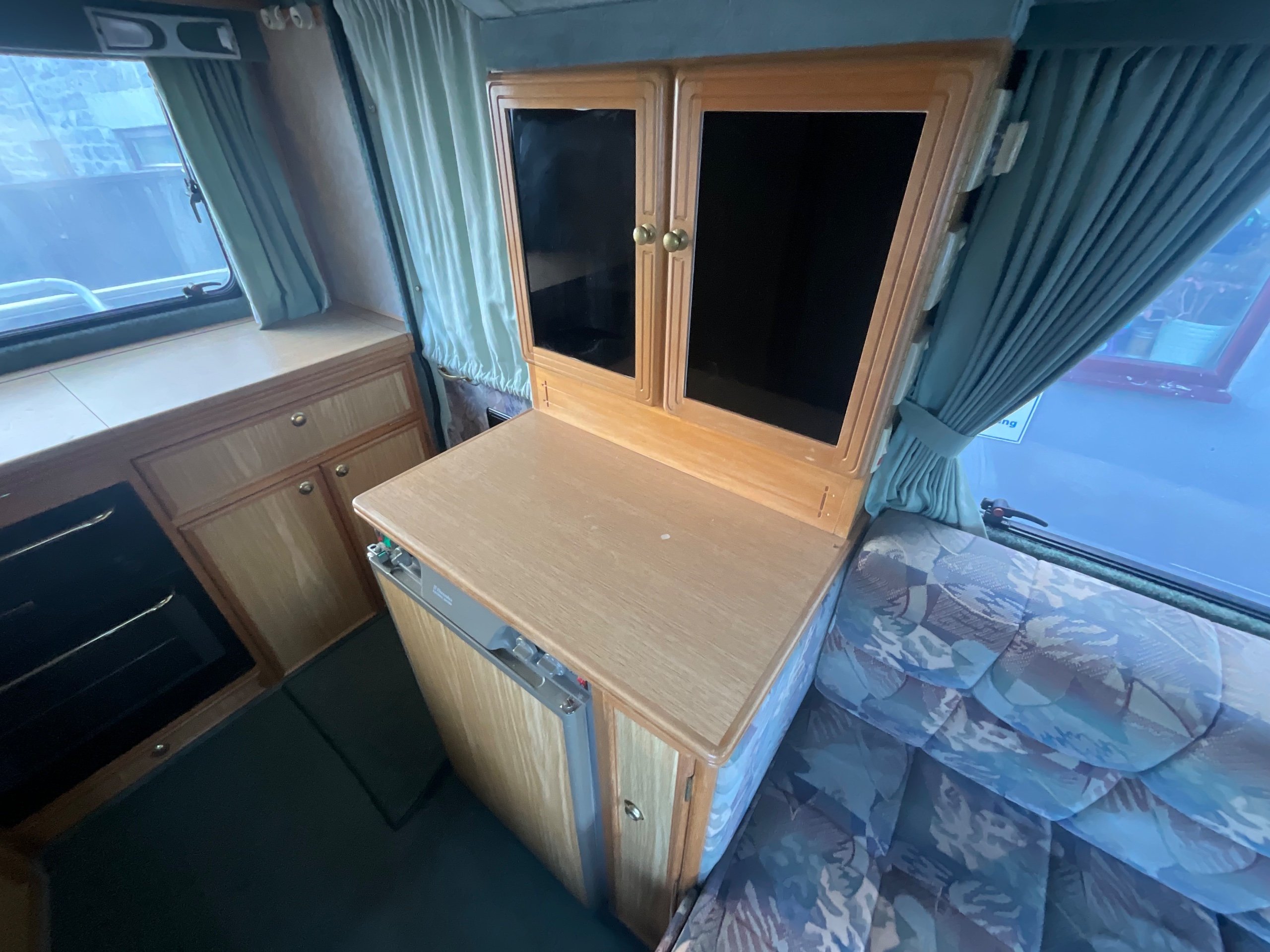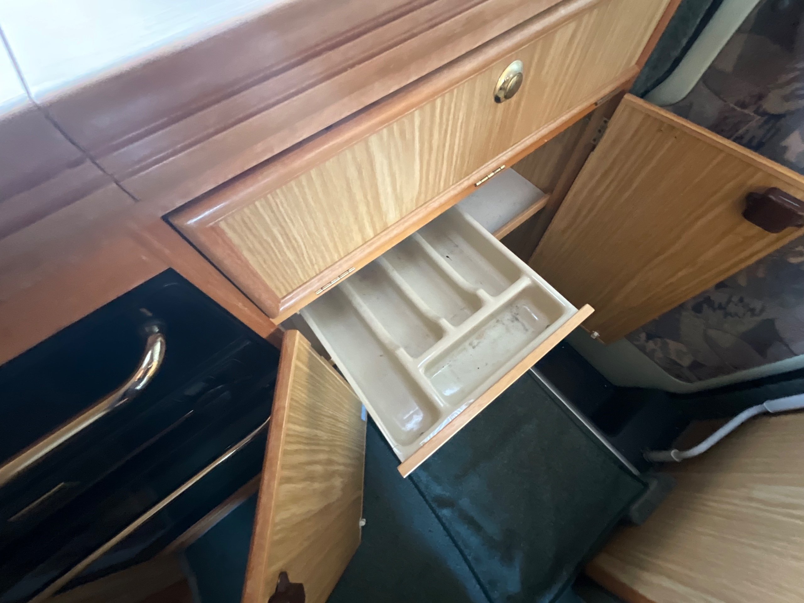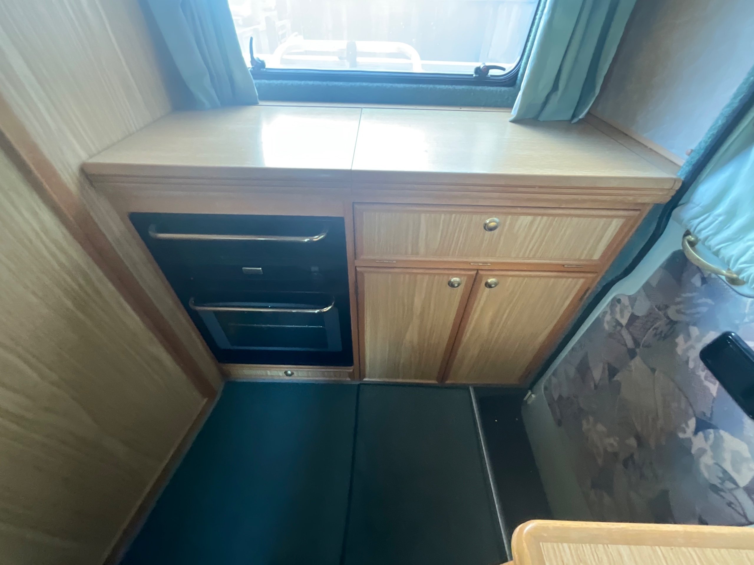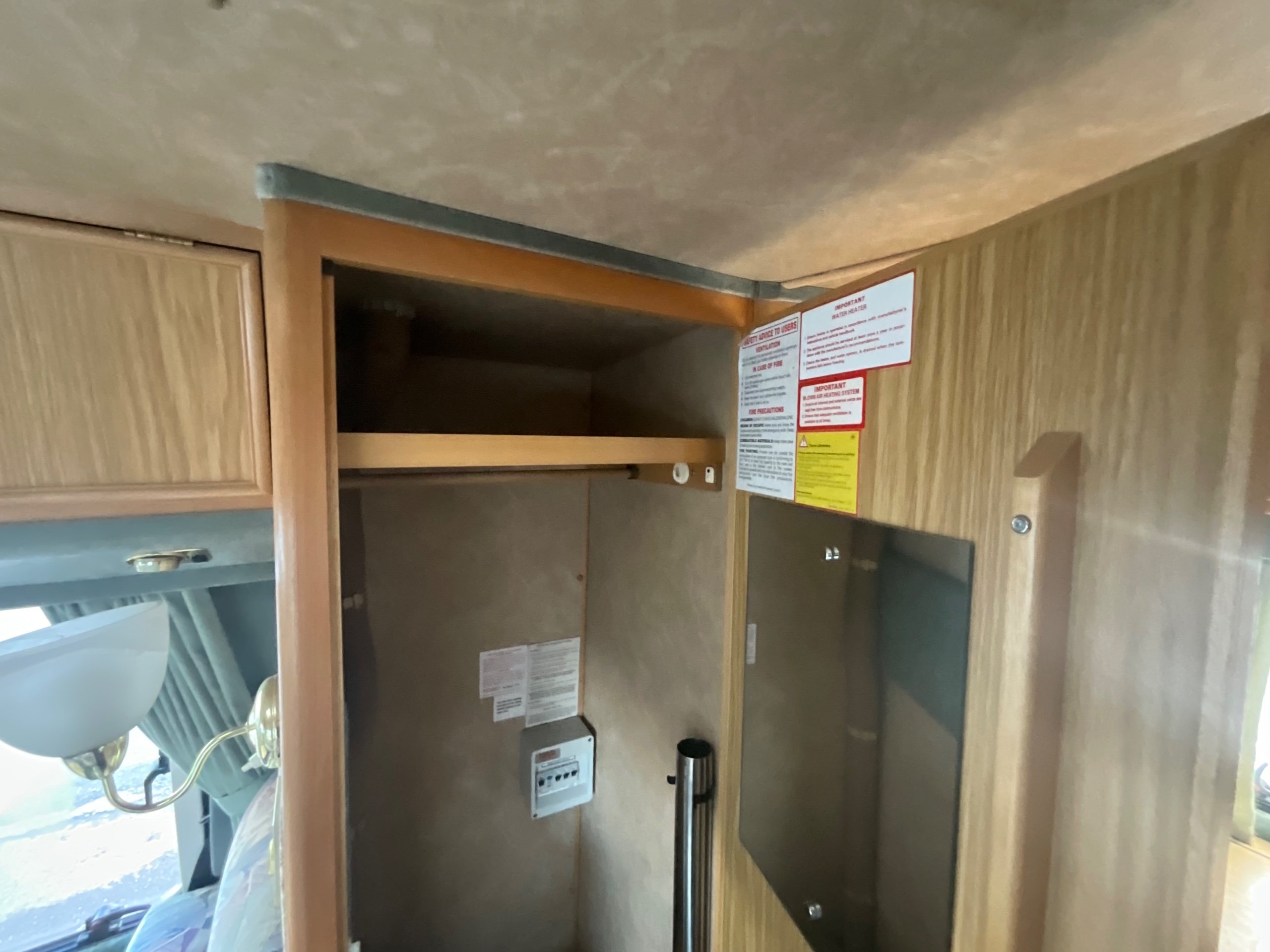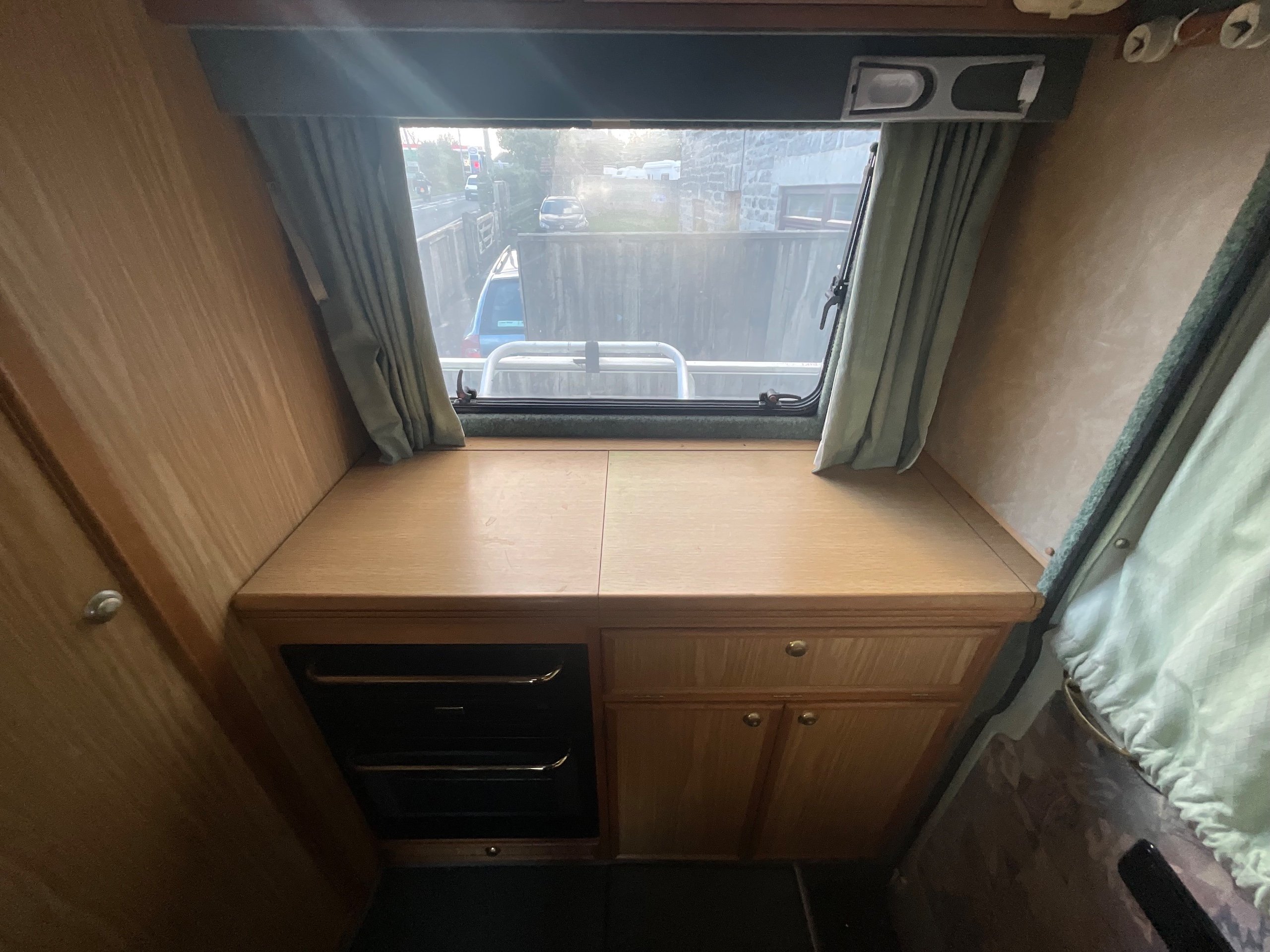 For the sleeping arrangement the bench seat forms one large single bed over 6ft in length with the dinette forming the other single bed, with both front seating sliding forwards to further enhance the single beds length. Alternatively this area can form into a large double bed. The overhead cab area offers storage or forms another double bed.