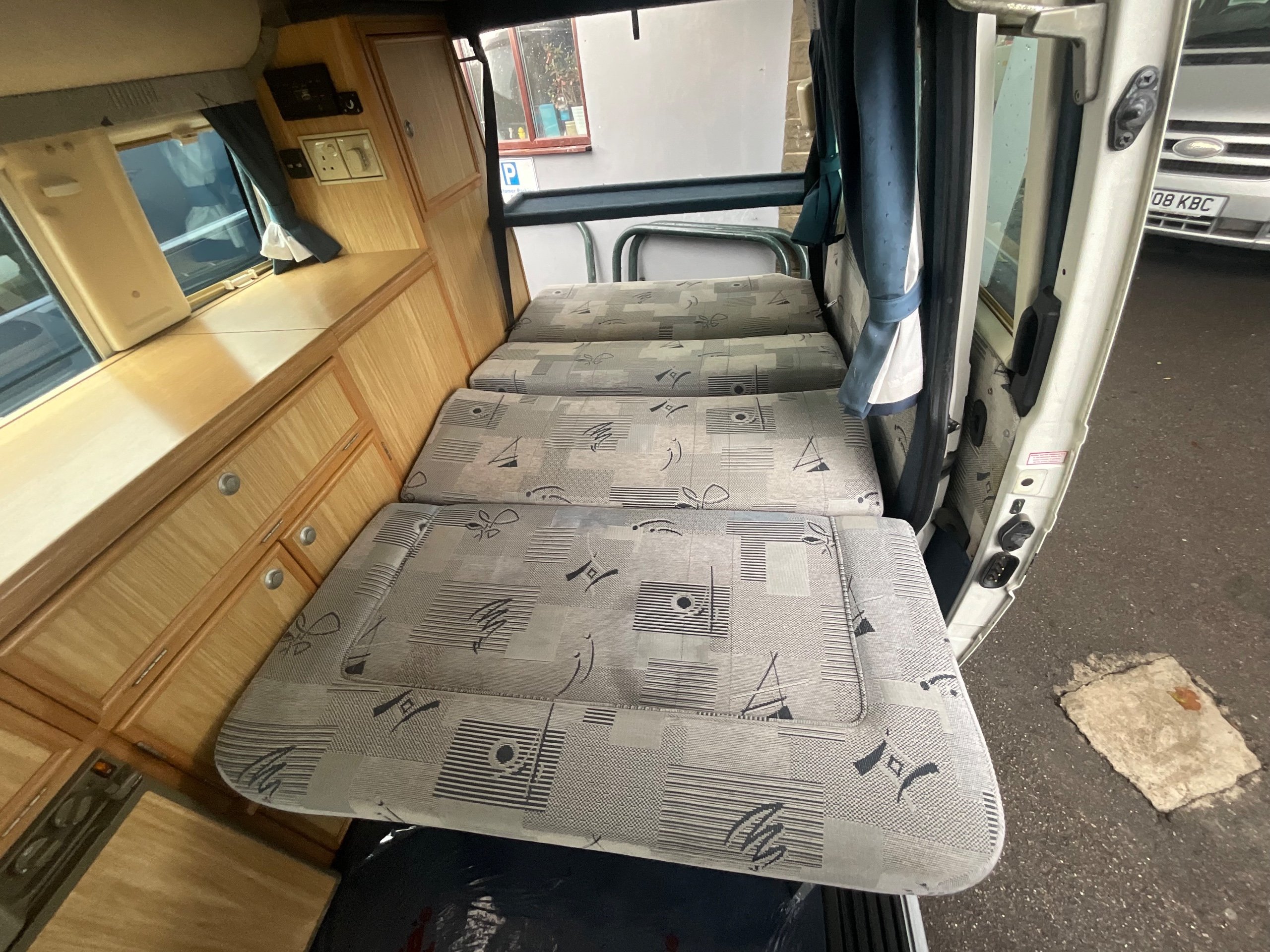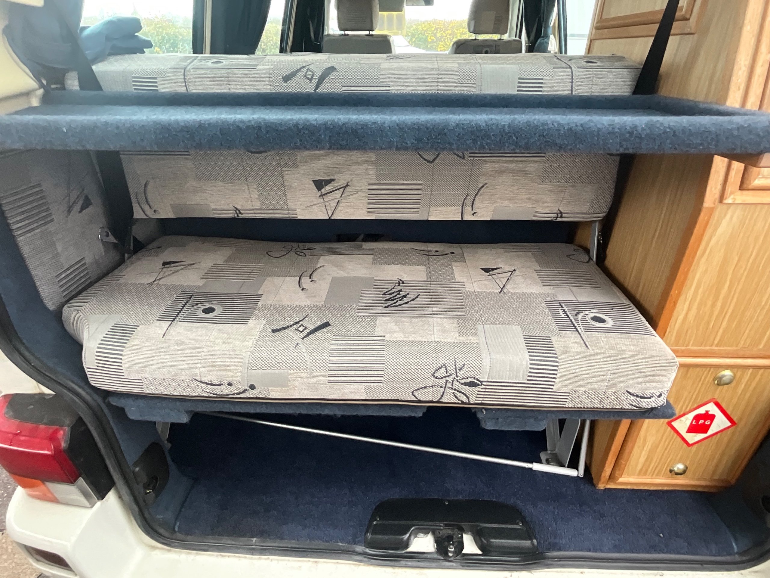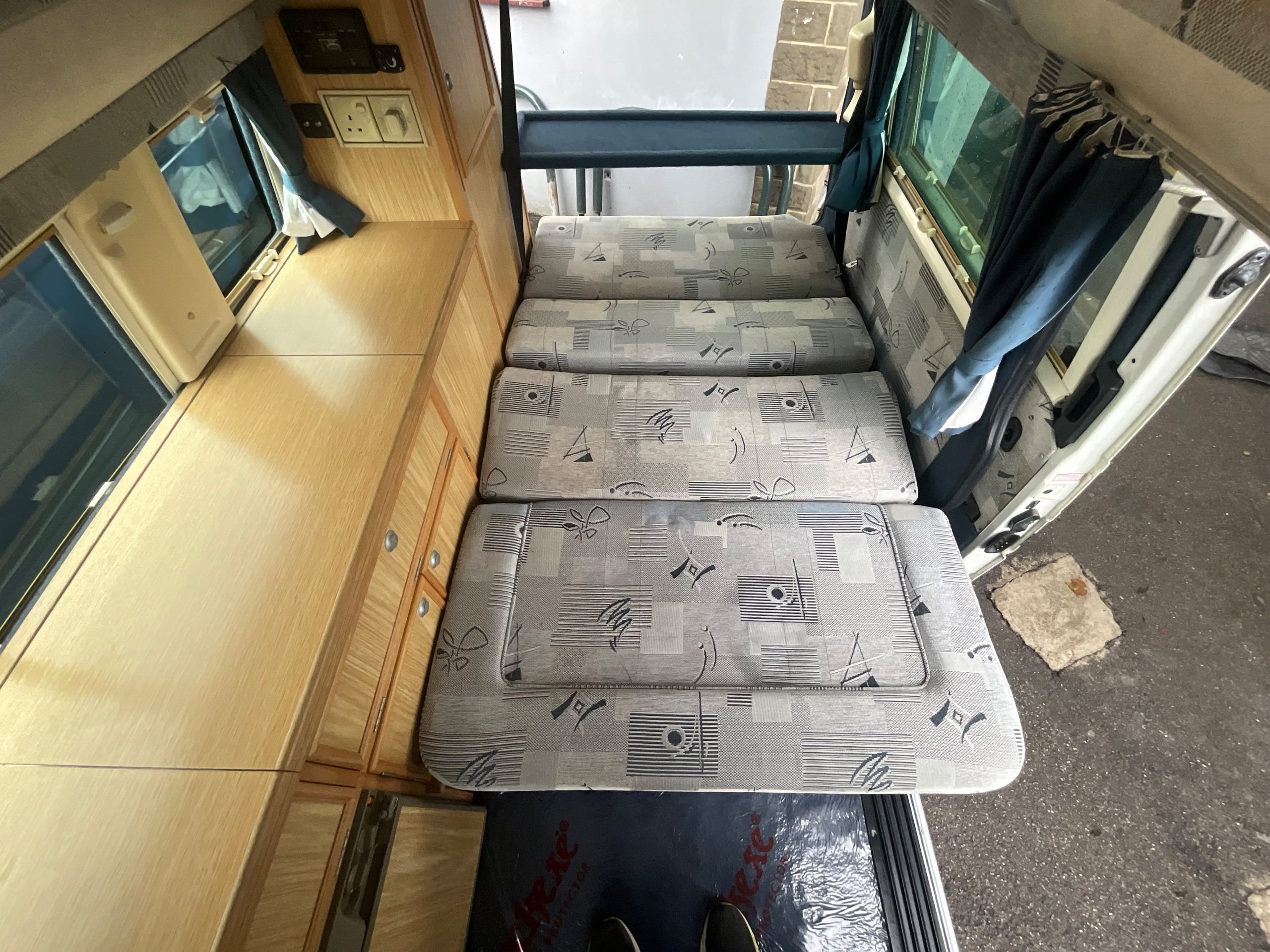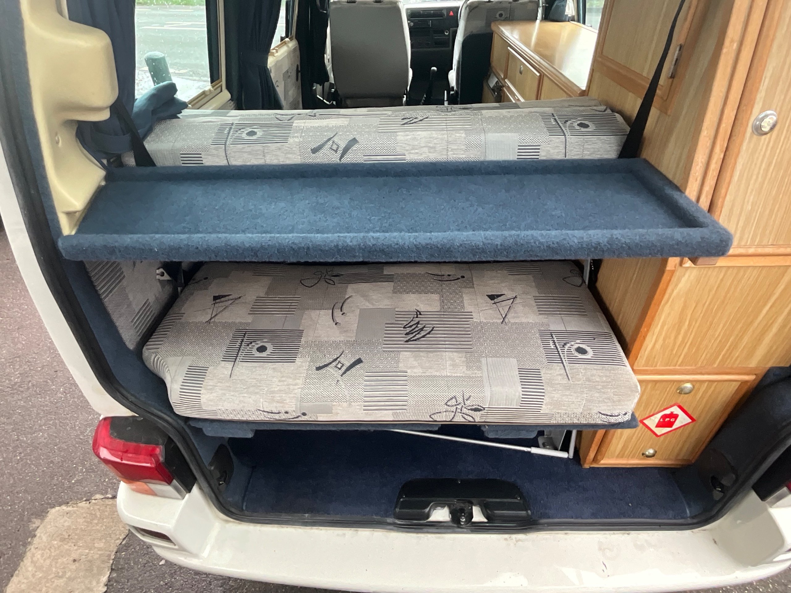 Auto-sleepers Trident 4 Berth, bench seat to the rear with two forward facing seats belts to use while touring or an as lounge area / bed. There is also another smaller double bed in the roof for sleeping or storage.