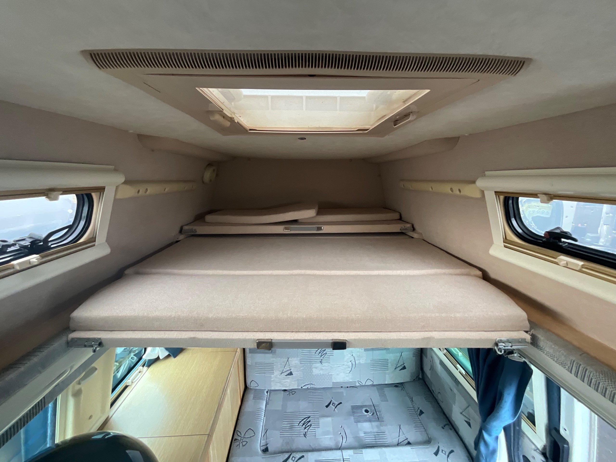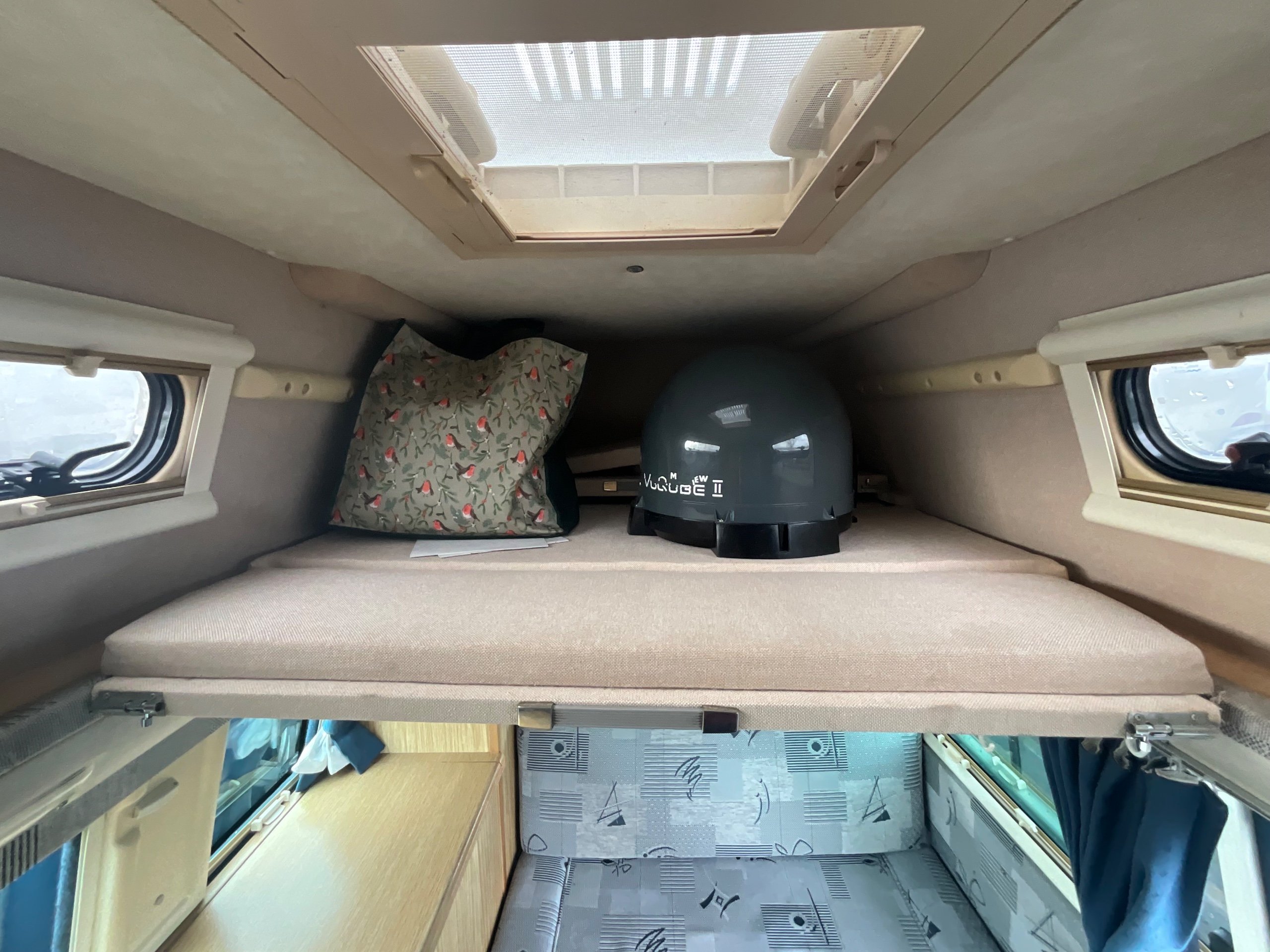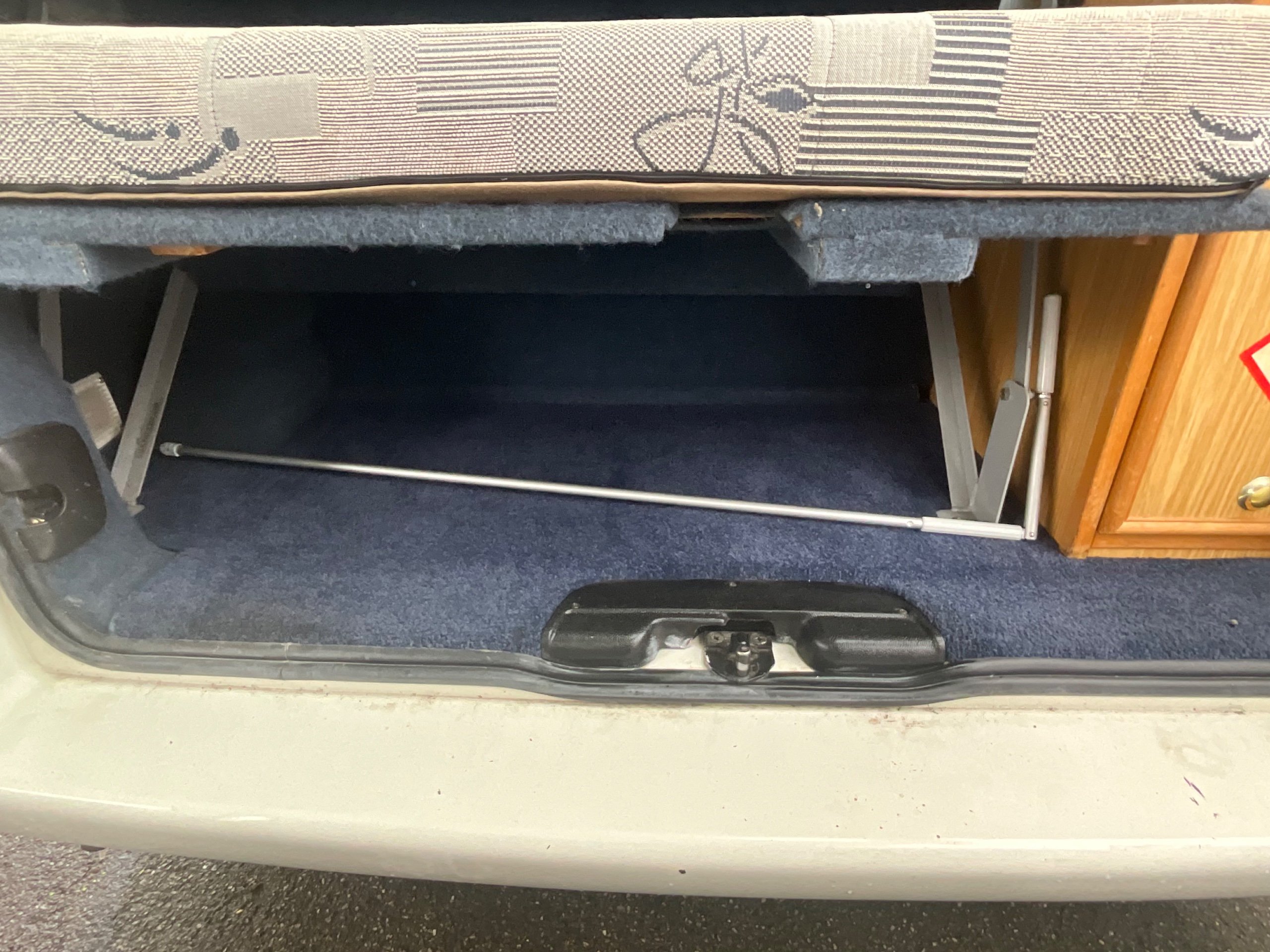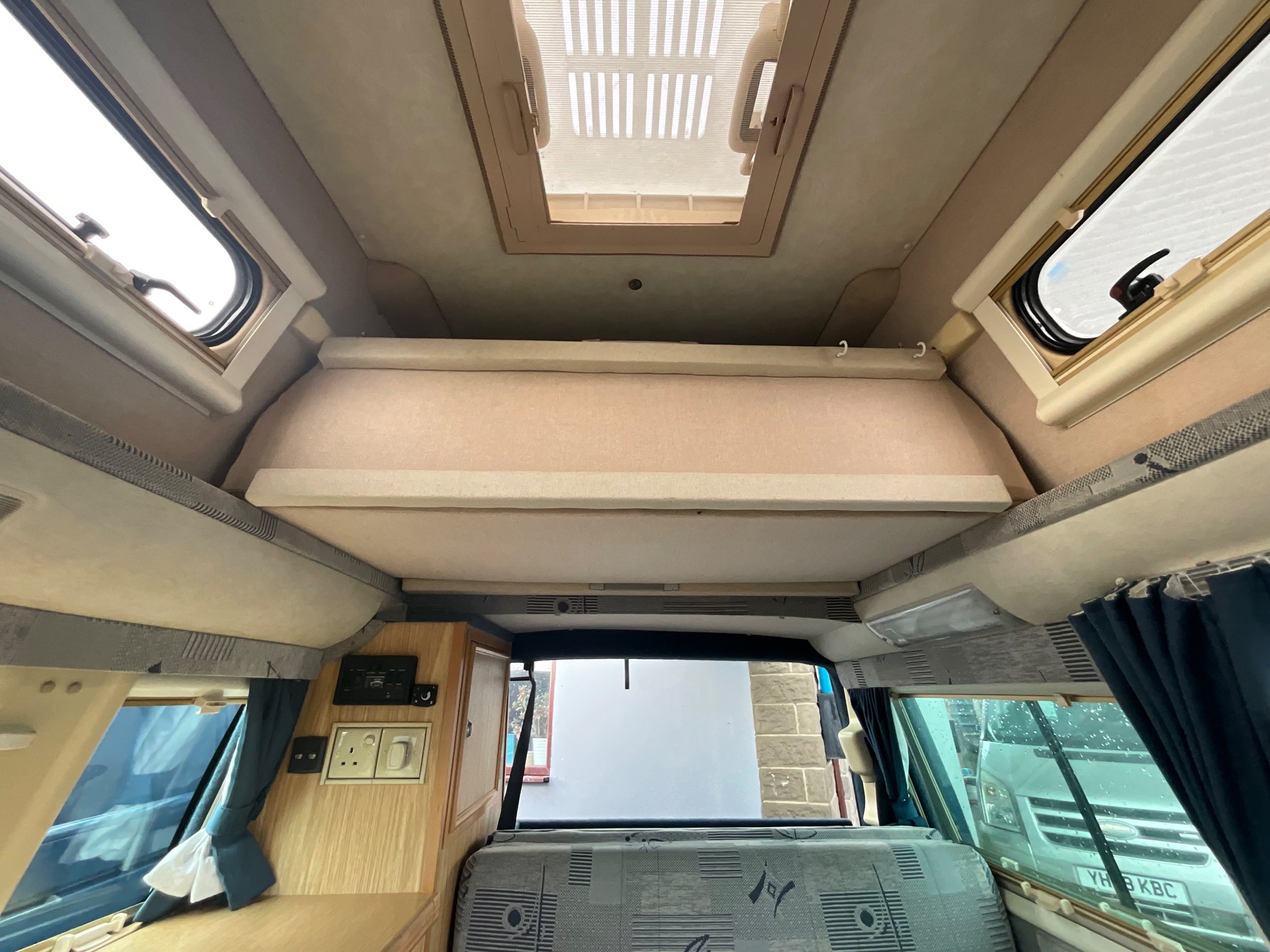 Auto-sleepers Trident 4 Berth, bench seat to the rear with two forward facing seats belts to use while touring or an as lounge area / bed. There is also another smaller double bed in the roof for sleeping or storage.