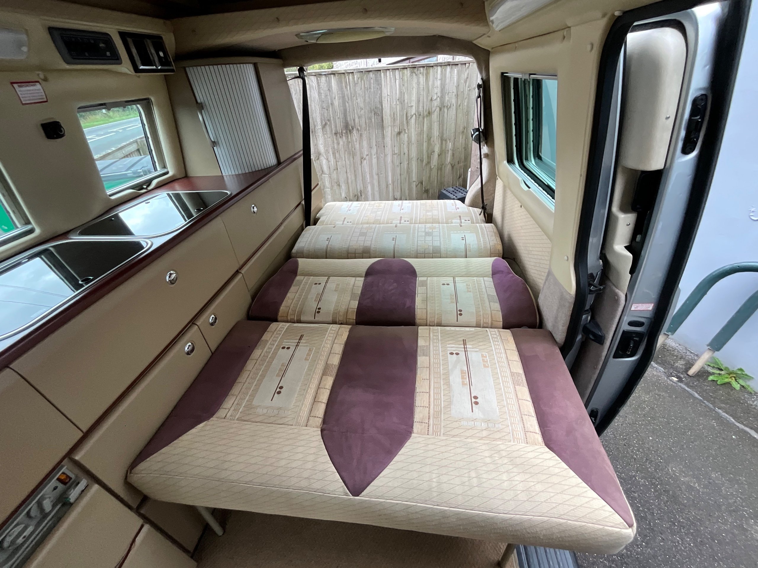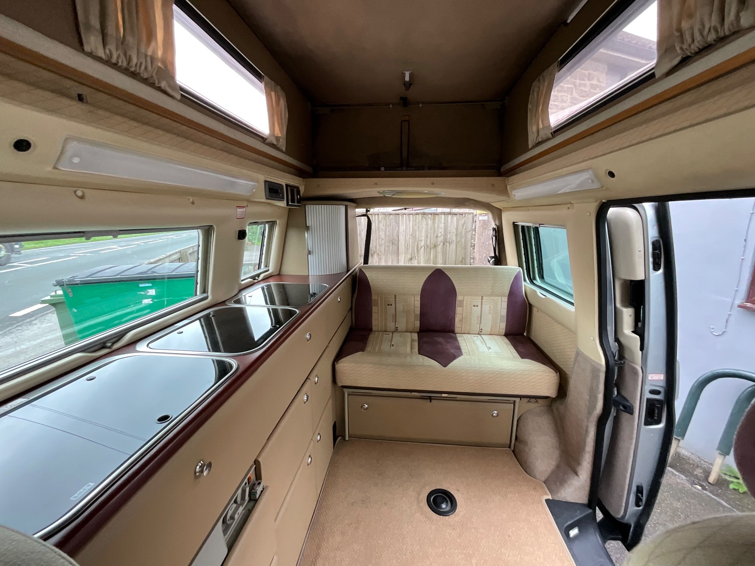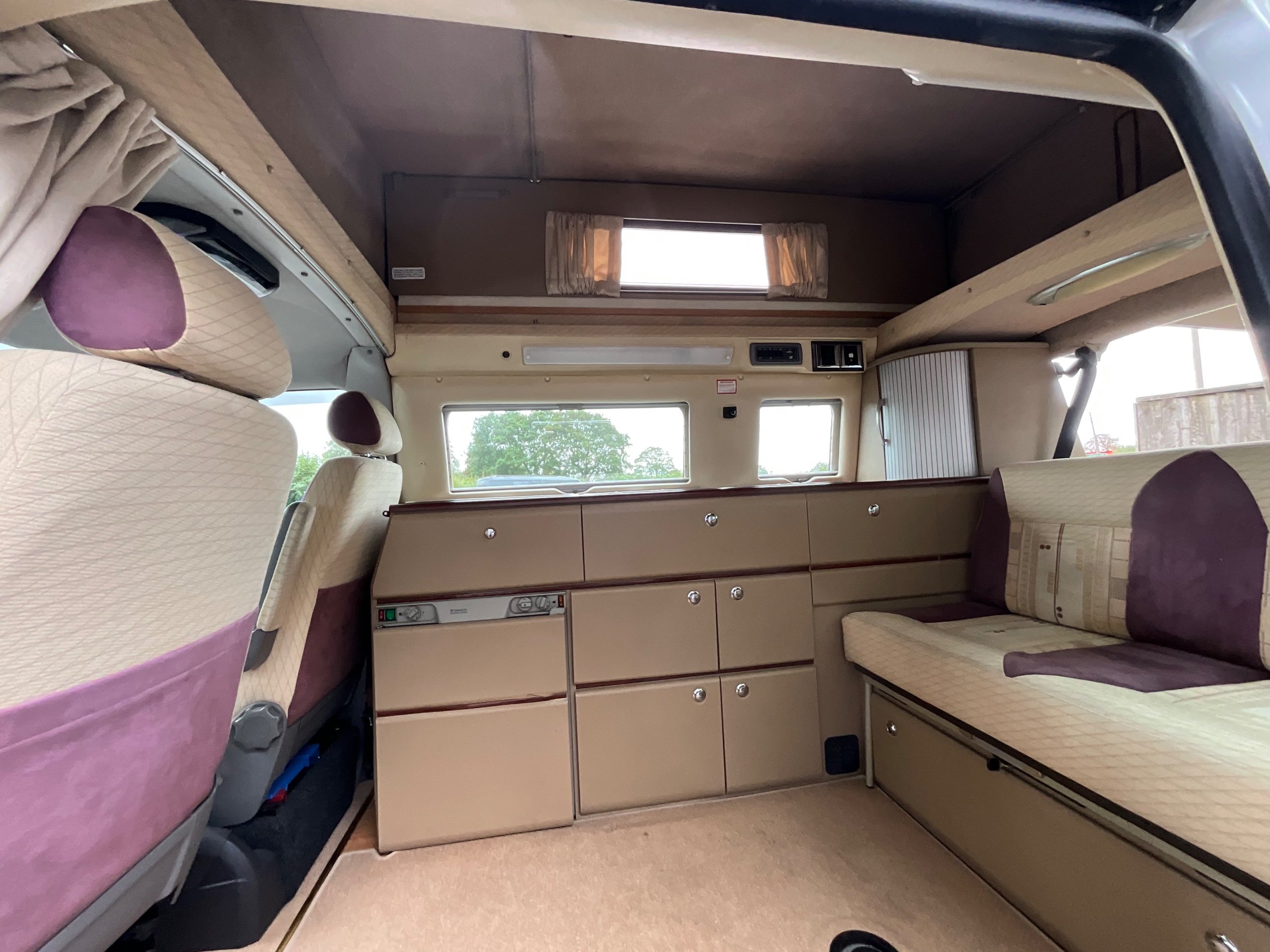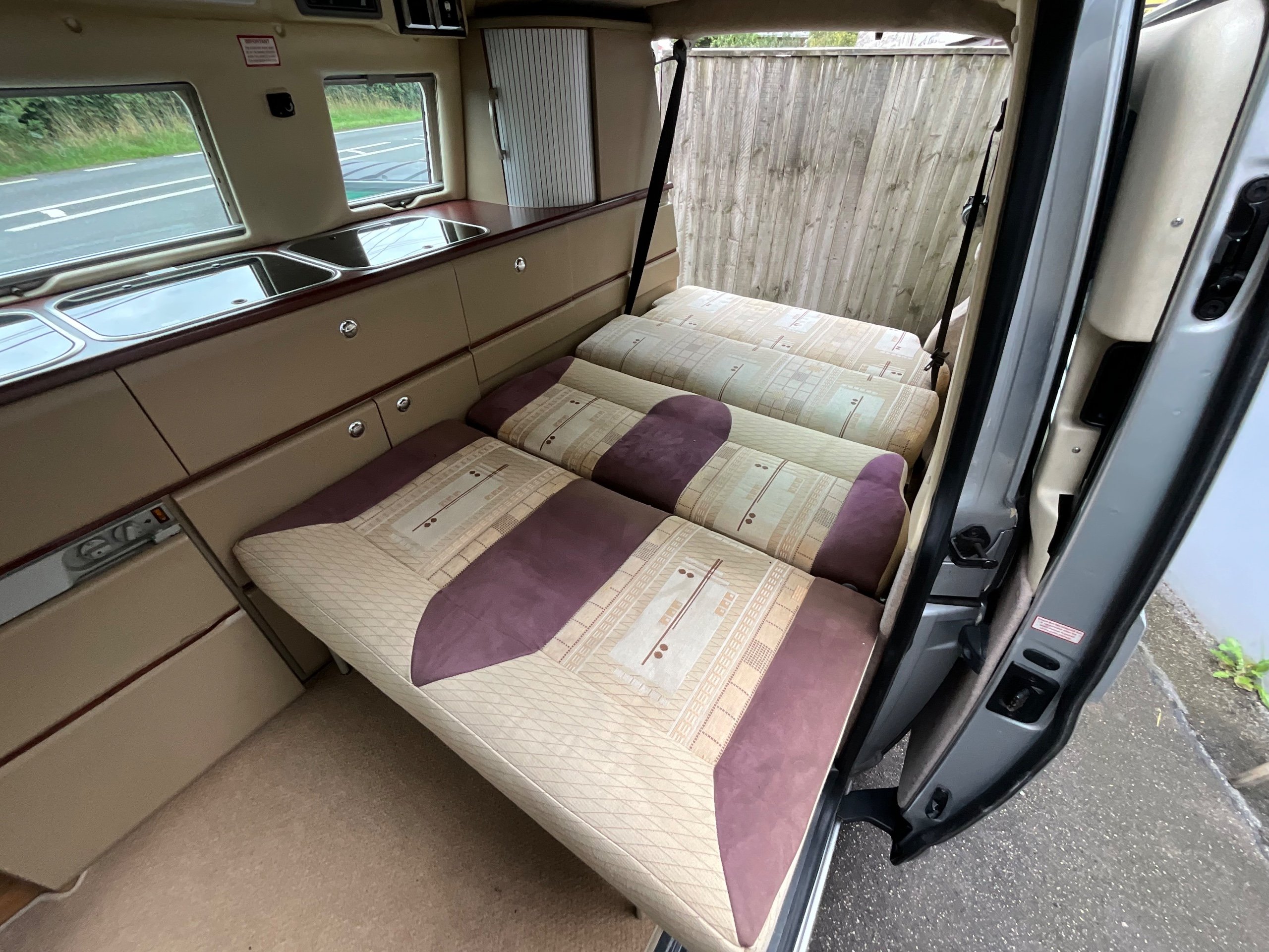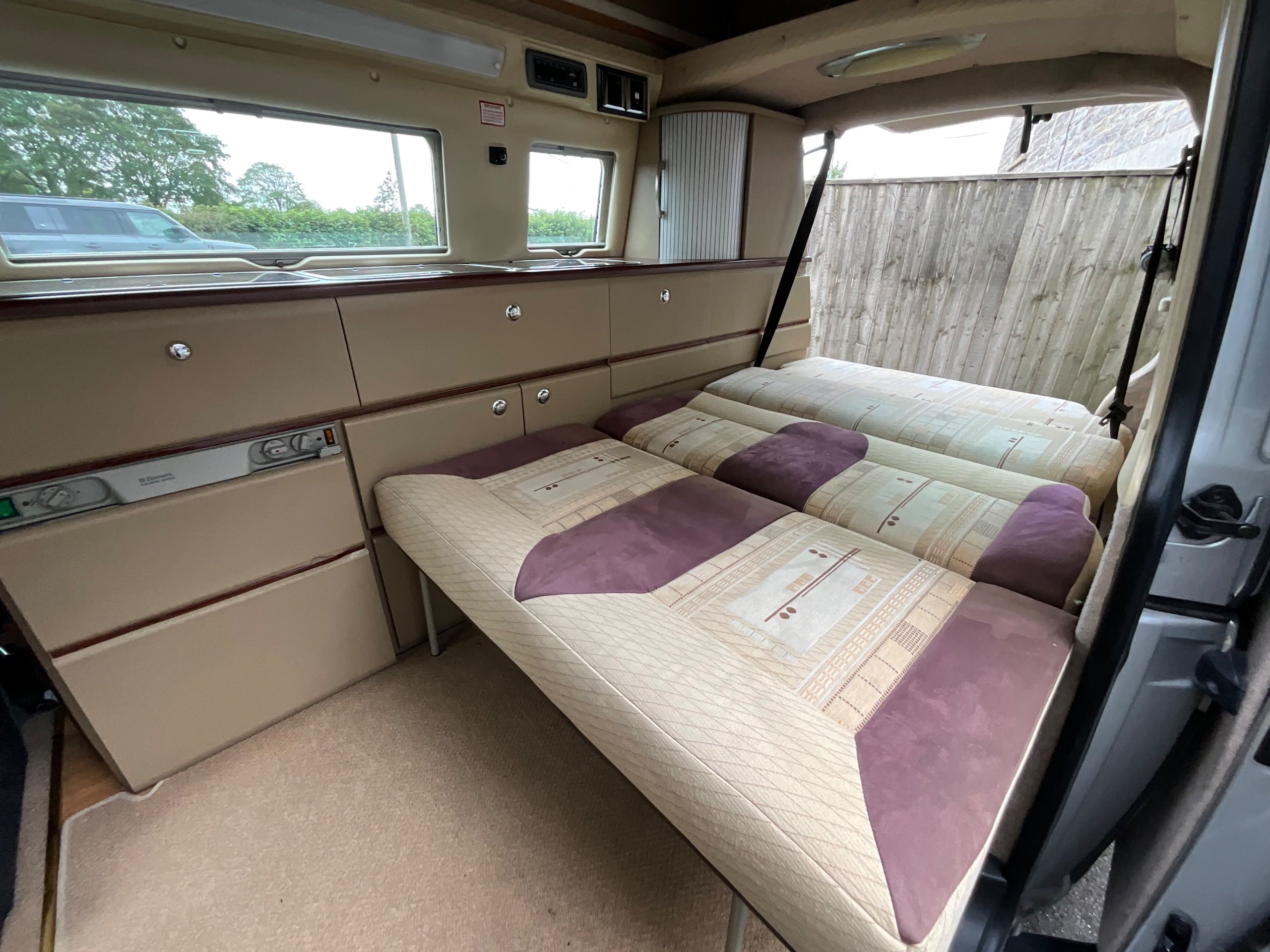 Auto-sleepers Trooper 4 Berth, bench seat to the rear which has two forward facing fully belted seats to use while touring or an as lounge area / bed. There is also another smaller bed in the pop top roof (can raise or lower the roof) for sleeping or storage.