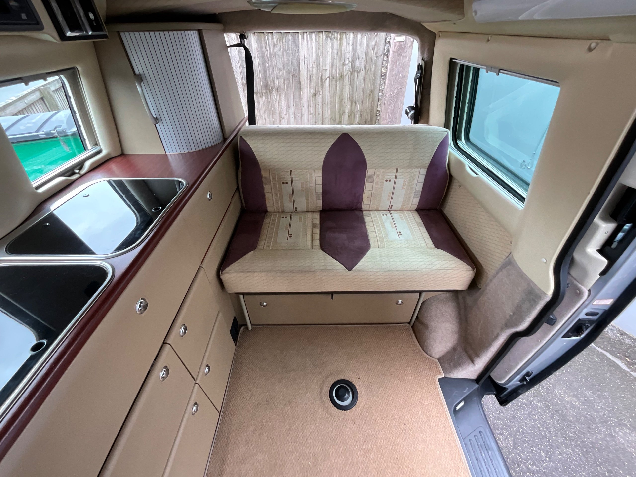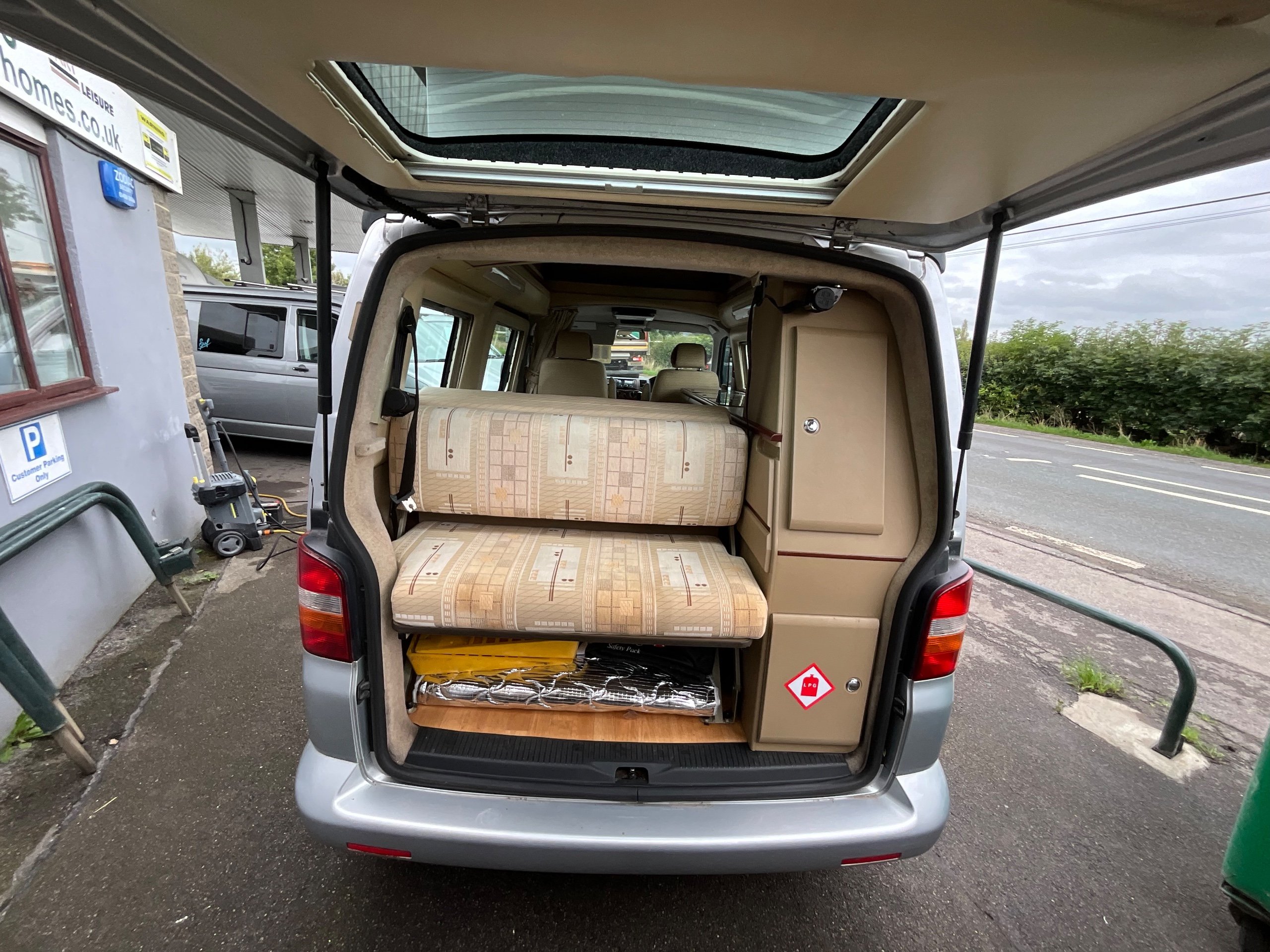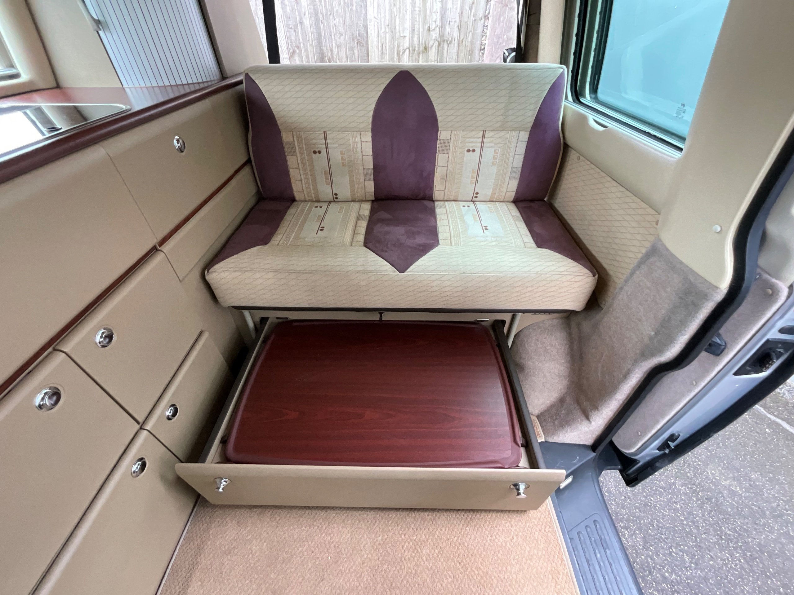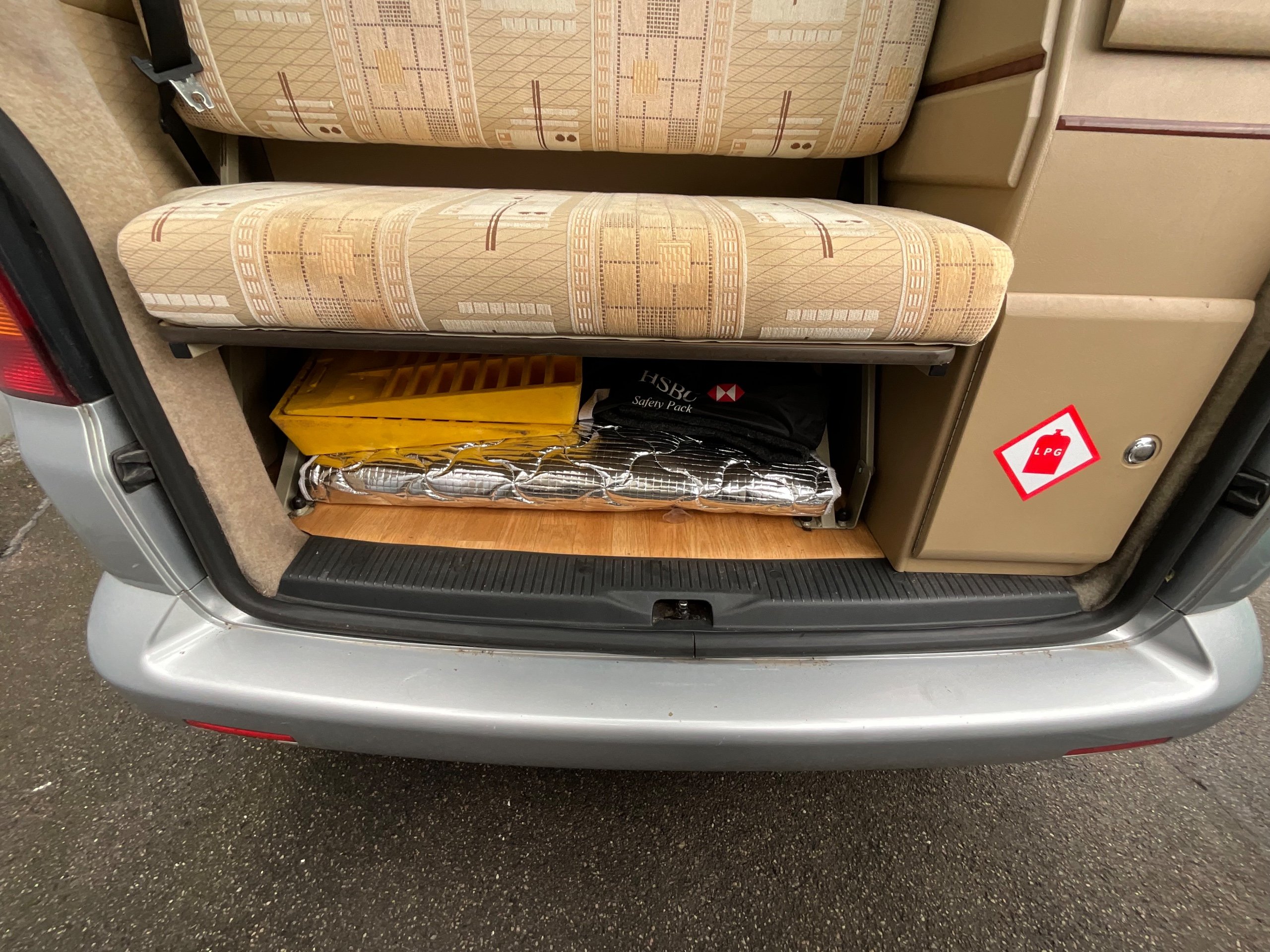 Auto-sleepers Trooper 4 Berth, bench seat to the rear which has two forward facing fully belted seats to use while touring or an as lounge area / bed. There is also another smaller bed in the pop top roof (can raise or lower the roof) for sleeping or storage.