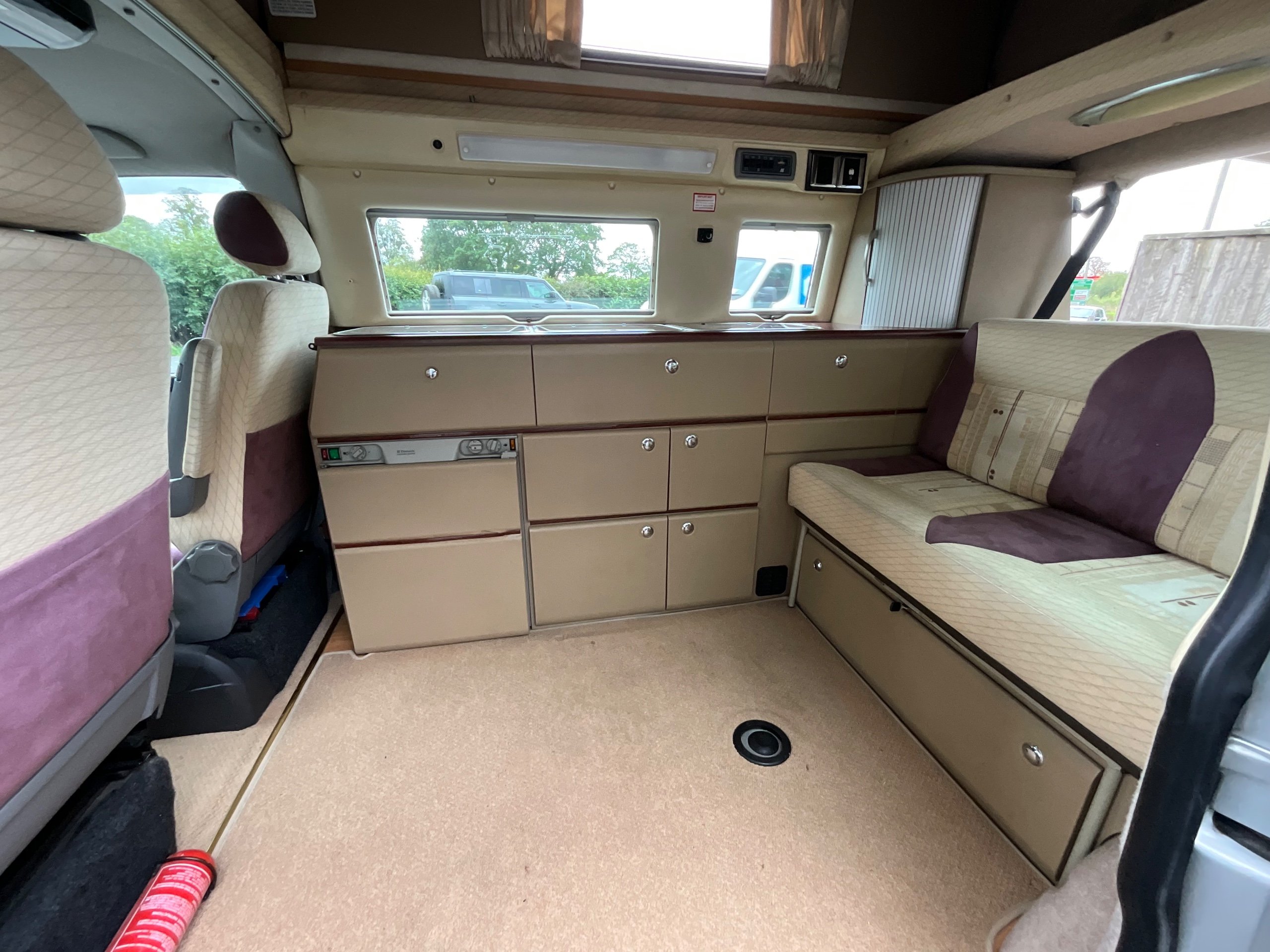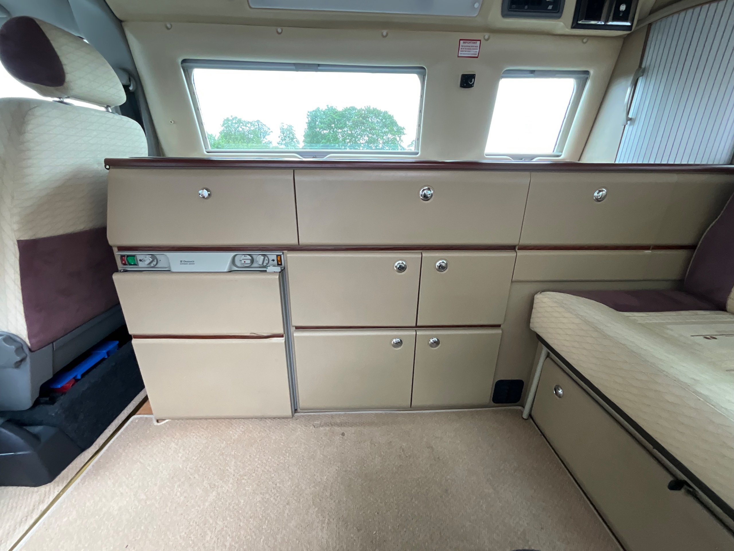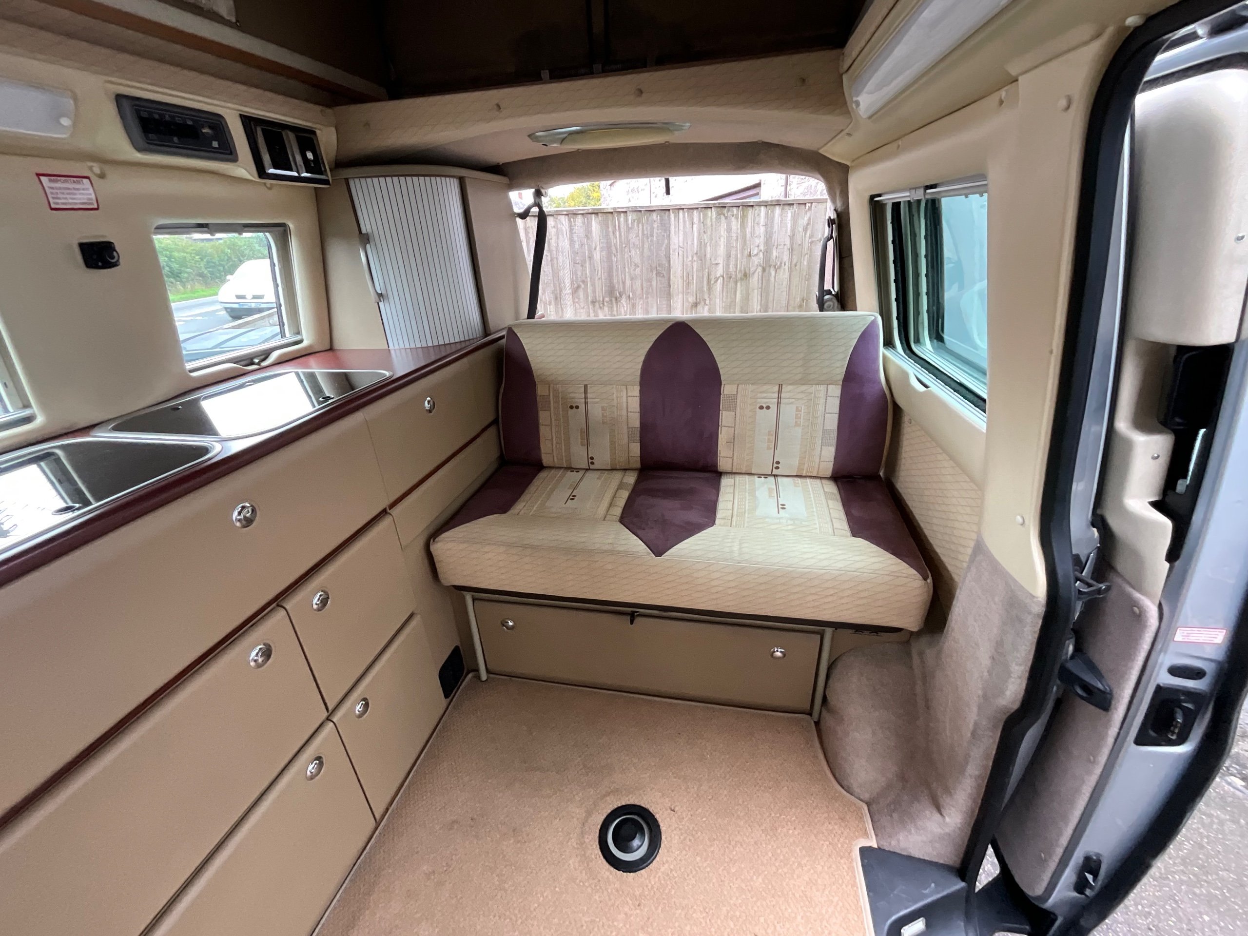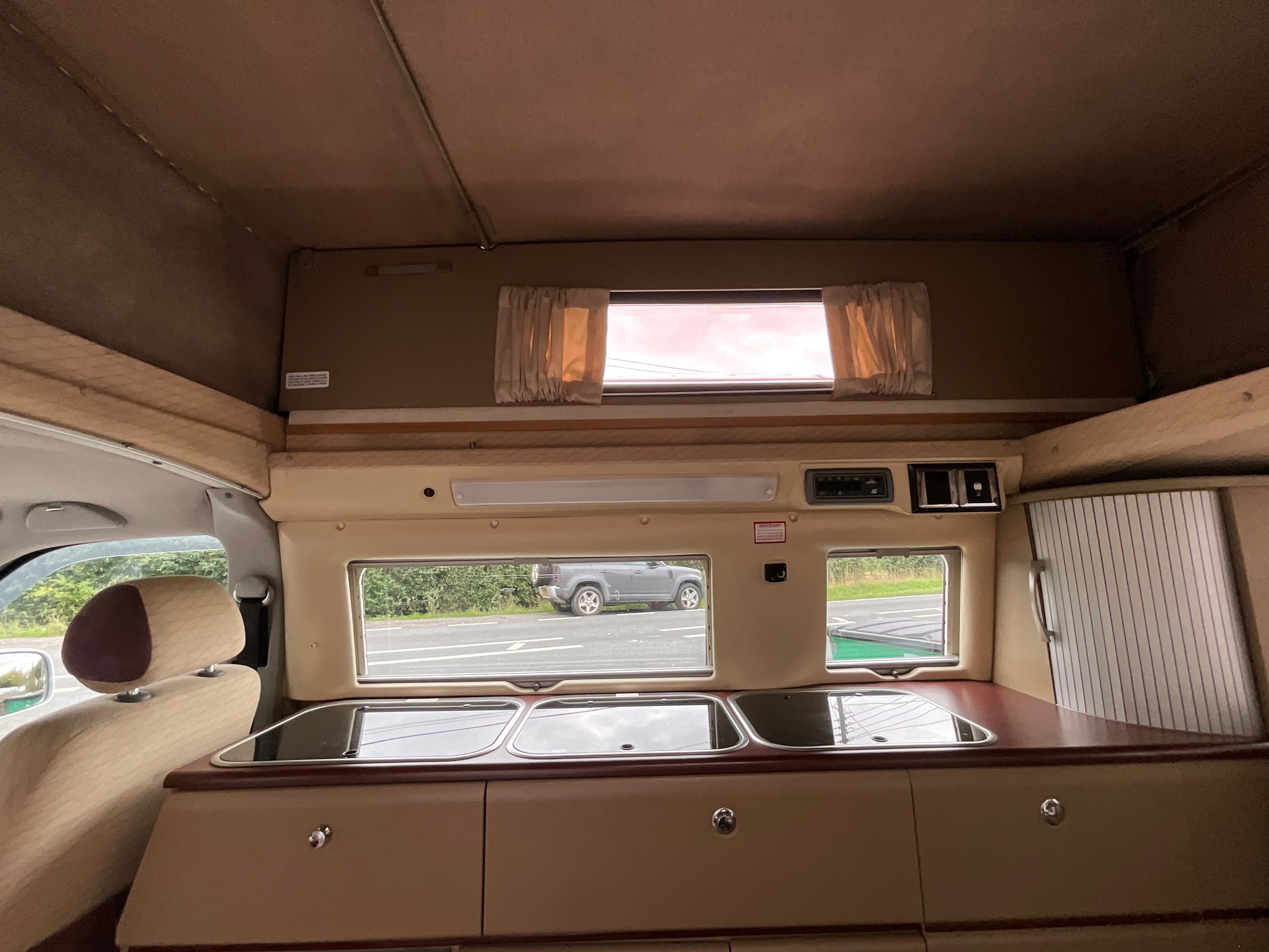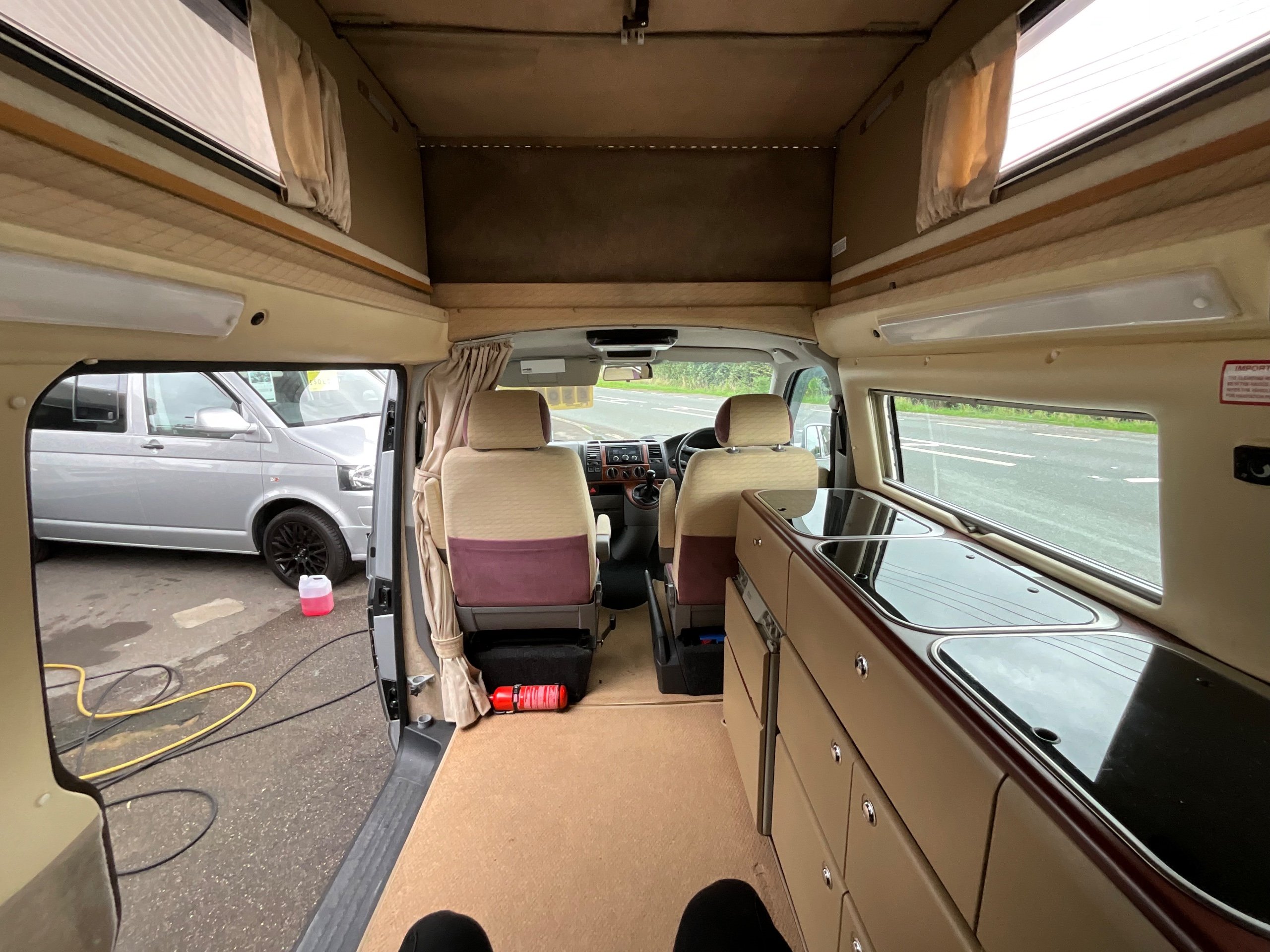 Auto-sleepers Trooper 4 Berth, bench seat to the rear which has two forward facing fully belted seats to use while touring or an as lounge area / bed. There is also another smaller bed in the pop top roof (can raise or lower the roof) for sleeping or storage.