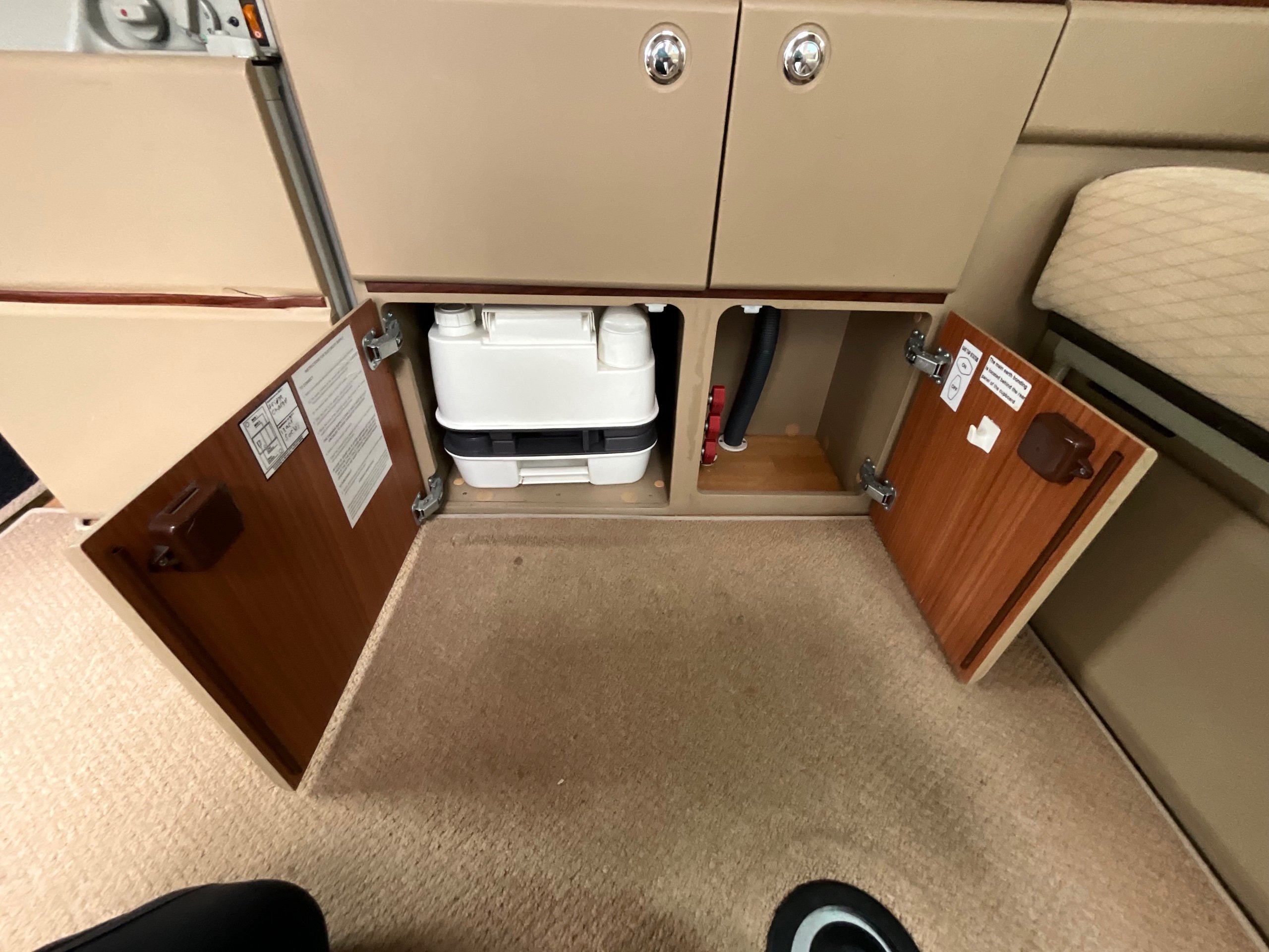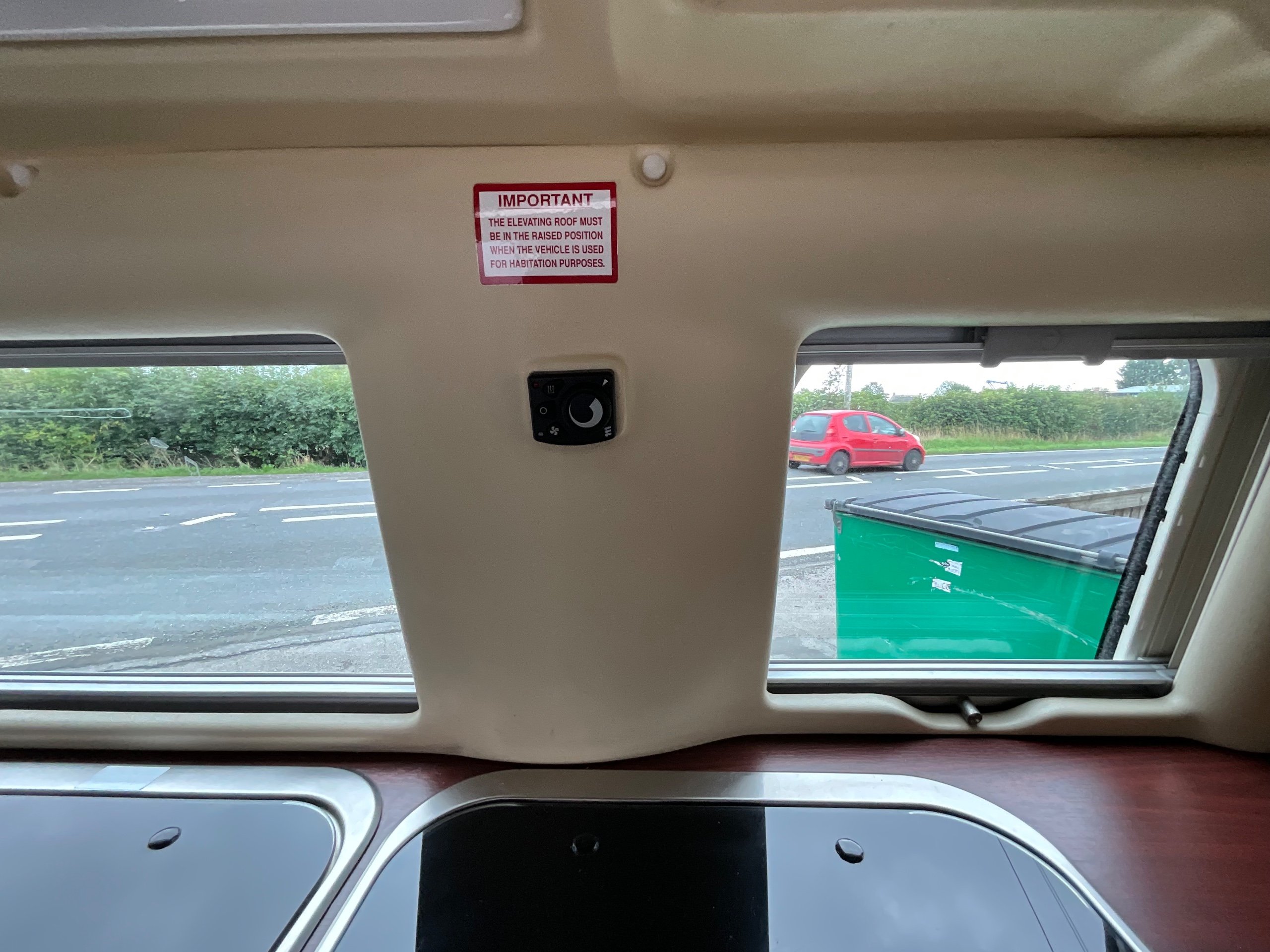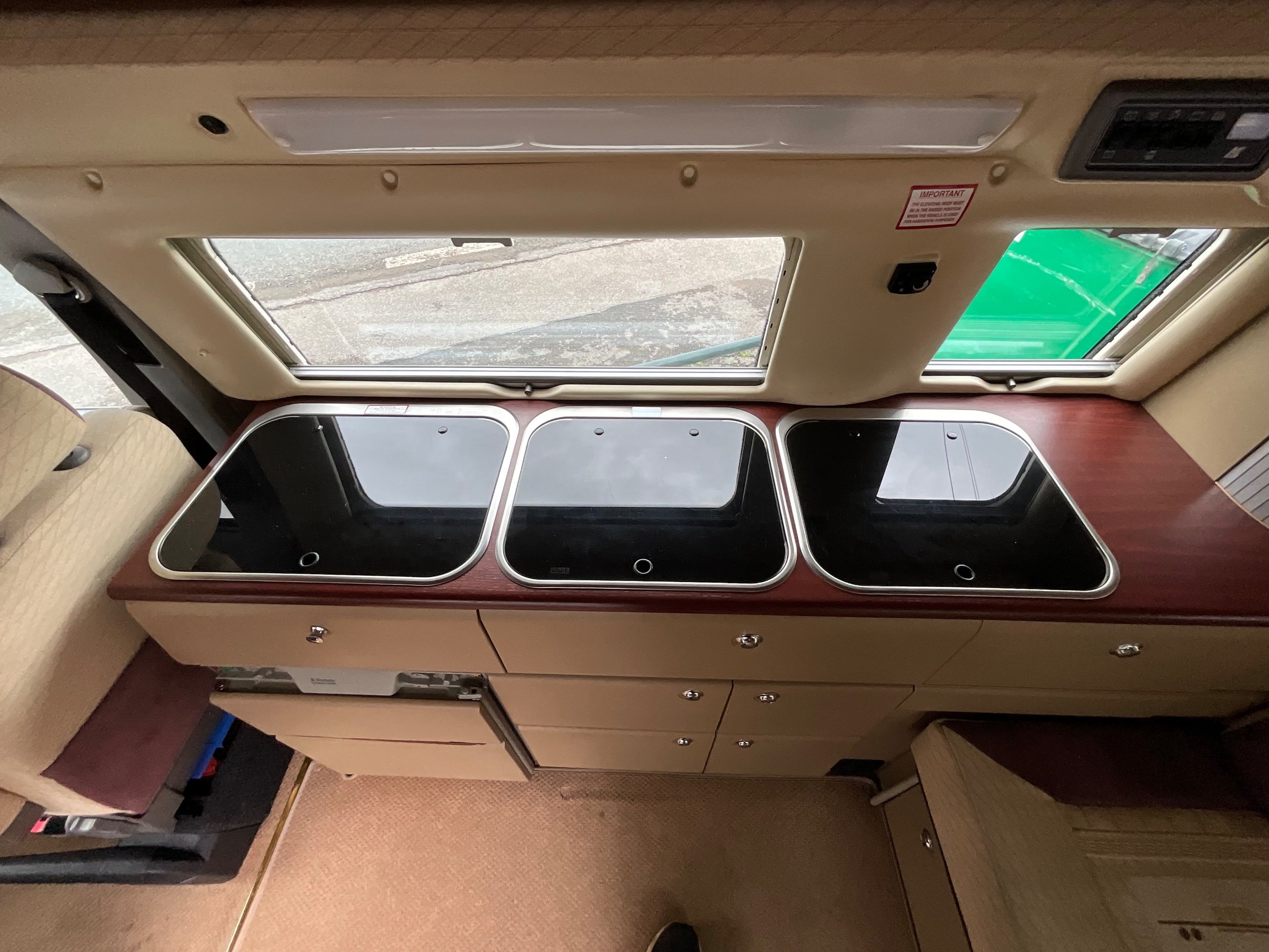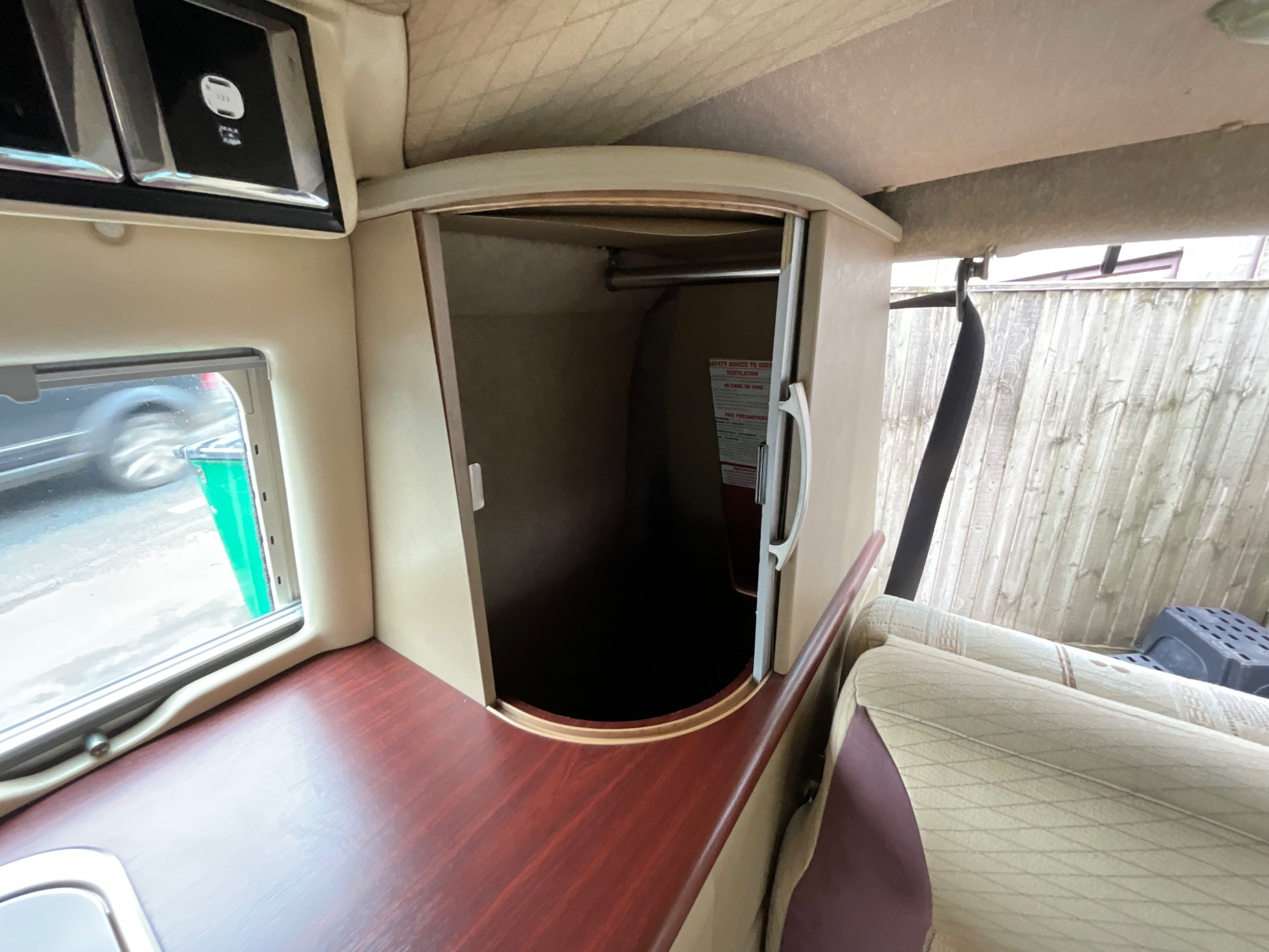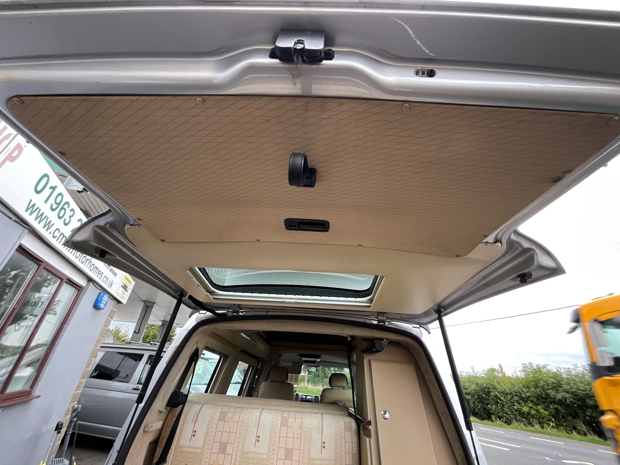 Auto-sleepers Trooper 4 Berth, bench seat to the rear which has two forward facing fully belted seats to use while touring or an as lounge area / bed. There is also another smaller bed in the pop top roof (can raise or lower the roof) for sleeping or storage.