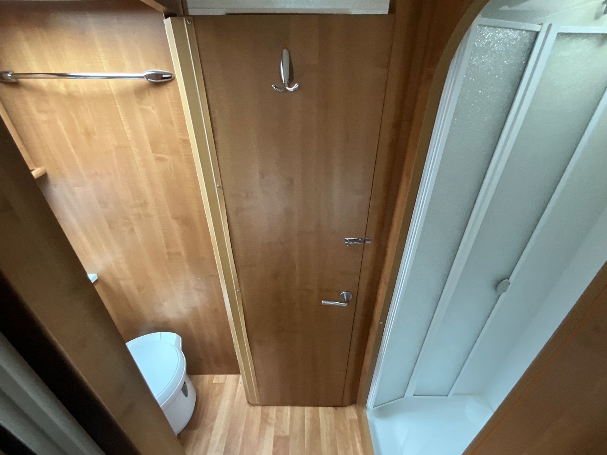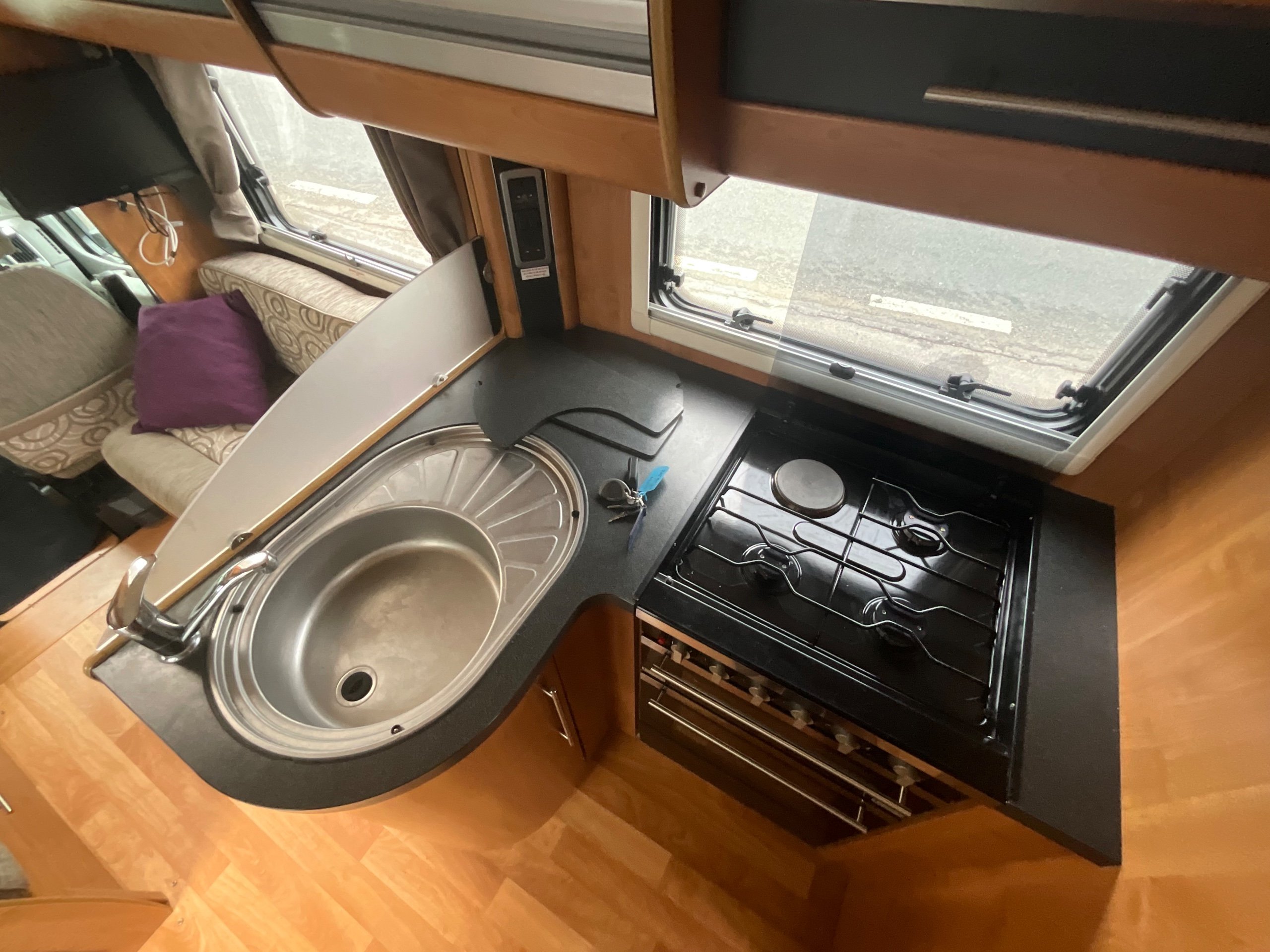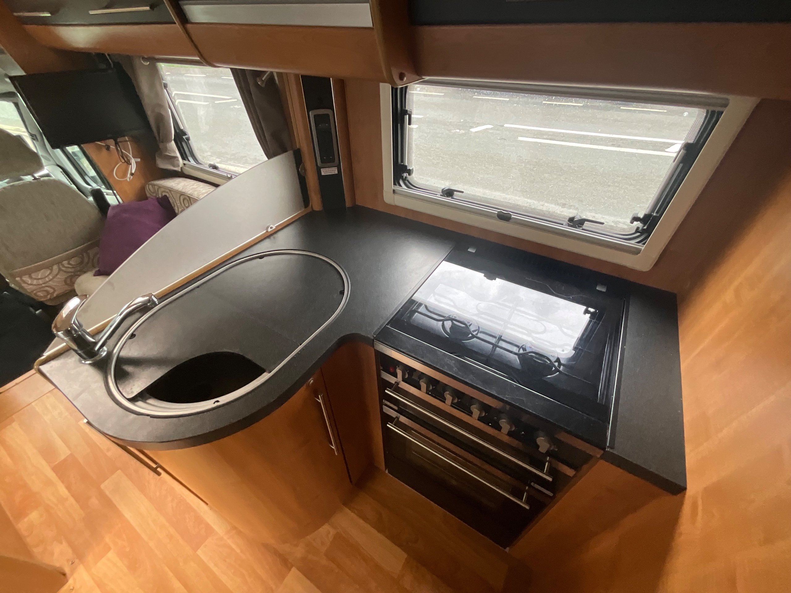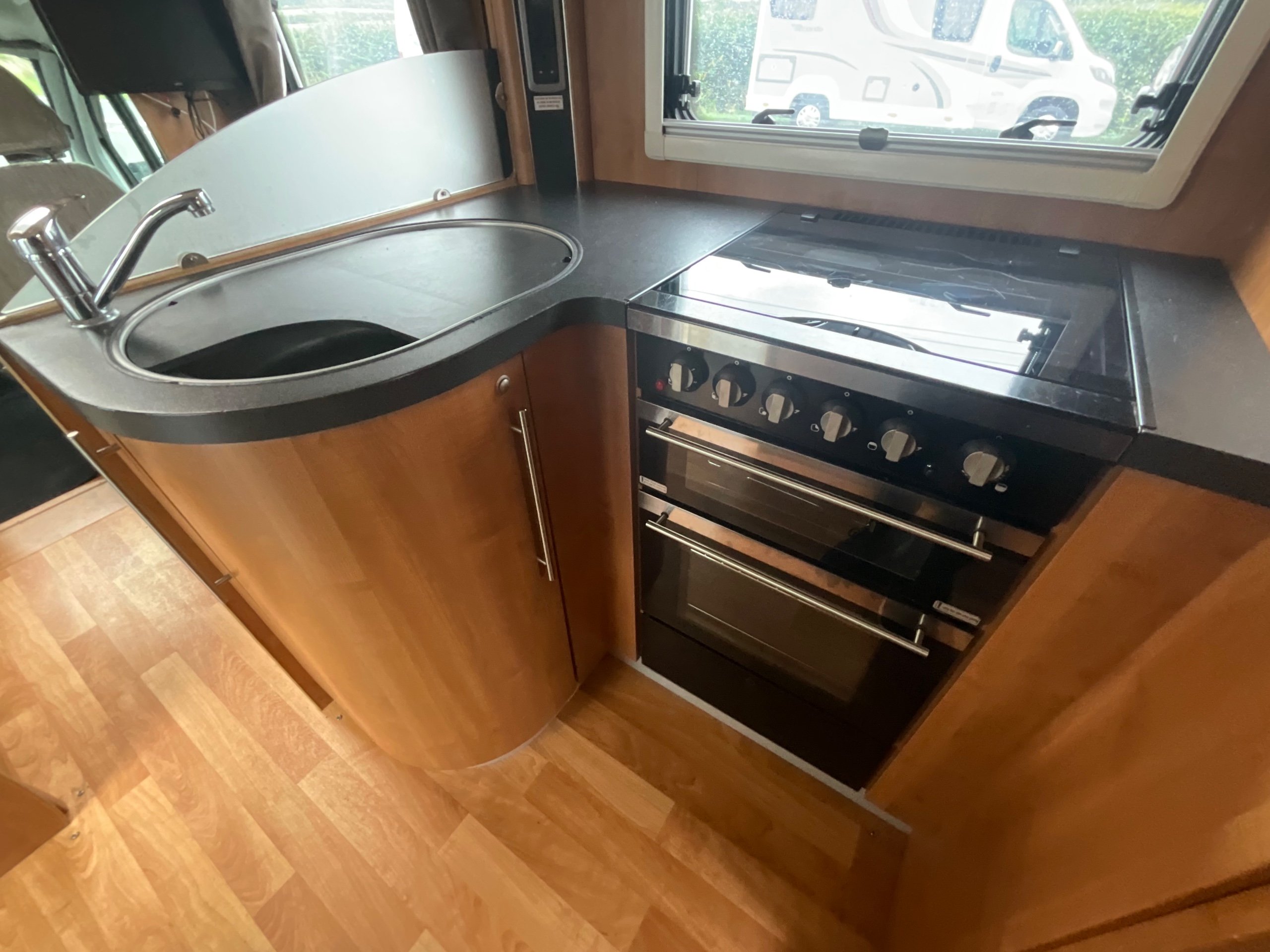 Inside there is all the comforts that you would expect with a Kitchen and bathroom area in the middle of the van with the kitchen supporting 3 Gas Hobs, 1 Electrical Hob, 3-way separate Fridge/freezer, Gas Oven & Grill, extra storage and work surface extensions, sink and drainer. The bathroom is complete with hand basin, separate toilet on one side of the motorhome, with a separate shower cubicle on the other side meaning this bathroom area is spilt into two different sections.