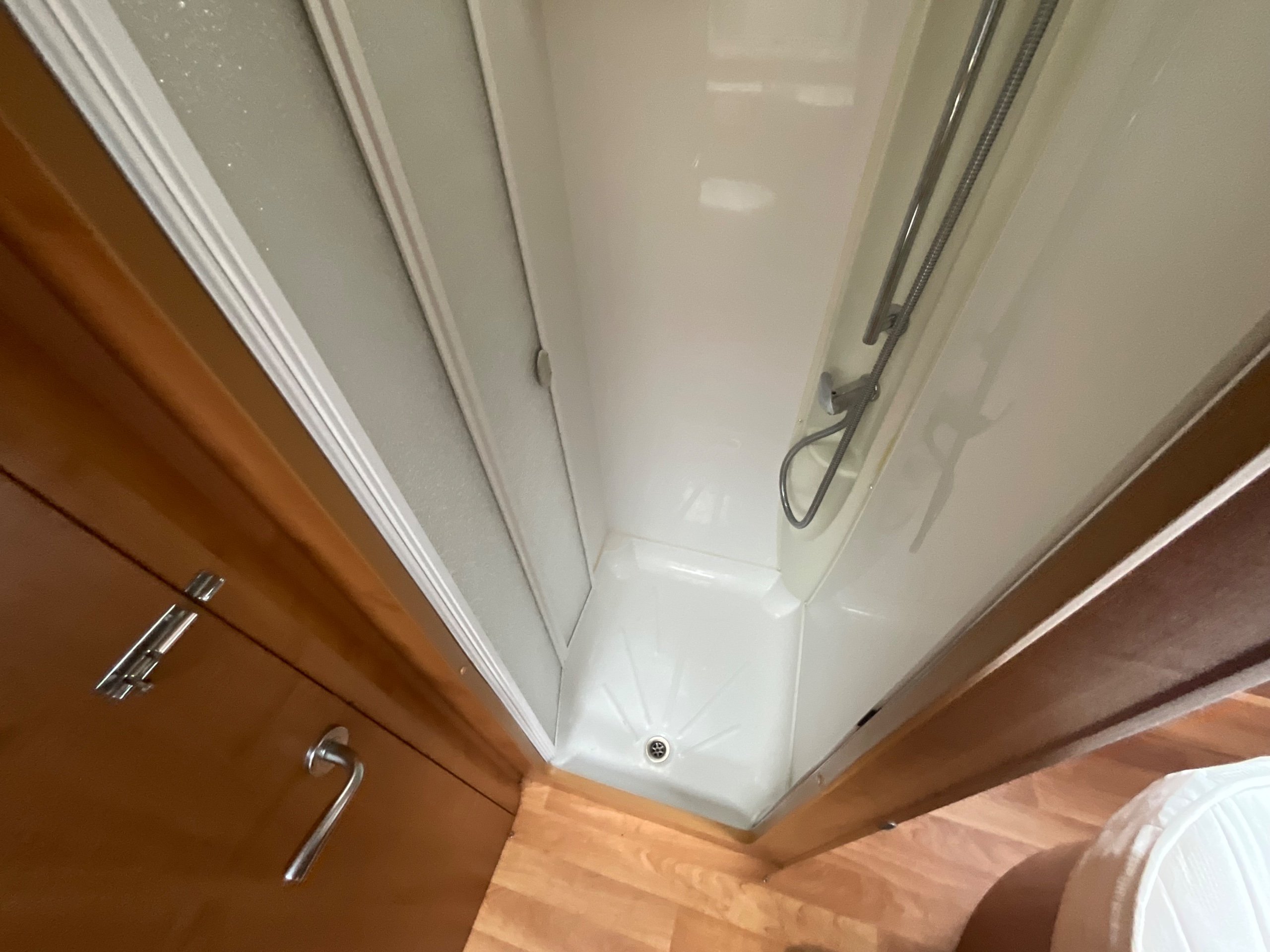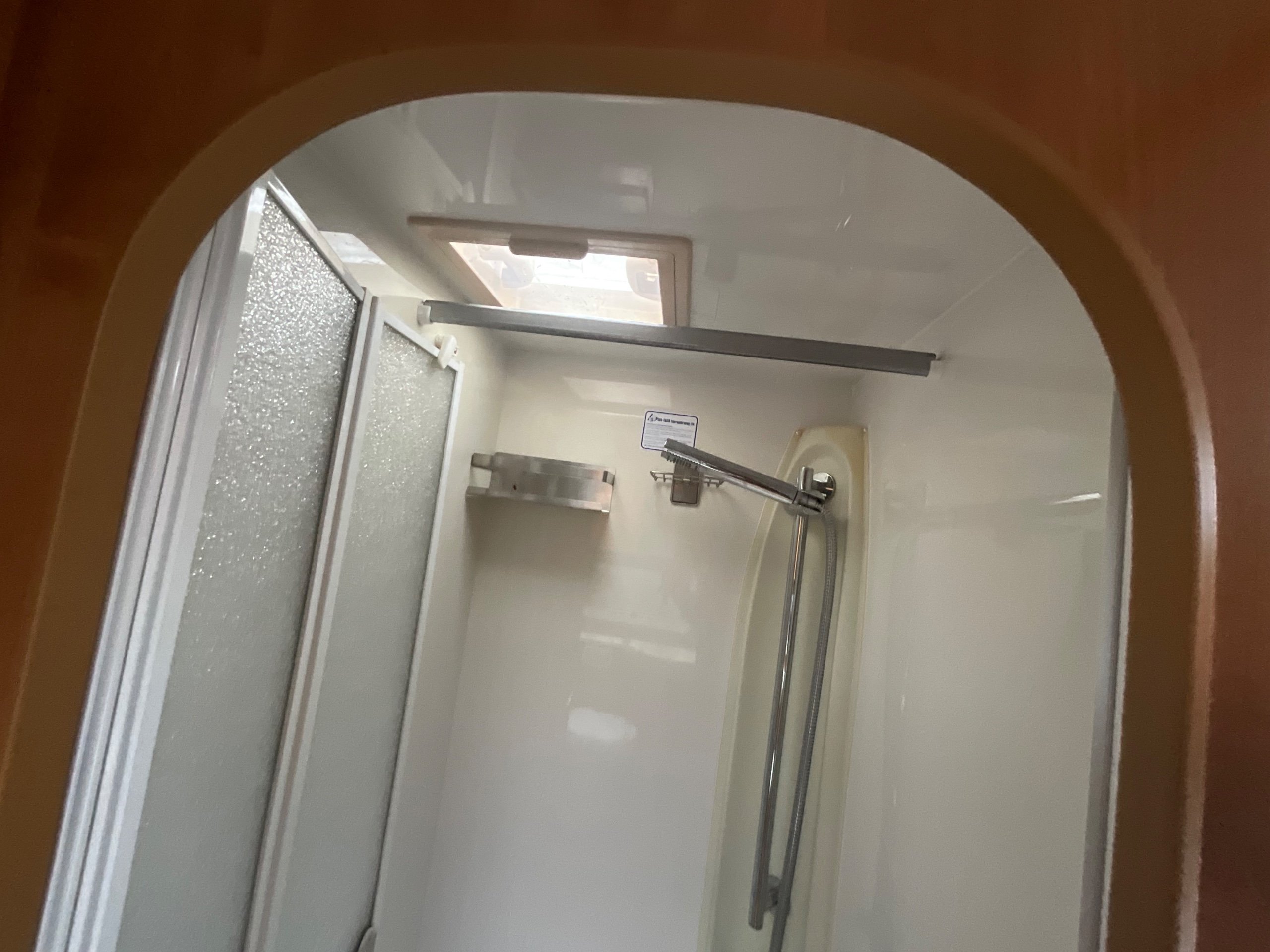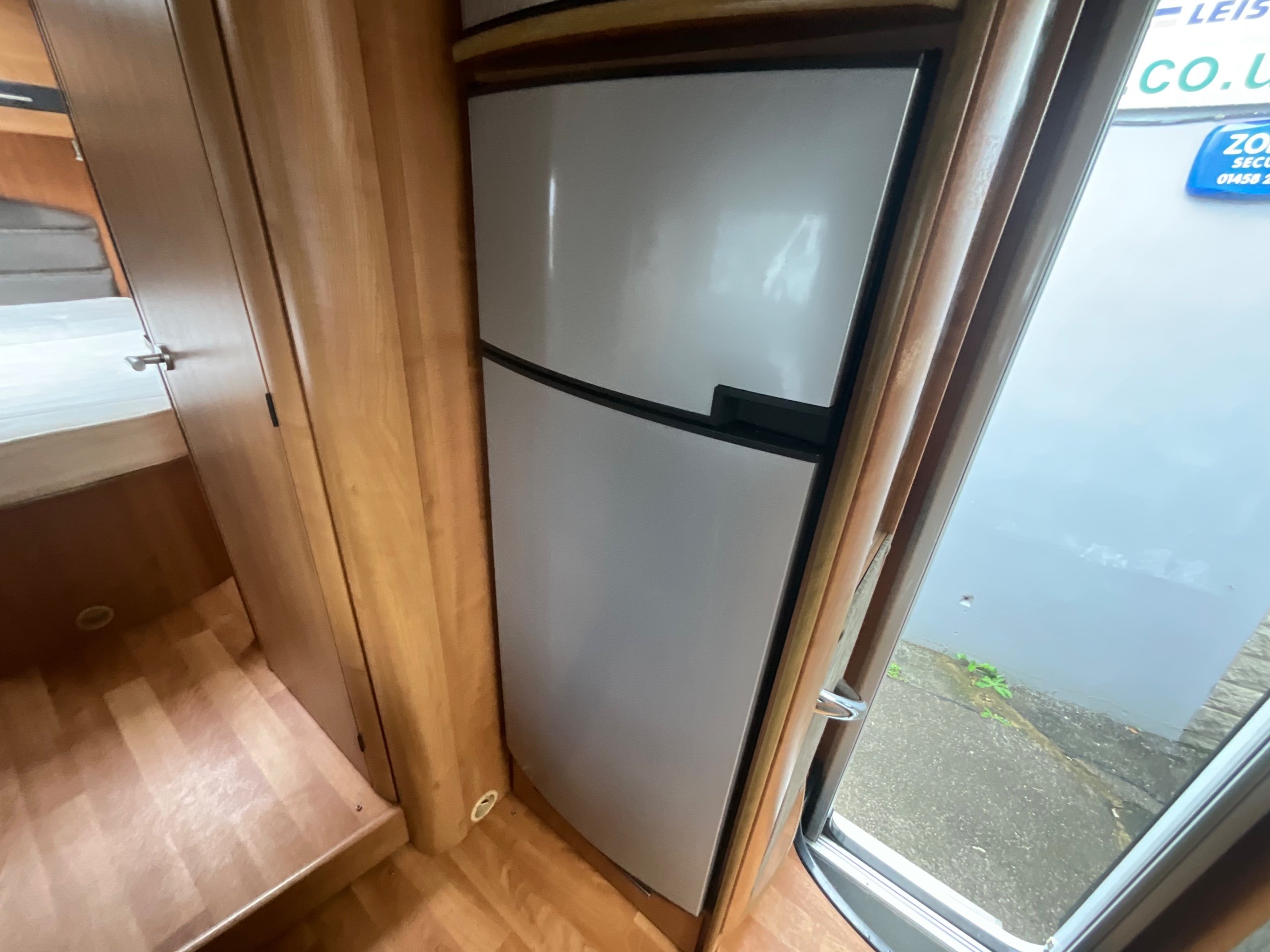 Inside there is all the comforts that you would expect with a Kitchen and bathroom area in the middle of the van with the kitchen supporting 3 Gas Hobs, 1 Electrical Hob, 3-way separate Fridge/freezer, Gas Oven & Grill, extra storage and work surface extensions, sink and drainer. The bathroom is complete with hand basin, separate toilet on one side of the motorhome, with a separate shower cubicle on the other side meaning this bathroom area is spilt into two different sections.