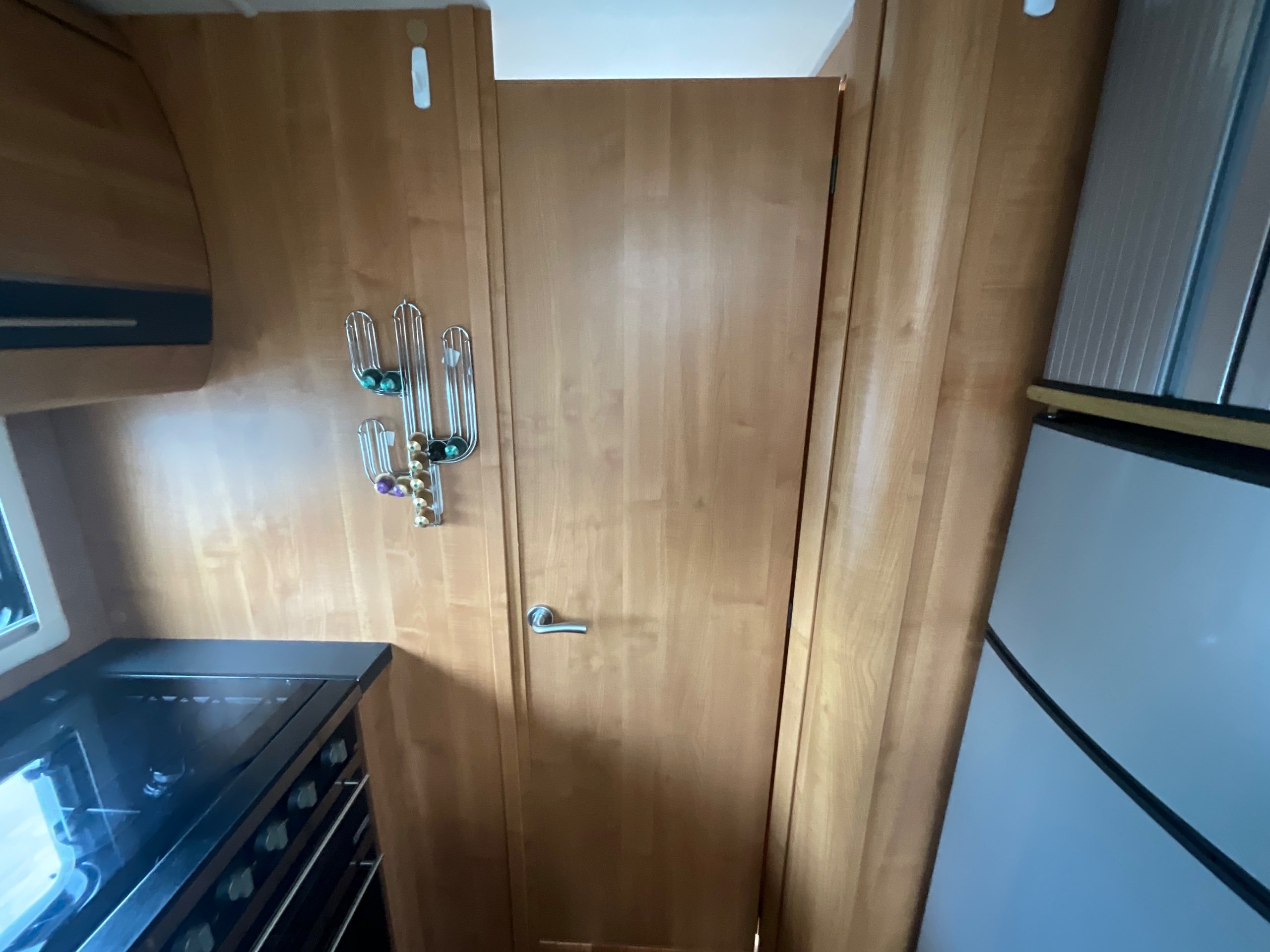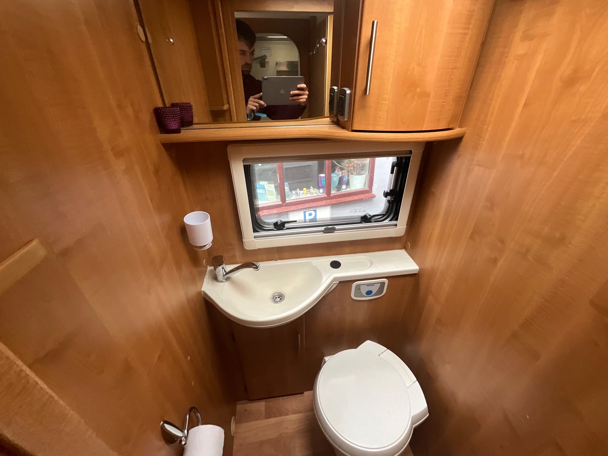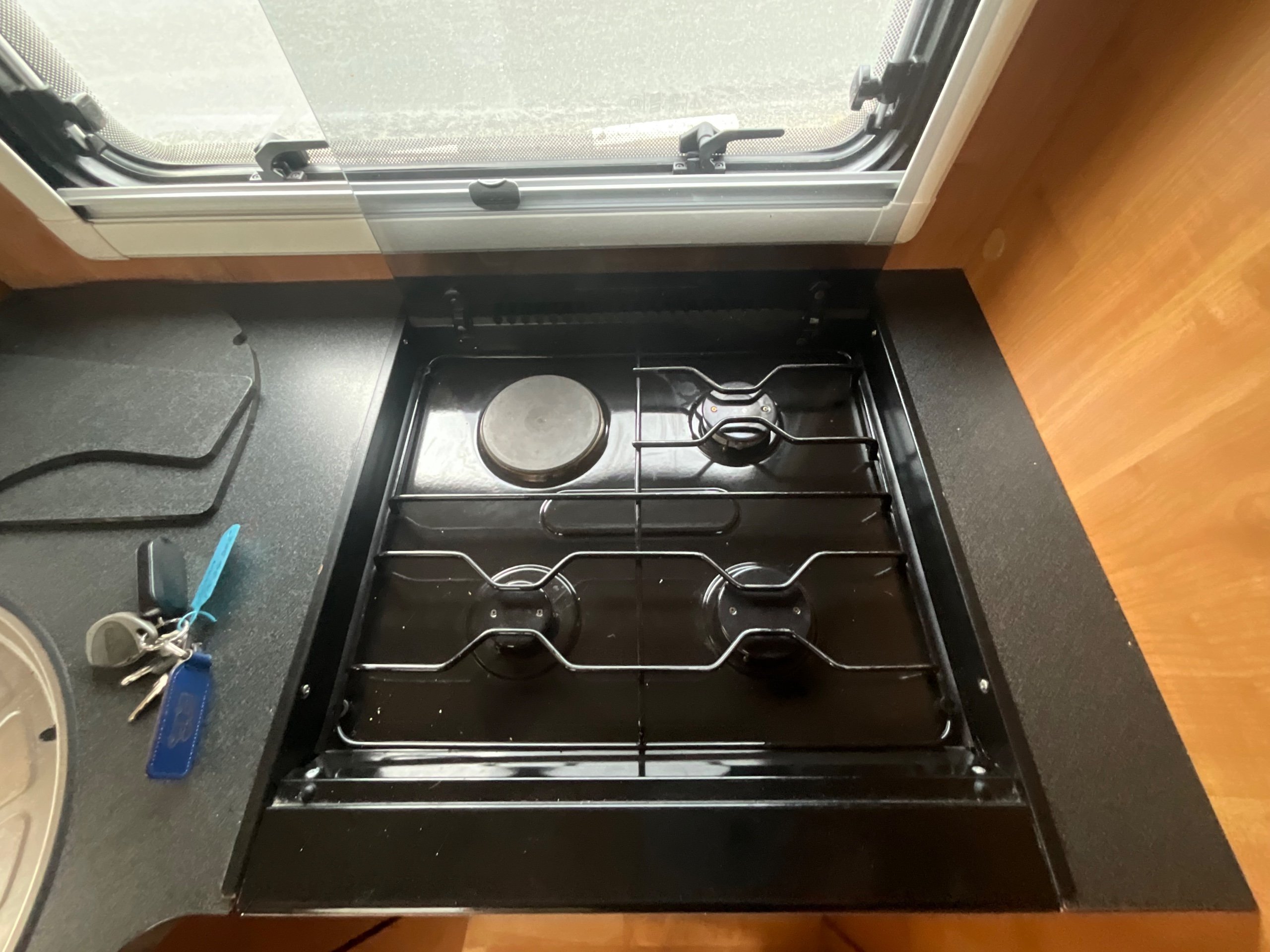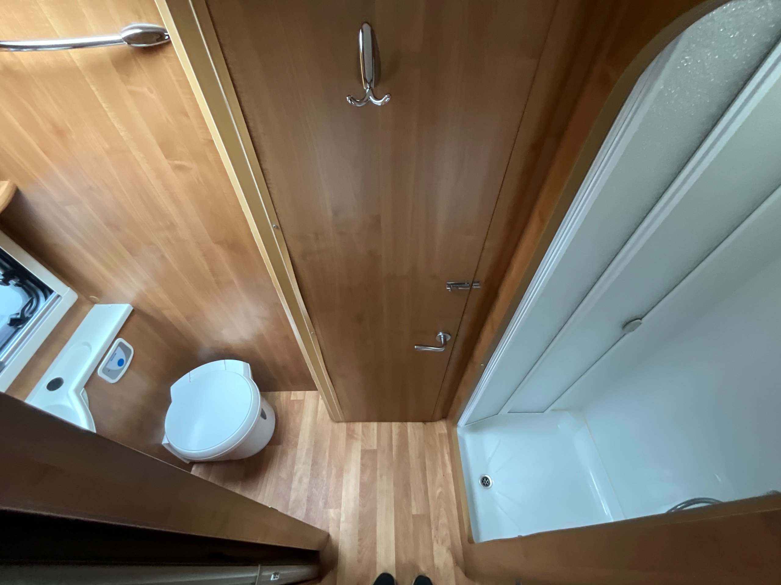 Inside there is all the comforts that you would expect with a Kitchen and bathroom area in the middle of the van with the kitchen supporting 3 Gas Hobs, 1 Electrical Hob, 3-way separate Fridge/freezer, Gas Oven & Grill, extra storage and work surface extensions, sink and drainer. The bathroom is complete with hand basin, separate toilet on one side of the motorhome, with a separate shower cubicle on the other side meaning this bathroom area is spilt into two different sections.