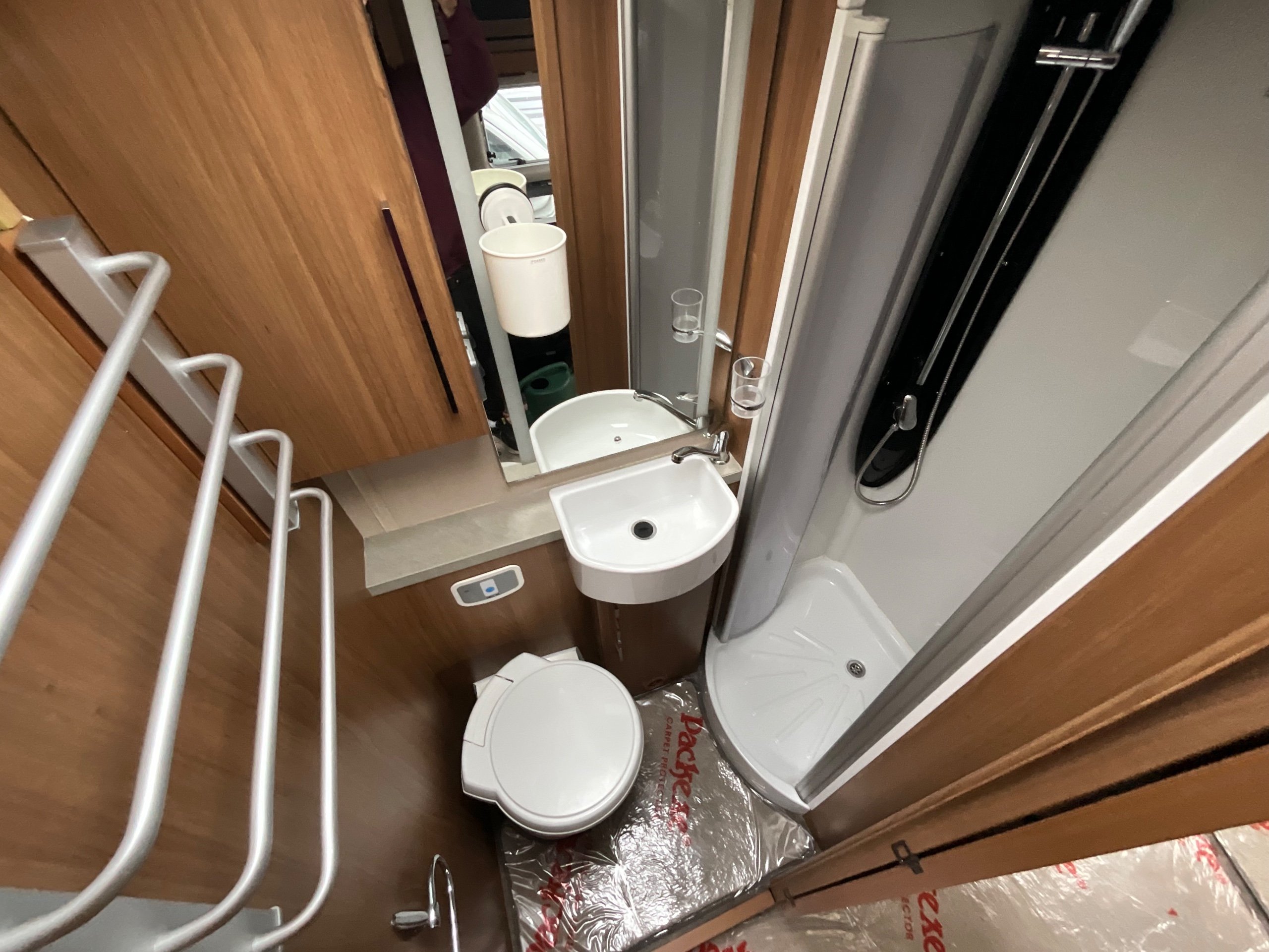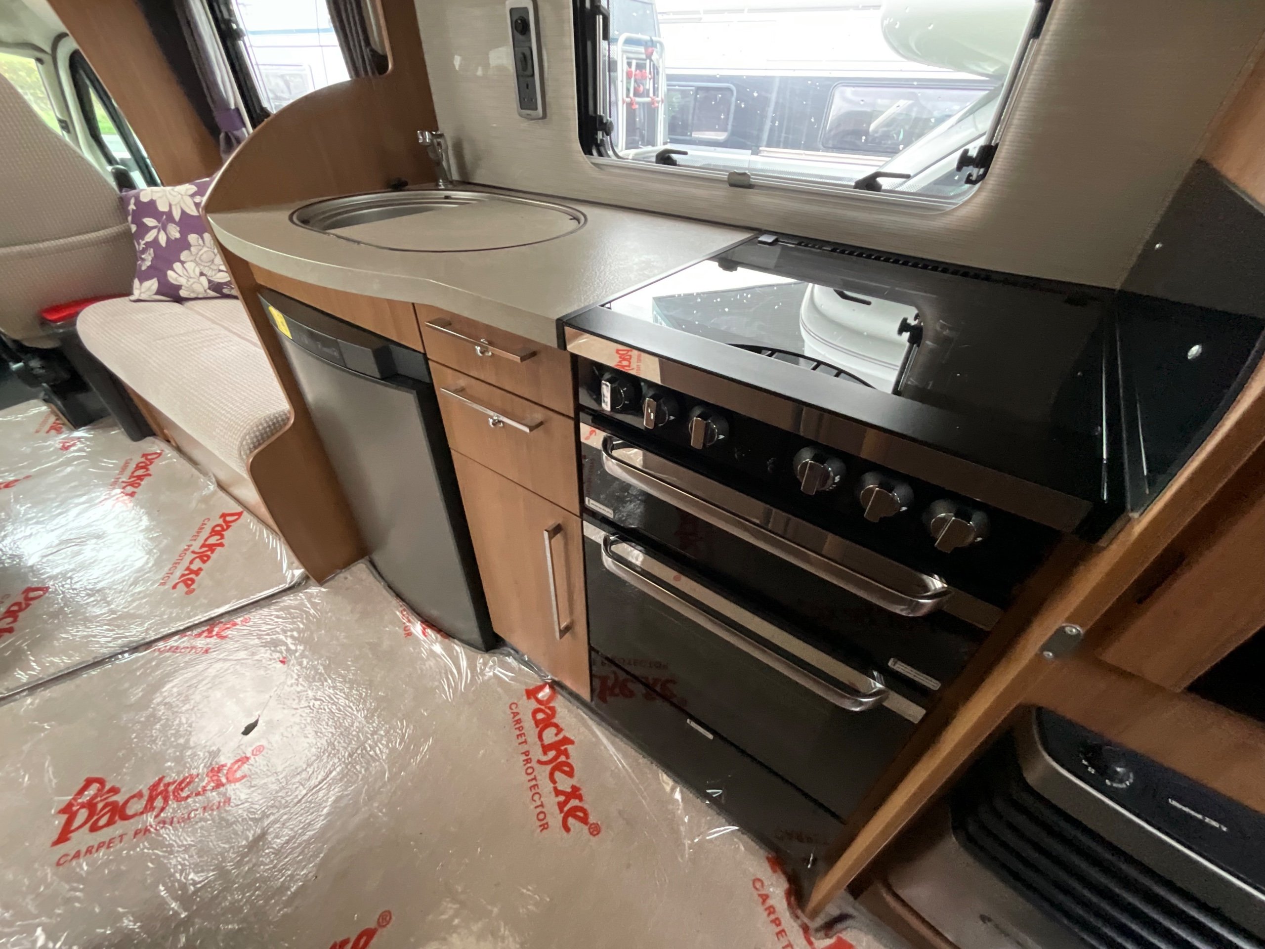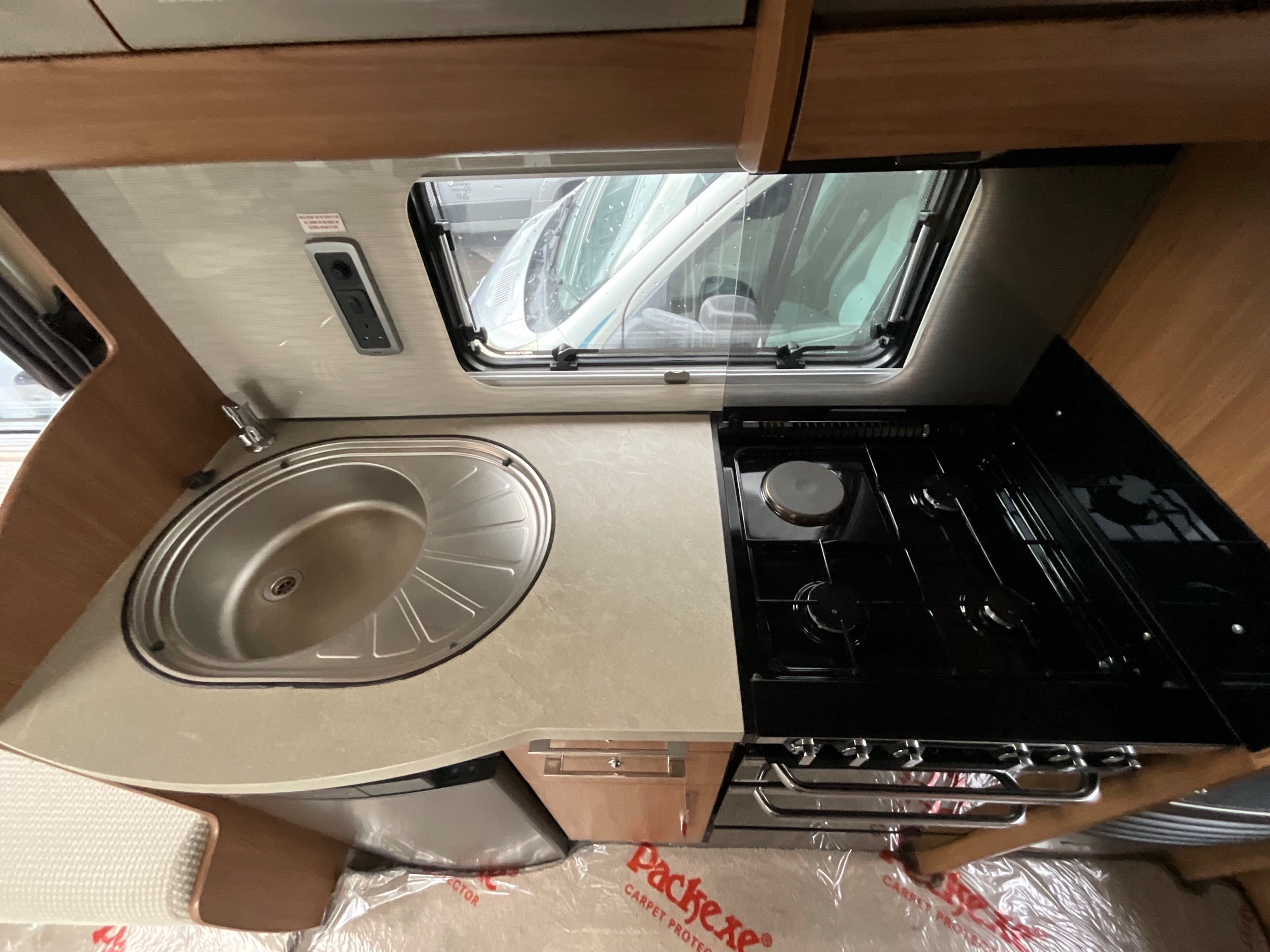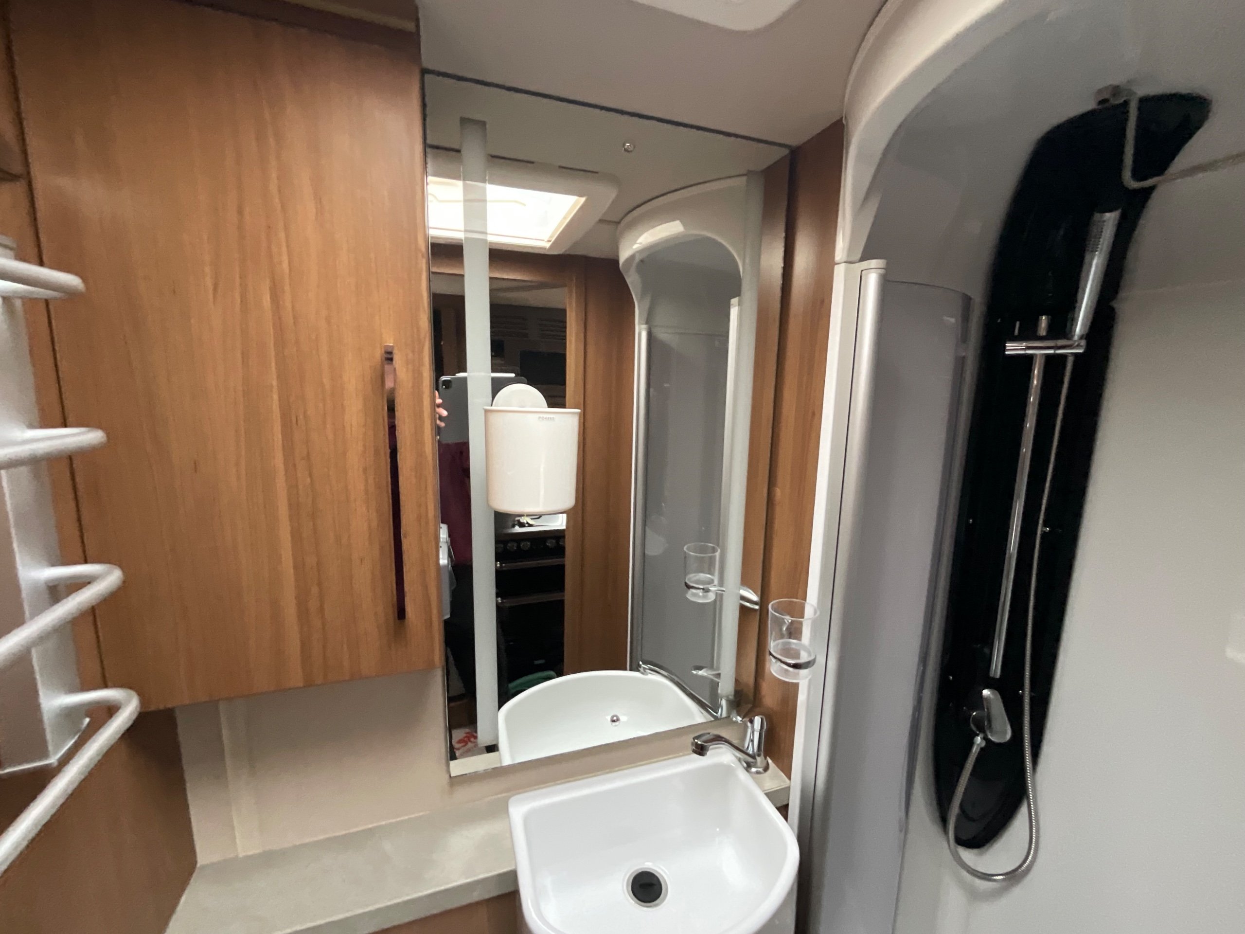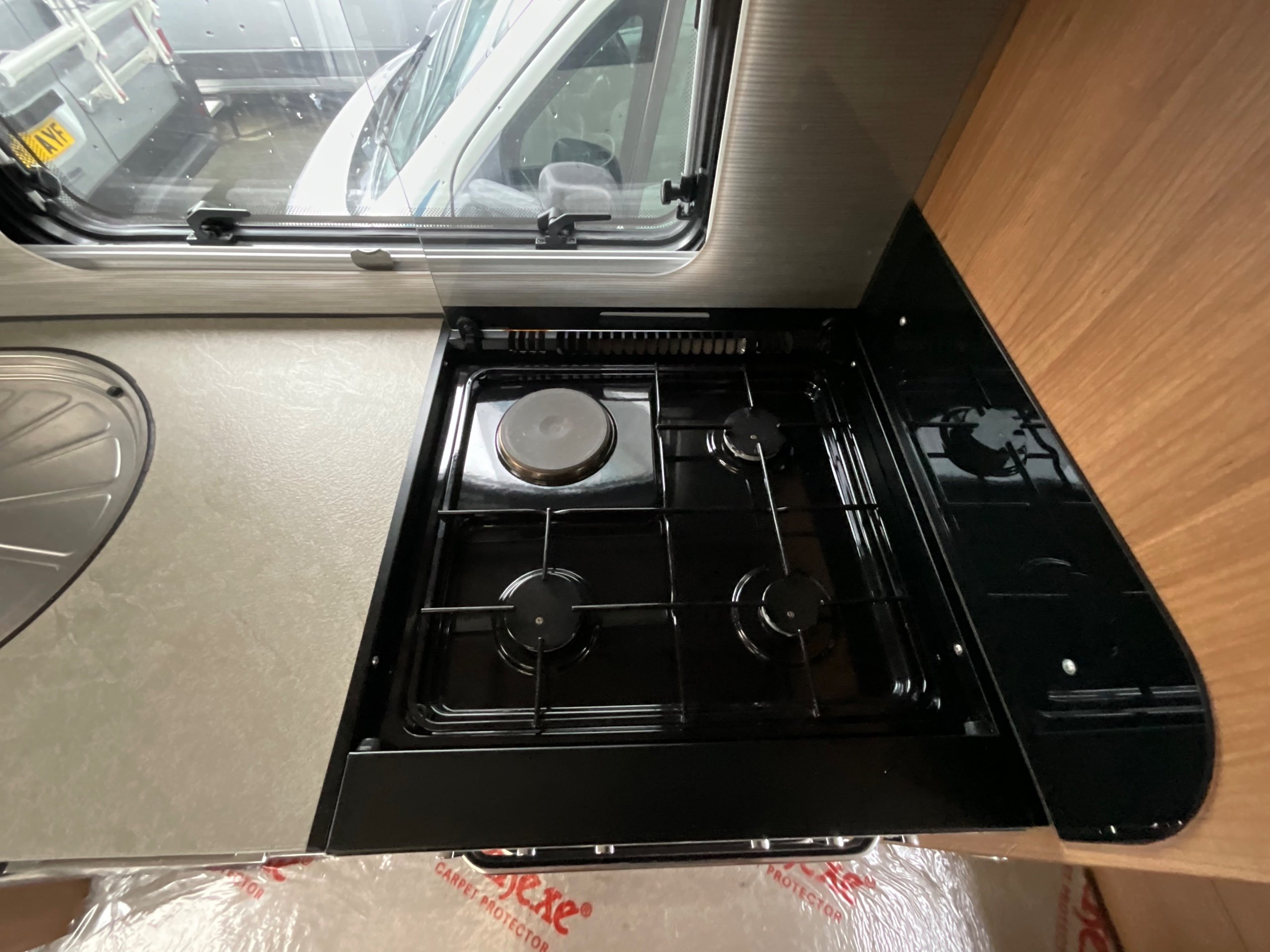 Inside there is all the comforts that you would expect with a Kitchen and bathroom area in the middle of the van with the kitchen supporting 3 Gas Hobs, 1 Electrical Hob, 3-way separate Fridge/freezer, Gas Oven & Grill, extra storage and work surface extensions, sink and drainer. The bathroom is very spacious with a separate shower, basin and toilet.