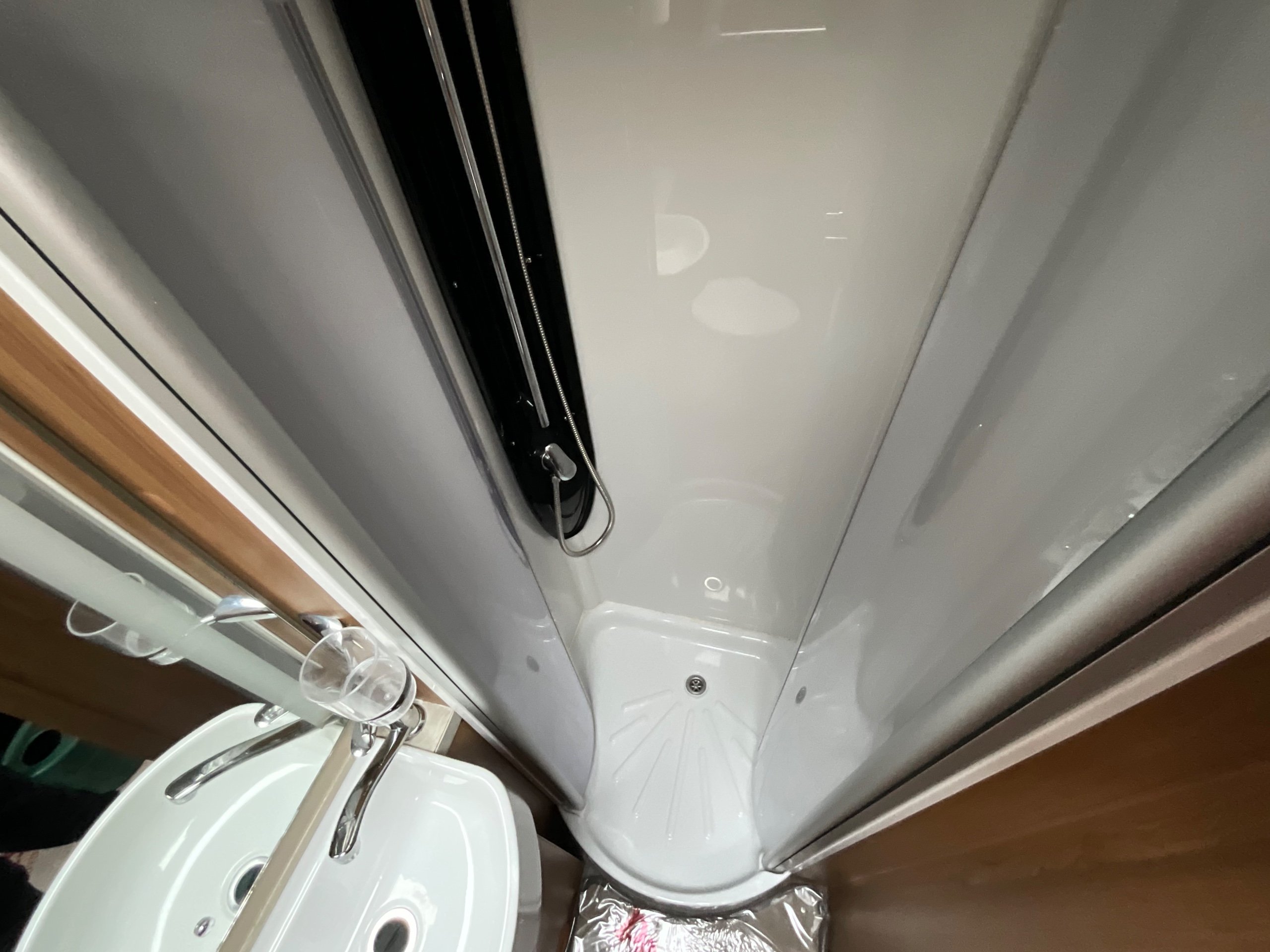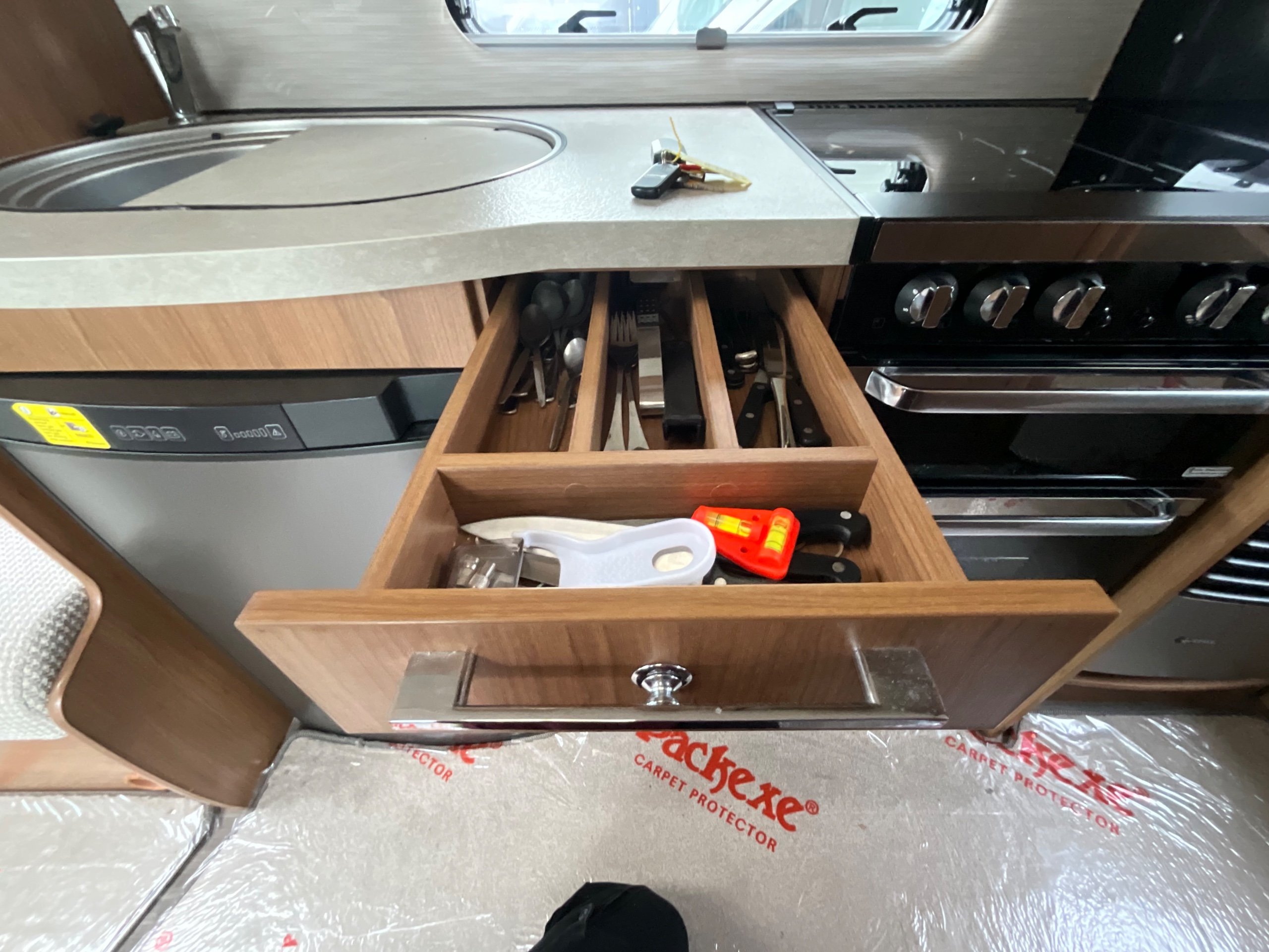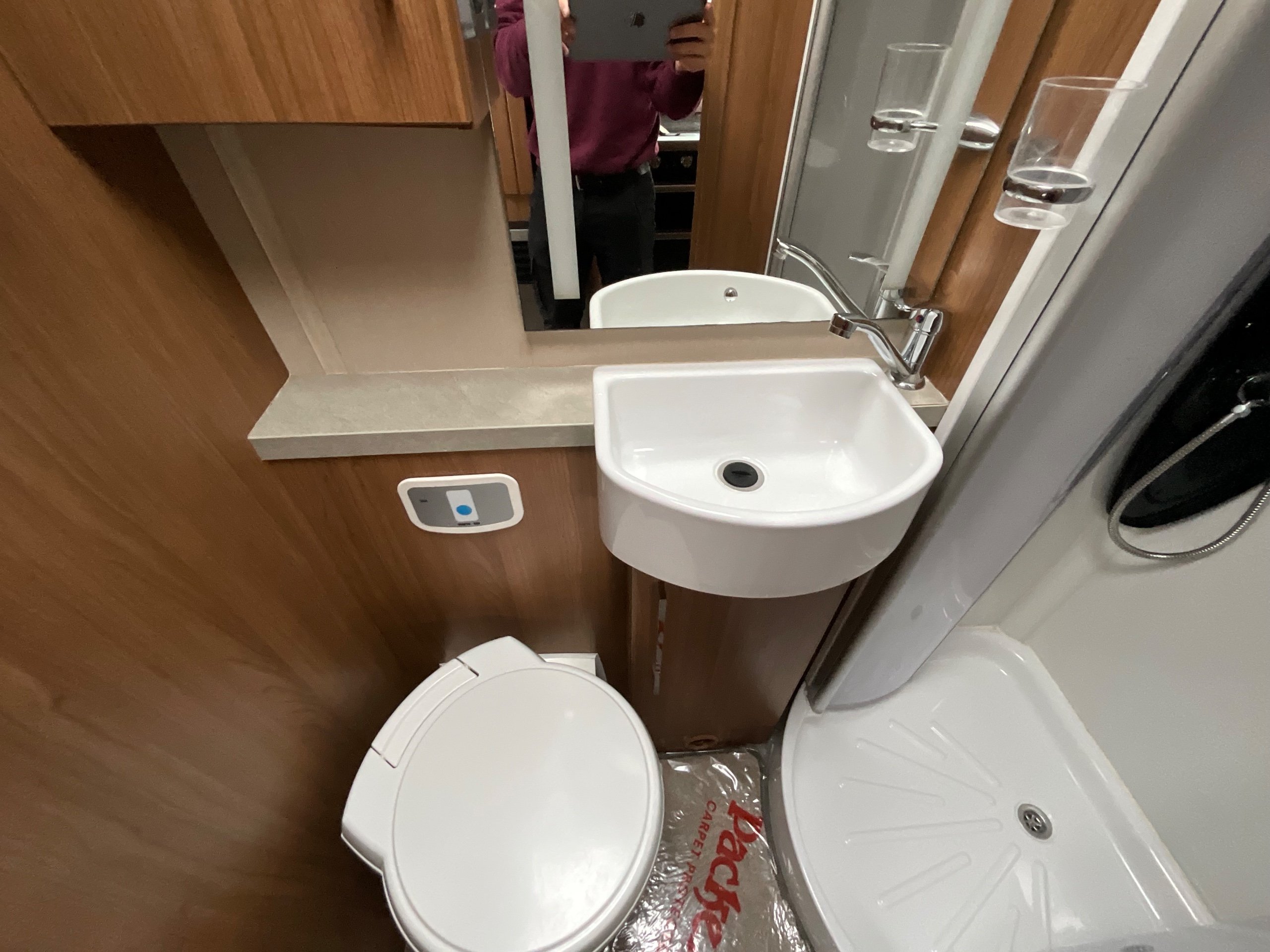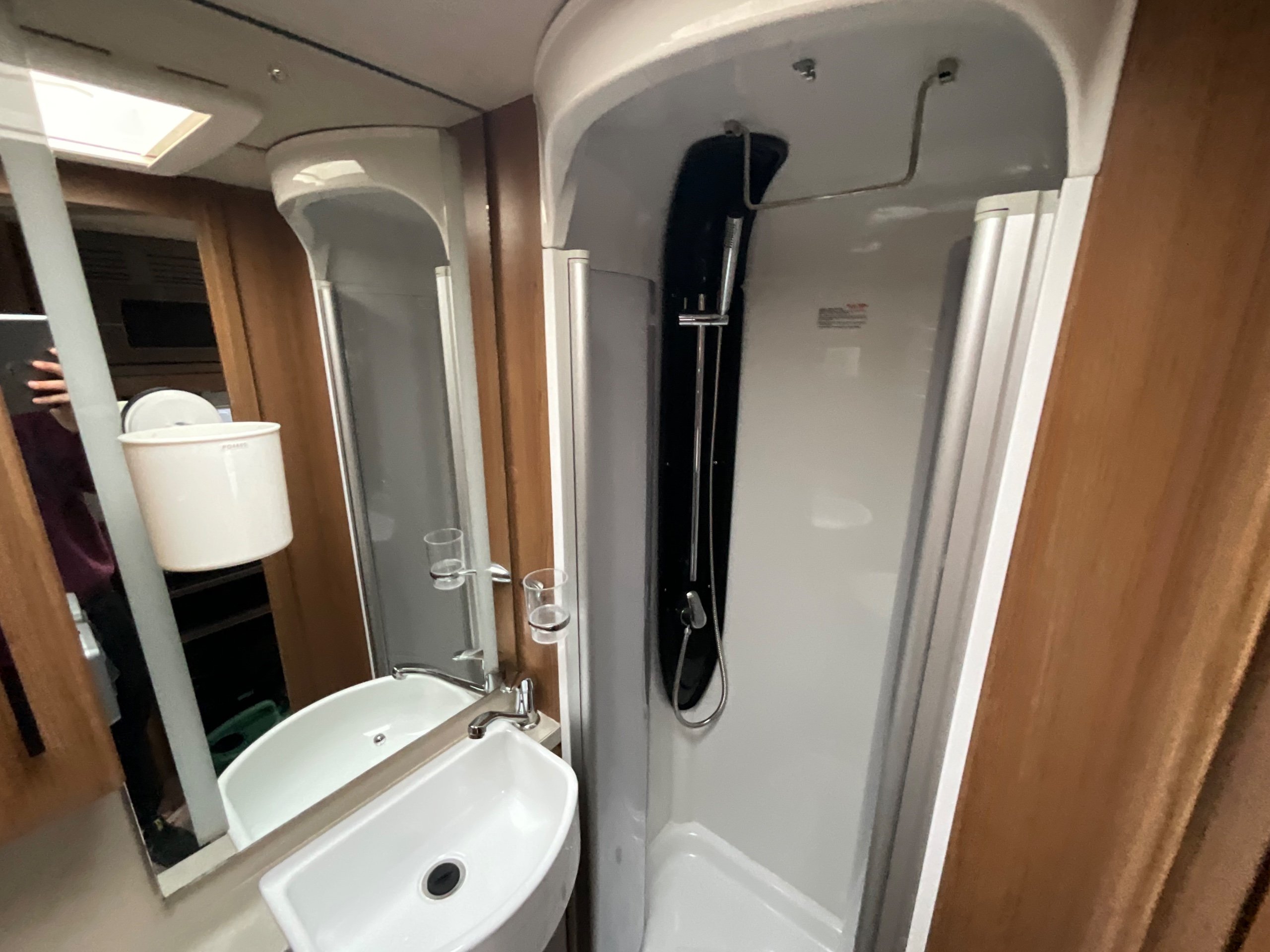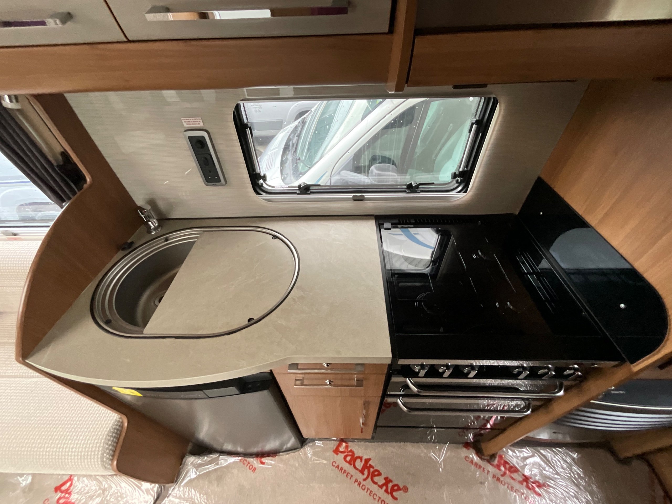 Inside there is all the comforts that you would expect with a Kitchen and bathroom area in the middle of the van with the kitchen supporting 3 Gas Hobs, 1 Electrical Hob, 3-way separate Fridge/freezer, Gas Oven & Grill, extra storage and work surface extensions, sink and drainer. The bathroom is very spacious with a separate shower, basin and toilet.