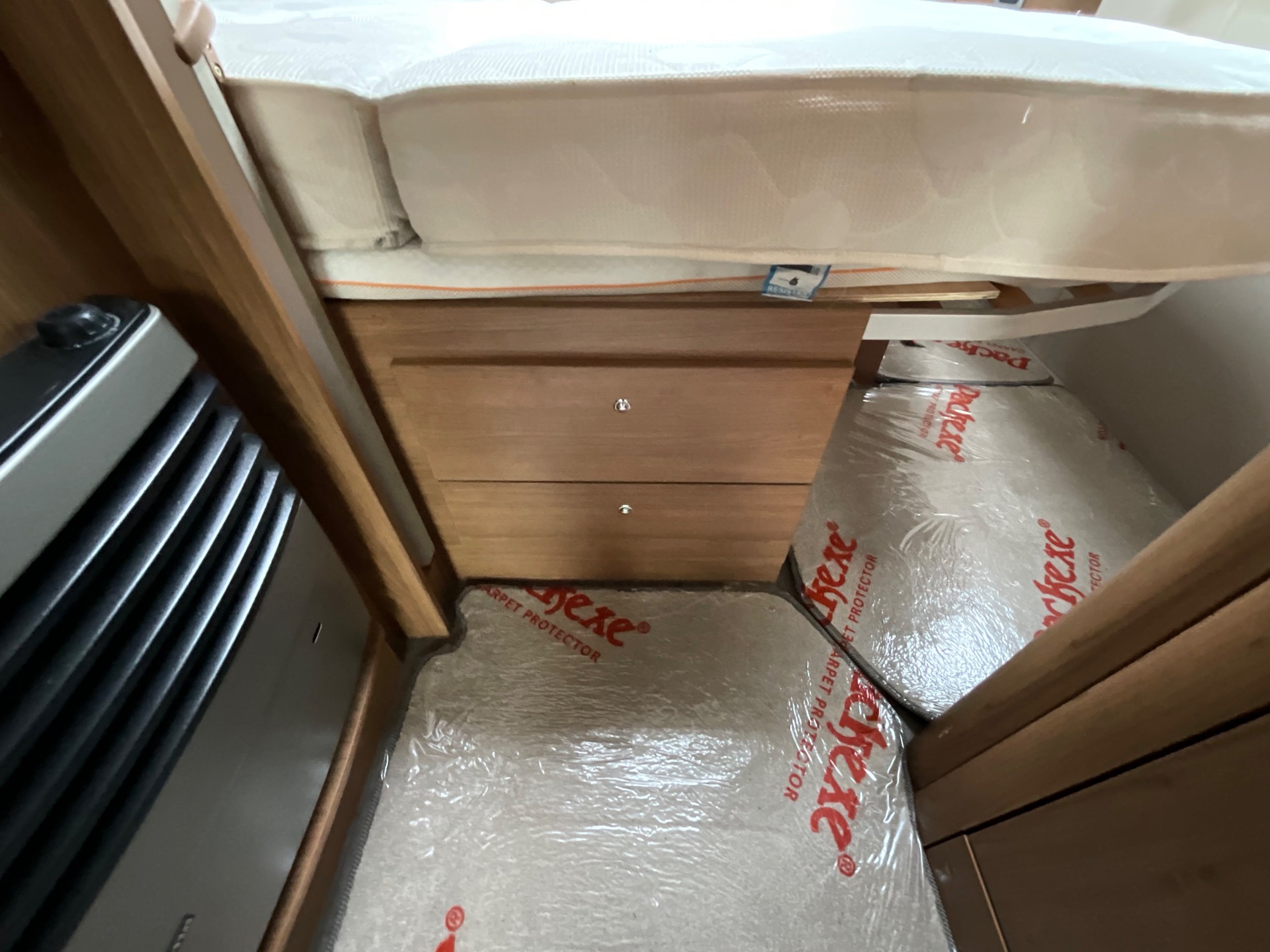 This Auto-trail Tracker RB has the ability to sleep 4 and travel with 2 peoplefull belted in. The Auto-trail Tracker RB is a 4 Berth motorhome, with Fixed Rear Island Bed (which has been rotated to face sideways) offering plenty of storage underneath, which can be accessed from outside with external door on the drivers side of the motorhome. Underneath bed from the inside is also plenty of storage. The central area offers flexible options of a twin bench seating area with a free standing table. This area is also where the other double bed is made up. It then can be transformed into a dinette area with the use of the two swivel seats in the front cab to further enhance the living space. Above the cab is a little storage.