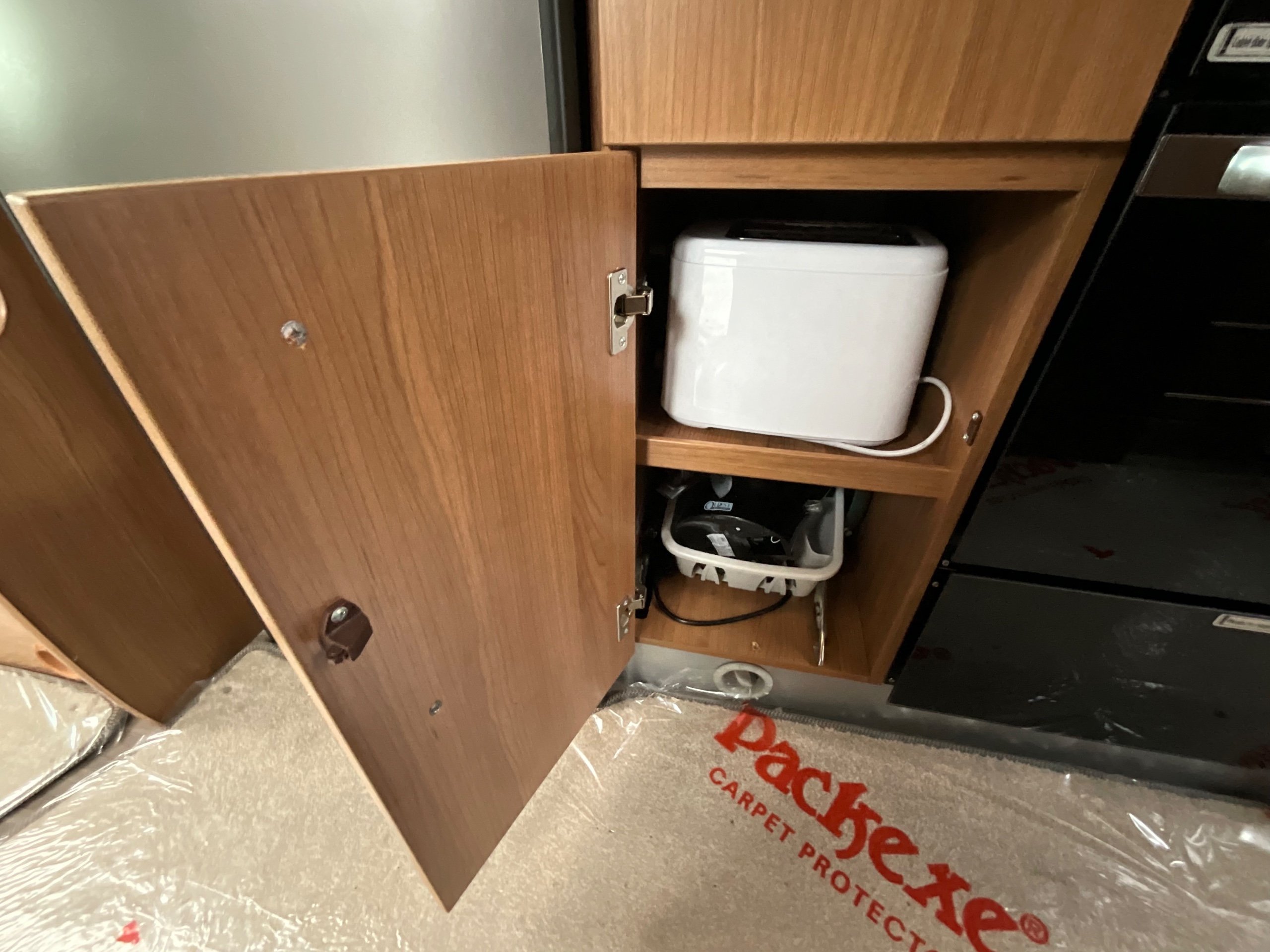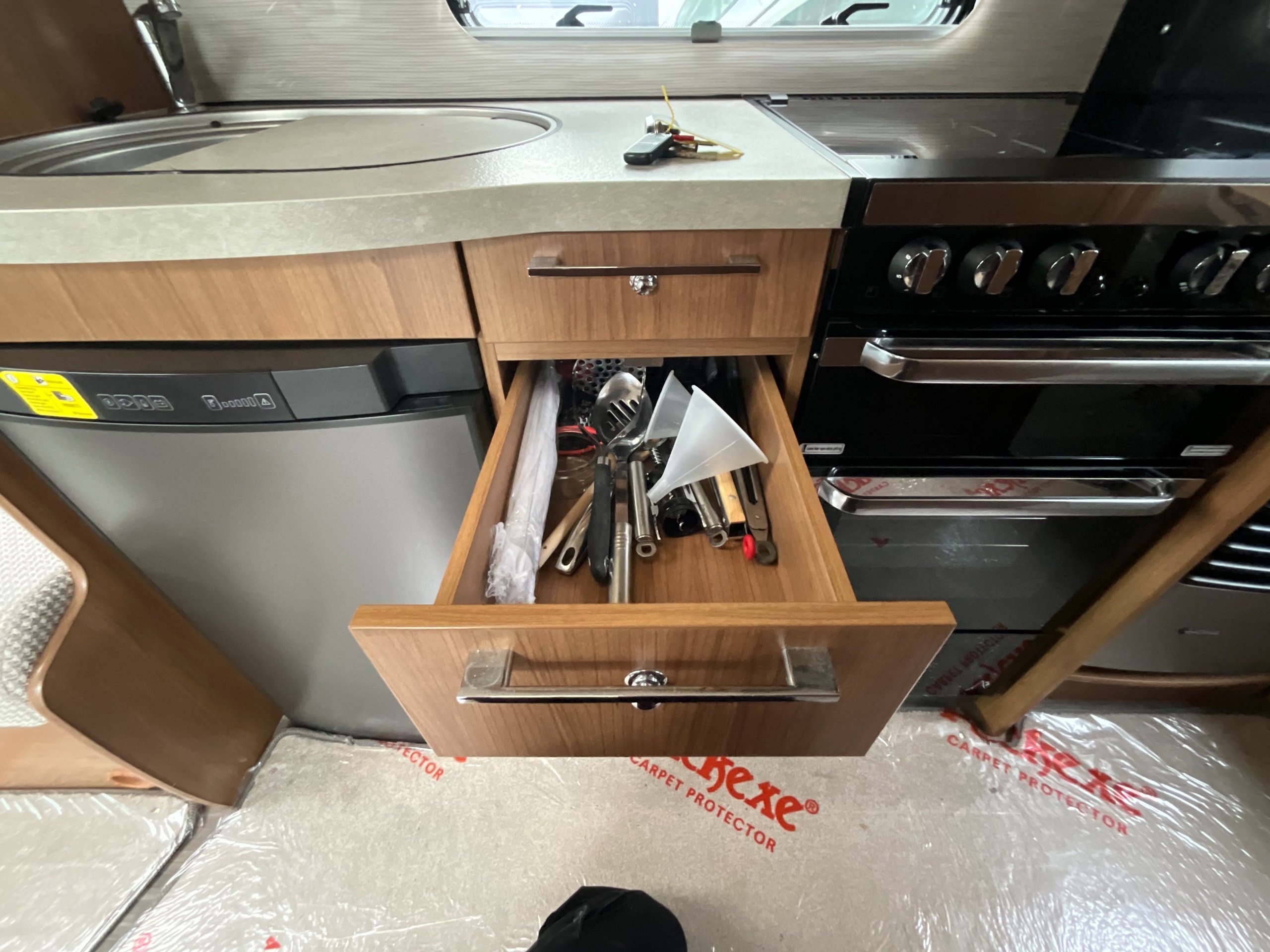 Onboard there is Fresh and wastewater tanks, Gas / Electrical operated heating and hot water via the well renowned Truma heating/ hot water system. The electrical hot water / heating element works when plugged in on 240V power. On the outside there is a storage area, which has plenty of storage for anything.