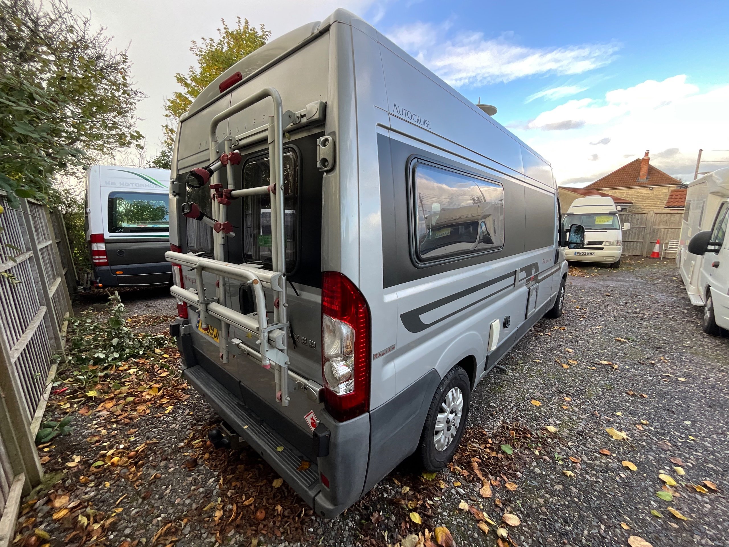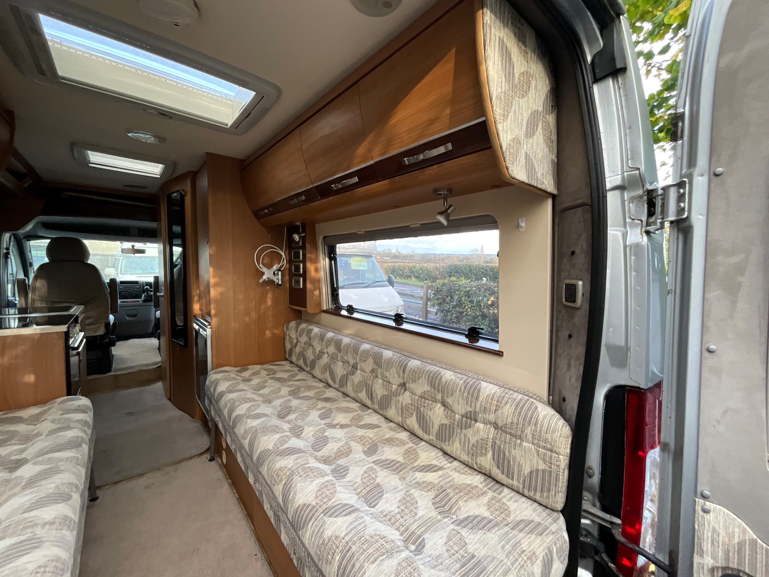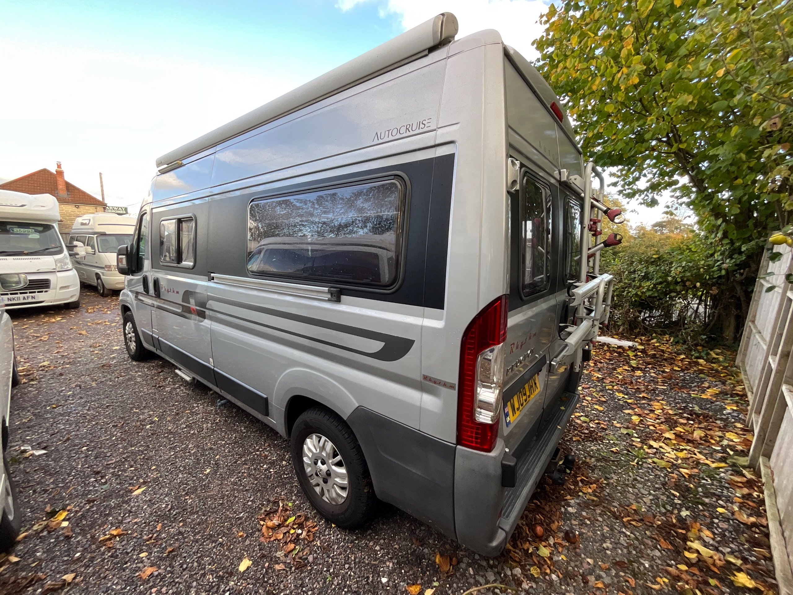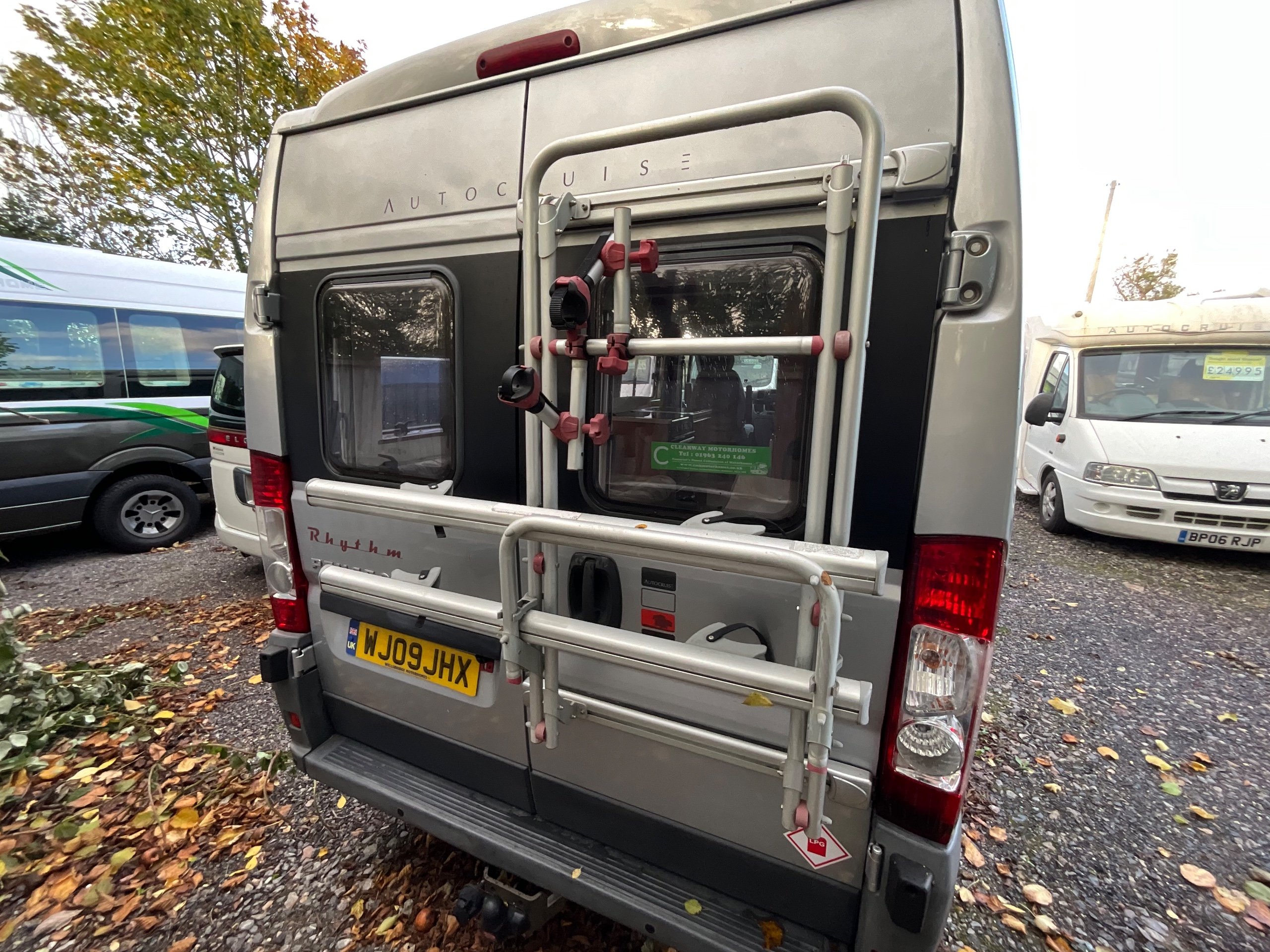 The additional extras fitted to the Autocruise Rhythm are an Awning, bike rack, 6 speed gear box, central locking, tow bar, under-slung refillable gas system, sigma immobiliser, TV aerial, cruise control, solar panel, cab air-conditioning, build in cab blind and radio controls on the steering wheel.