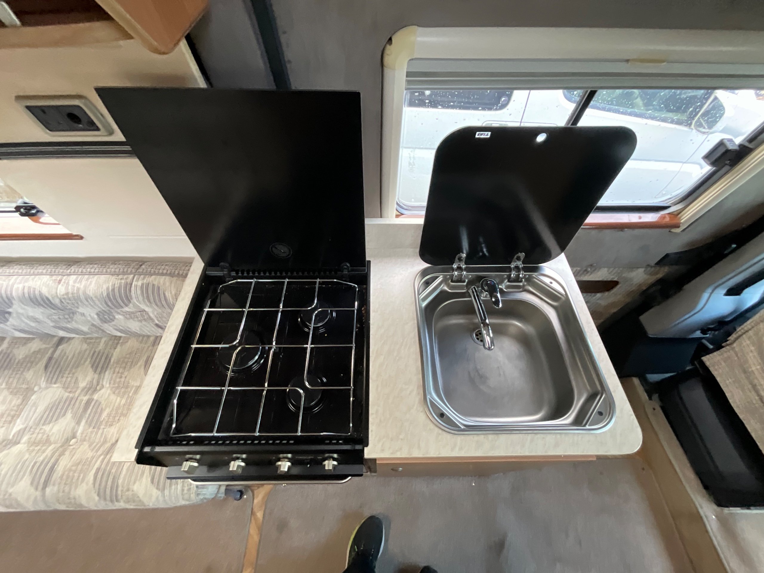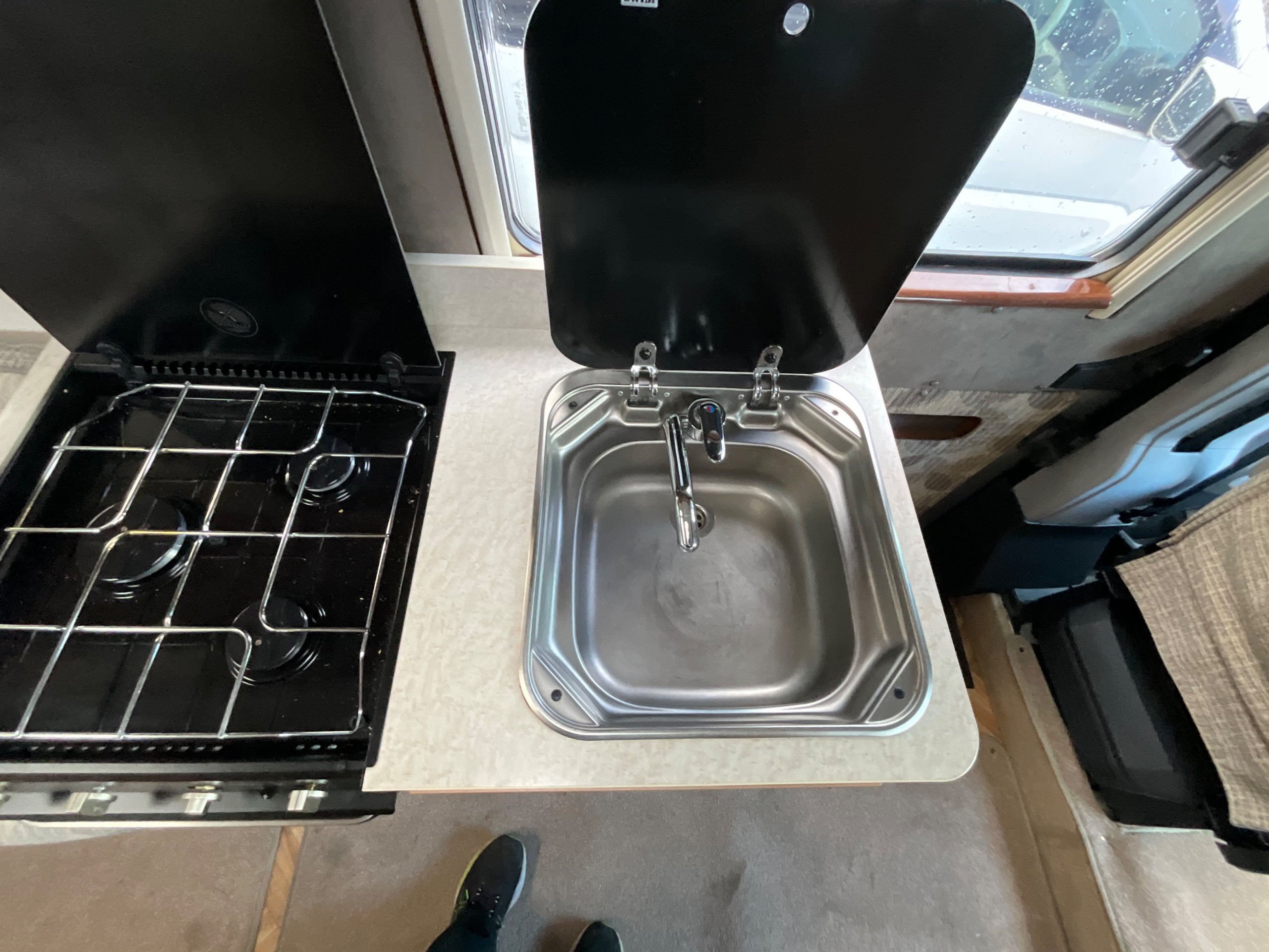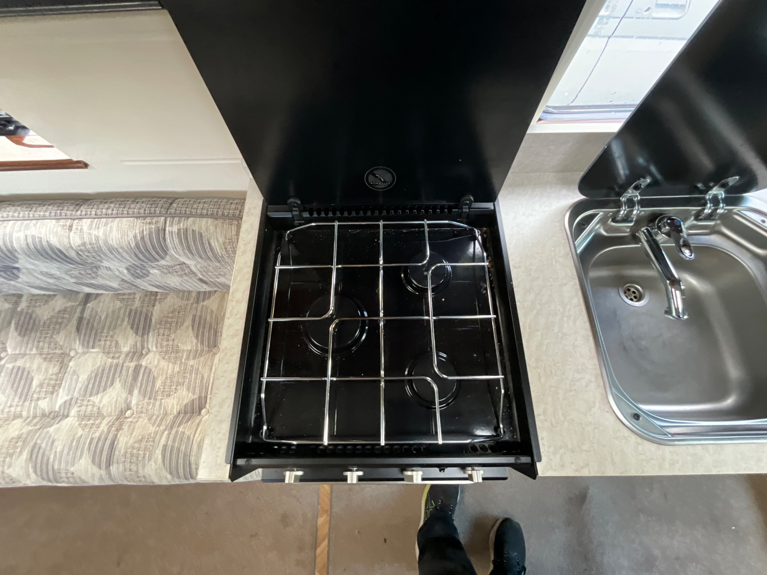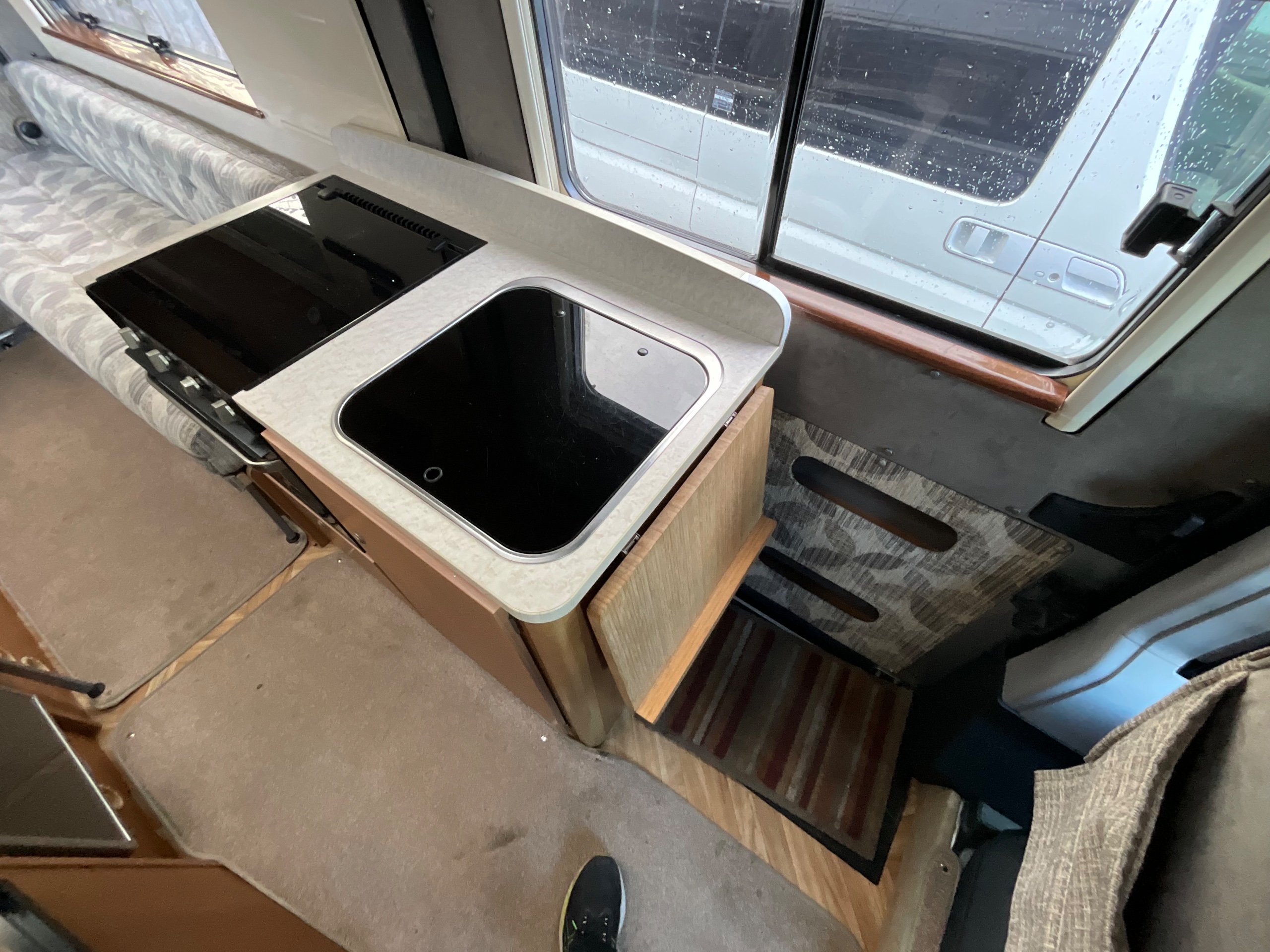 Inside there is all the comforts that you would expect, 3 Gas Hobs, Gas Grill and oven, 12 V Fridge with freezer compartment and a Sink. The bathroom is complete with basin, toilet and shower. Onboard there is Fresh and wastewater tanks, Gas / Electrical operated heating and hot water via the well renowned Whale heating/ hot water system. The electrical element only works when plugged in on 240V power.