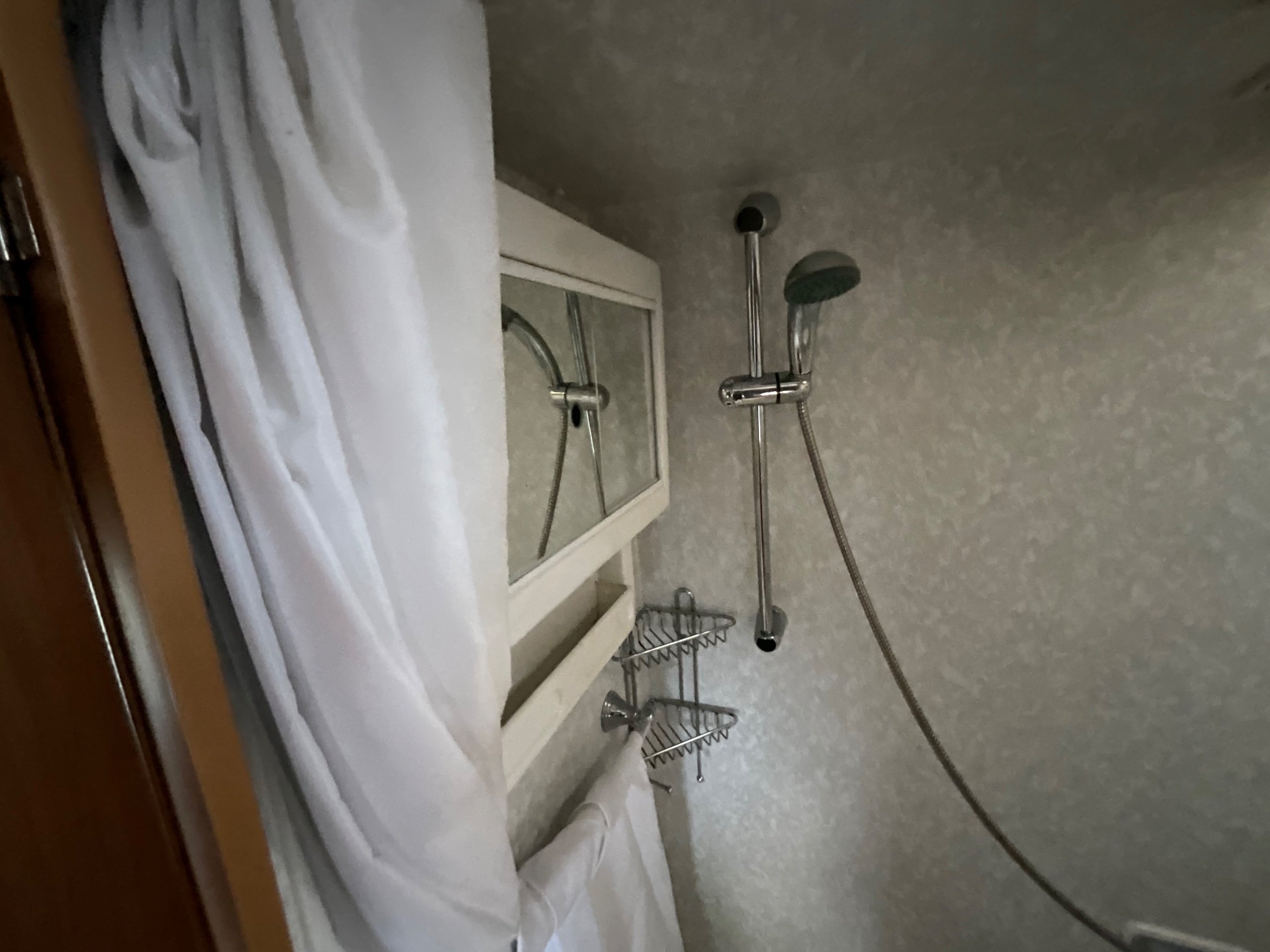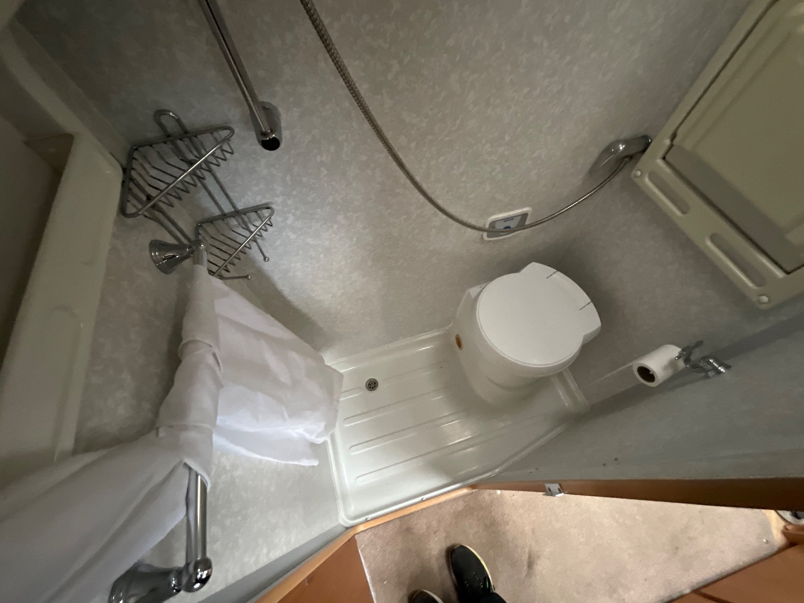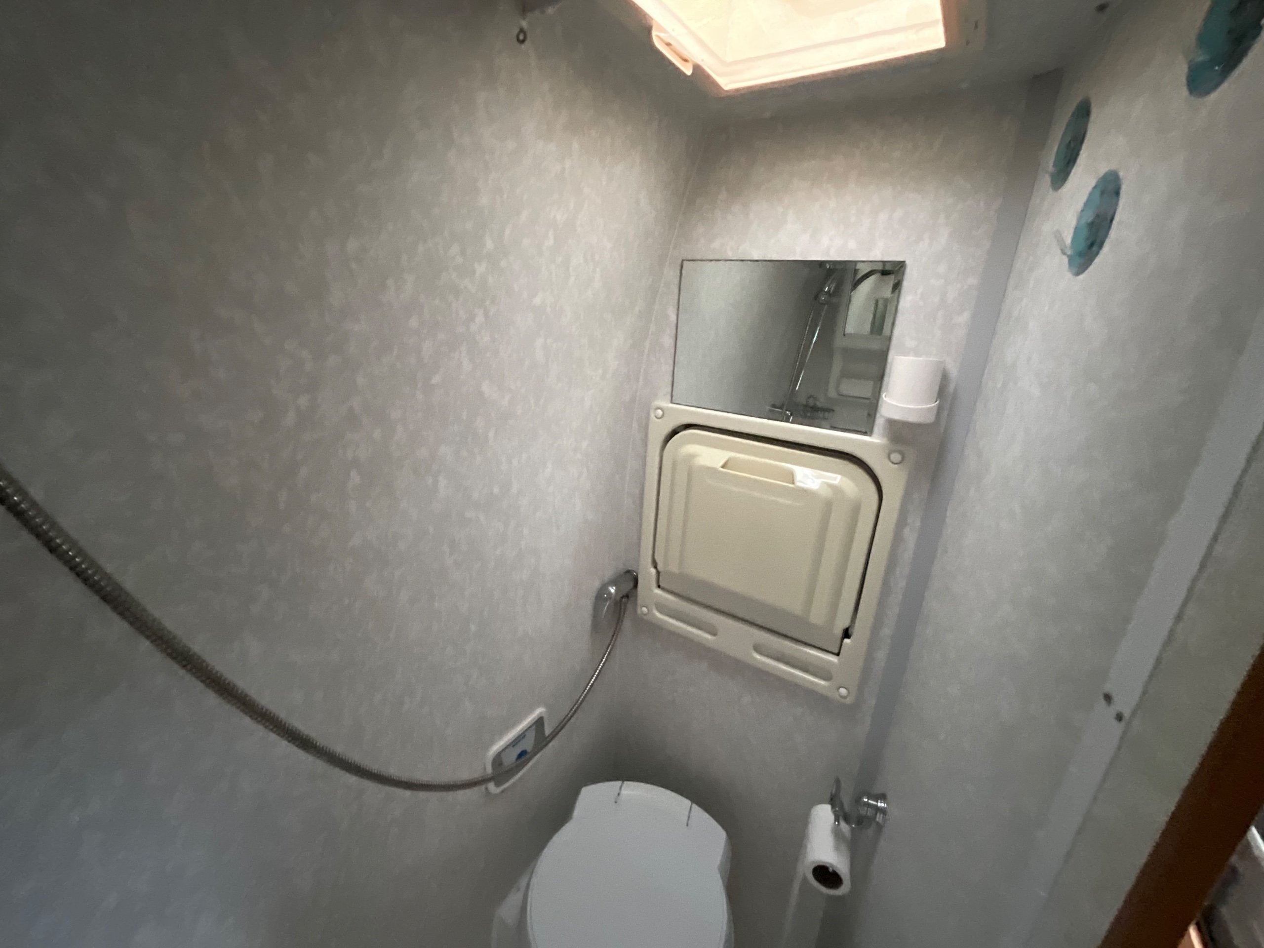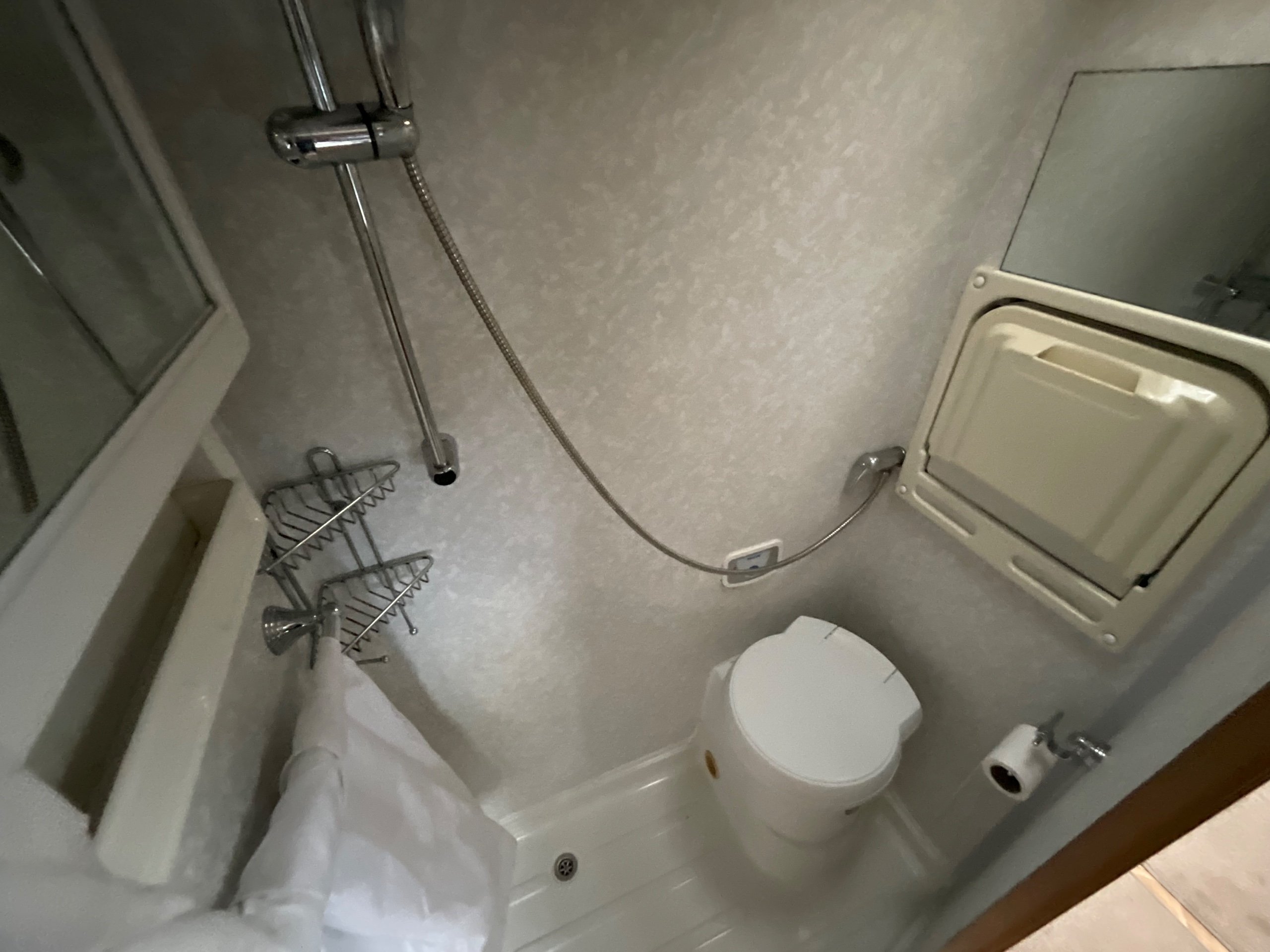Inside there is all the comforts that you would expect, 3 Gas Hobs, Gas Grill and oven, 12 V Fridge with freezer compartment and a Sink. The bathroom is complete with basin, toilet and shower. Onboard there is Fresh and wastewater tanks, Gas / Electrical operated heating and hot water via the well renowned Whale heating/ hot water system. The electrical element only works when plugged in on 240V power.