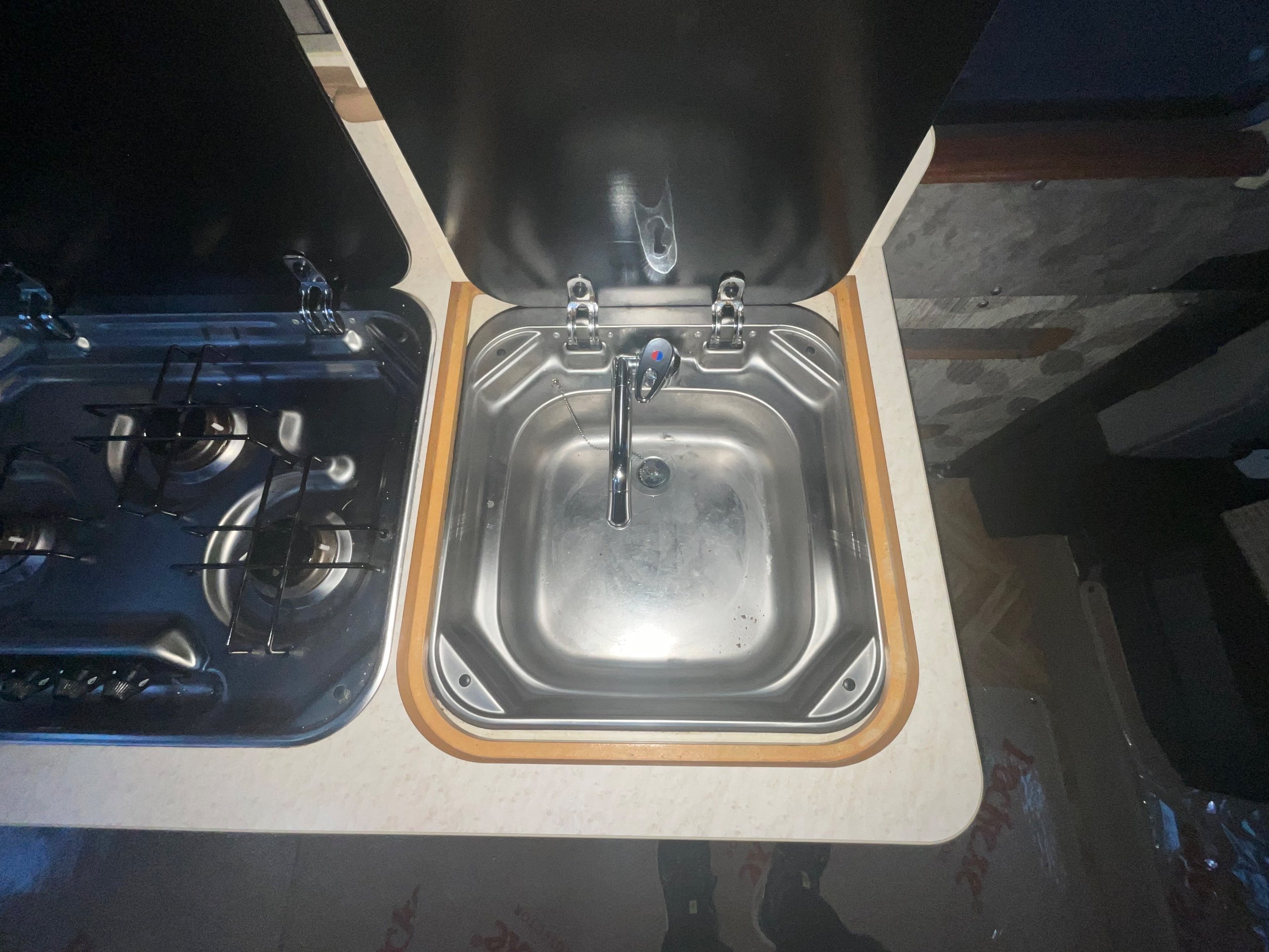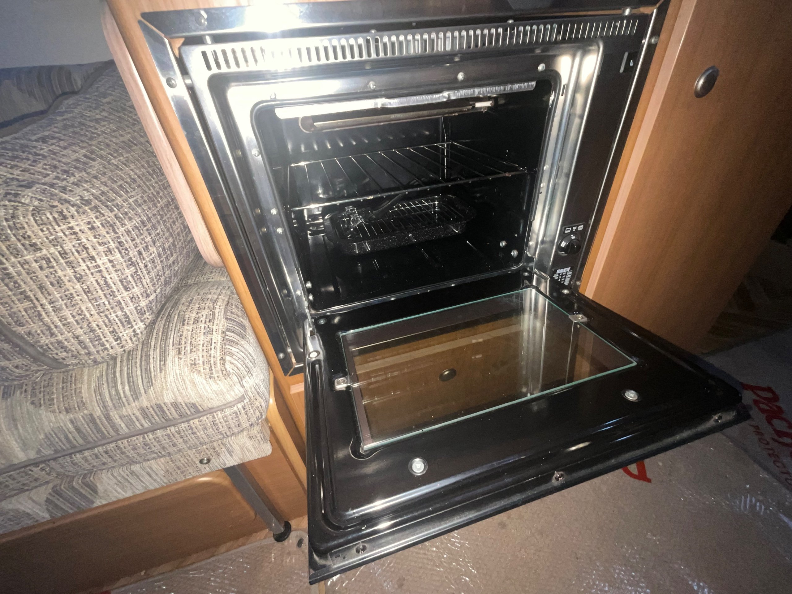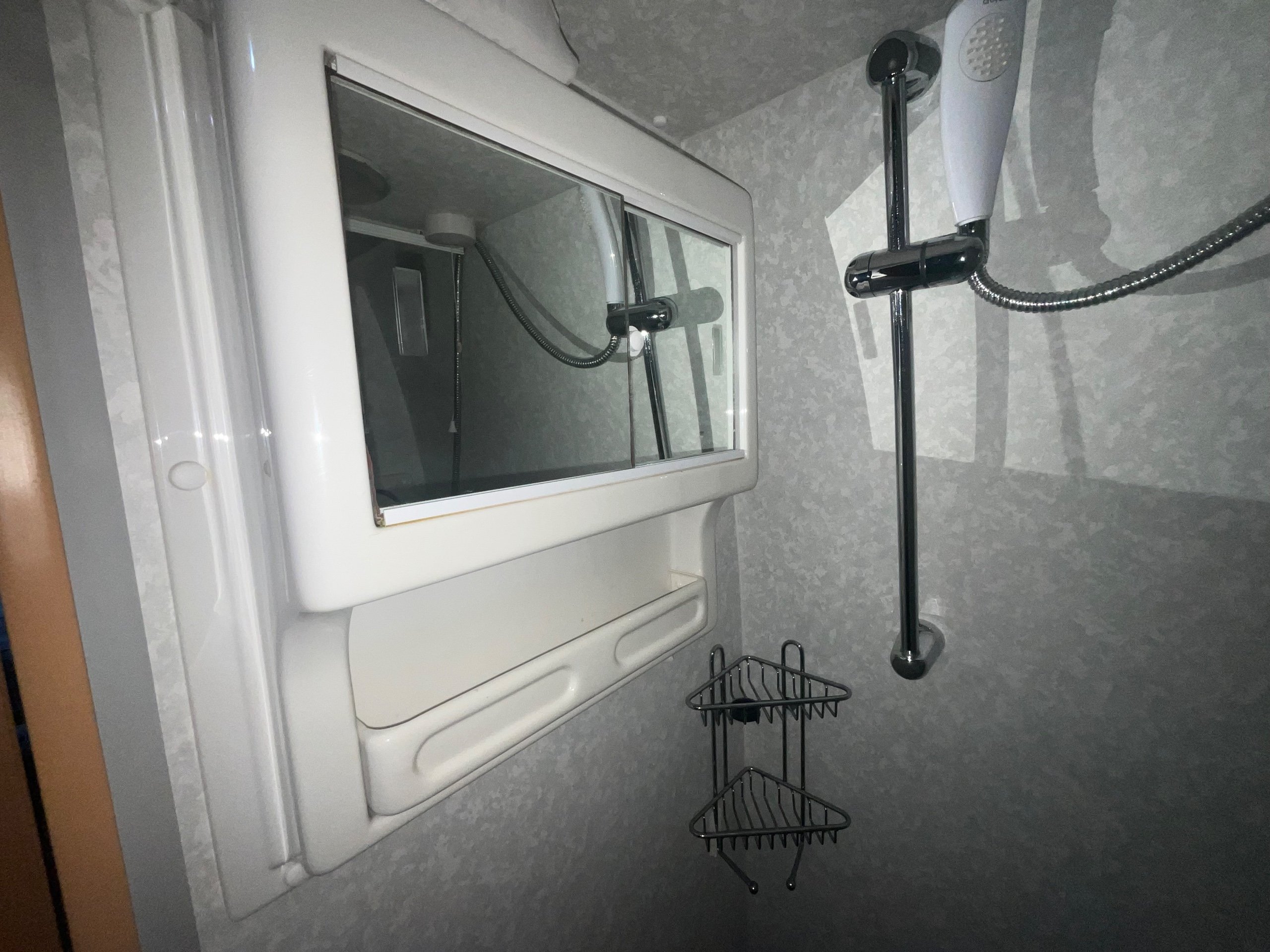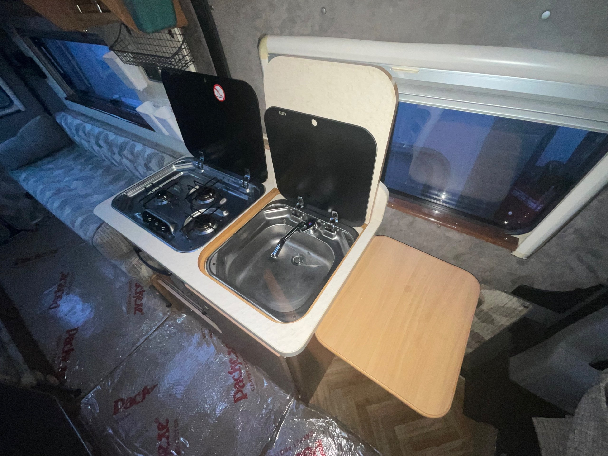 Inside there is all the comforts that you would expect, 3 Gas Hobs, Gas Grill and oven, 12 V Fridge with freezer compartment and a Sink. The bathroom is complete with basin, toilet and shower. Onboard there is Fresh and wastewater tanks, Gas / Electrical operated heating and hot water via the well renowned Whale heating/ hot water system. The electrical element only works when plugged in on 240V power.