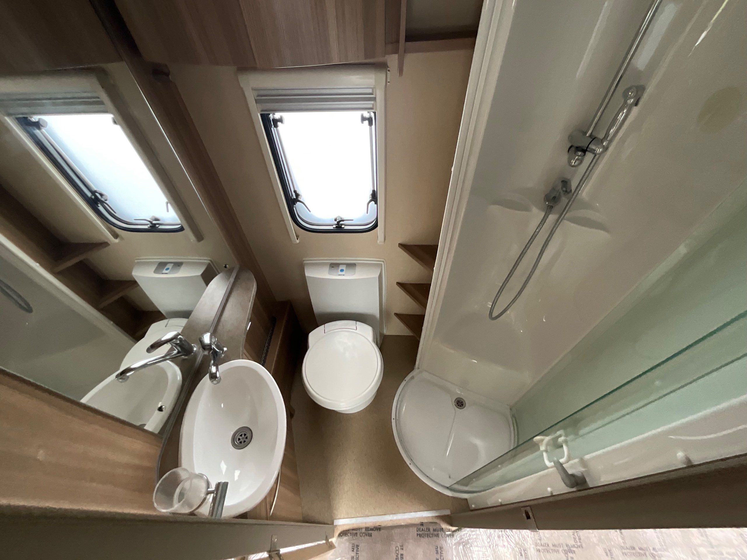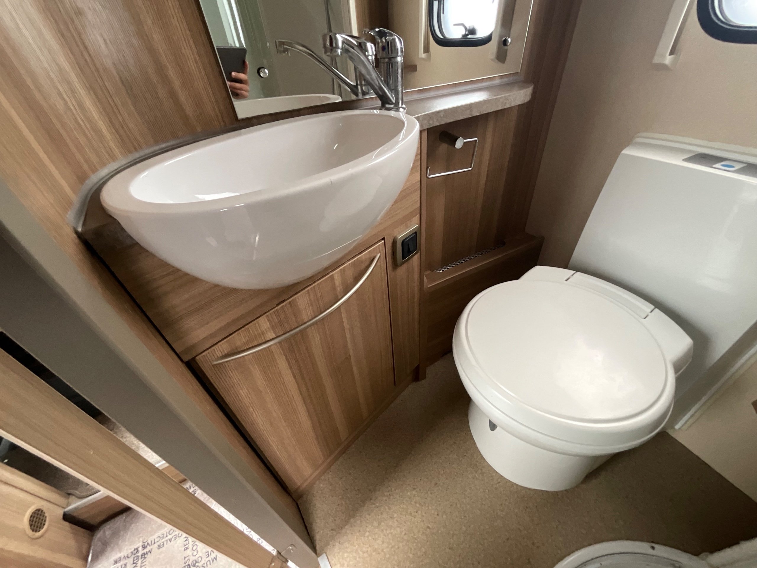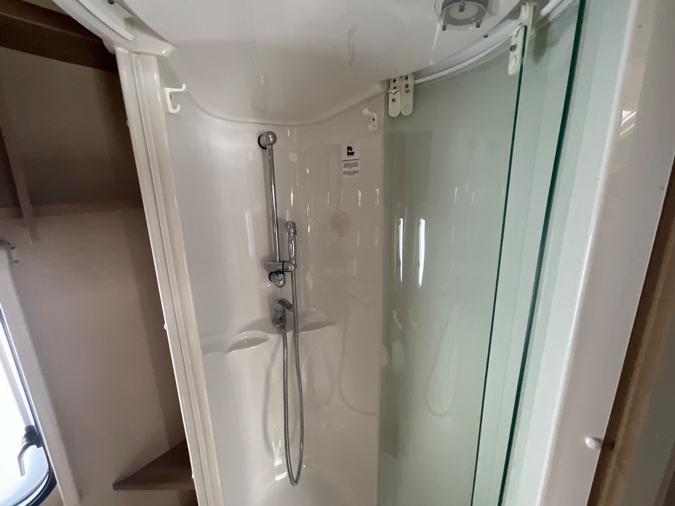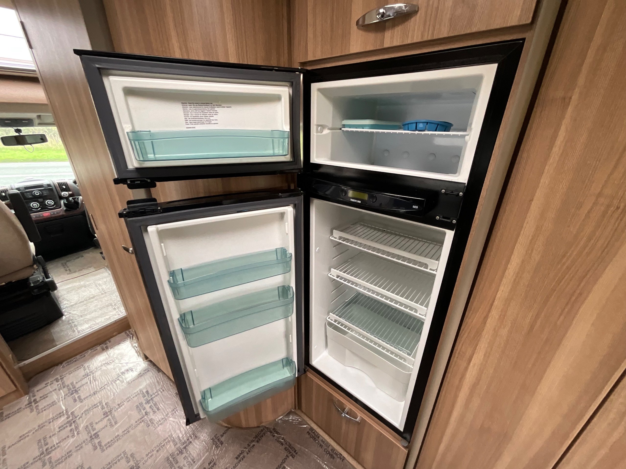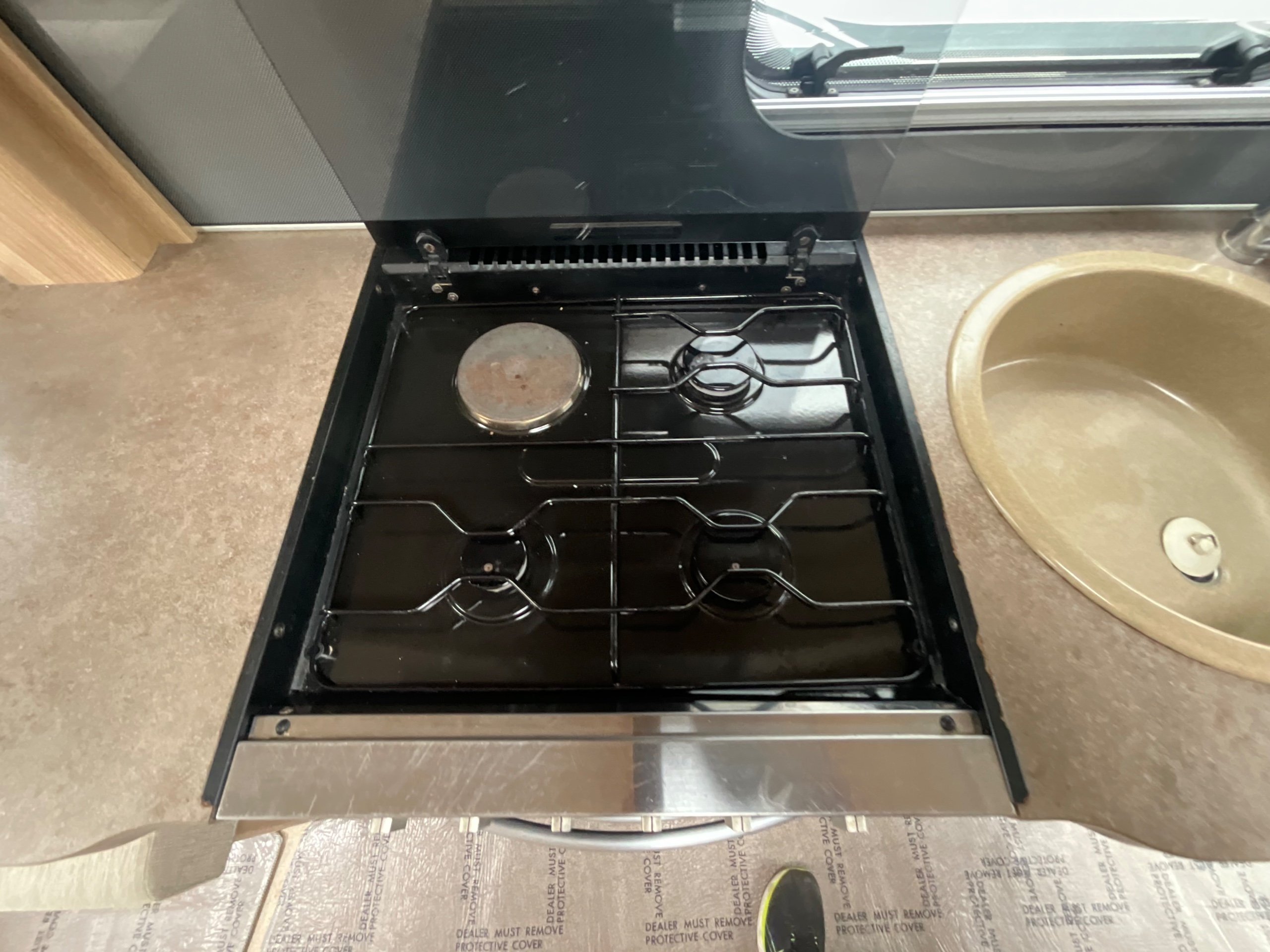 The kitchen is in the middle of the motorhome and has a Gas Oven & Grill, 3 Gas hobs, 1 Electrical hob, sink and 3-way fridge with a separate freezer compartment. The bathroom is very spacious with a separate shower, basin and toilet. Onboard there is Fresh and wastewater tanks fitted within the motorhome. There is also the modern Alde heating and hot water system which runs on Gas or 240V electric when plugged in.