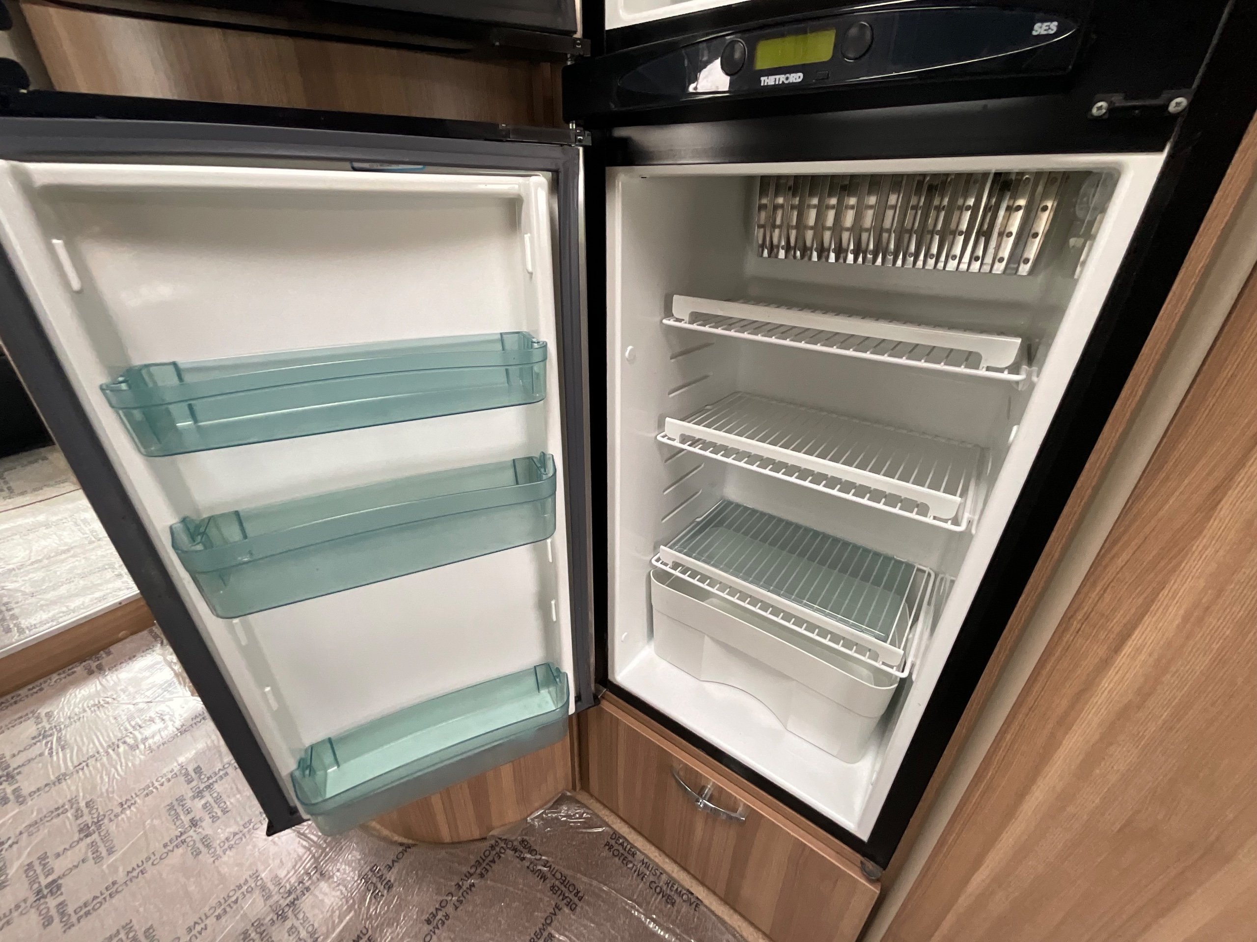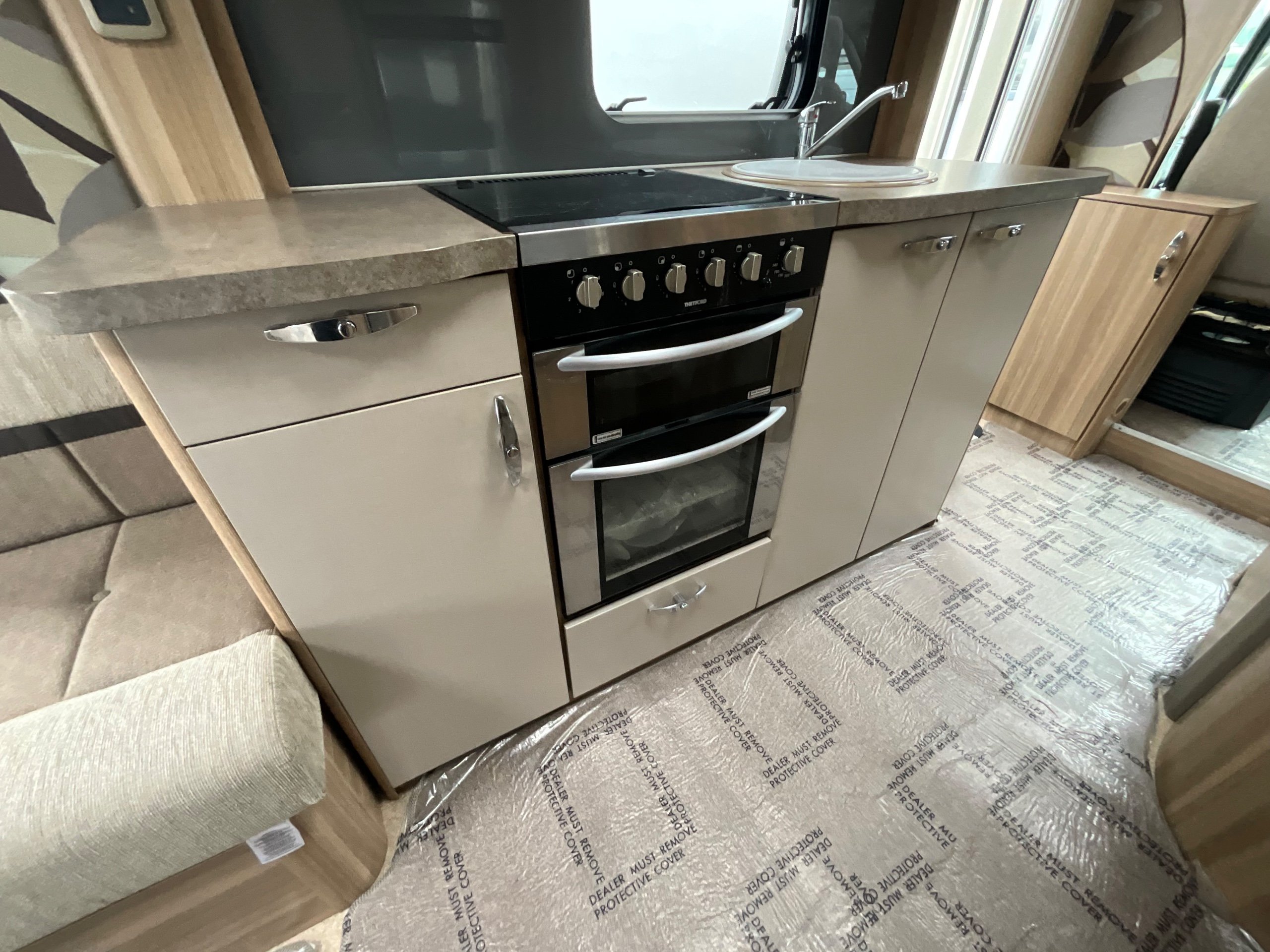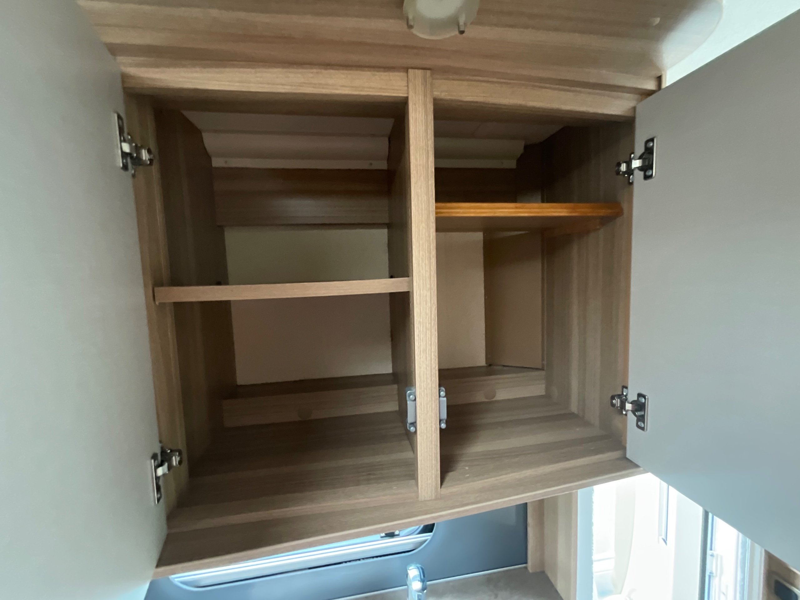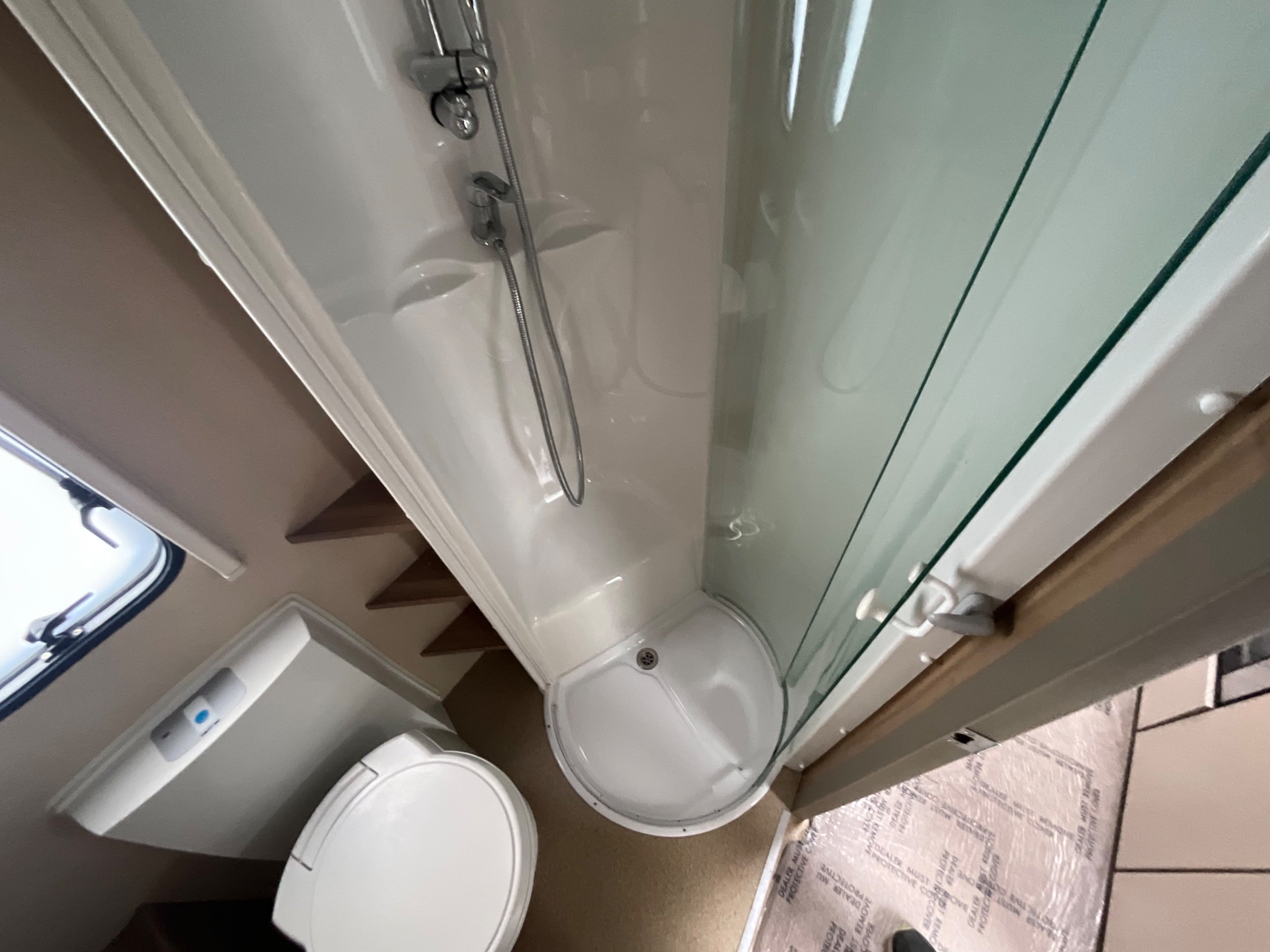 The kitchen is in the middle of the motorhome and has a Gas Oven & Grill, 3 Gas hobs, 1 Electrical hob, sink and 3-way fridge with a separate freezer compartment. The bathroom is very spacious with a separate shower, basin and toilet. Onboard there is Fresh and wastewater tanks fitted within the motorhome. There is also the modern Alde heating and hot water system which runs on Gas or 240V electric when plugged in.