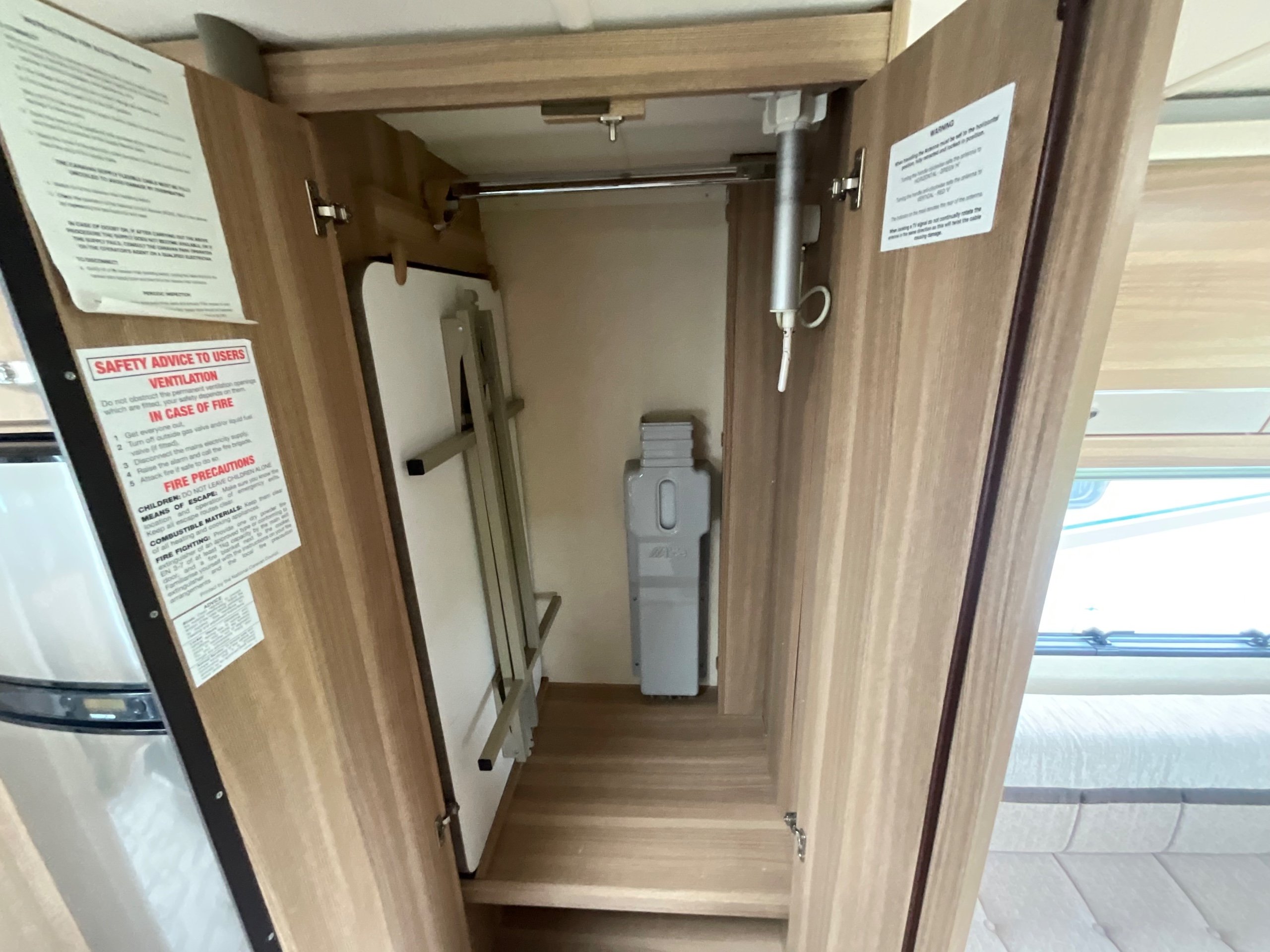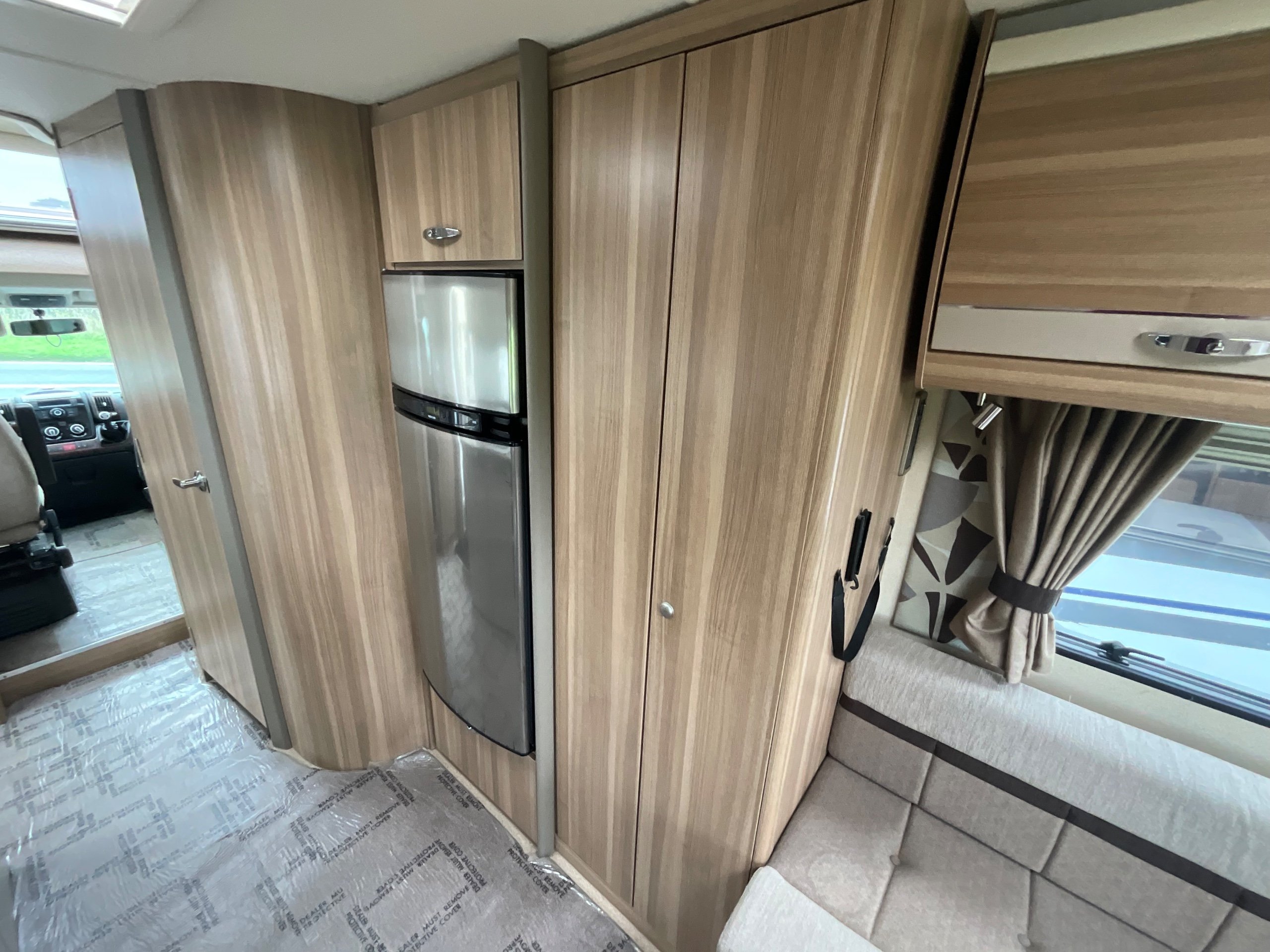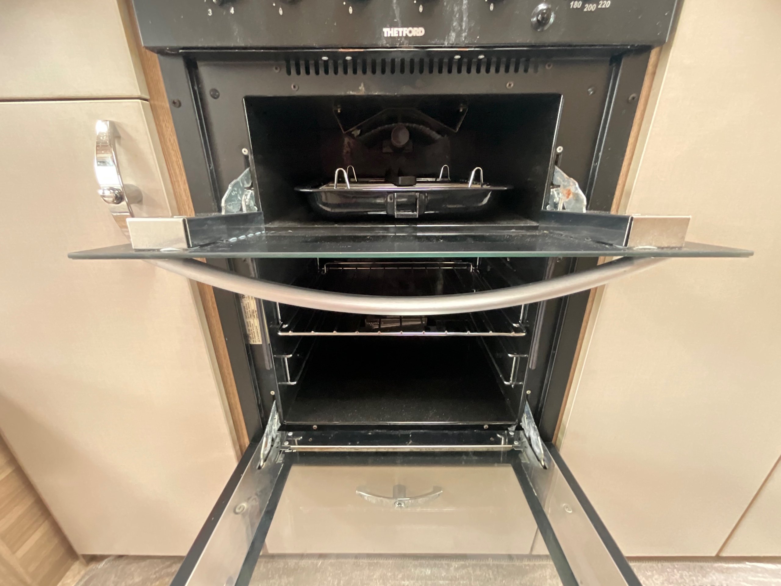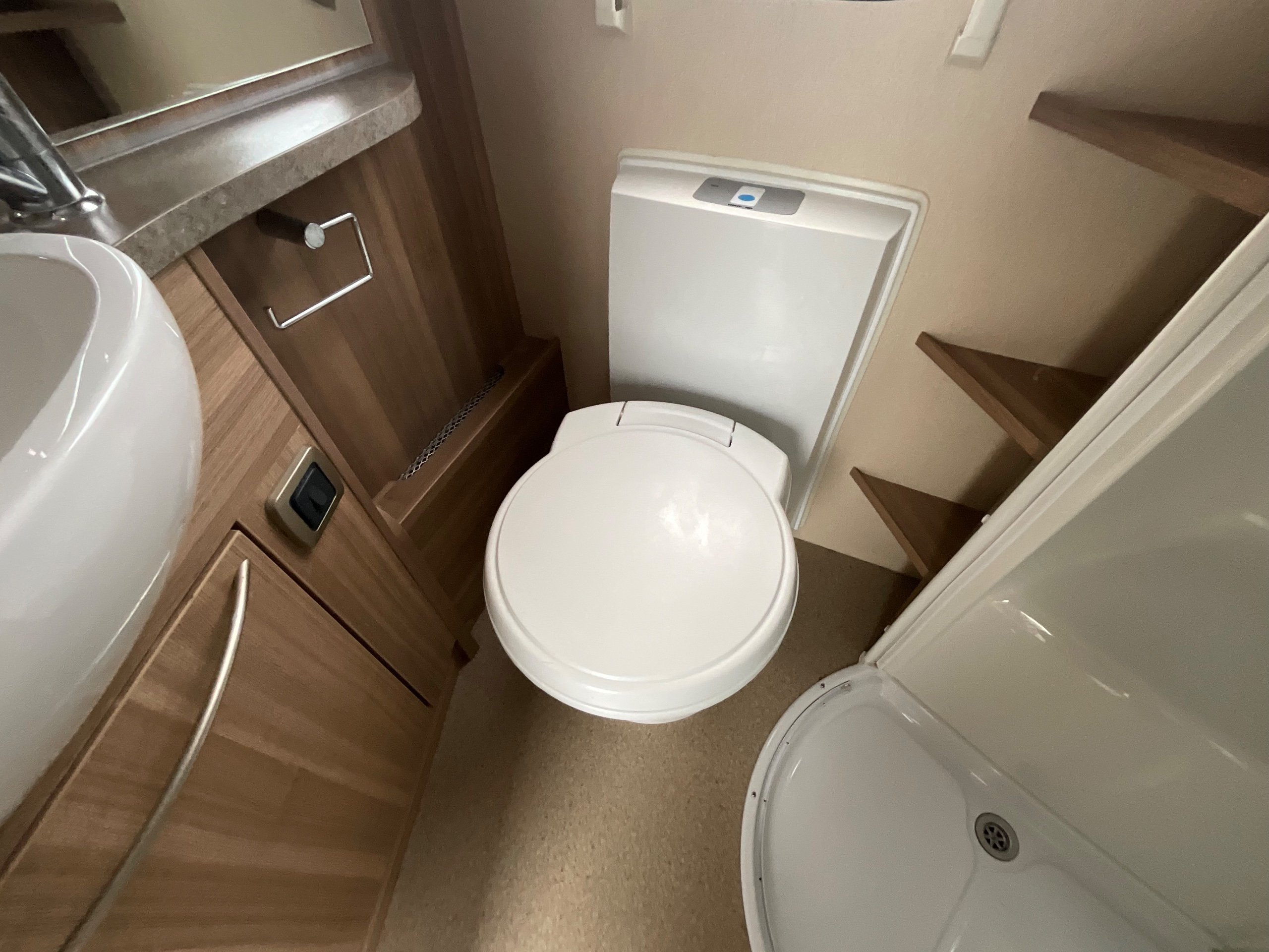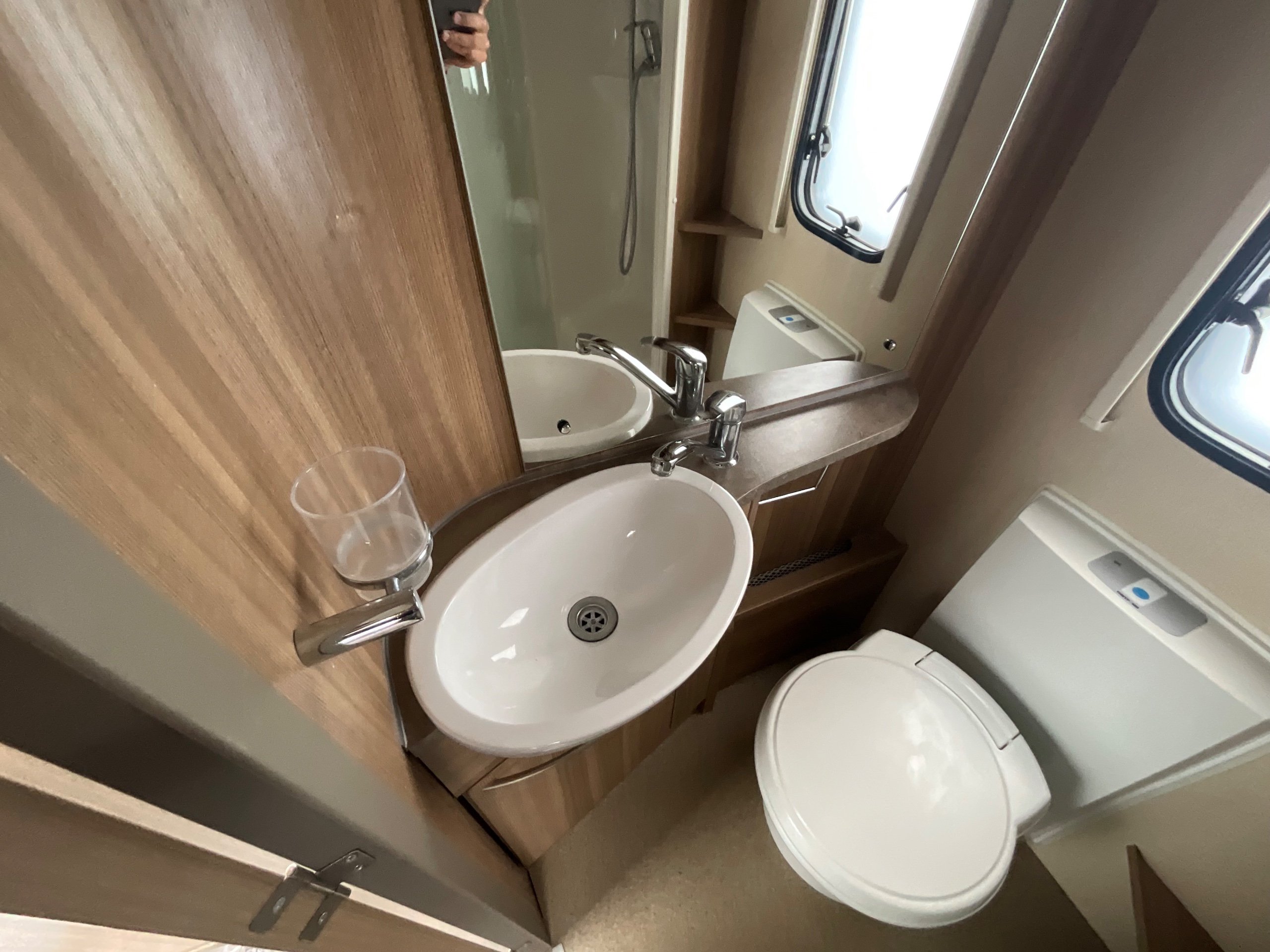 The kitchen is in the middle of the motorhome and has a Gas Oven & Grill, 3 Gas hobs, 1 Electrical hob, sink and 3-way fridge with a separate freezer compartment. The bathroom is very spacious with a separate shower, basin and toilet. Onboard there is Fresh and wastewater tanks fitted within the motorhome. There is also the modern Alde heating and hot water system which runs on Gas or 240V electric when plugged in.