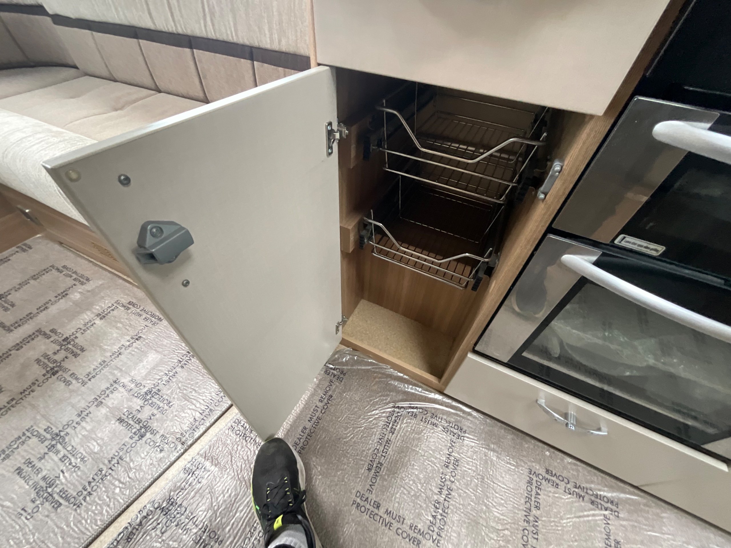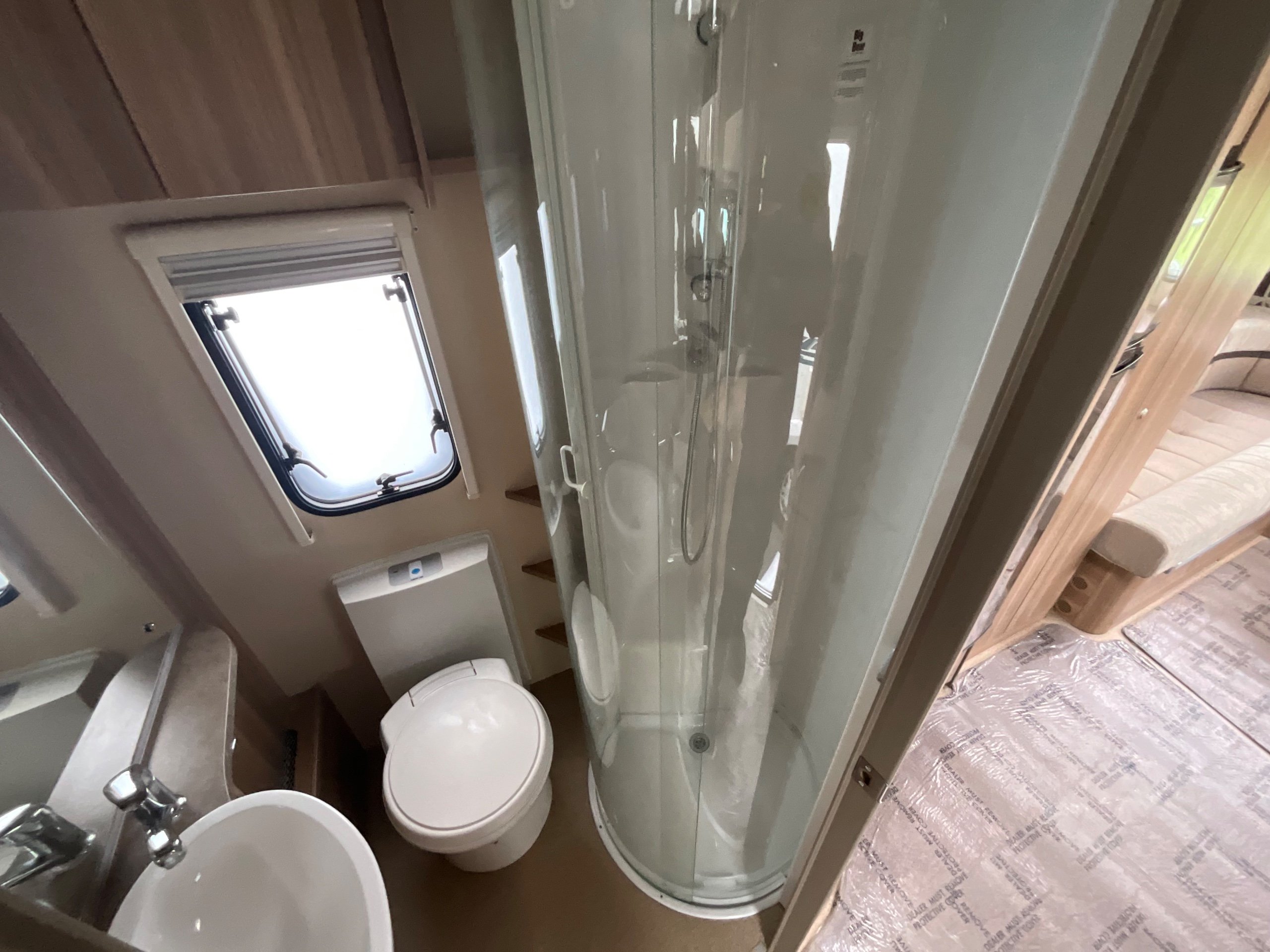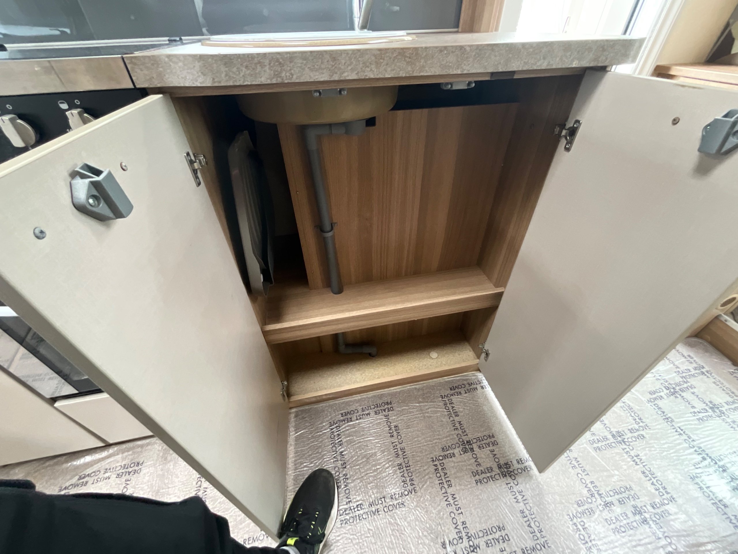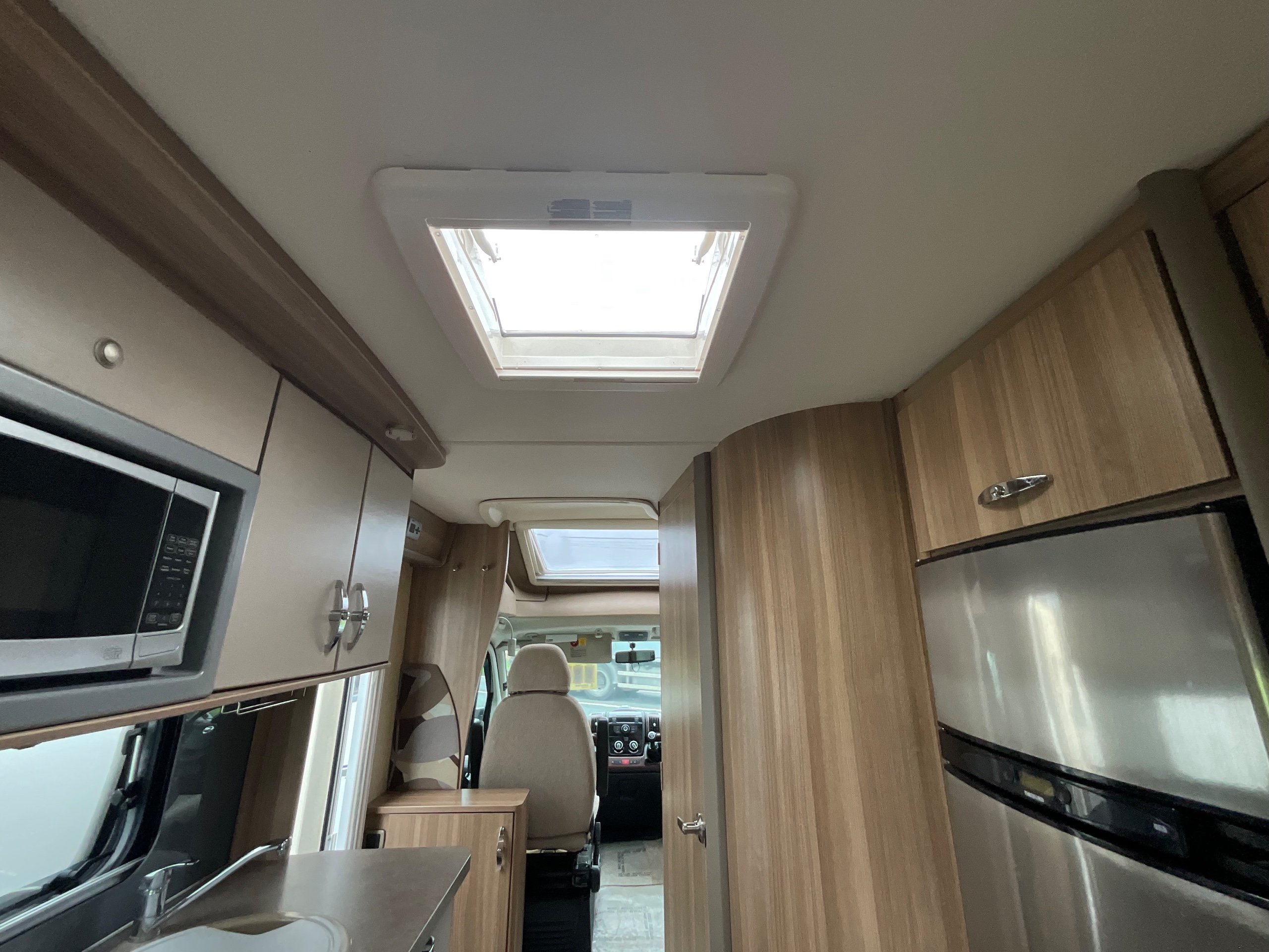 The kitchen is in the middle of the motorhome and has a Gas Oven & Grill, 3 Gas hobs, 1 Electrical hob, sink and 3-way fridge with a separate freezer compartment. The bathroom is very spacious with a separate shower, basin and toilet. Onboard there is Fresh and wastewater tanks fitted within the motorhome. There is also the modern Alde heating and hot water system which runs on Gas or 240V electric when plugged in.