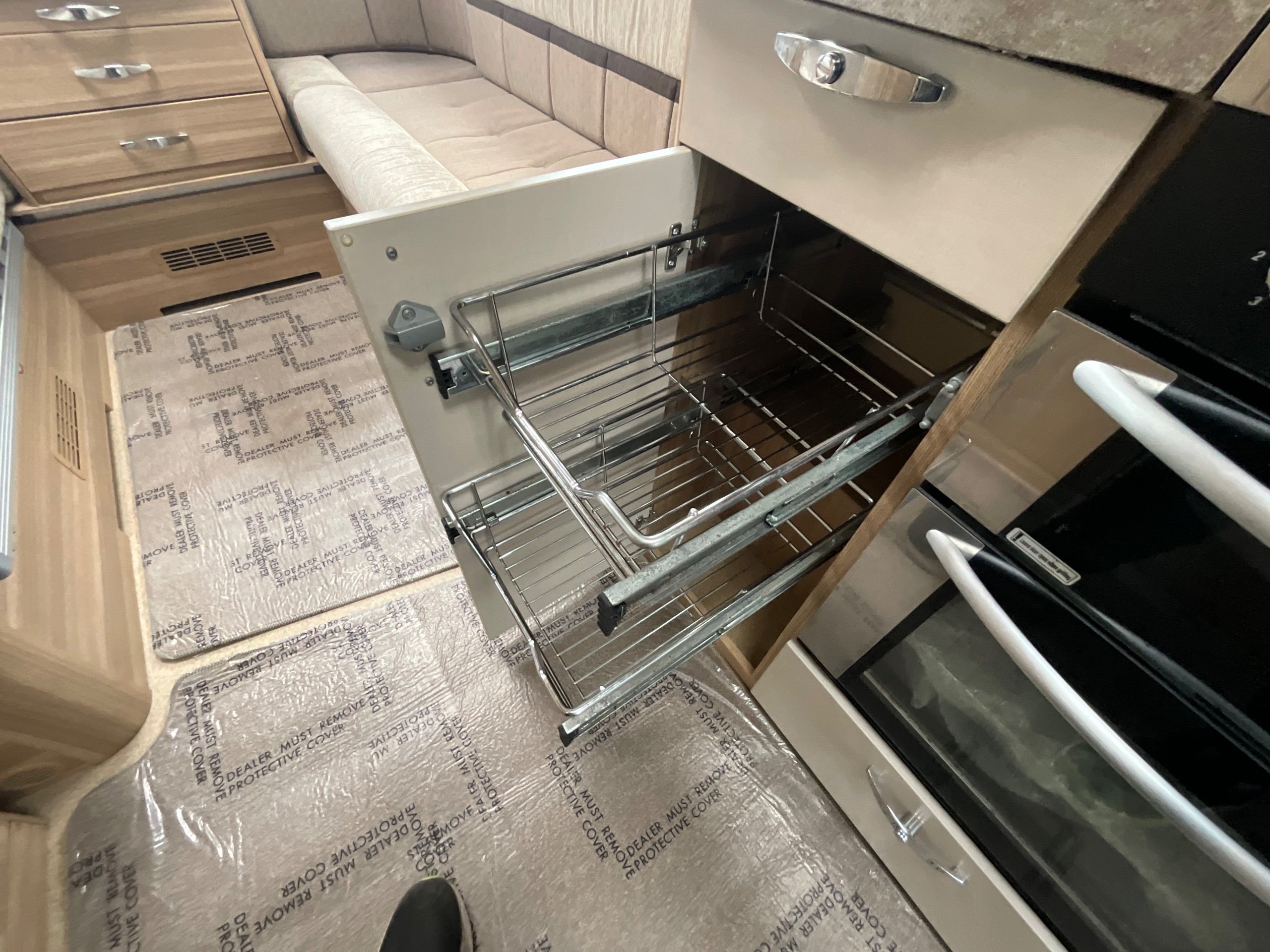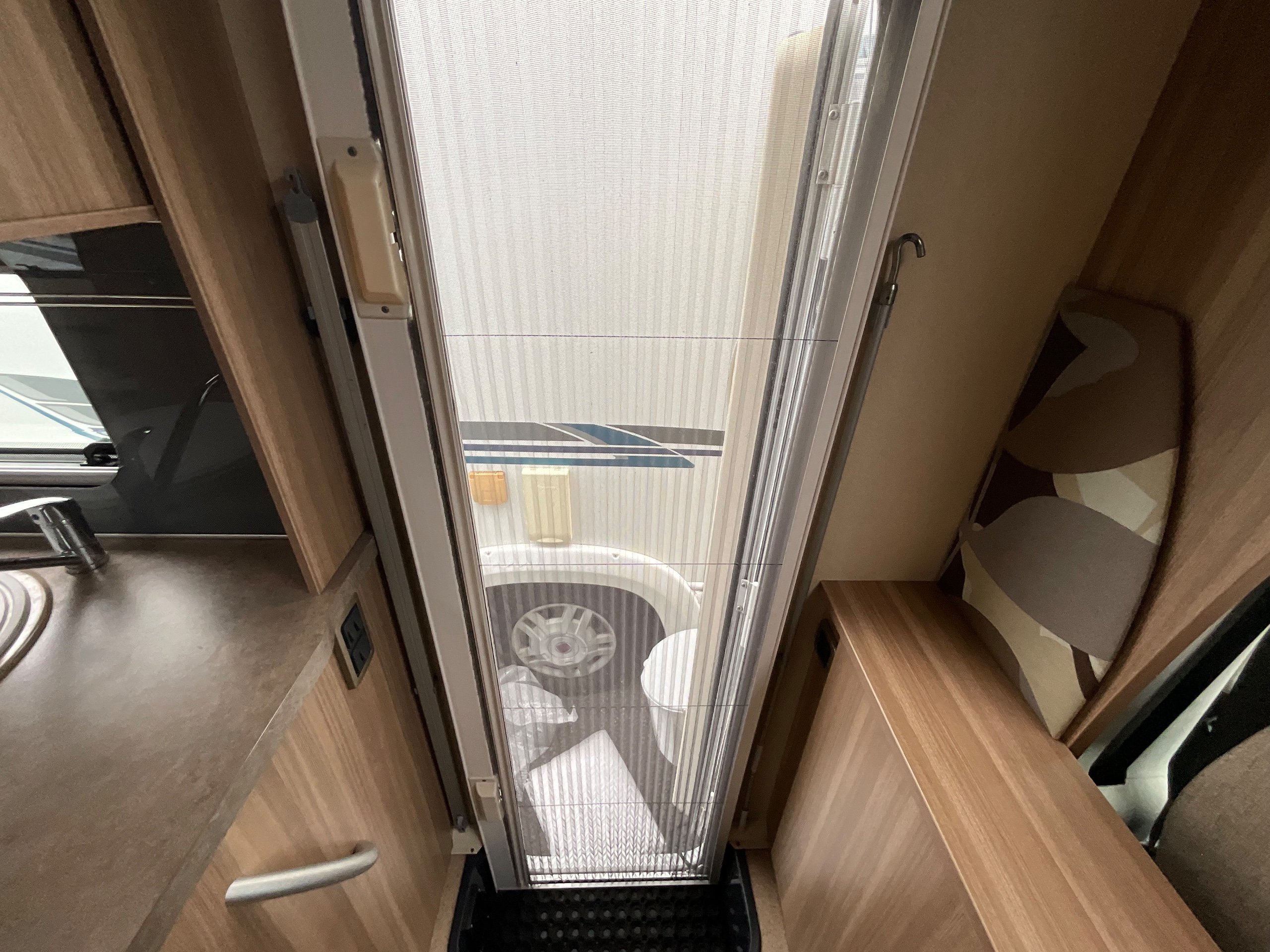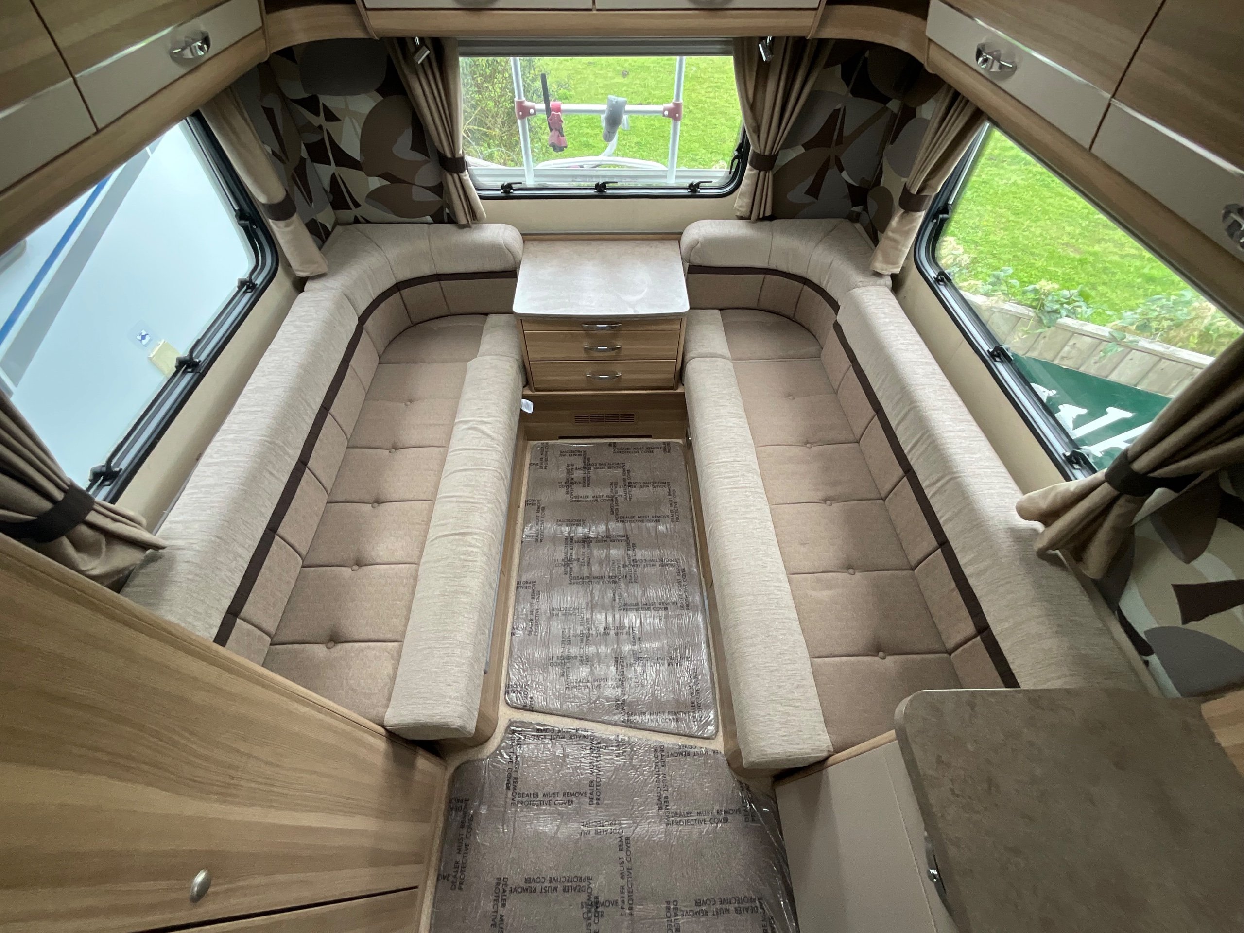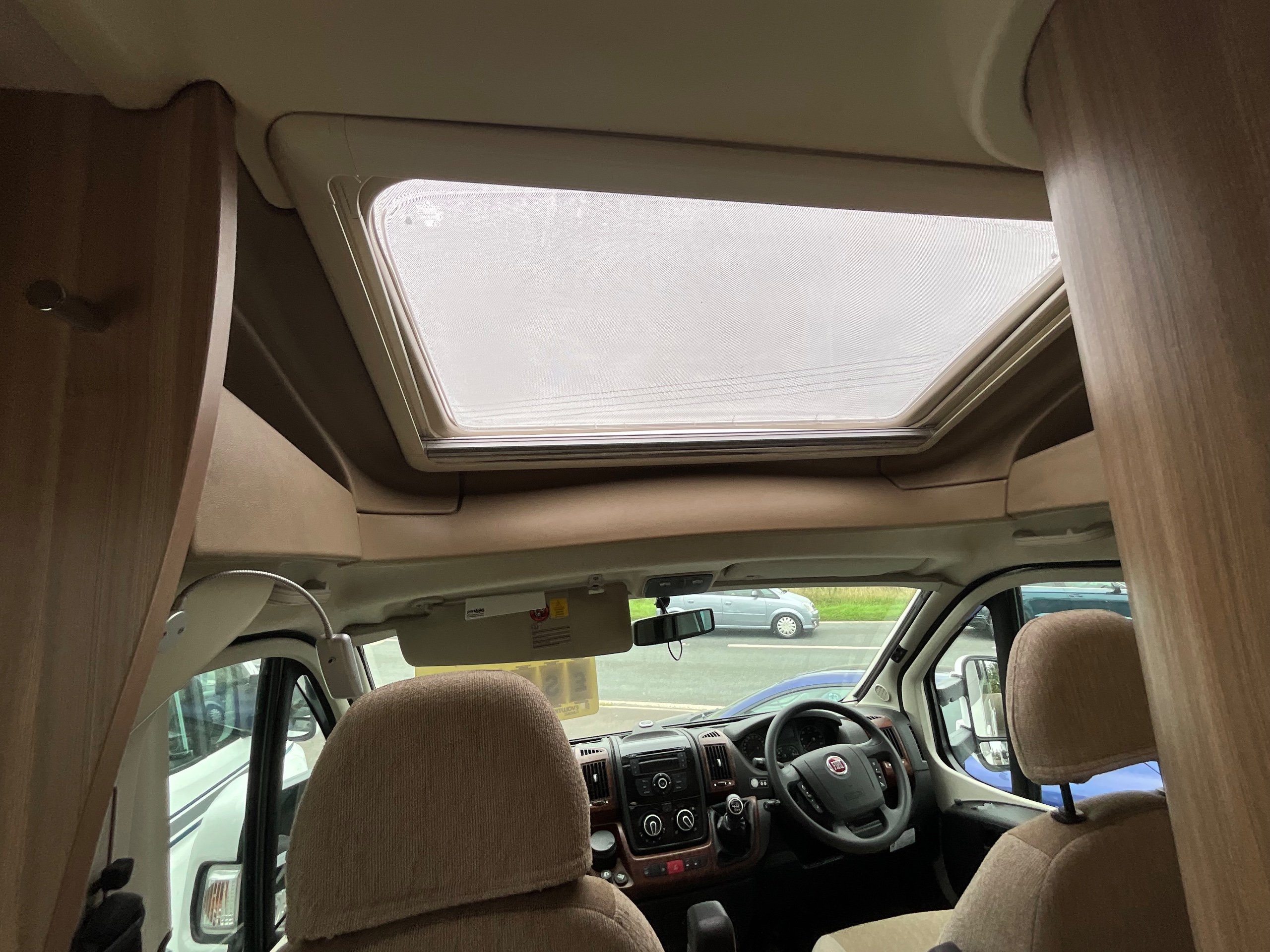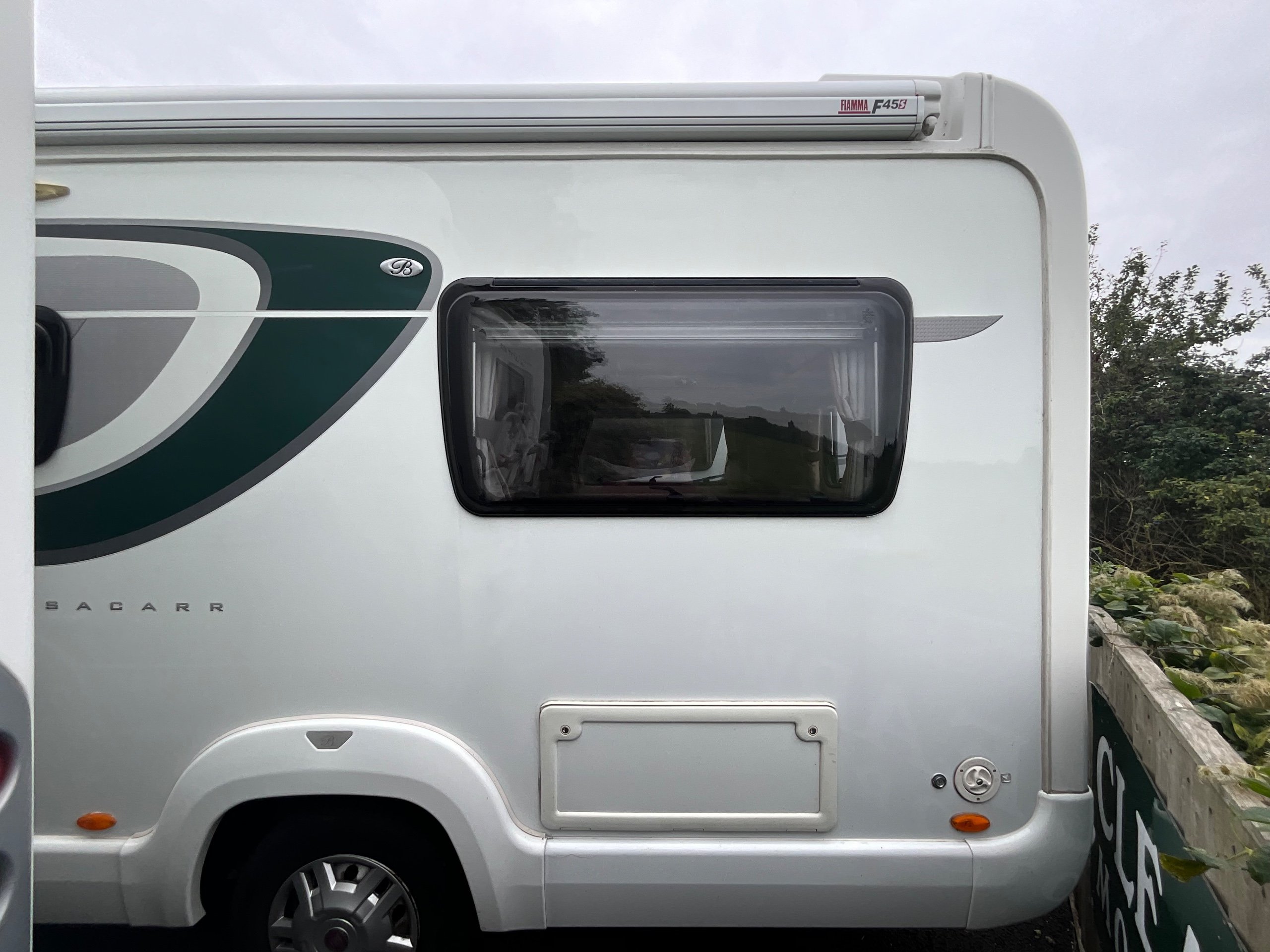 The Bessacarr E520 has had a few added features such as an Awning, TV aerial, Reversing camera, steering wheel audio controls, cab-air conditioning, built in cab blinds, microwave, drive away awning, motorhome winter cover and a bike rack.