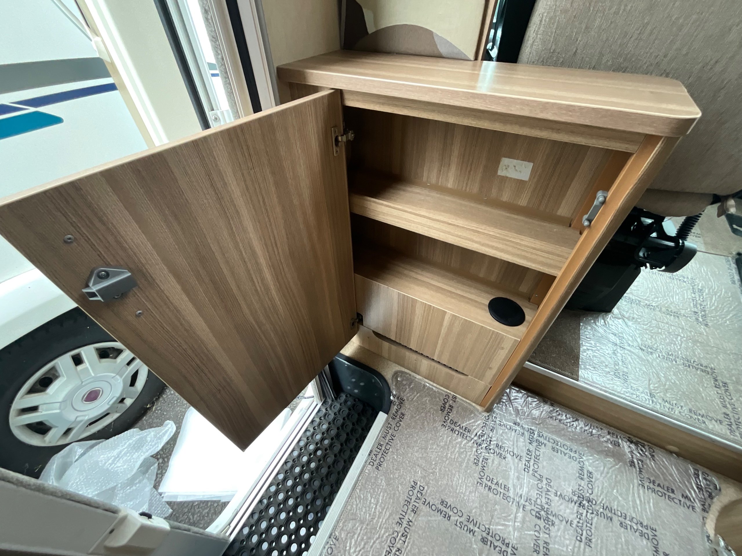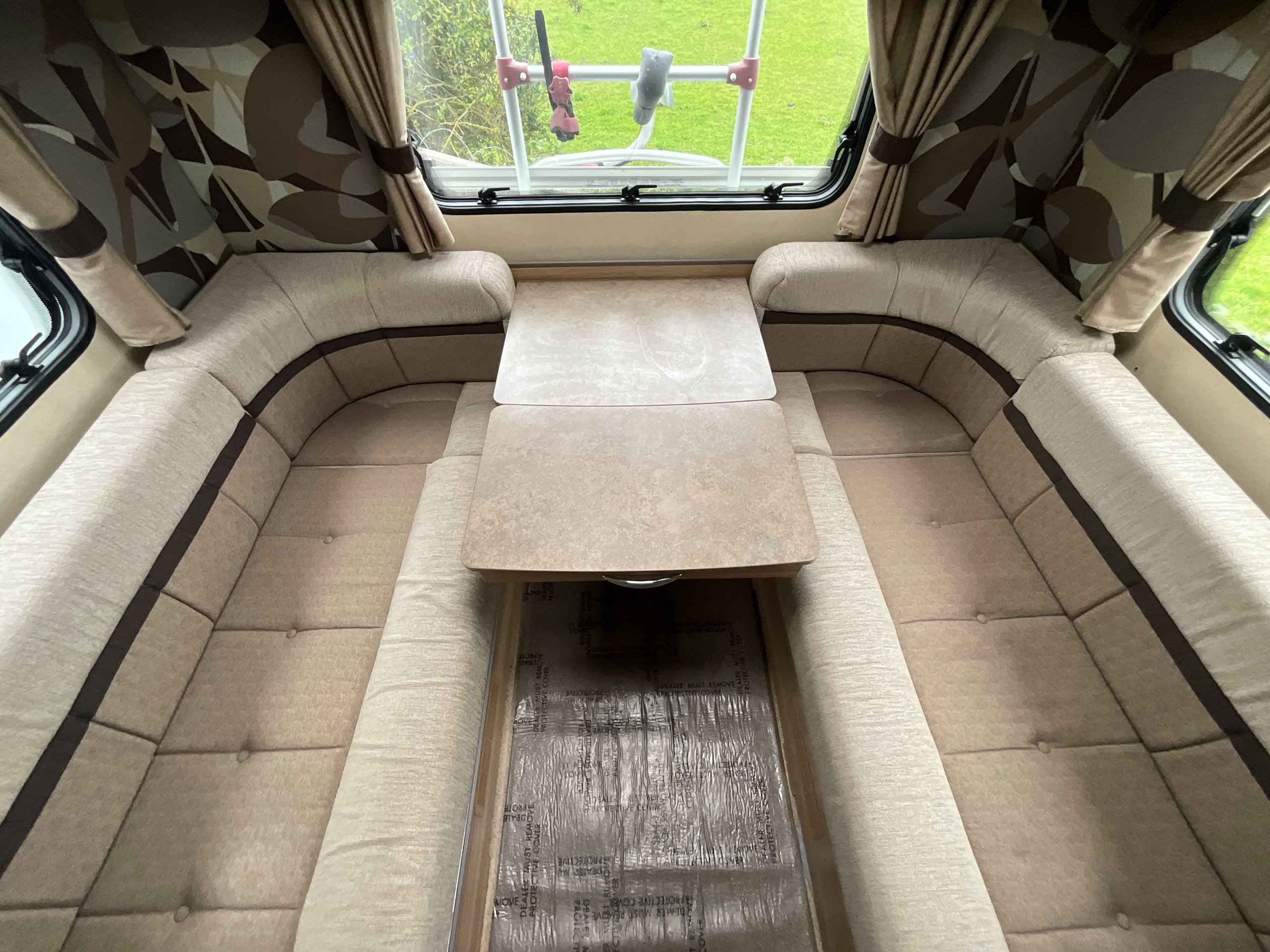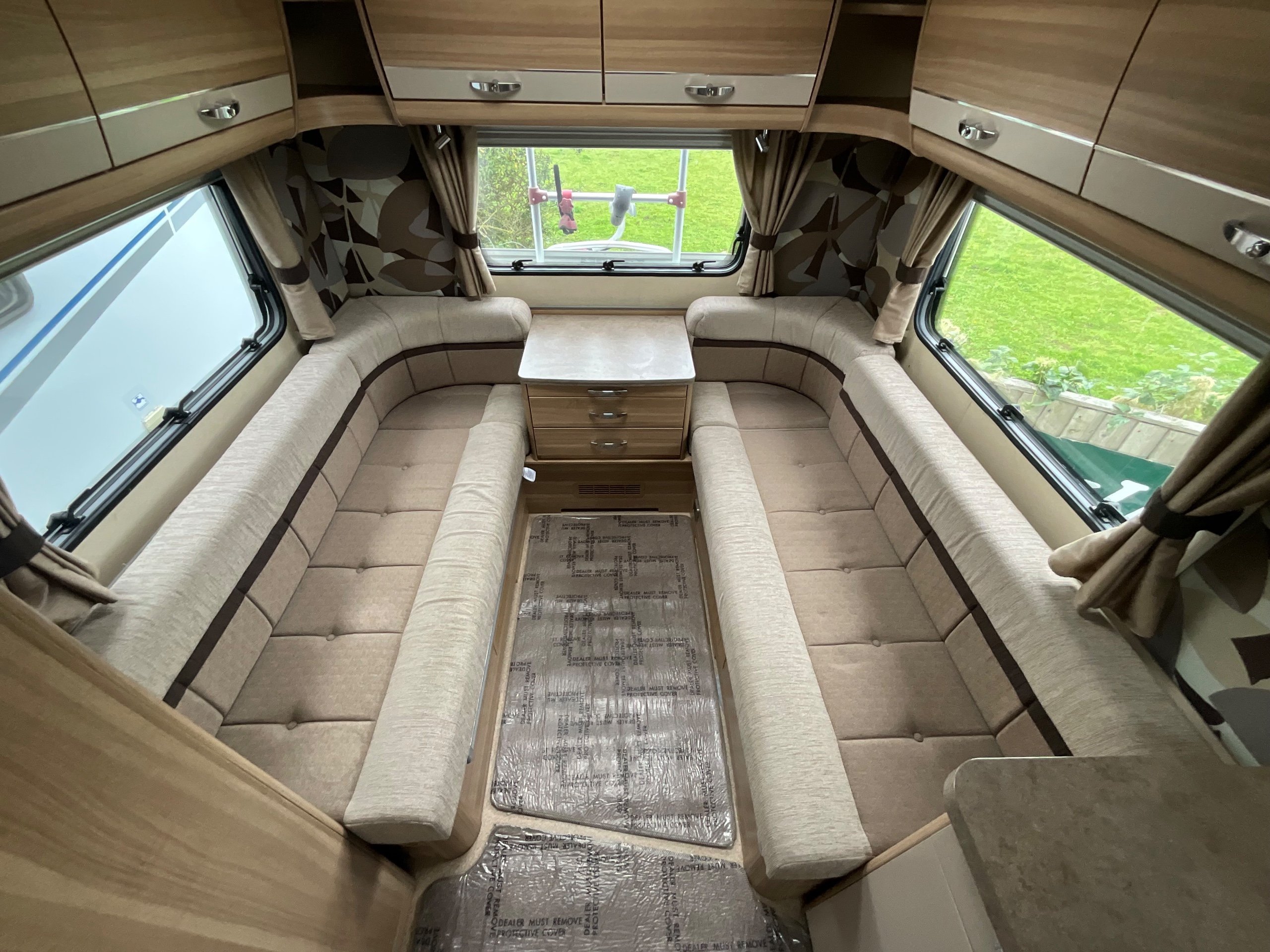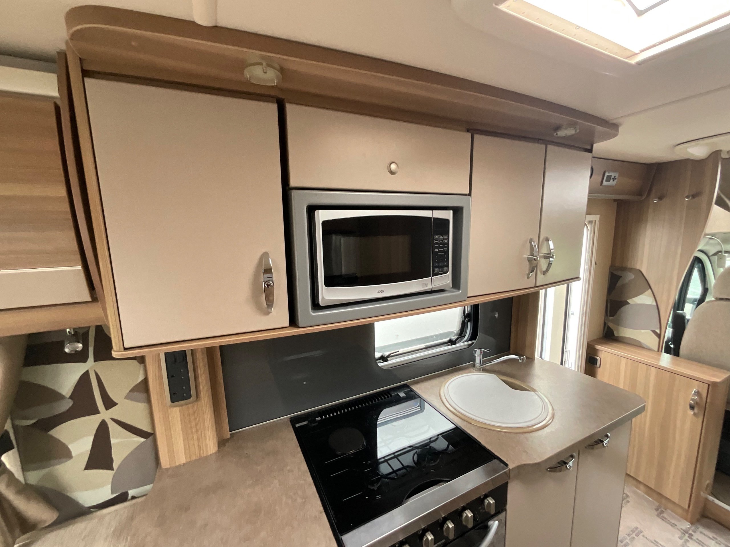 The Bessacarr E520 has had a few added features such as an Awning, TV aerial, Reversing camera, steering wheel audio controls, cab-air conditioning, built in cab blinds, microwave, drive away awning, motorhome winter cover and a bike rack.