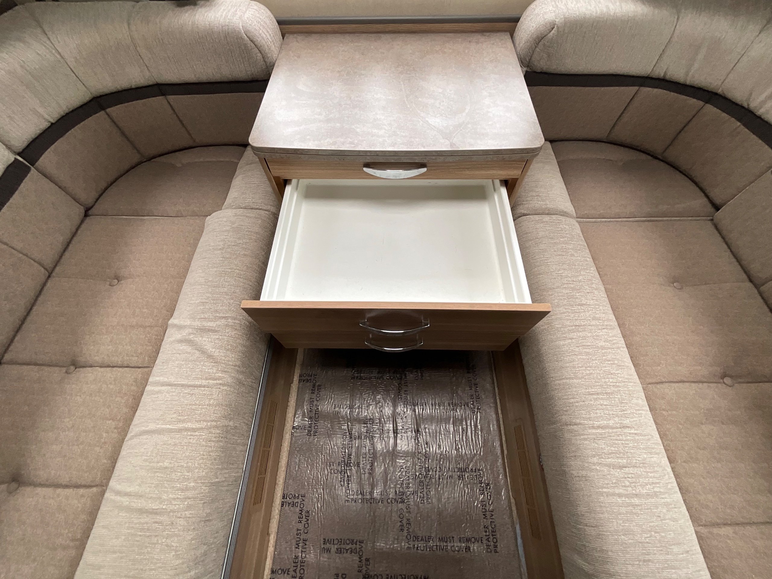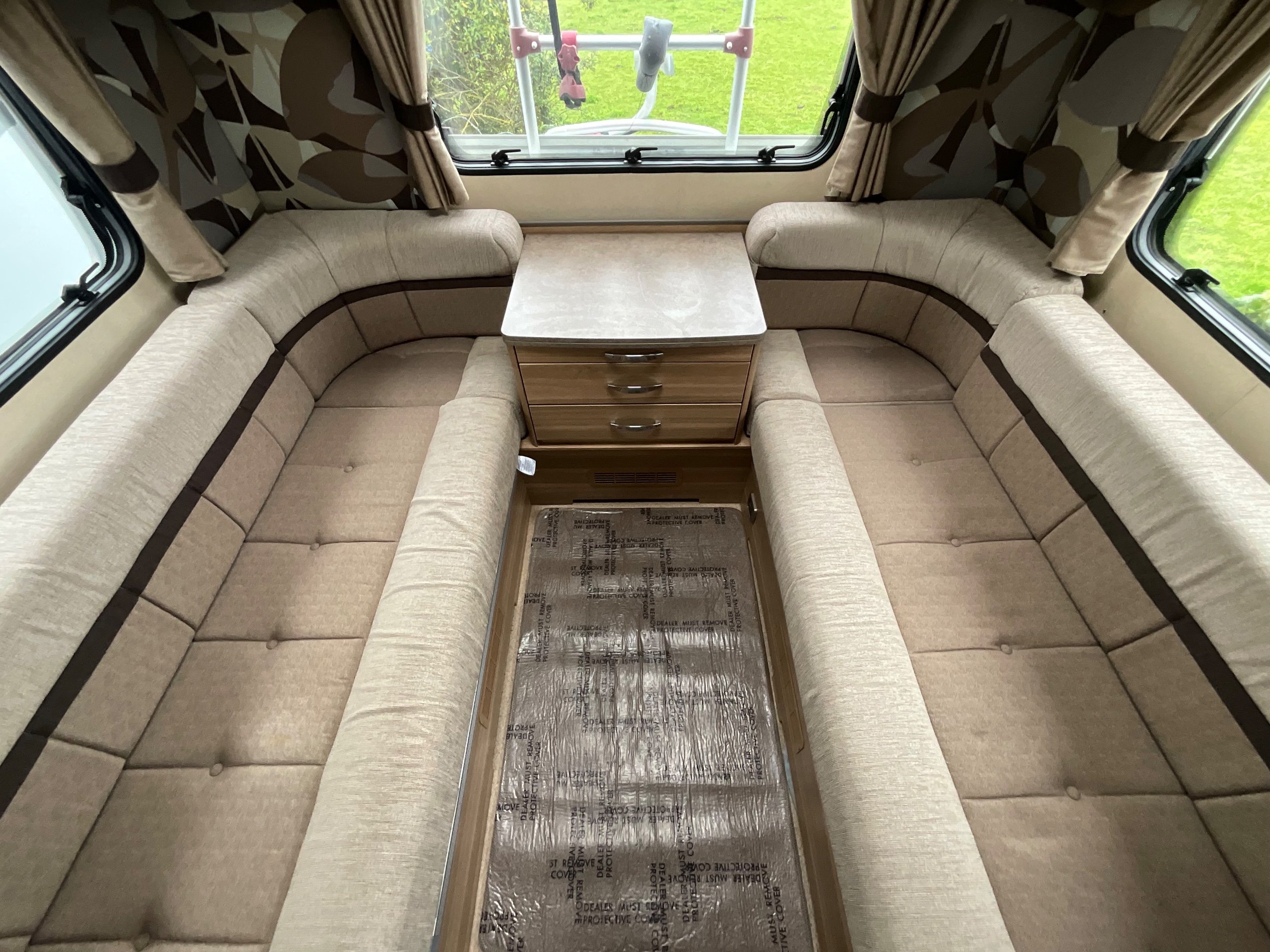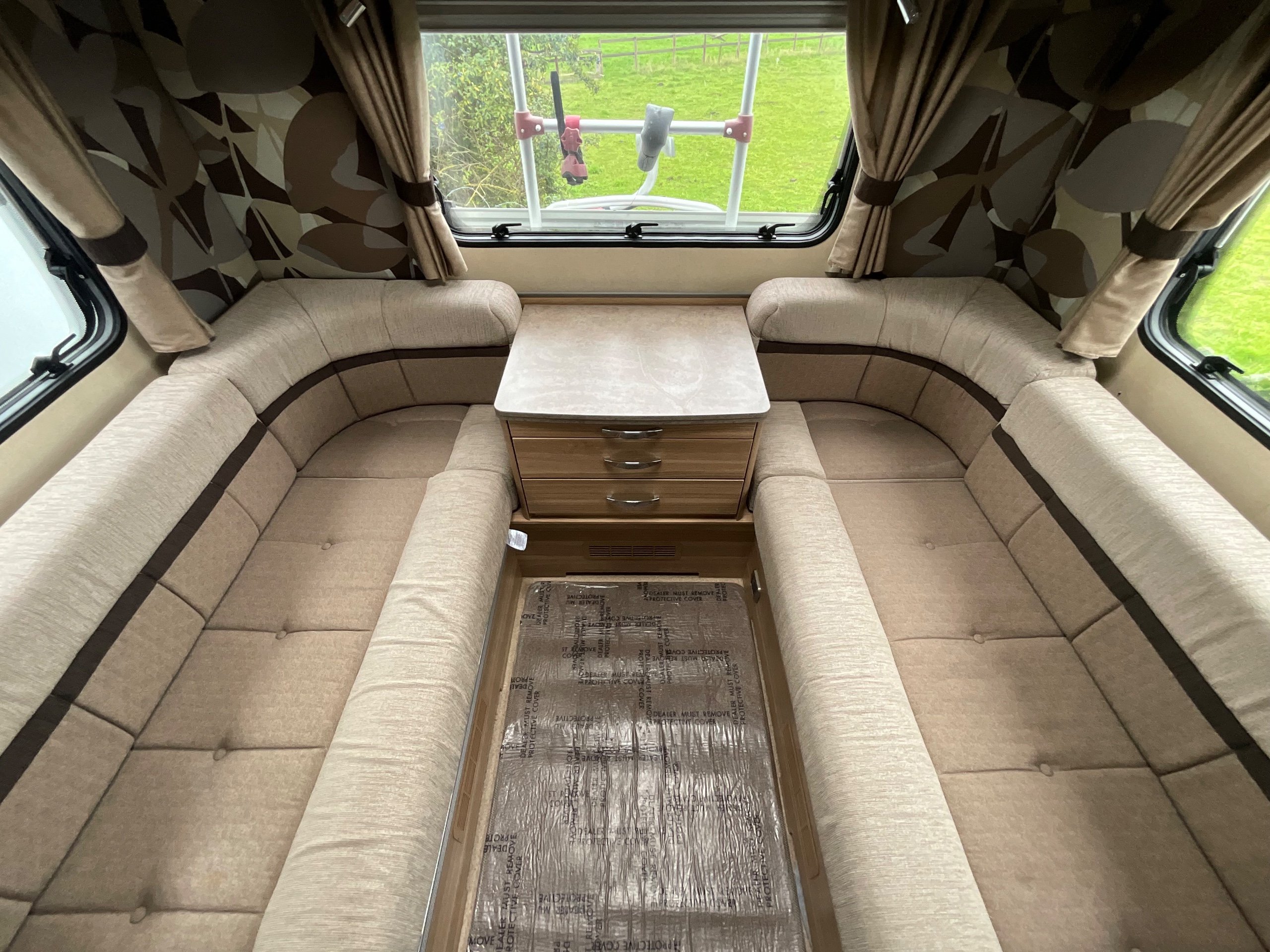 The Bessacarr E520, offers a very spacious feeling while touring with plenty of seating. The large U-shaped lounge makes into a large double bed or alternatively two singles, while also offering a dining area during the day. The over cab is simply storage, with both front seats also working on swivel mechanisms to give more living space.