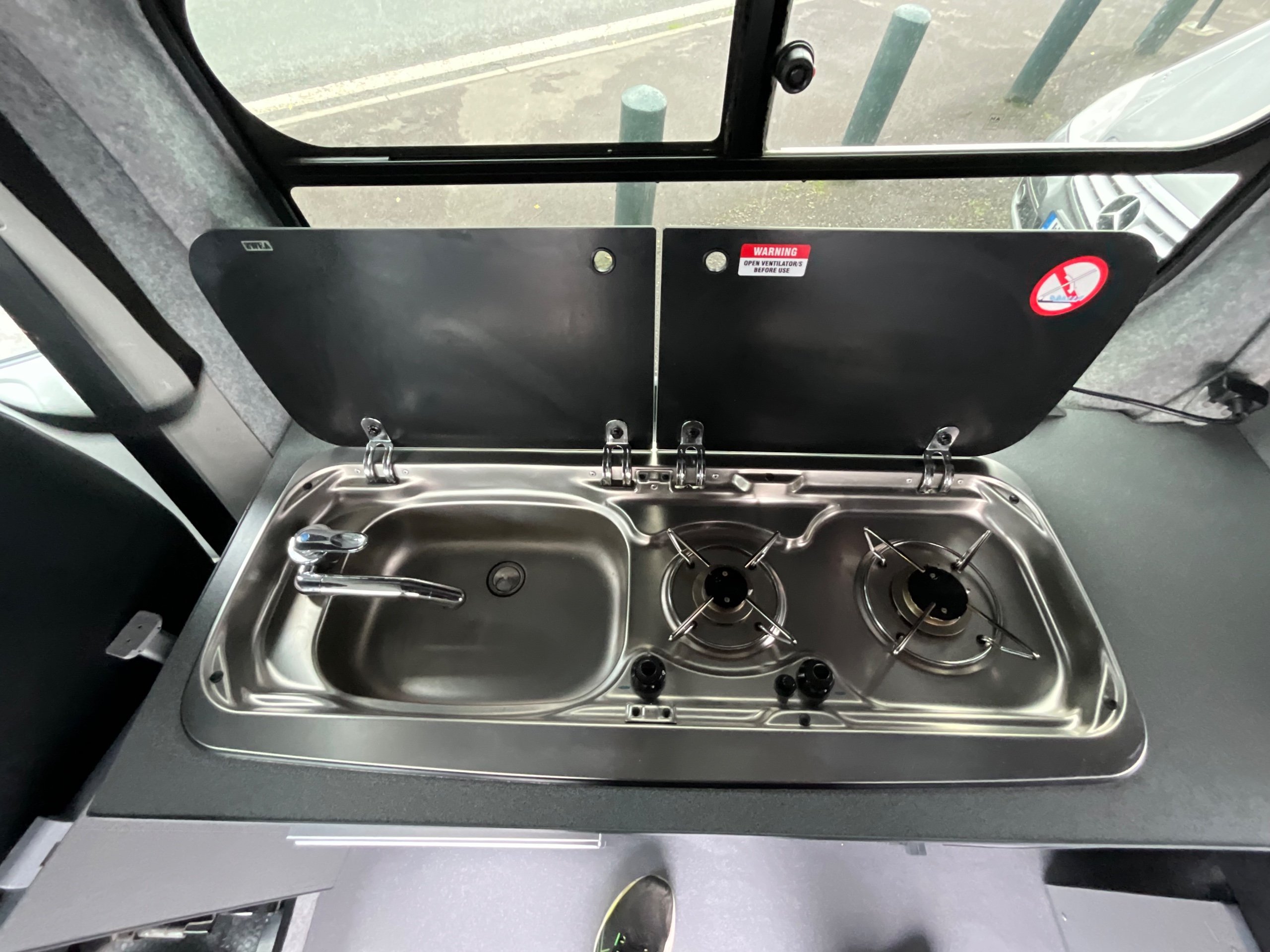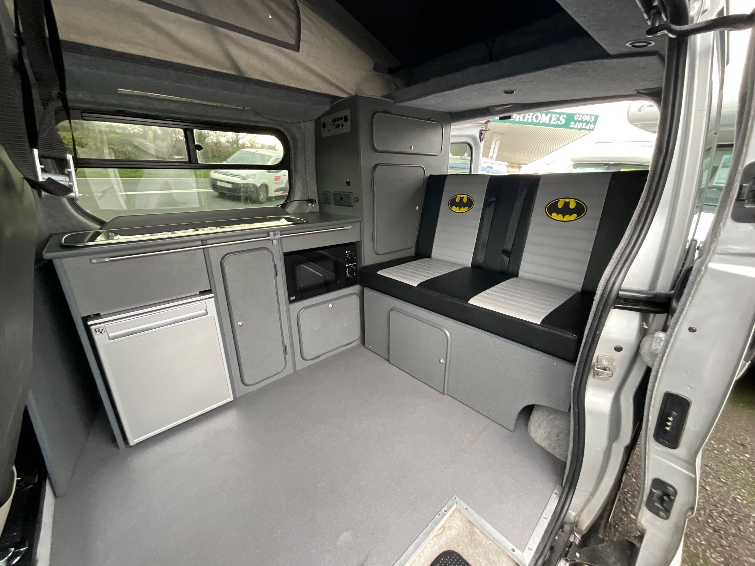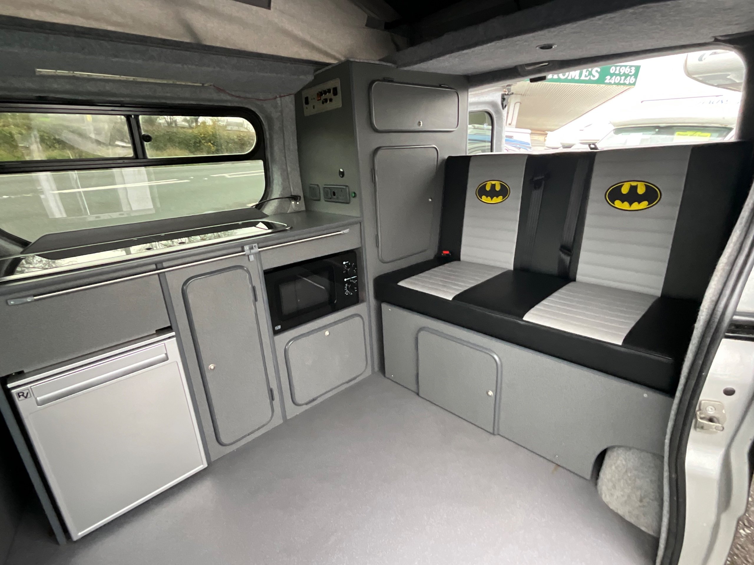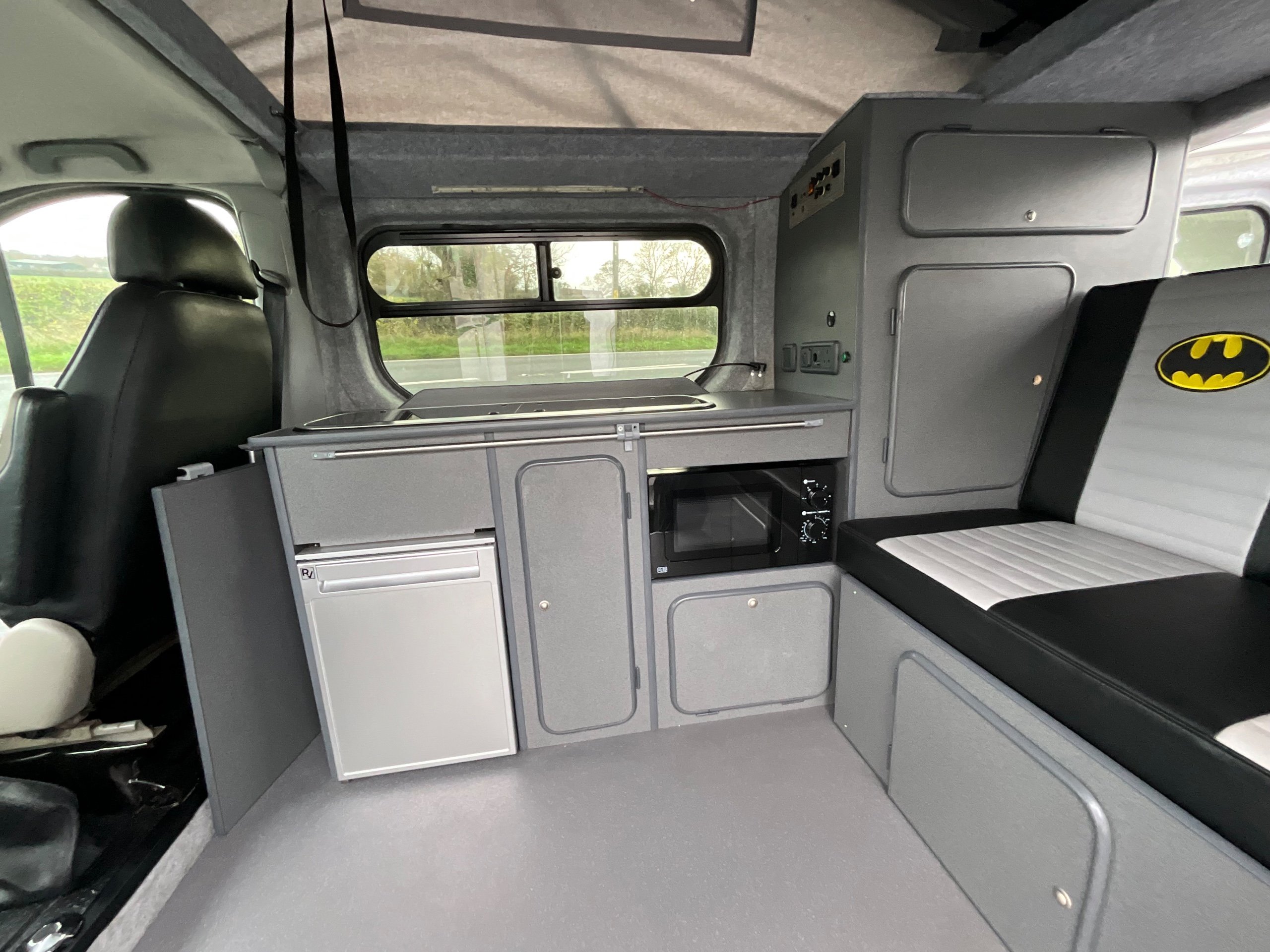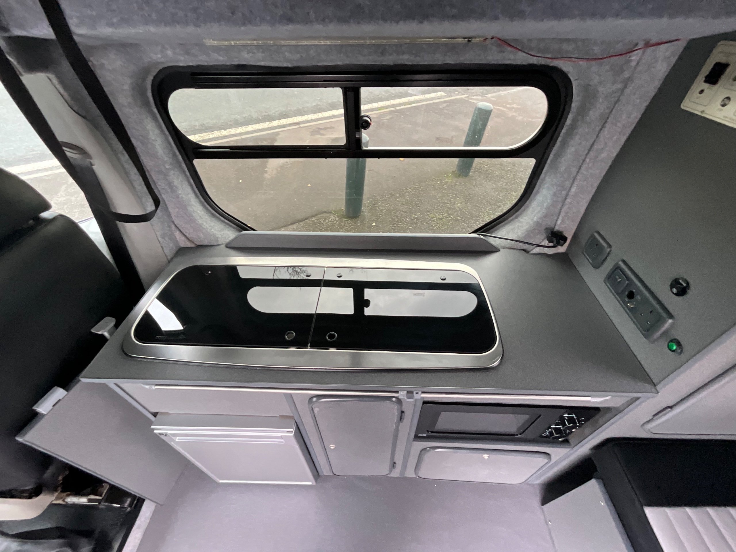 The seats in the back are created out of the crash tested and approved rock ānā roll bed (forming a spacious doubled bed) to have the classic layout inside, while still having the all the standard comforts as well as belted seats, there is also a removeable table. There is also a domestic double gas hob (working off a camping gas bottle), and a sink with an electrical water pump which is connected to a fresh water container along with a 240V microwave. There is also 240V hook up. The van has plenty of storage throughout the motorhome as well.
