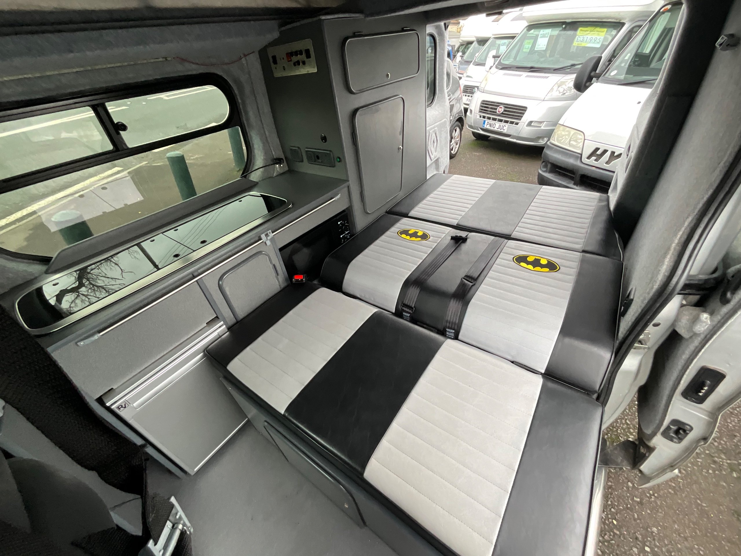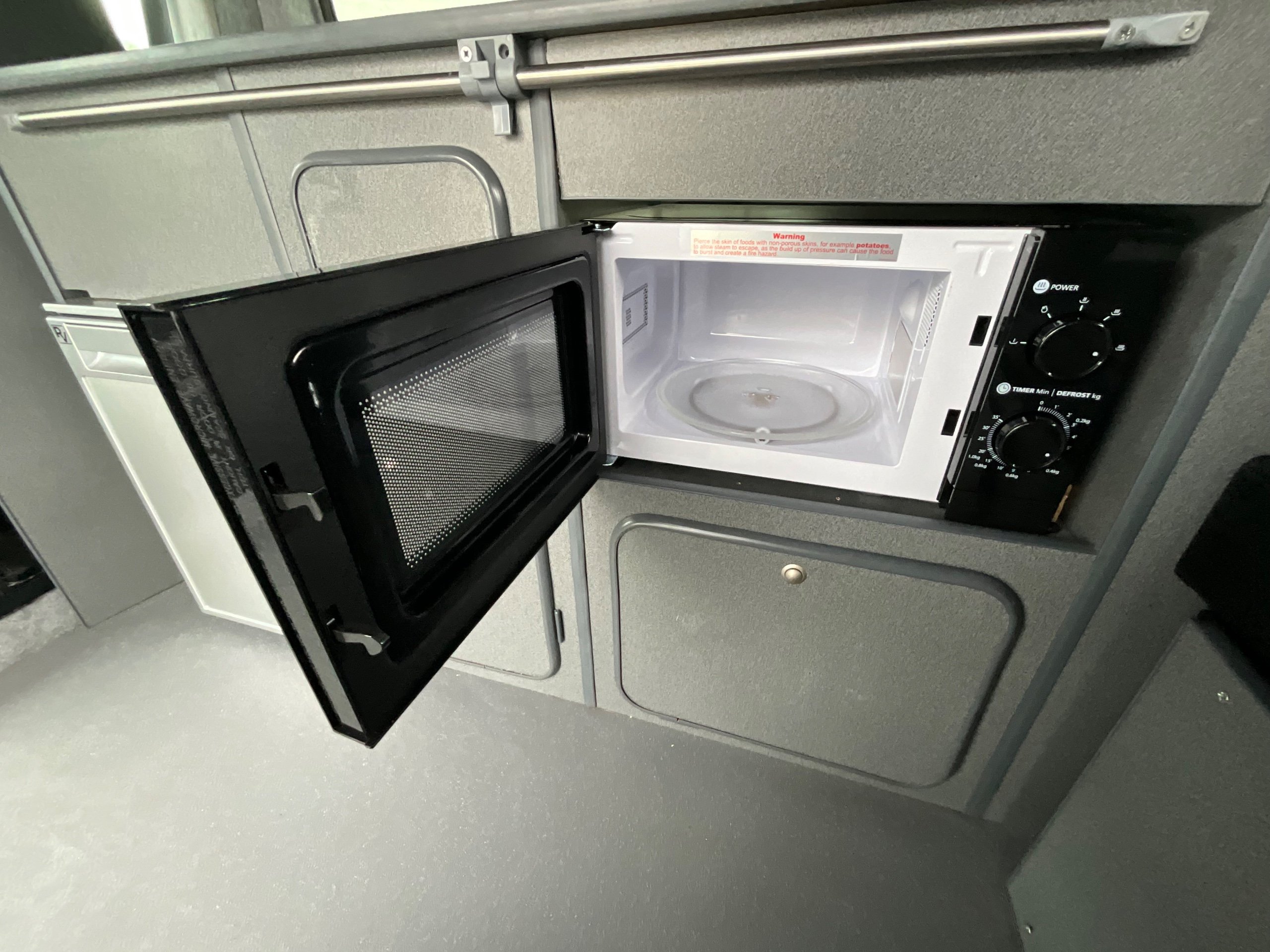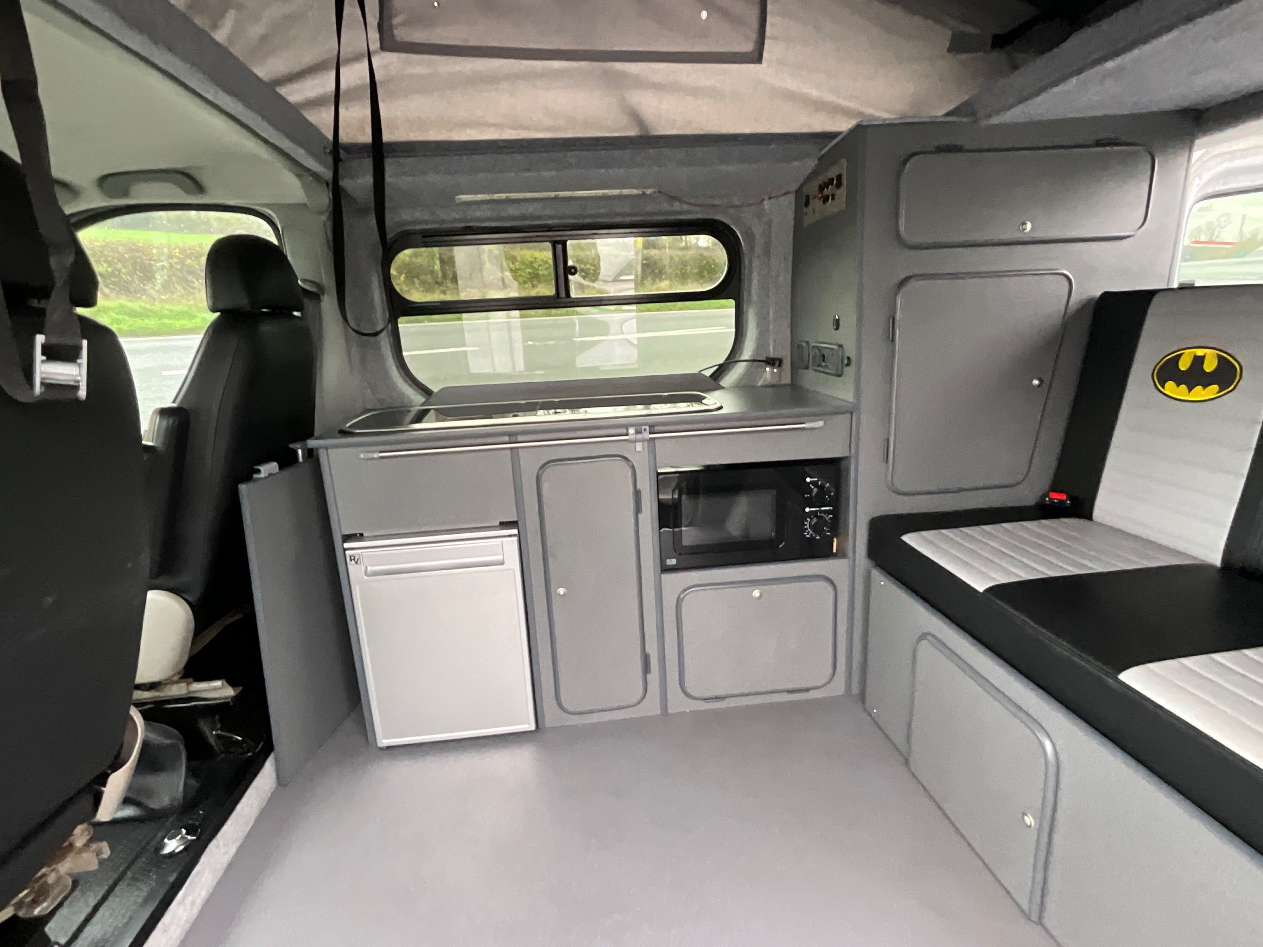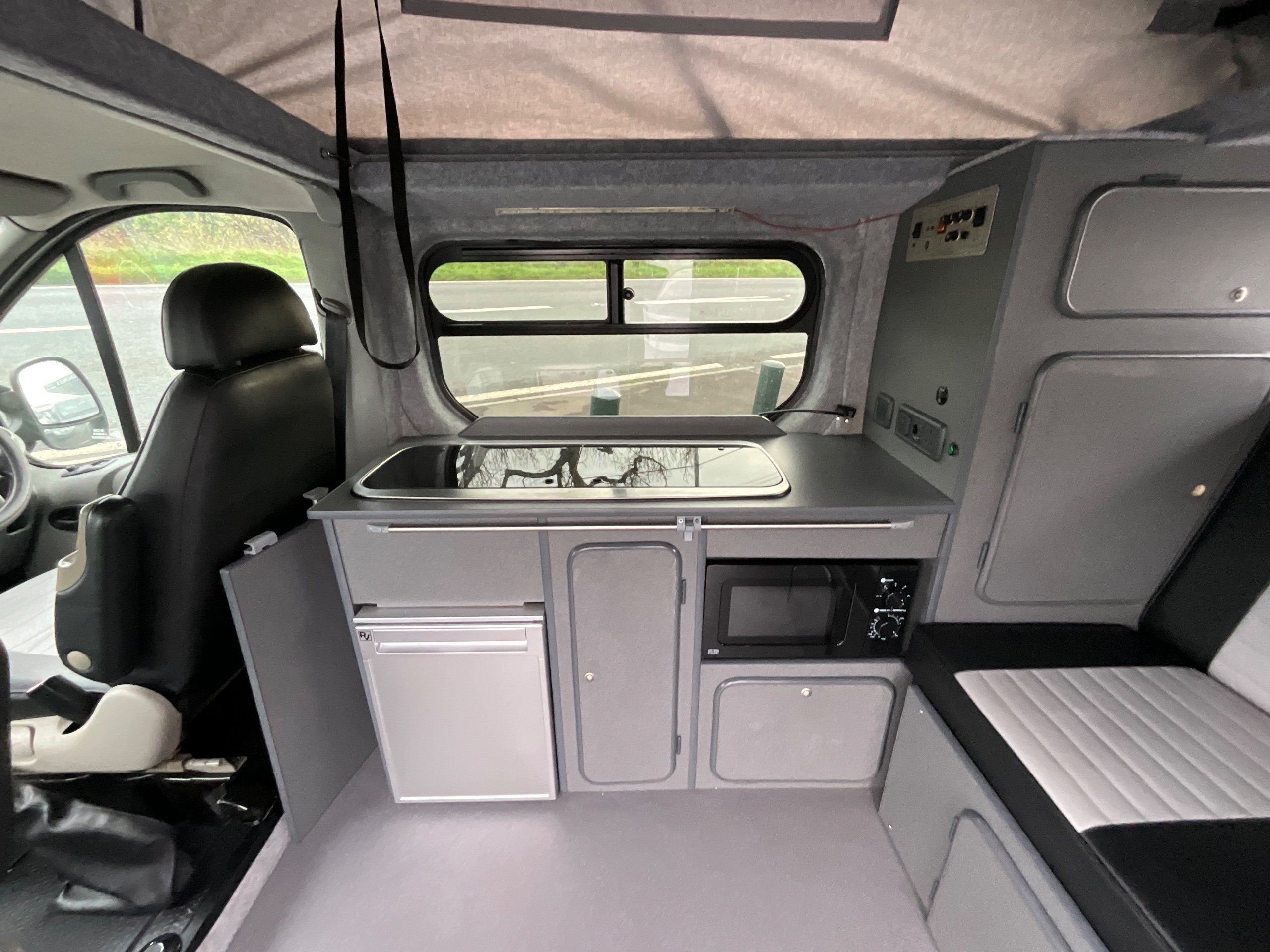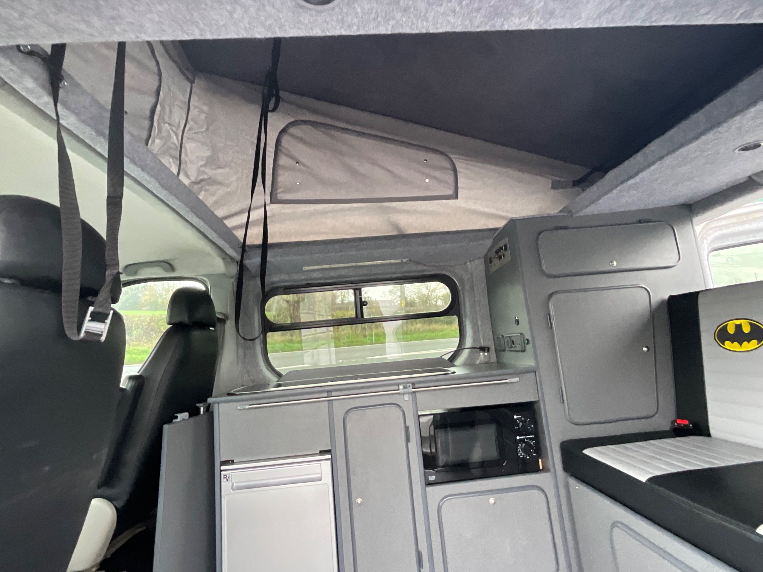 The seats in the back are created out of the crash tested and approved rock ānā roll bed (forming a spacious doubled bed) to have the classic layout inside, while still having the all the standard comforts as well as belted seats, there is also a removeable table. There is also a domestic double gas hob (working off a camping gas bottle), and a sink with an electrical water pump which is connected to a fresh water container along with a 240V microwave. There is also 240V hook up. The van has plenty of storage throughout the motorhome as well.
