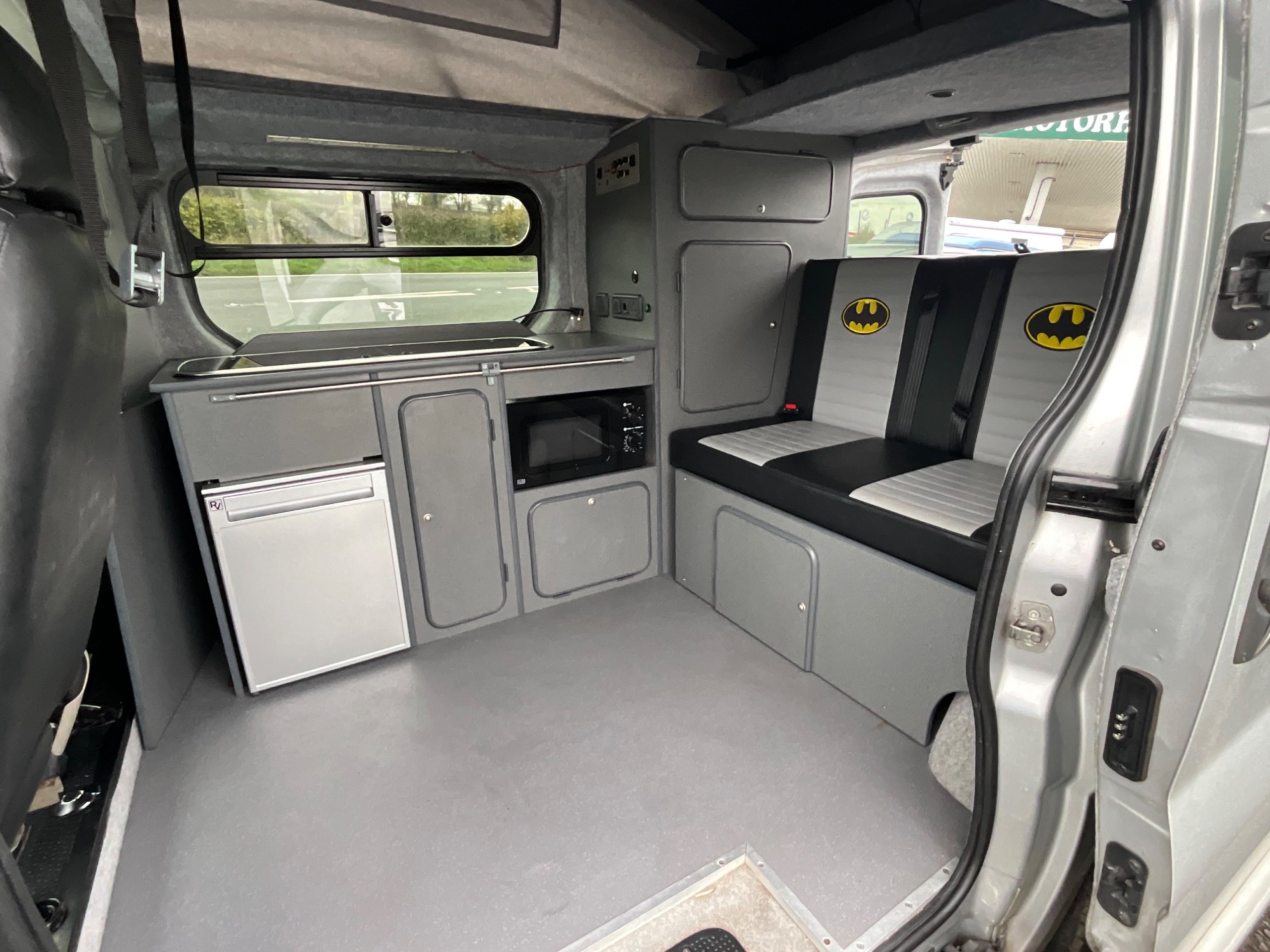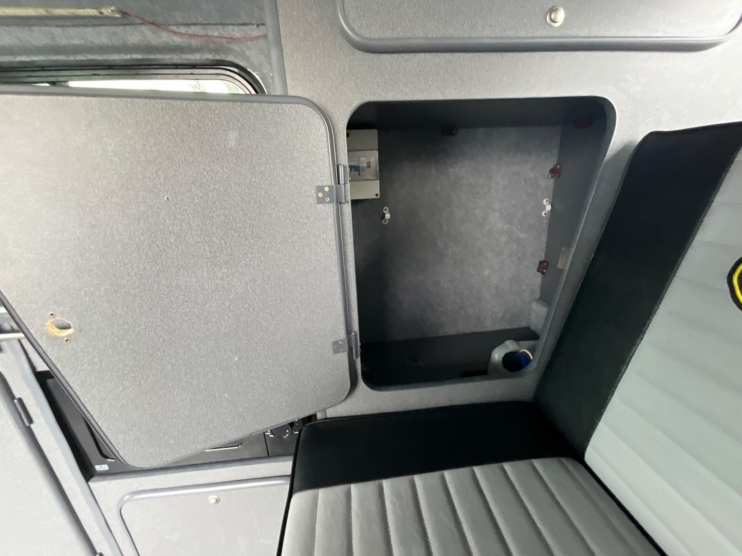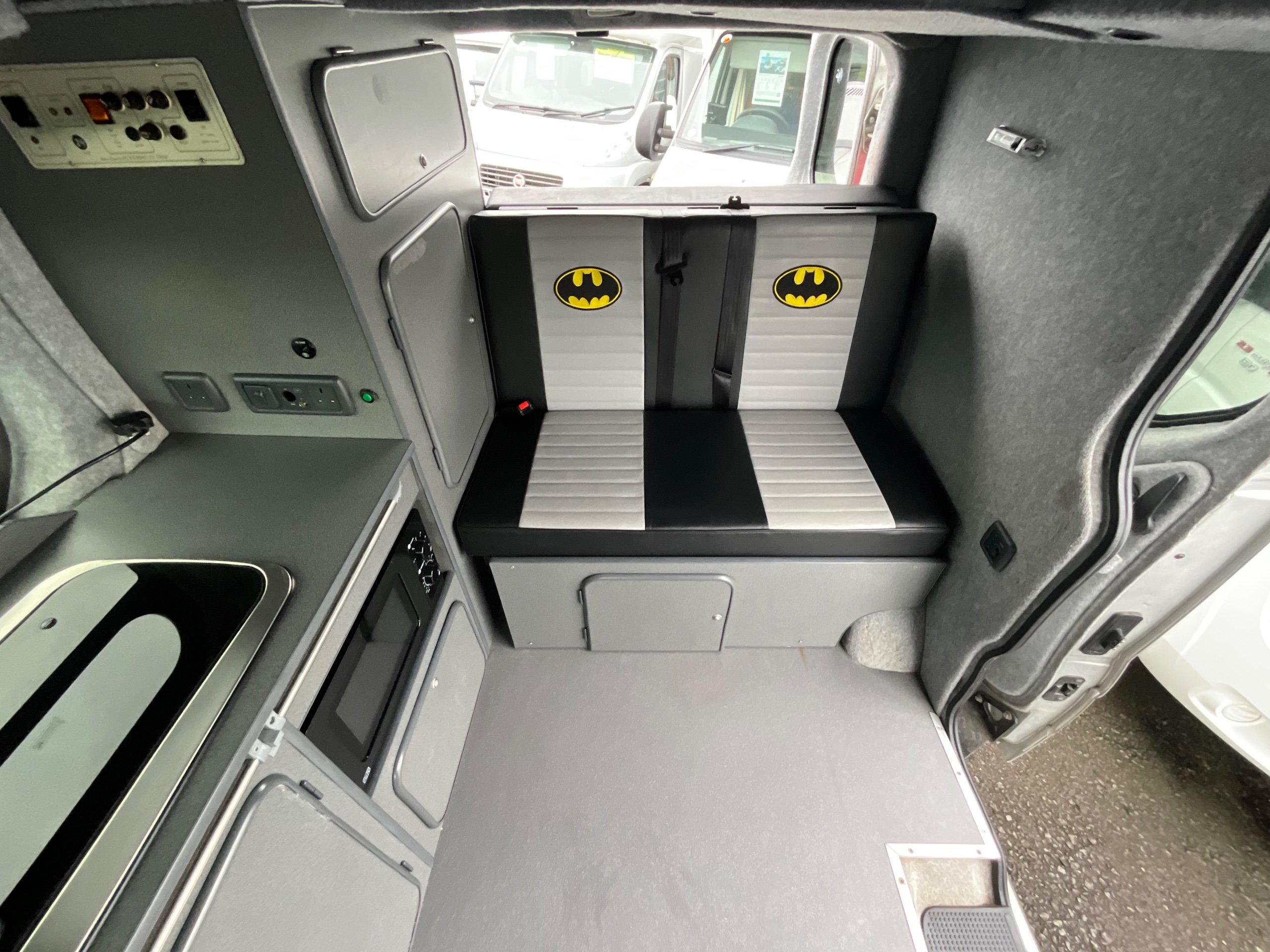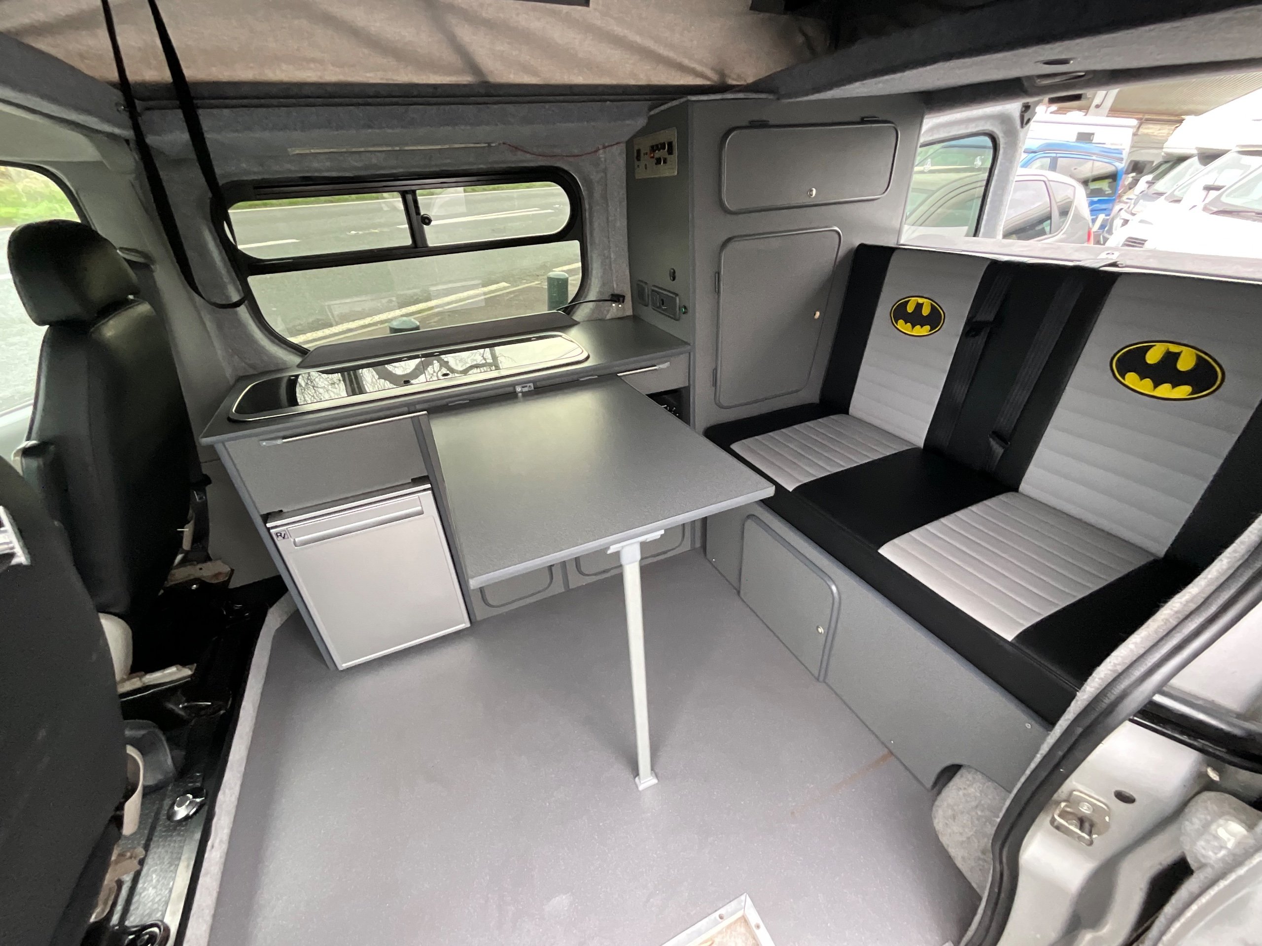 The seats in the back are created out of the crash tested and approved rock ānā roll bed (forming a spacious doubled bed) to have the classic layout inside, while still having the all the standard comforts as well as belted seats, there is also a removeable table. There is also a domestic double gas hob (working off a camping gas bottle), and a sink with an electrical water pump which is connected to a fresh water container along with a 240V microwave. There is also 240V hook up. The van has plenty of storage throughout the motorhome as well.