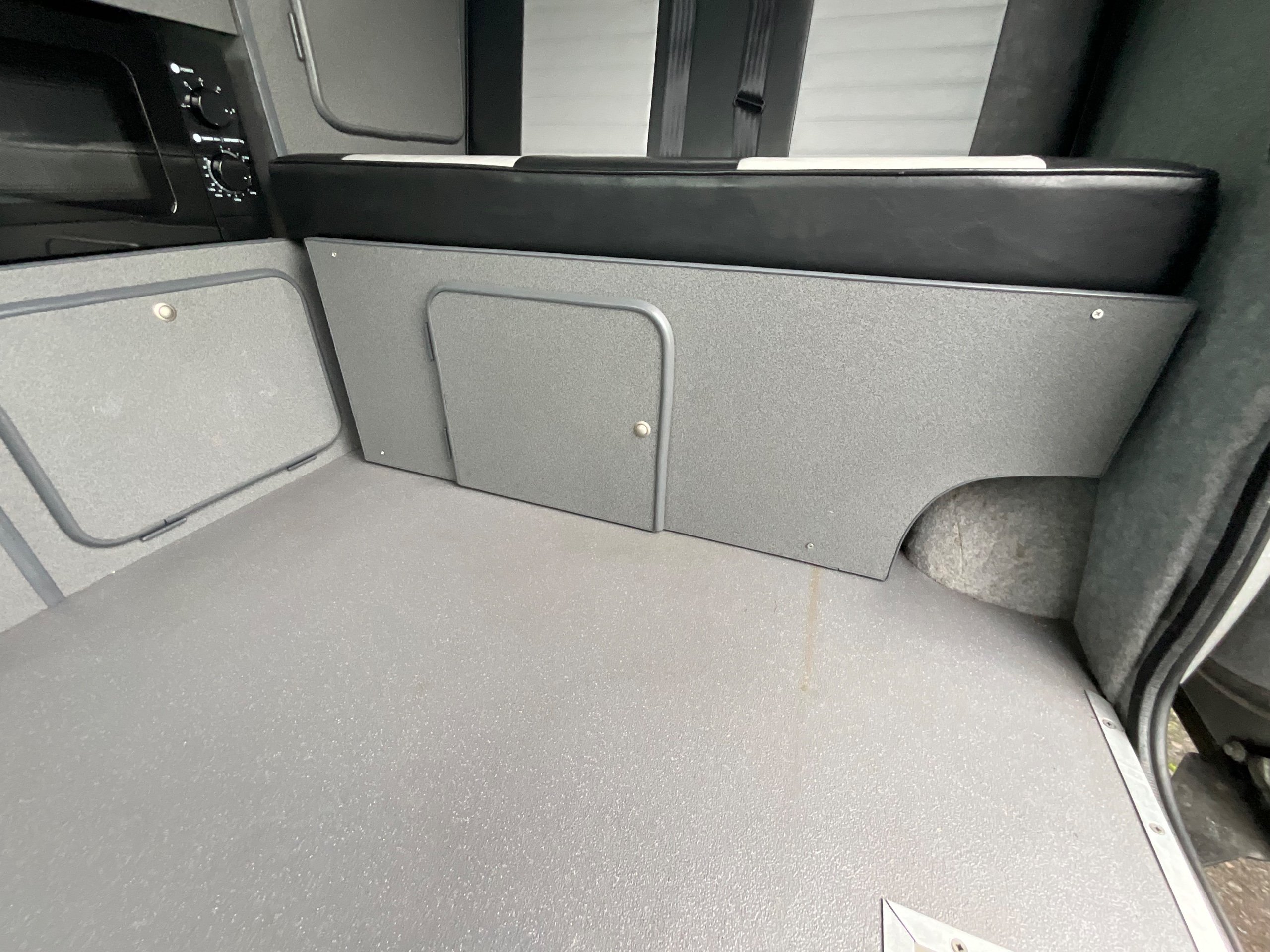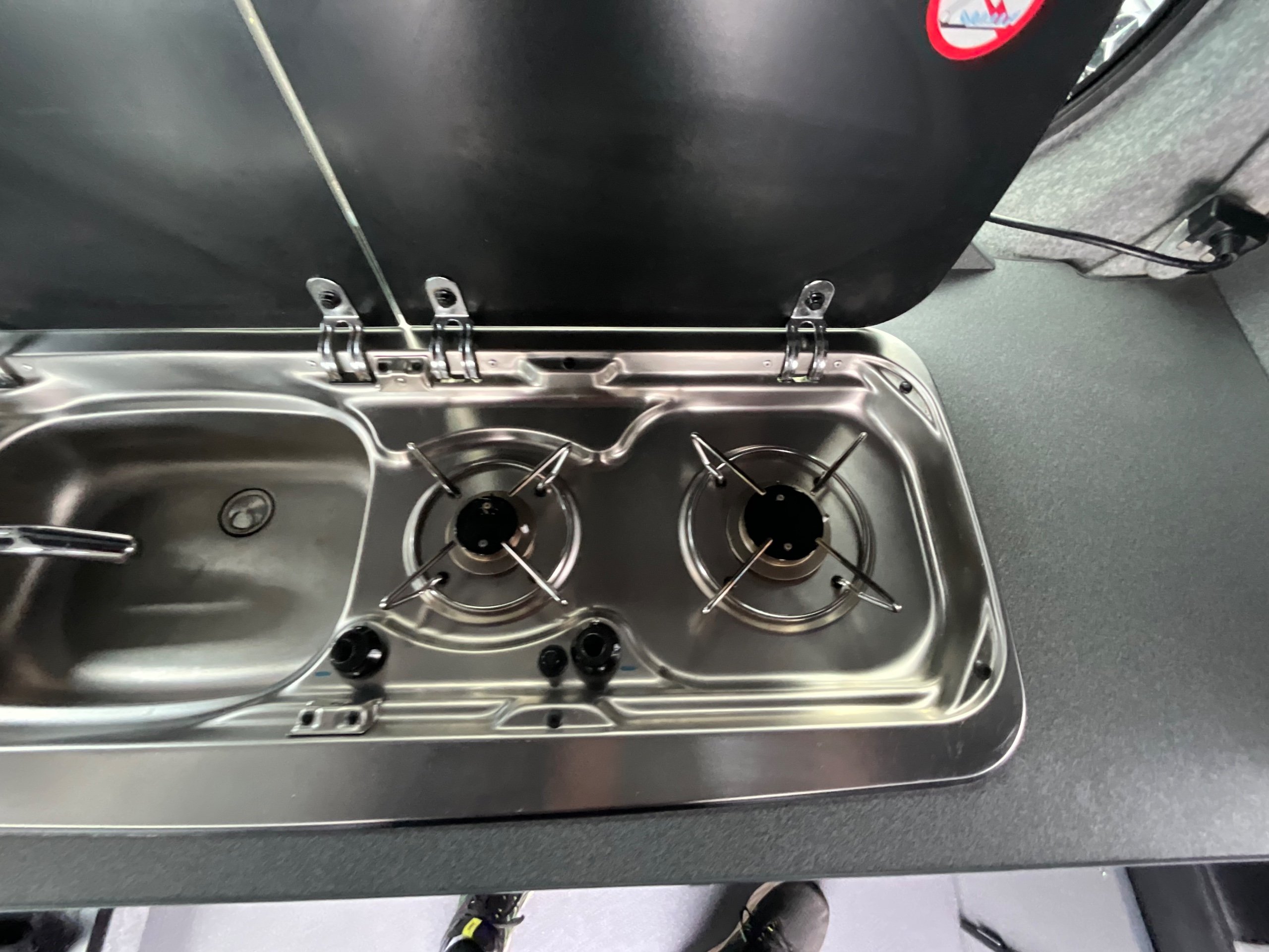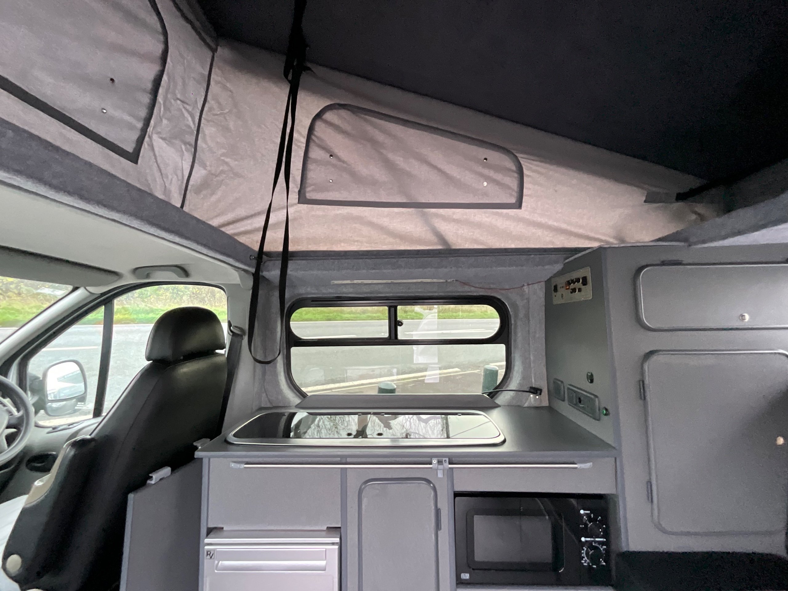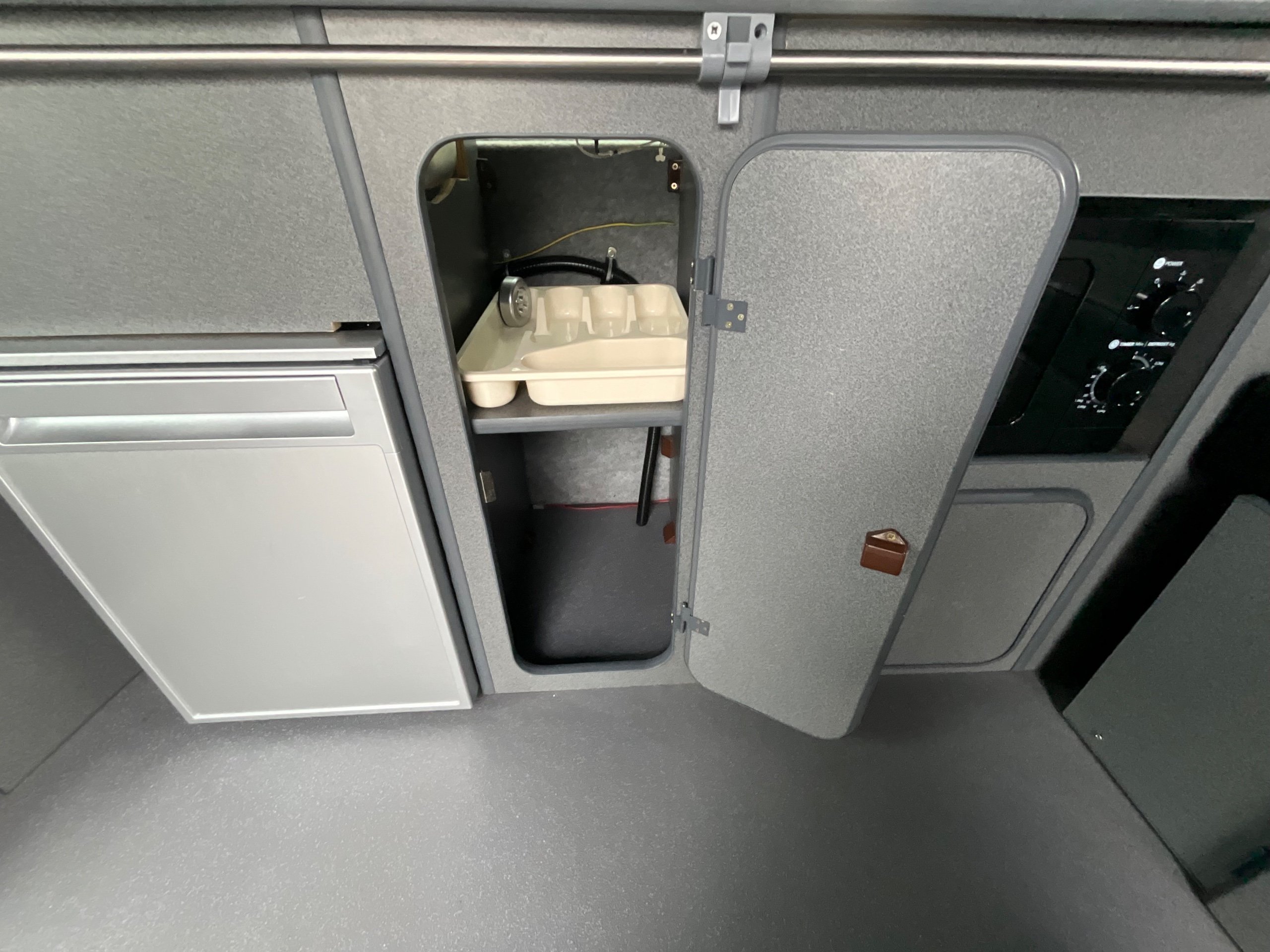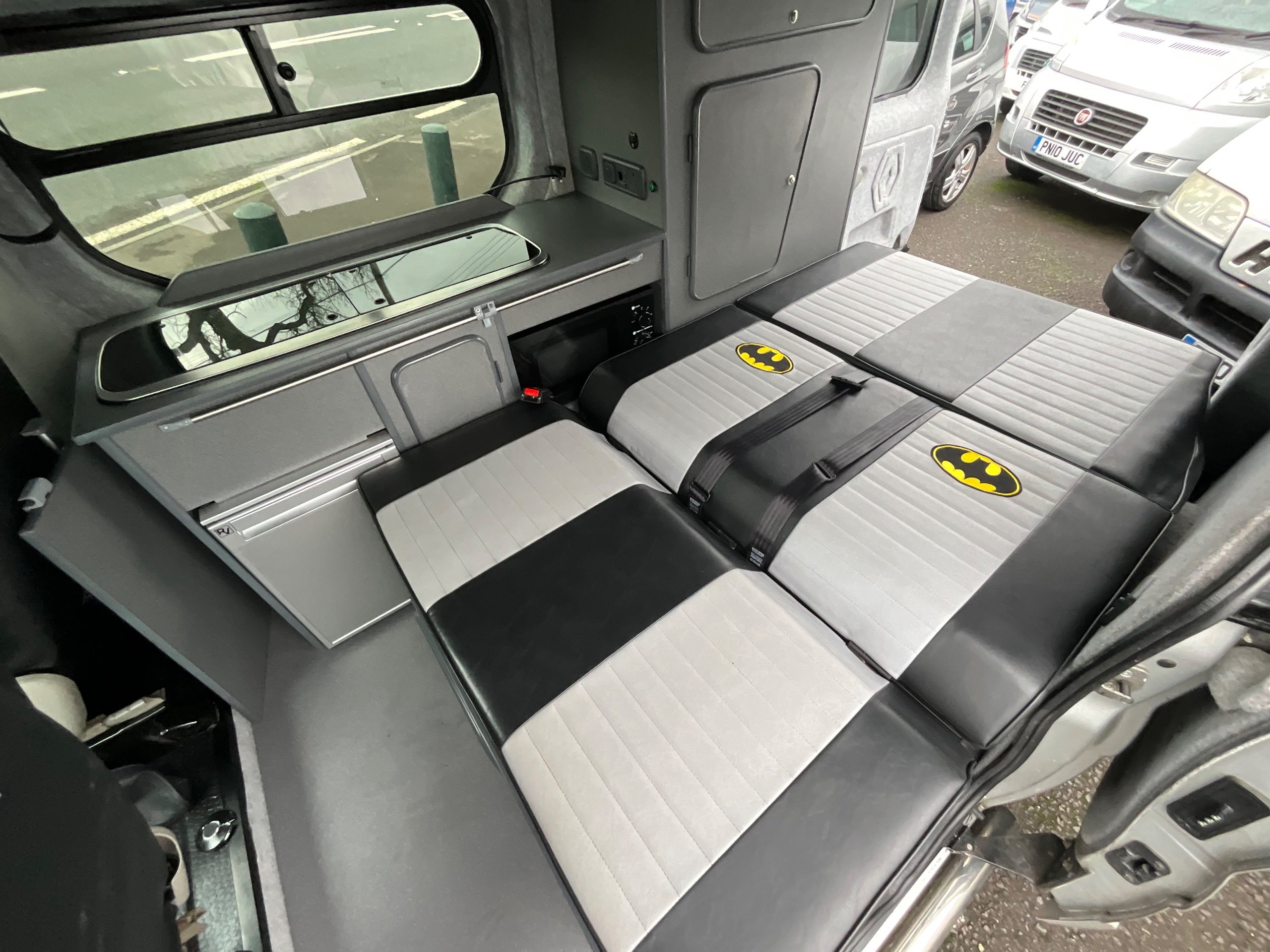 The seats in the back are created out of the crash tested and approved rock ānā roll bed (forming a spacious doubled bed) to have the classic layout inside, while still having the all the standard comforts as well as belted seats, there is also a removeable table. There is also a domestic double gas hob (working off a camping gas bottle), and a sink with an electrical water pump which is connected to a fresh water container along with a 240V microwave. There is also 240V hook up. The van has plenty of storage throughout the motorhome as well.