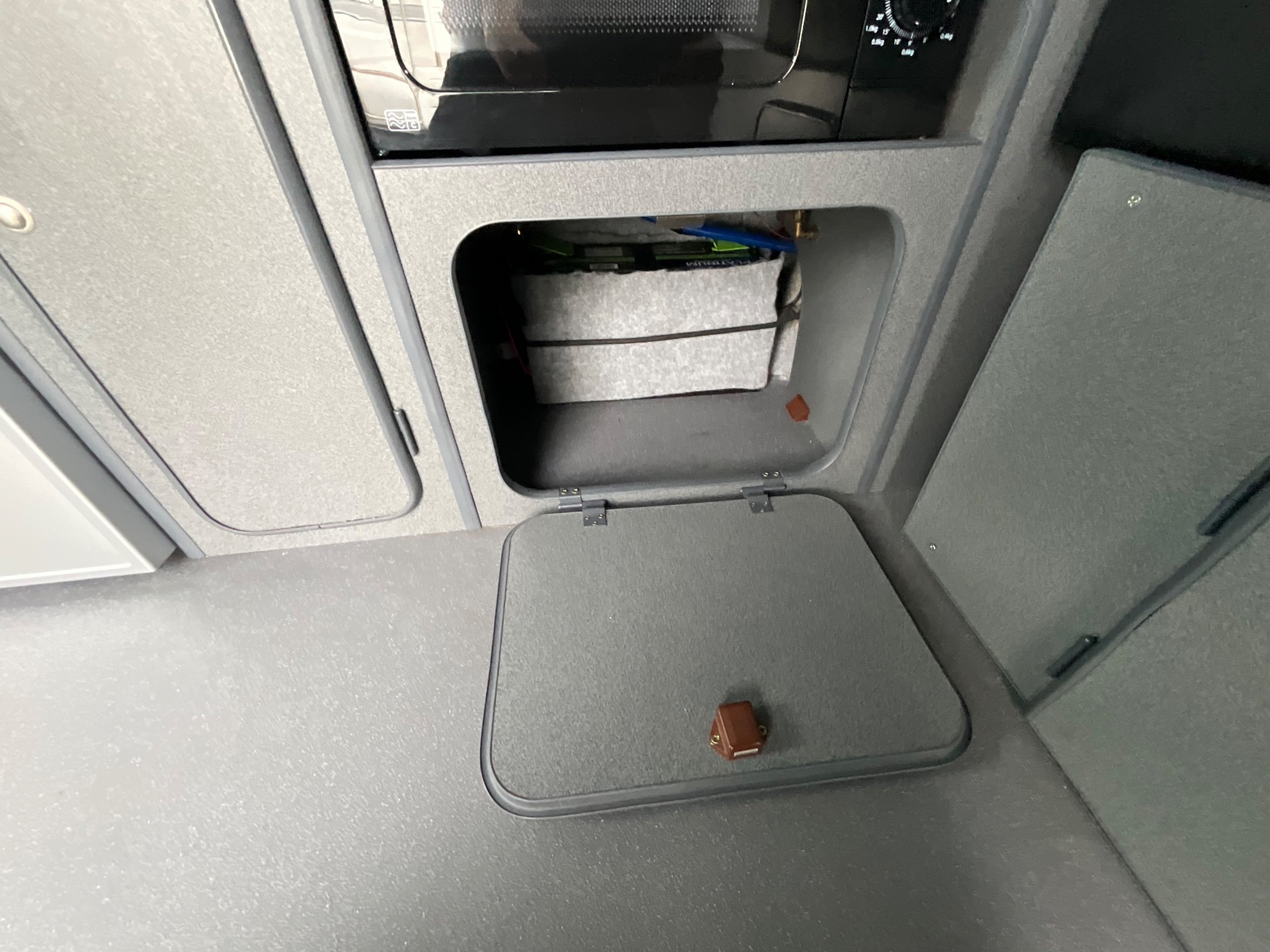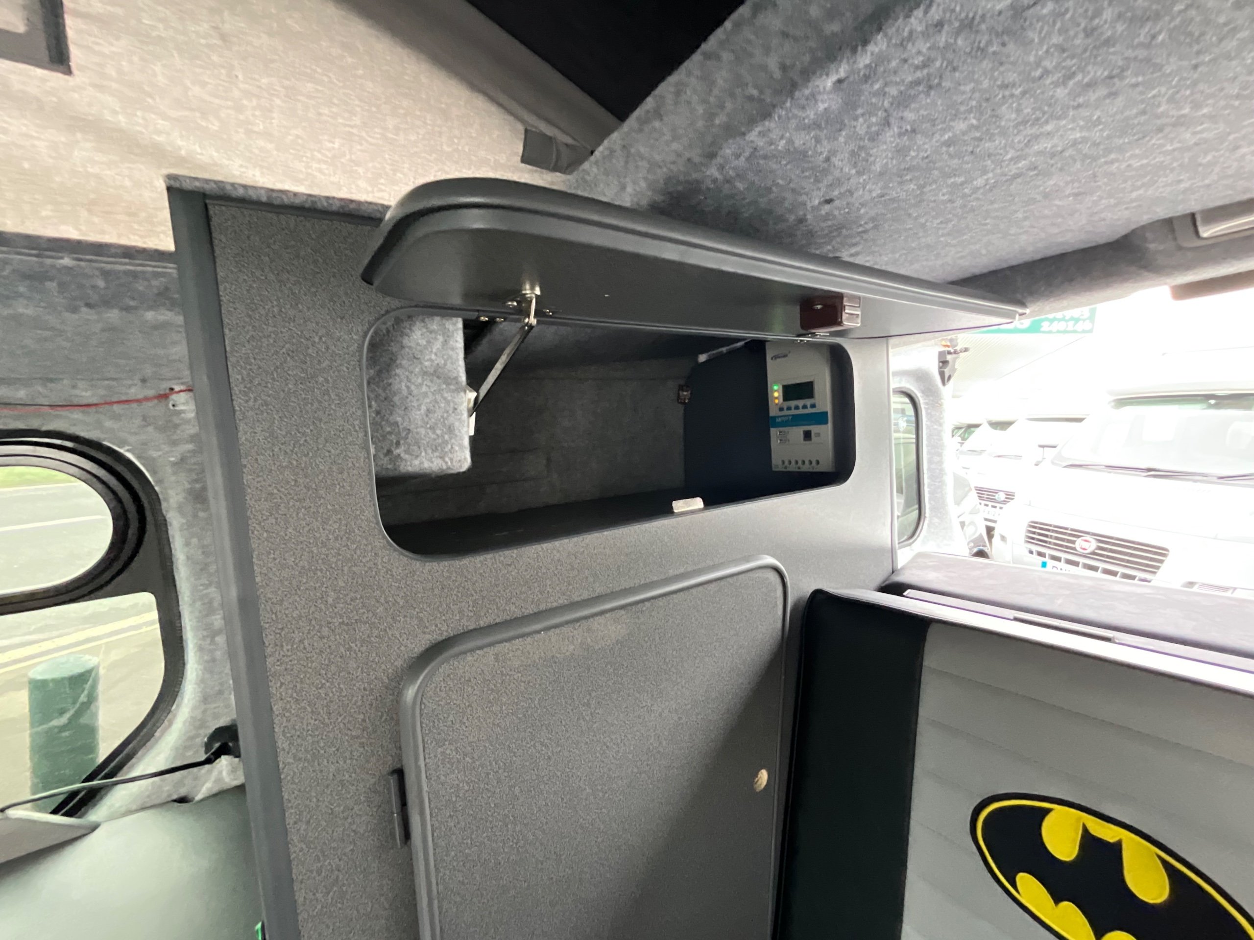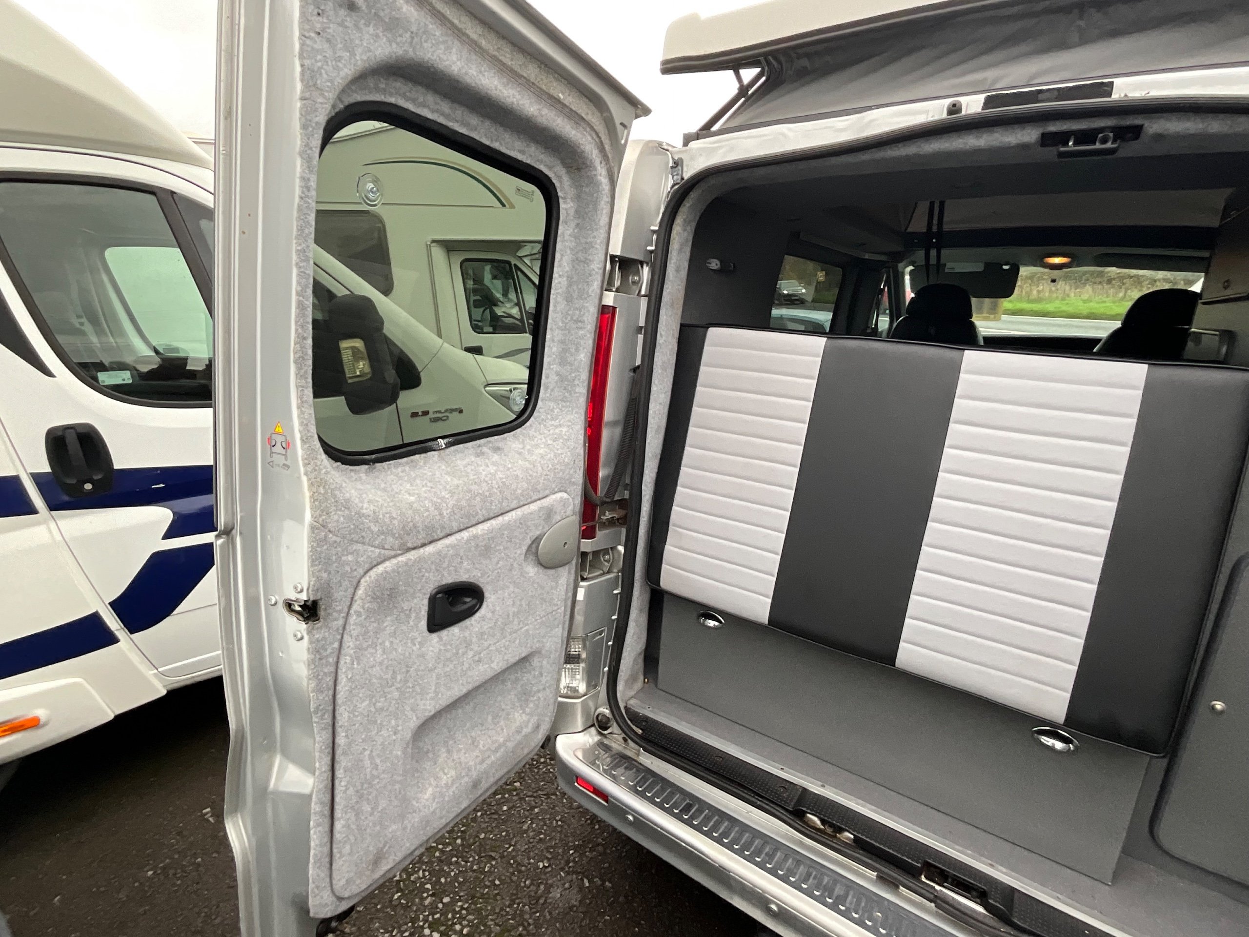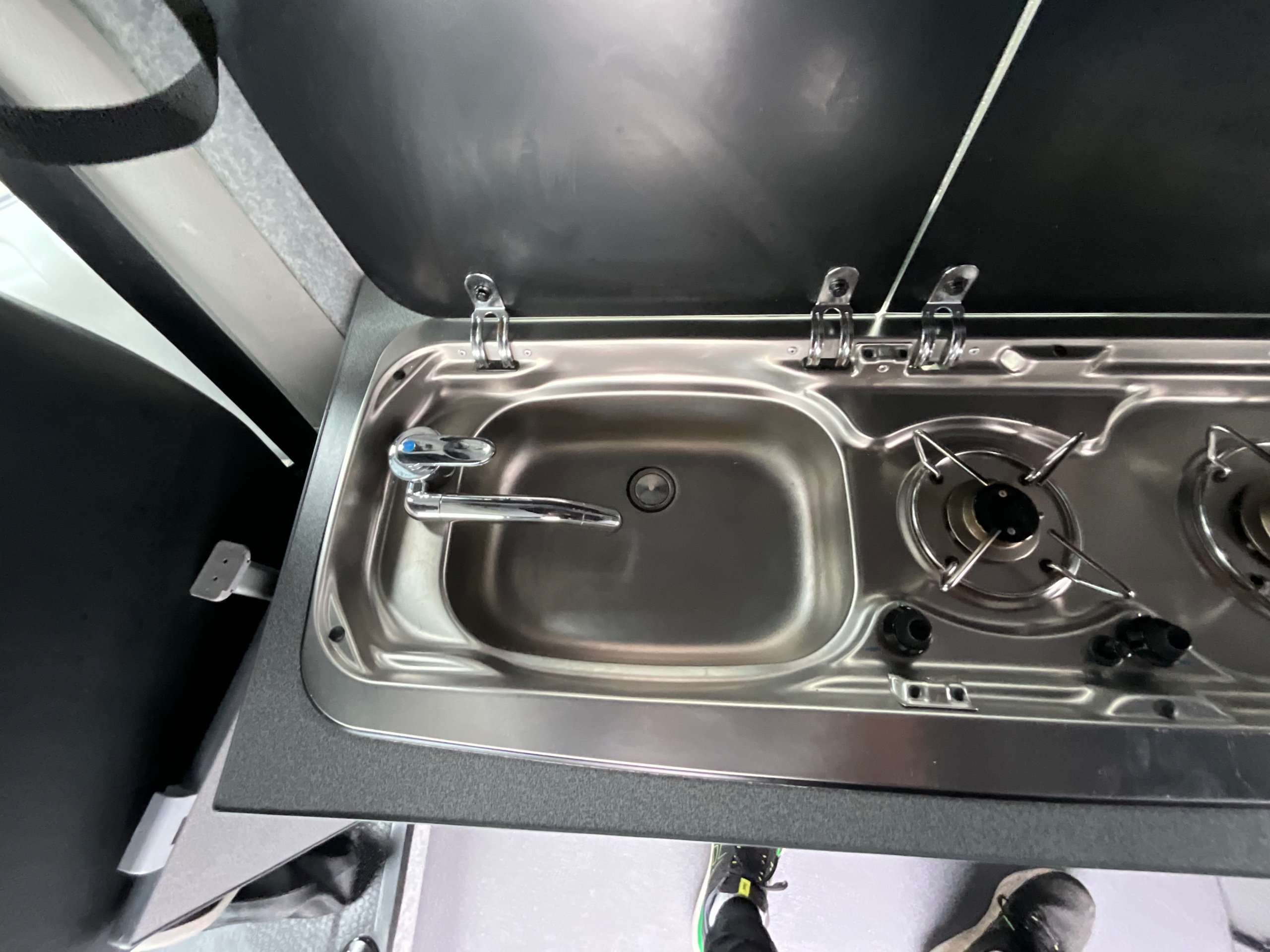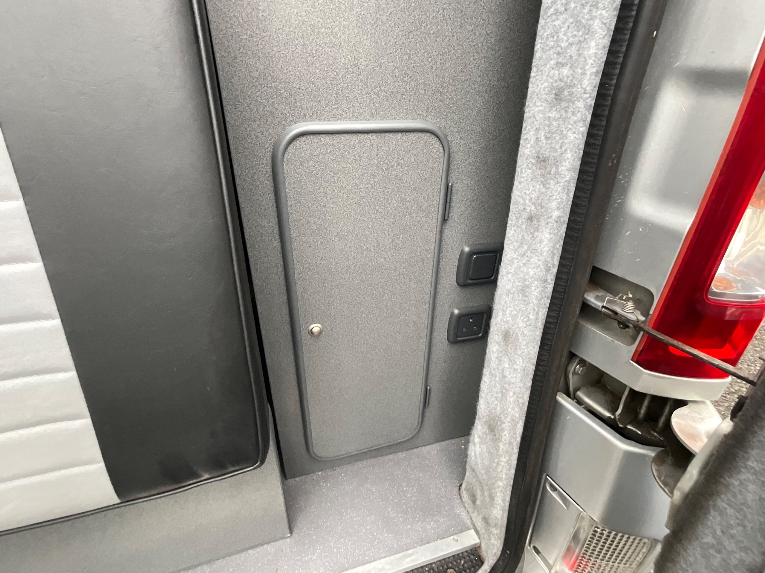 The seats in the back are created out of the crash tested and approved rock ānā roll bed (forming a spacious doubled bed) to have the classic layout inside, while still having the all the standard comforts as well as belted seats, there is also a removeable table. There is also a domestic double gas hob (working off a camping gas bottle), and a sink with an electrical water pump which is connected to a fresh water container along with a 240V microwave. There is also 240V hook up. The van has plenty of storage throughout the motorhome as well.