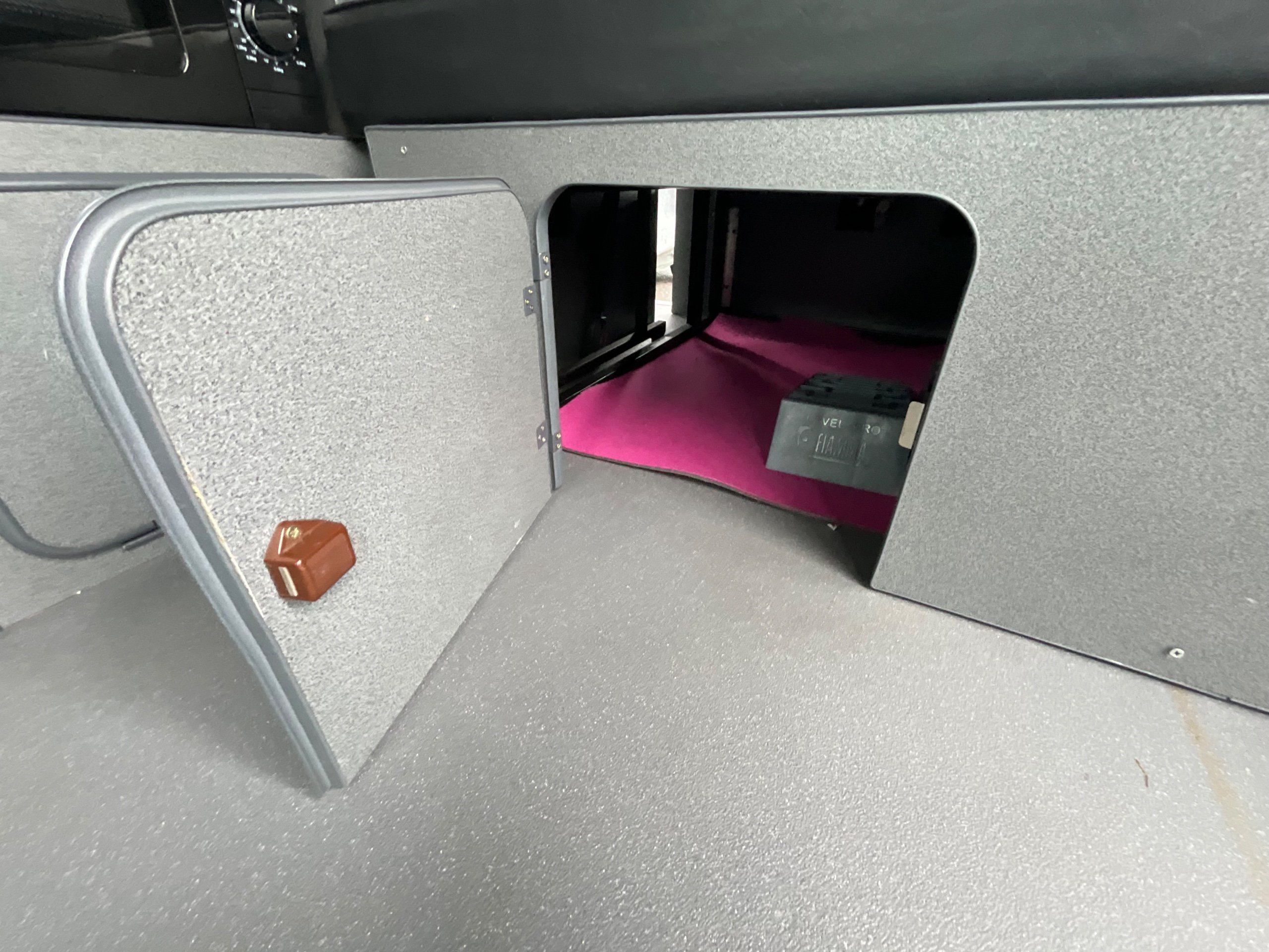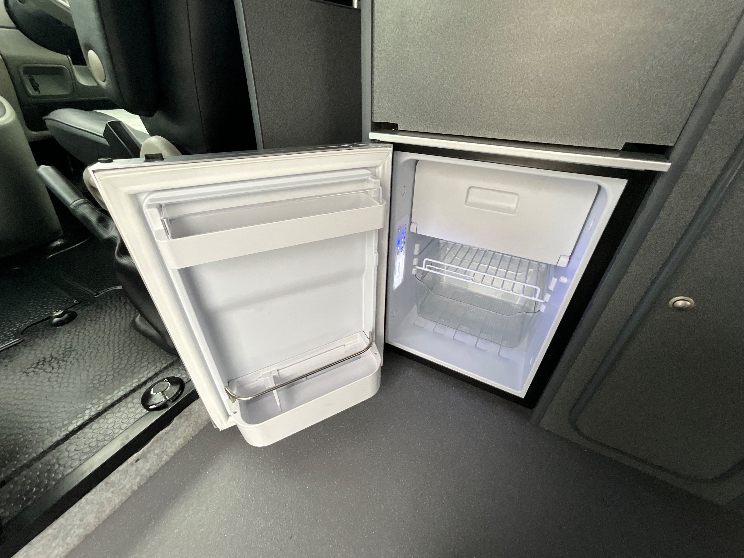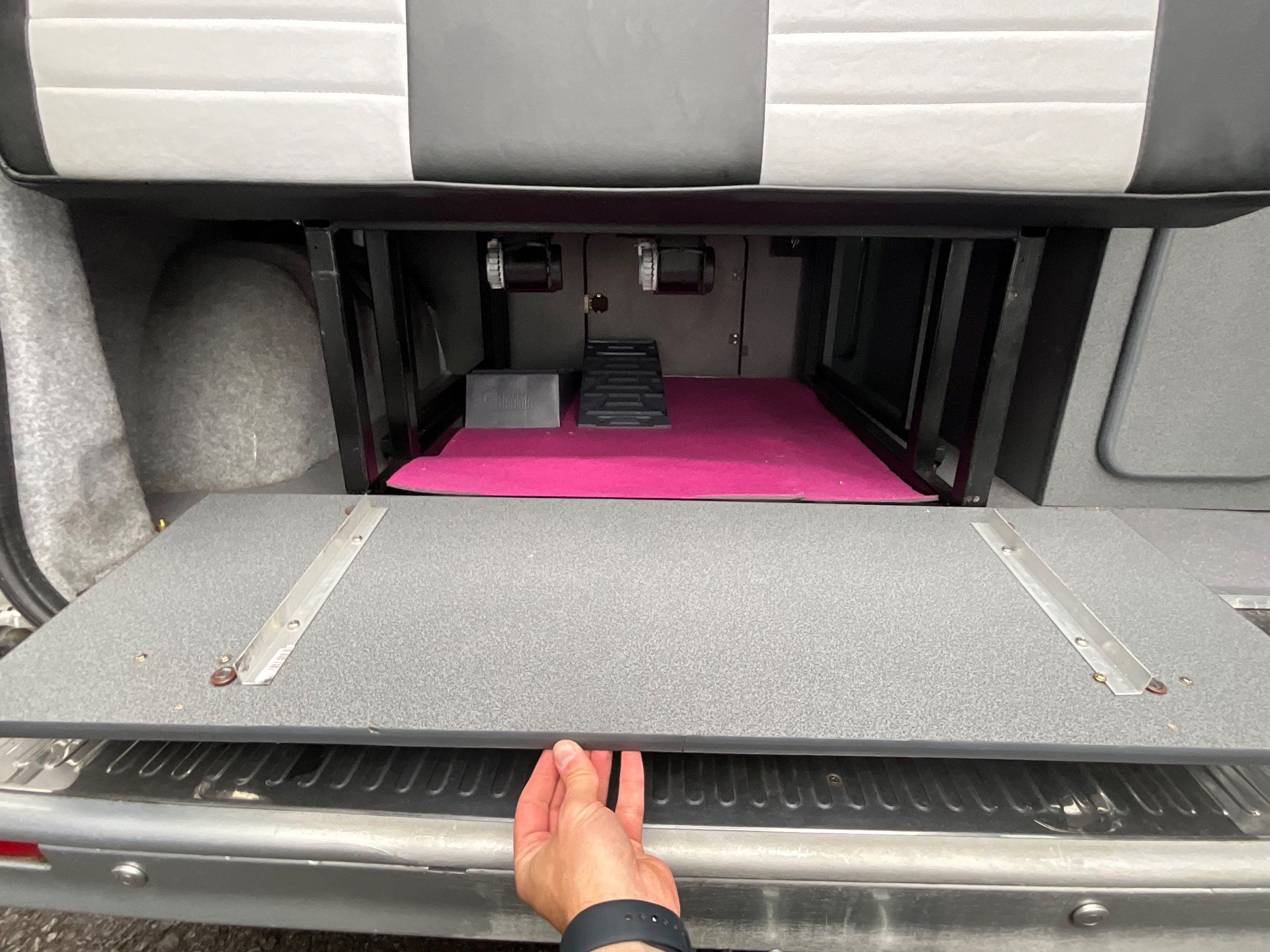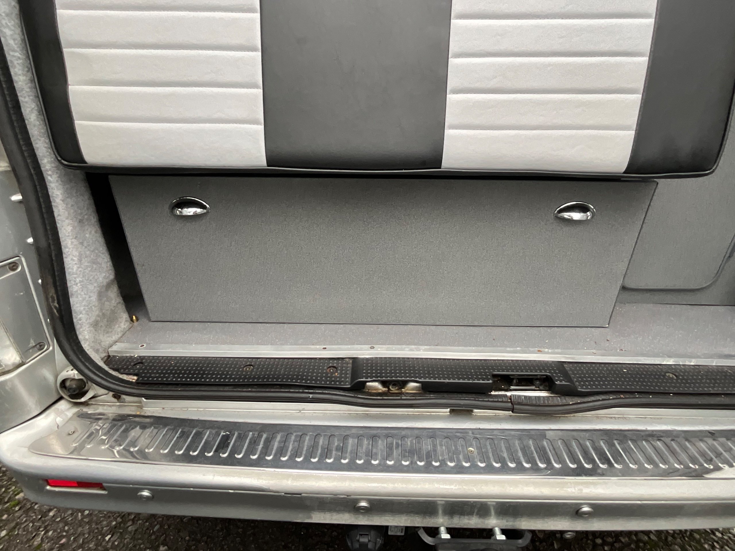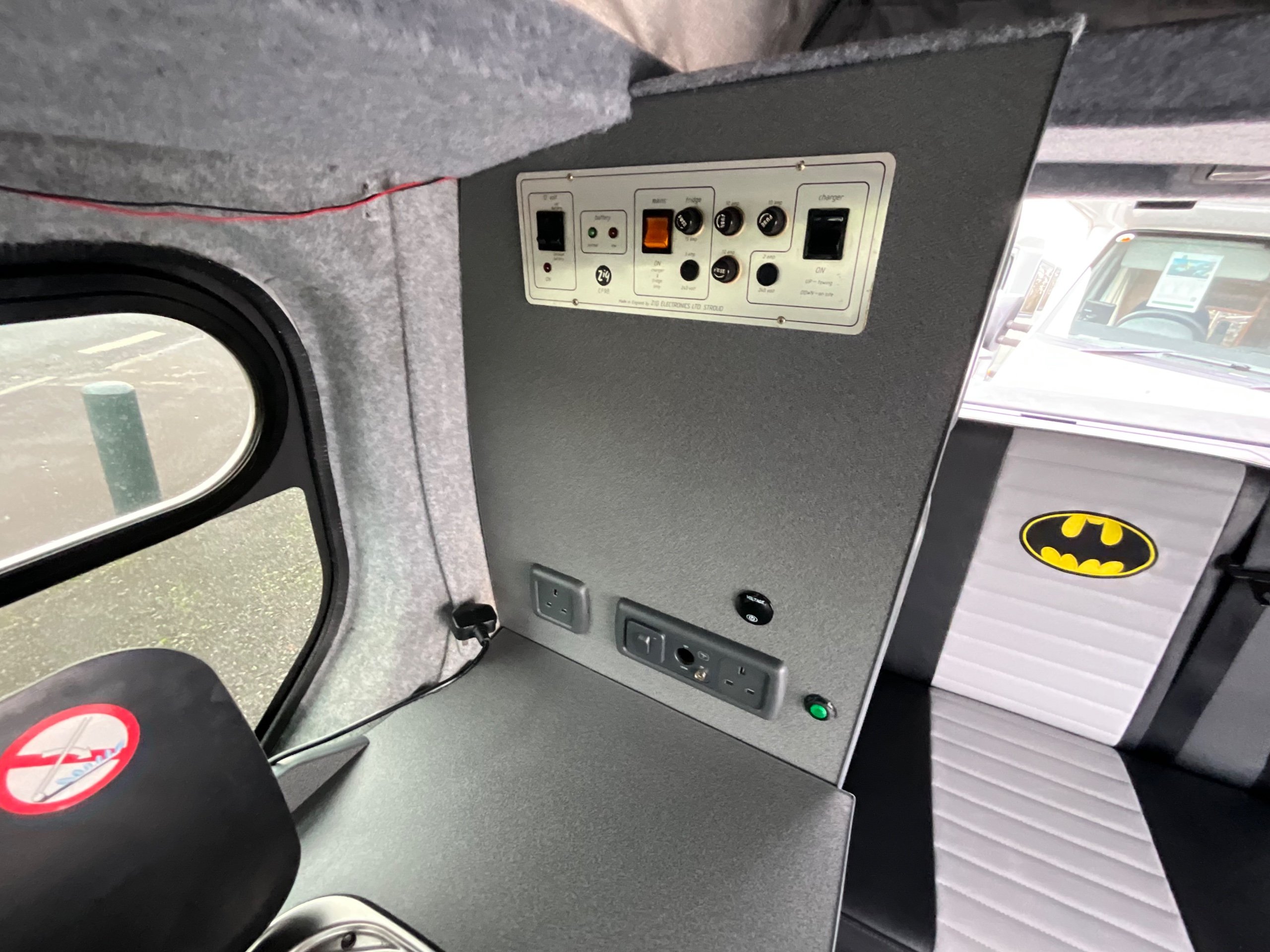 The seats in the back are created out of the crash tested and approved rock ānā roll bed (forming a spacious doubled bed) to have the classic layout inside, while still having the all the standard comforts as well as belted seats, there is also a removeable table. There is also a domestic double gas hob (working off a camping gas bottle), and a sink with an electrical water pump which is connected to a fresh water container along with a 240V microwave. There is also 240V hook up. The van has plenty of storage throughout the motorhome as well.