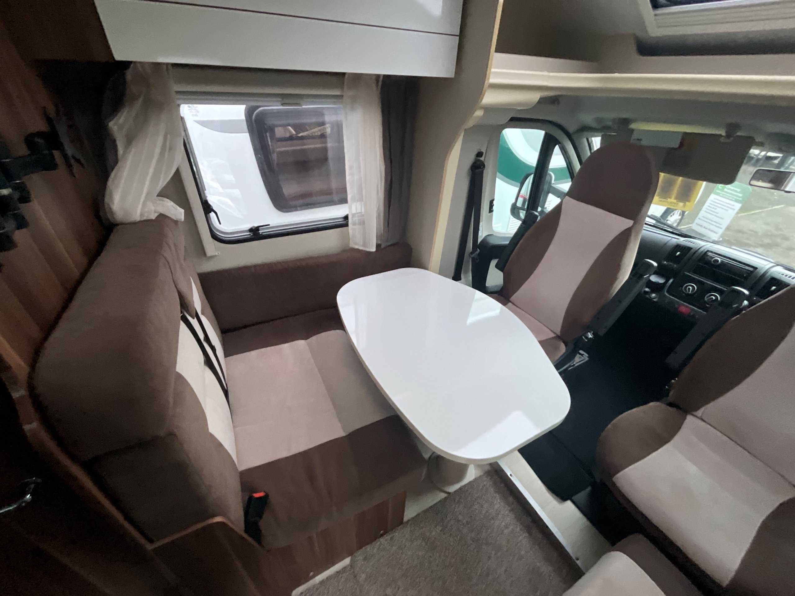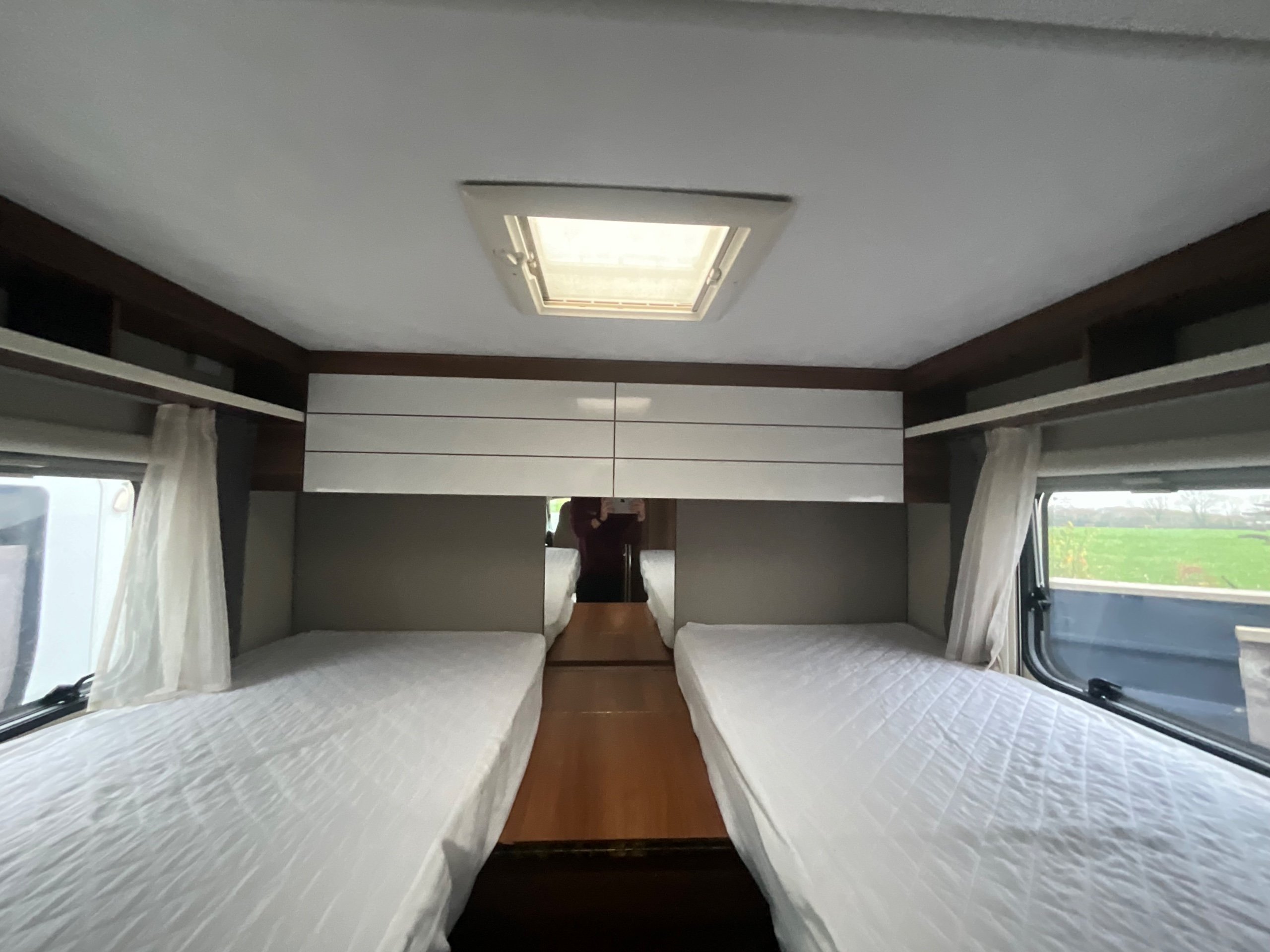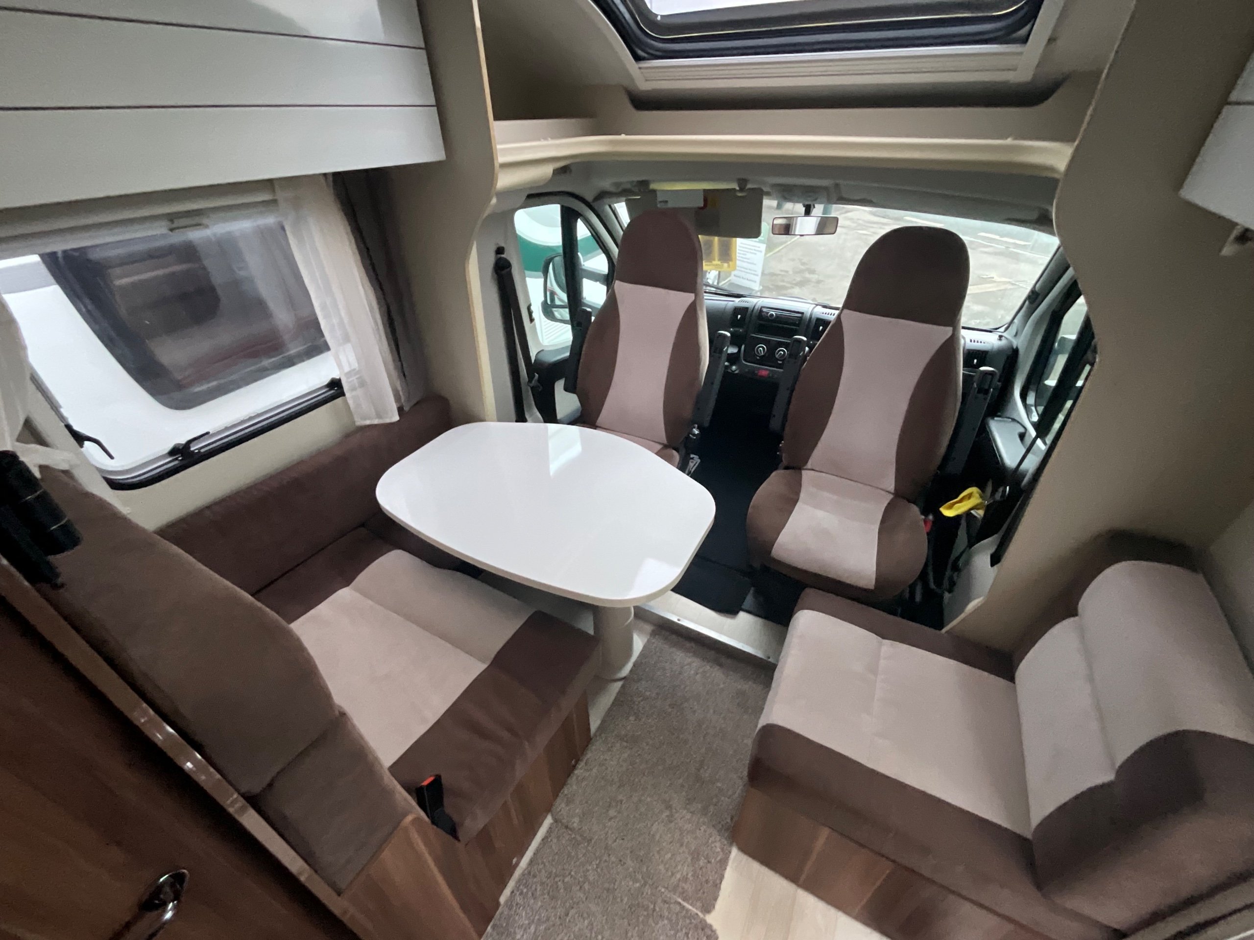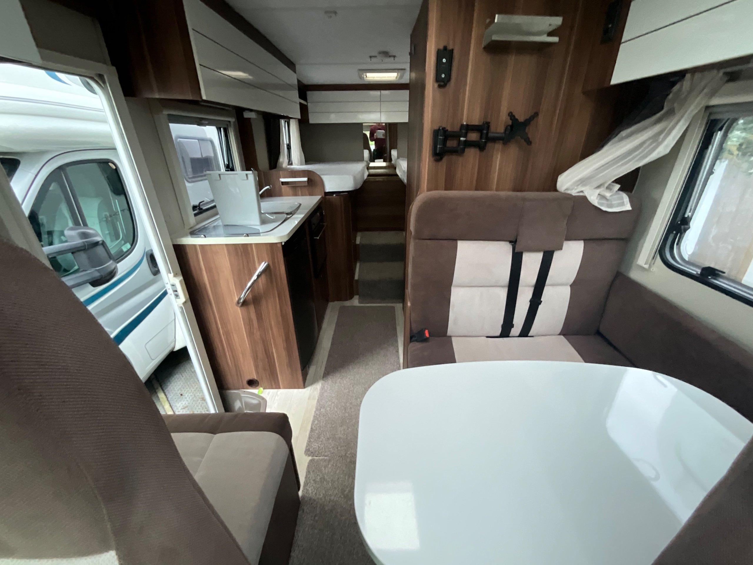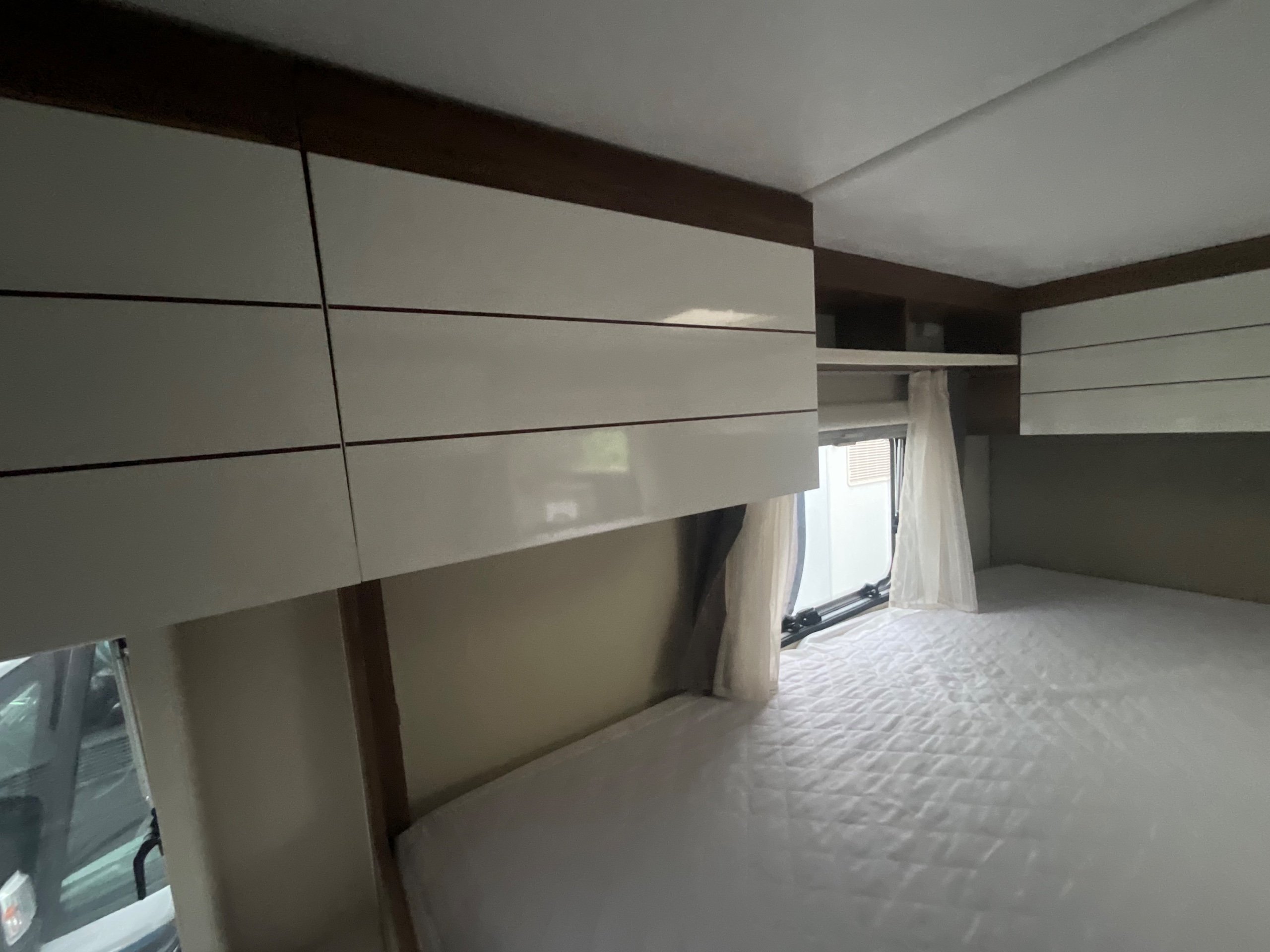 The Rollerteam 685 is a low profile, 4 Berth motorhome with Fixed Rear single Beds (which can form a double bed with the use of extensions and infill cushions) offering plenty of storage underneath the beds themselves, as well as a large garage storage underneath which can be accessed from outside with an external door on both sides. The central seating area offers many flexible options of two travelling seat belts so this Rollerteam can travel with 4 people fully belted in. This can also be a Dinette seating area with the seats (which is where the 2 seat belts are) as well as the small bench seat opposite to use for dinning when parked up with the table having sliding mechanisms to allow it to move when needed. This area can be enhanced further with both front seats having swivelling mechanisms to enlarge the seating area for dinning. Above the cab area is extra storage.