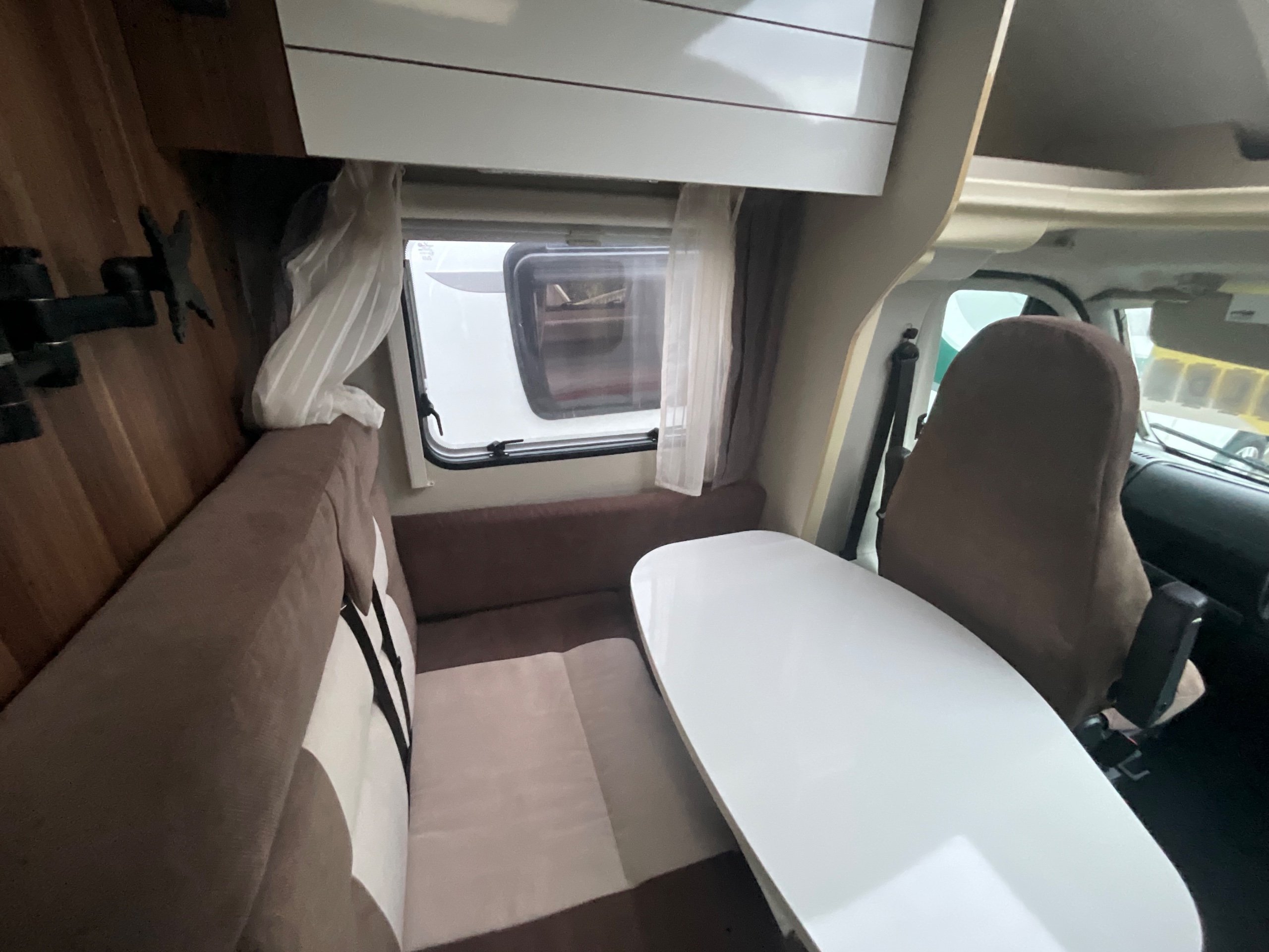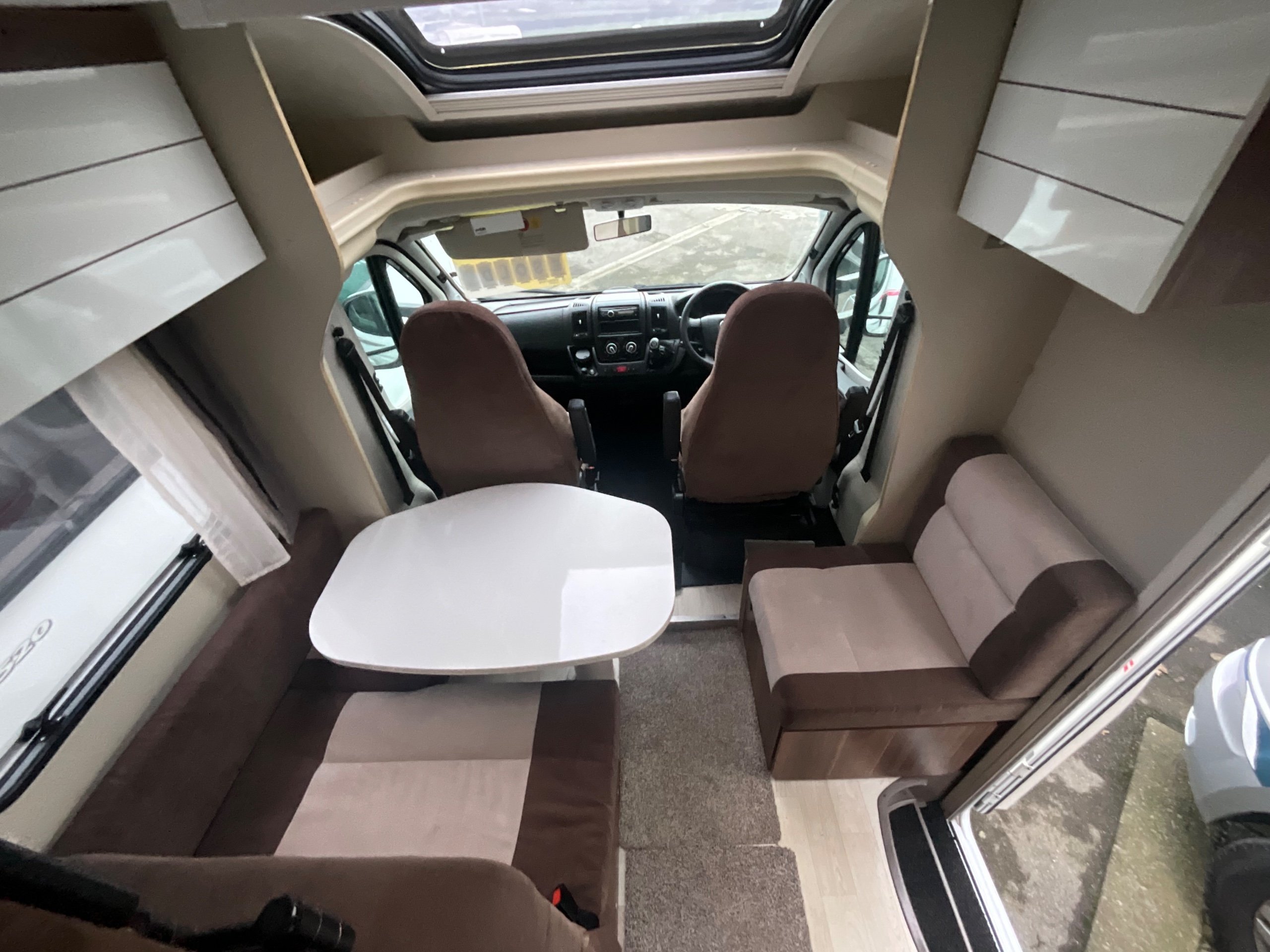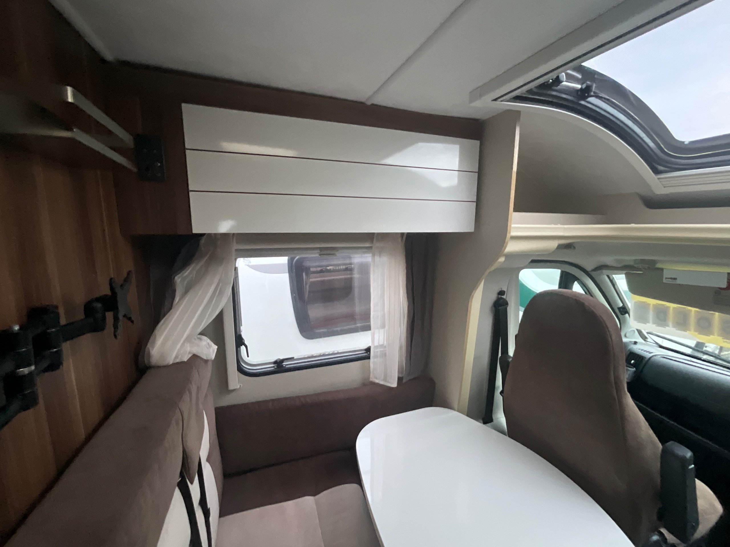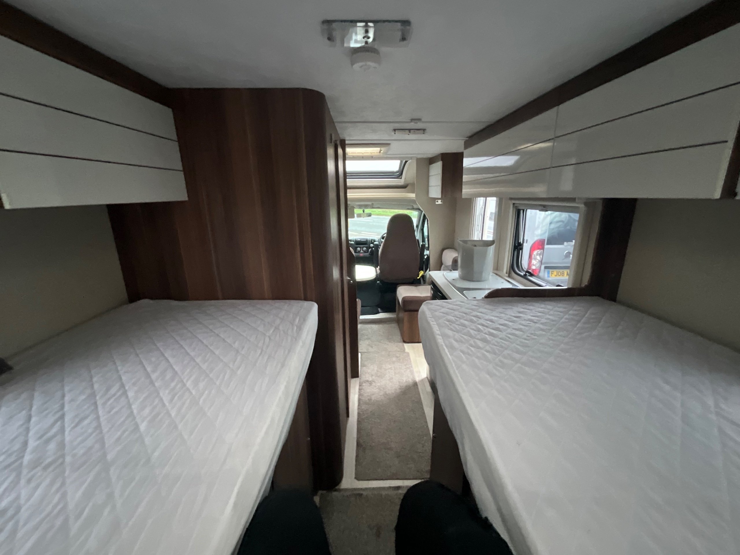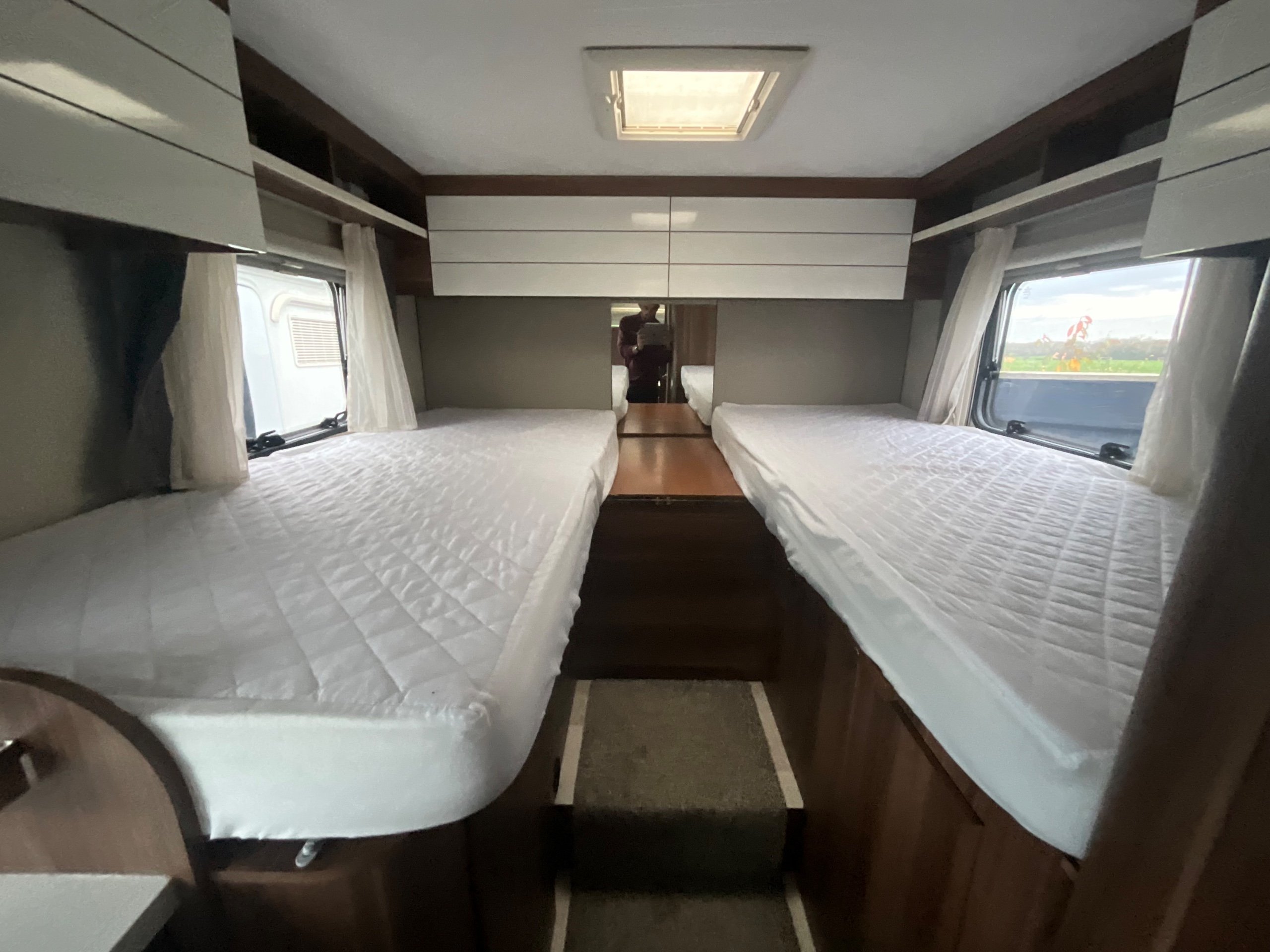 The Rollerteam 685 is a low profile, 4 Berth motorhome with Fixed Rear single Beds (which can form a double bed with the use of extensions and infill cushions) offering plenty of storage underneath the beds themselves, as well as a large garage storage underneath which can be accessed from outside with an external door on both sides. The central seating area offers many flexible options of two travelling seat belts so this Rollerteam can travel with 4 people fully belted in. This can also be a Dinette seating area with the seats (which is where the 2 seat belts are) as well as the small bench seat opposite to use for dinning when parked up with the table having sliding mechanisms to allow it to move when needed. This area can be enhanced further with both front seats having swivelling mechanisms to enlarge the seating area for dinning. Above the cab area is extra storage.