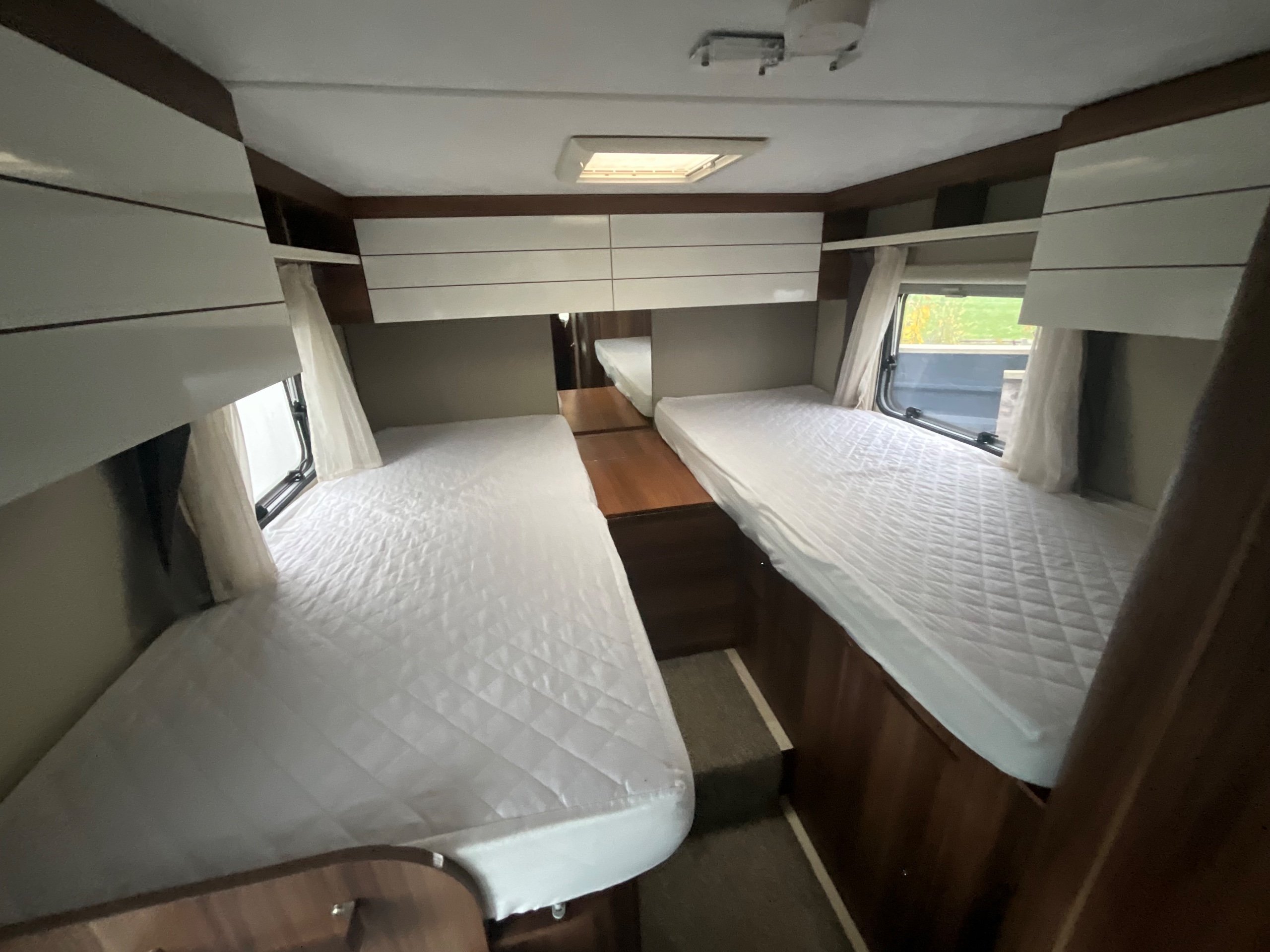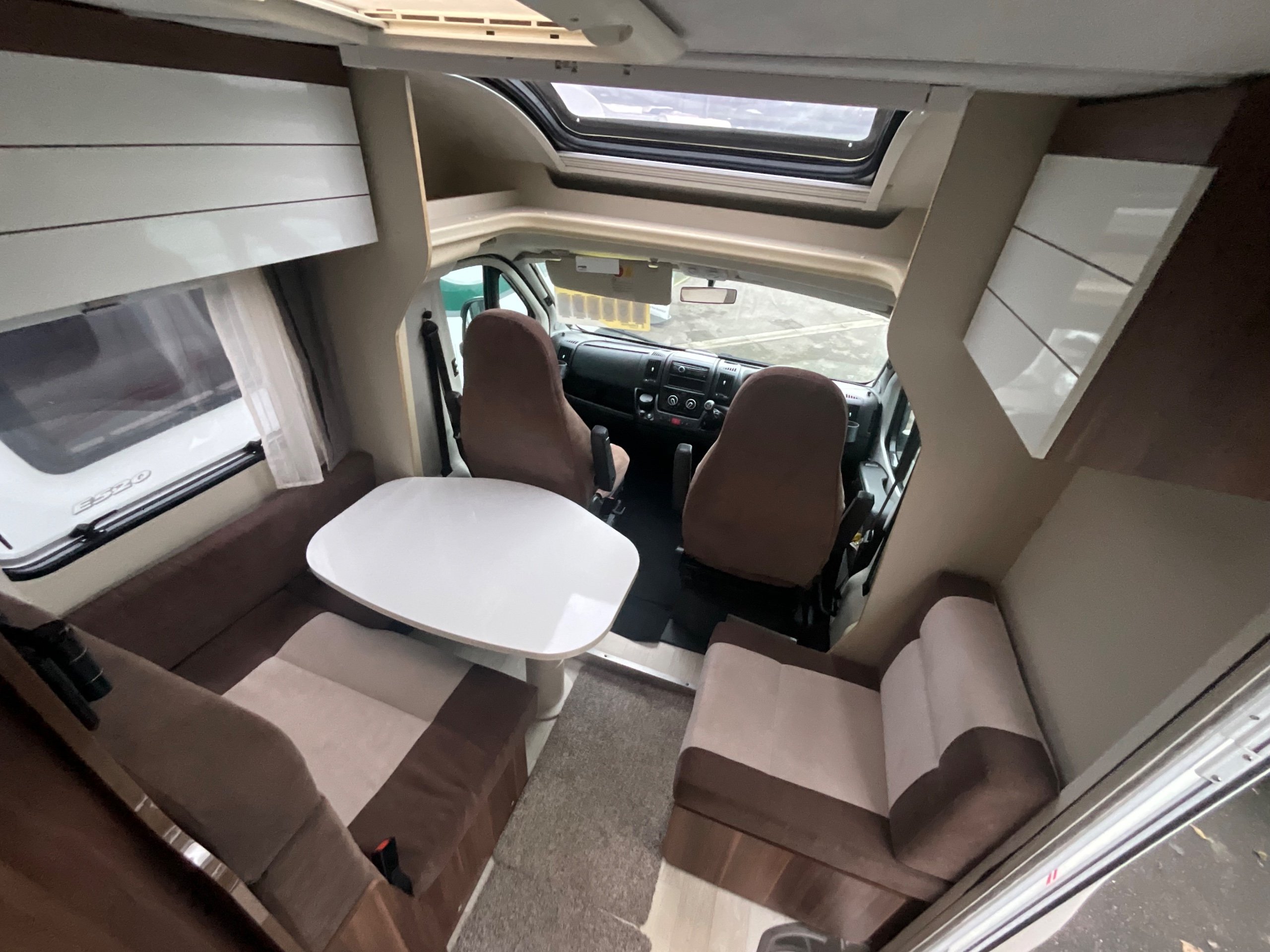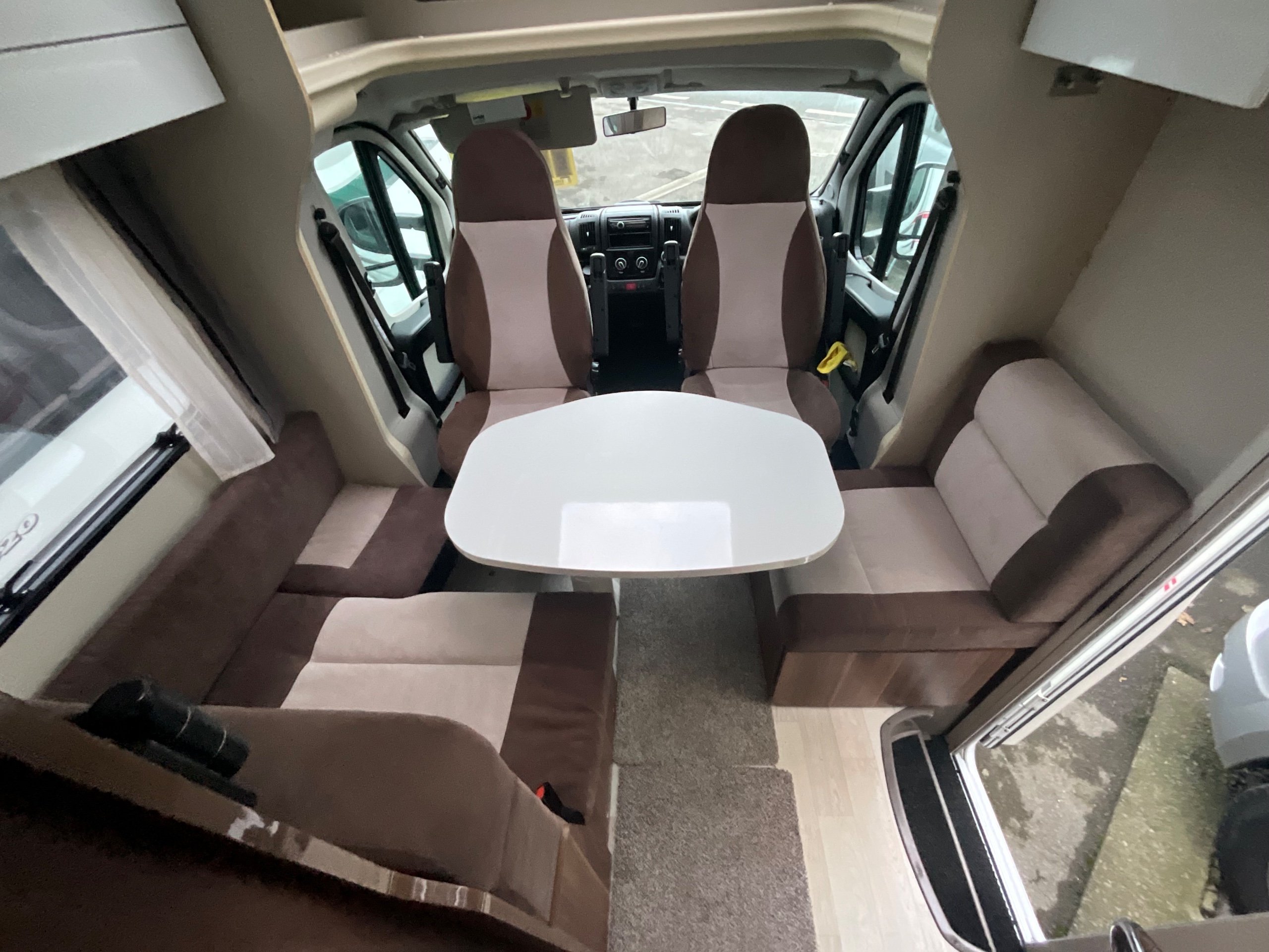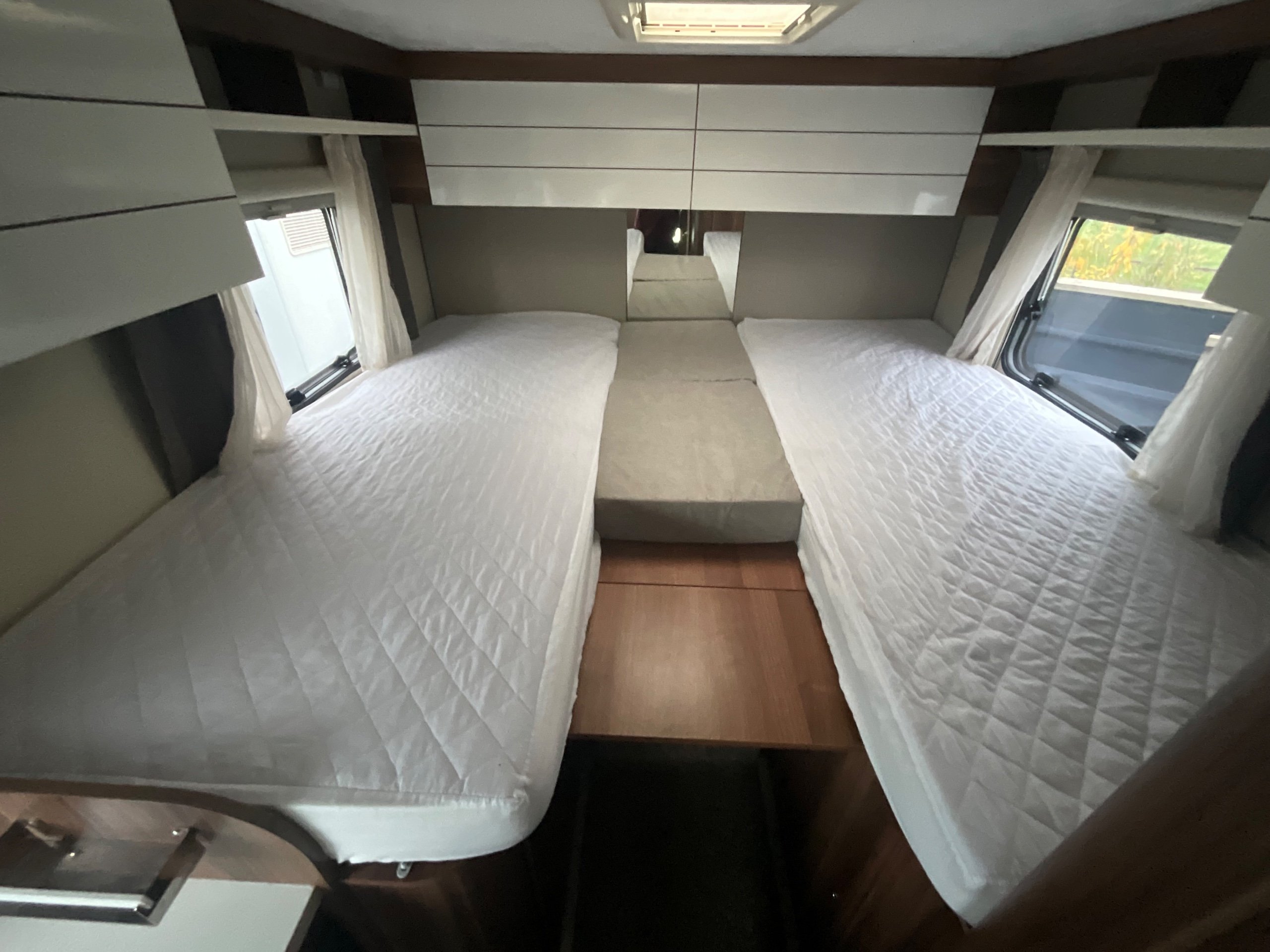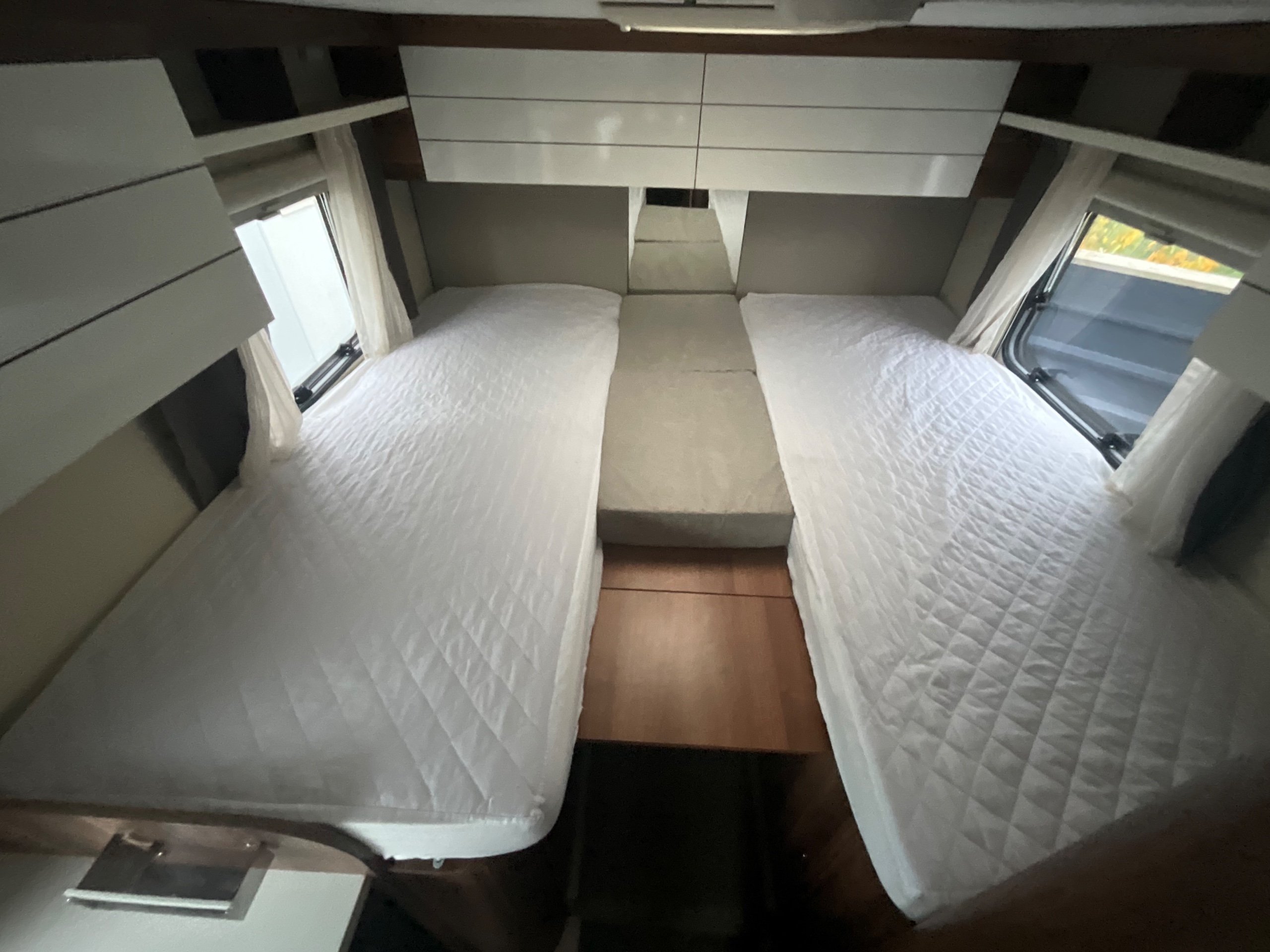 The Rollerteam 685 is a low profile, 4 Berth motorhome with Fixed Rear single Beds (which can form a double bed with the use of extensions and infill cushions) offering plenty of storage underneath the beds themselves, as well as a large garage storage underneath which can be accessed from outside with an external door on both sides. The central seating area offers many flexible options of two travelling seat belts so this Rollerteam can travel with 4 people fully belted in. This can also be a Dinette seating area with the seats (which is where the 2 seat belts are) as well as the small bench seat opposite to use for dinning when parked up with the table having sliding mechanisms to allow it to move when needed. This area can be enhanced further with both front seats having swivelling mechanisms to enlarge the seating area for dinning. Above the cab area is extra storage.