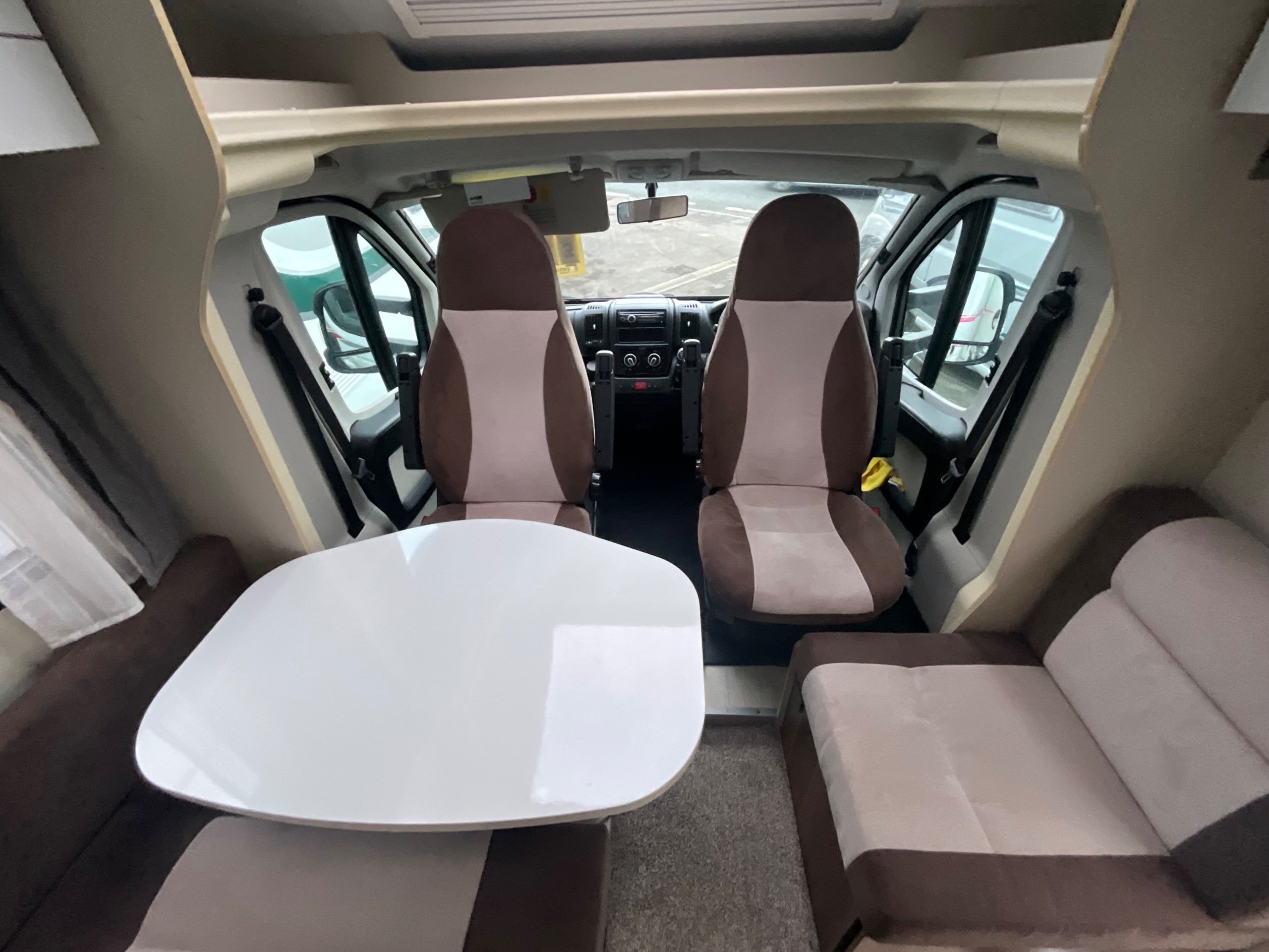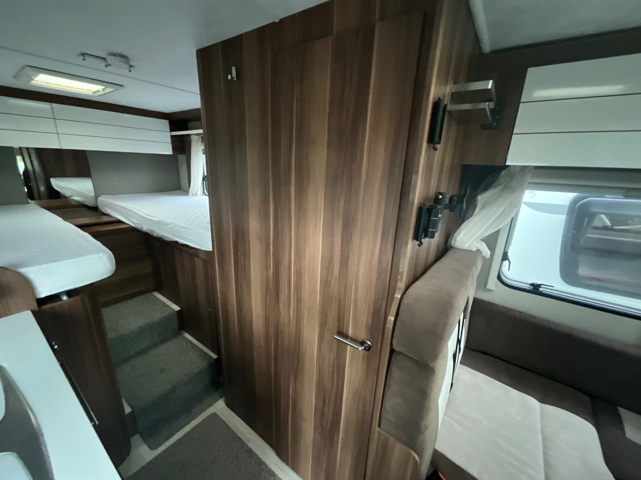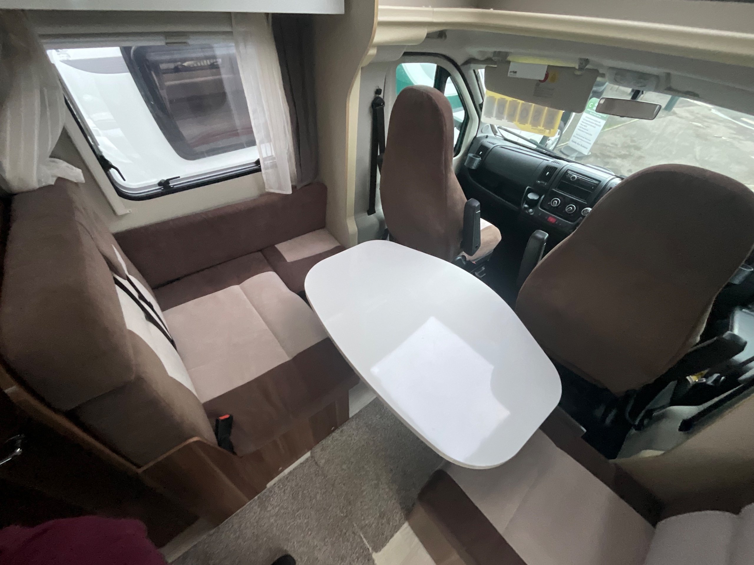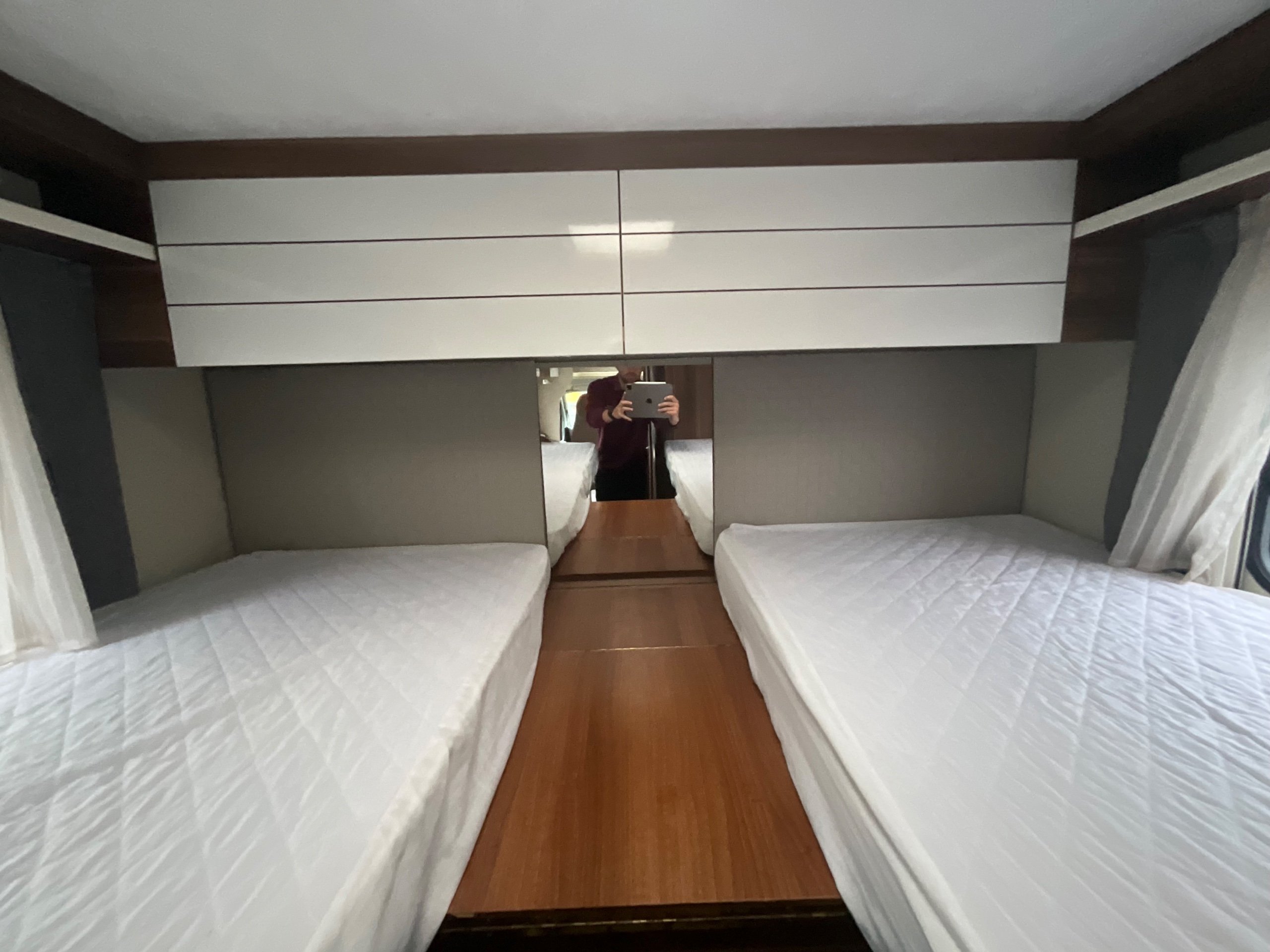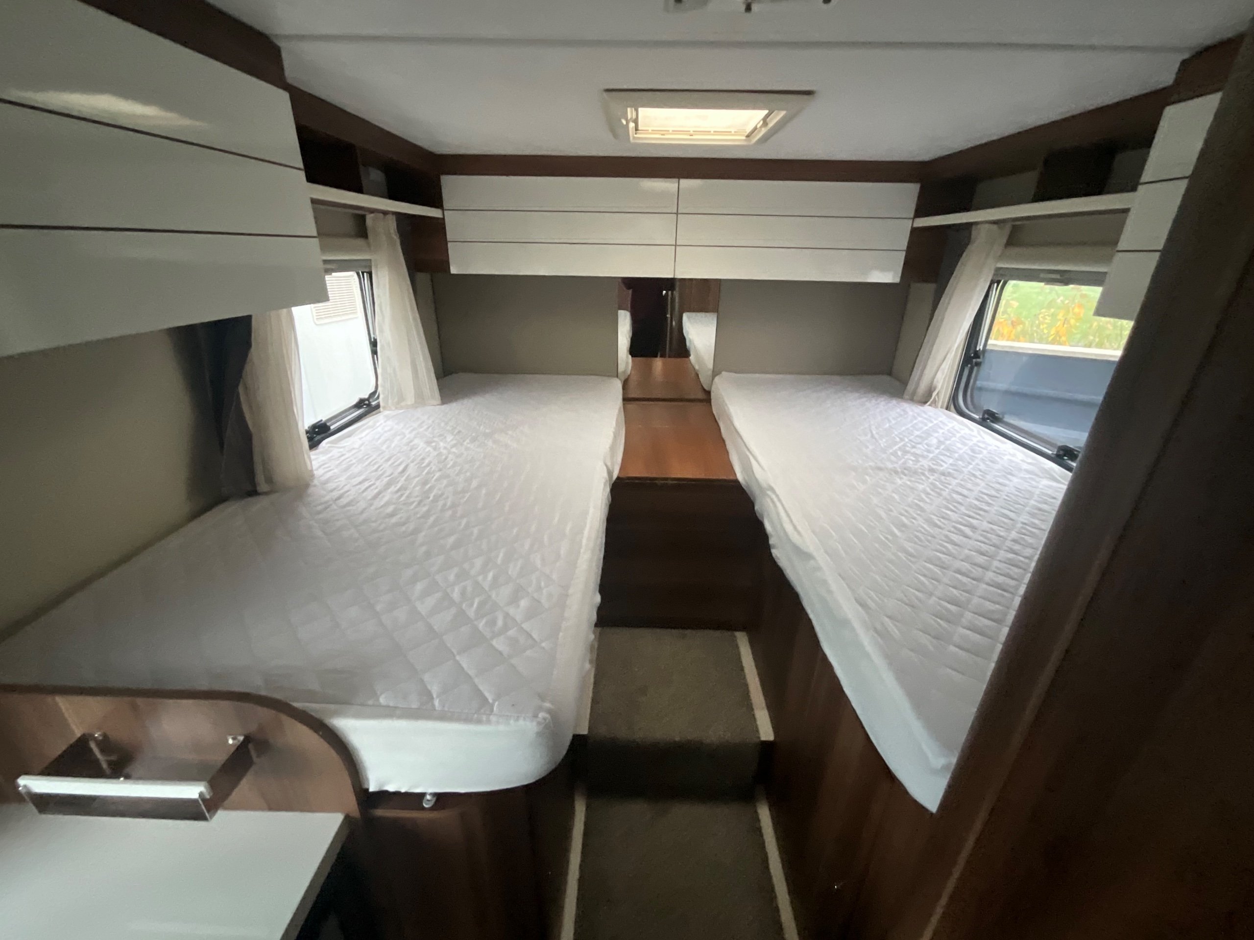 The Rollerteam 685 is a low profile, 4 Berth motorhome with Fixed Rear single Beds (which can form a double bed with the use of extensions and infill cushions) offering plenty of storage underneath the beds themselves, as well as a large garage storage underneath which can be accessed from outside with an external door on both sides. The central seating area offers many flexible options of two travelling seat belts so this Rollerteam can travel with 4 people fully belted in. This can also be a Dinette seating area with the seats (which is where the 2 seat belts are) as well as the small bench seat opposite to use for dinning when parked up with the table having sliding mechanisms to allow it to move when needed. This area can be enhanced further with both front seats having swivelling mechanisms to enlarge the seating area for dinning. Above the cab area is extra storage.