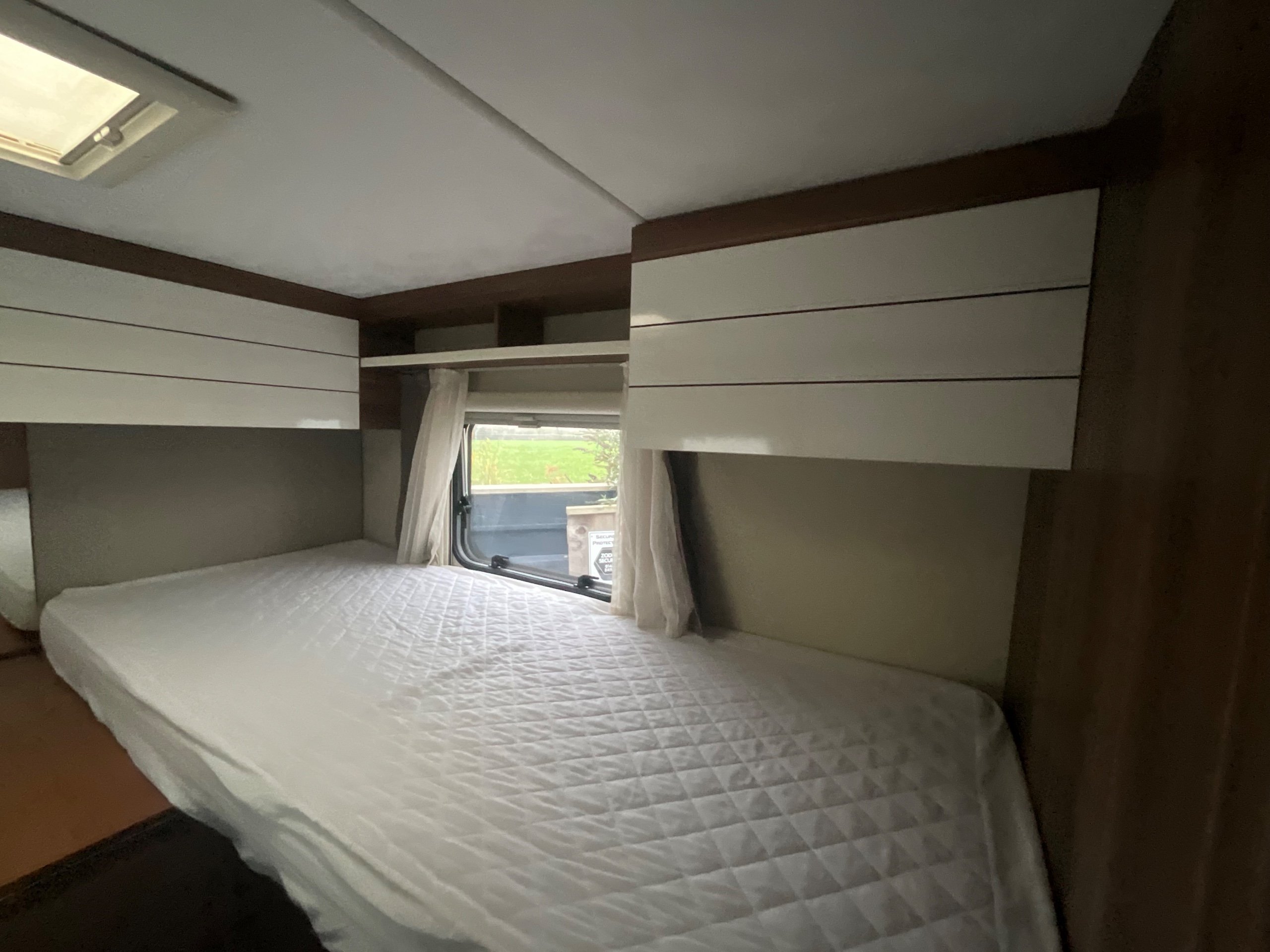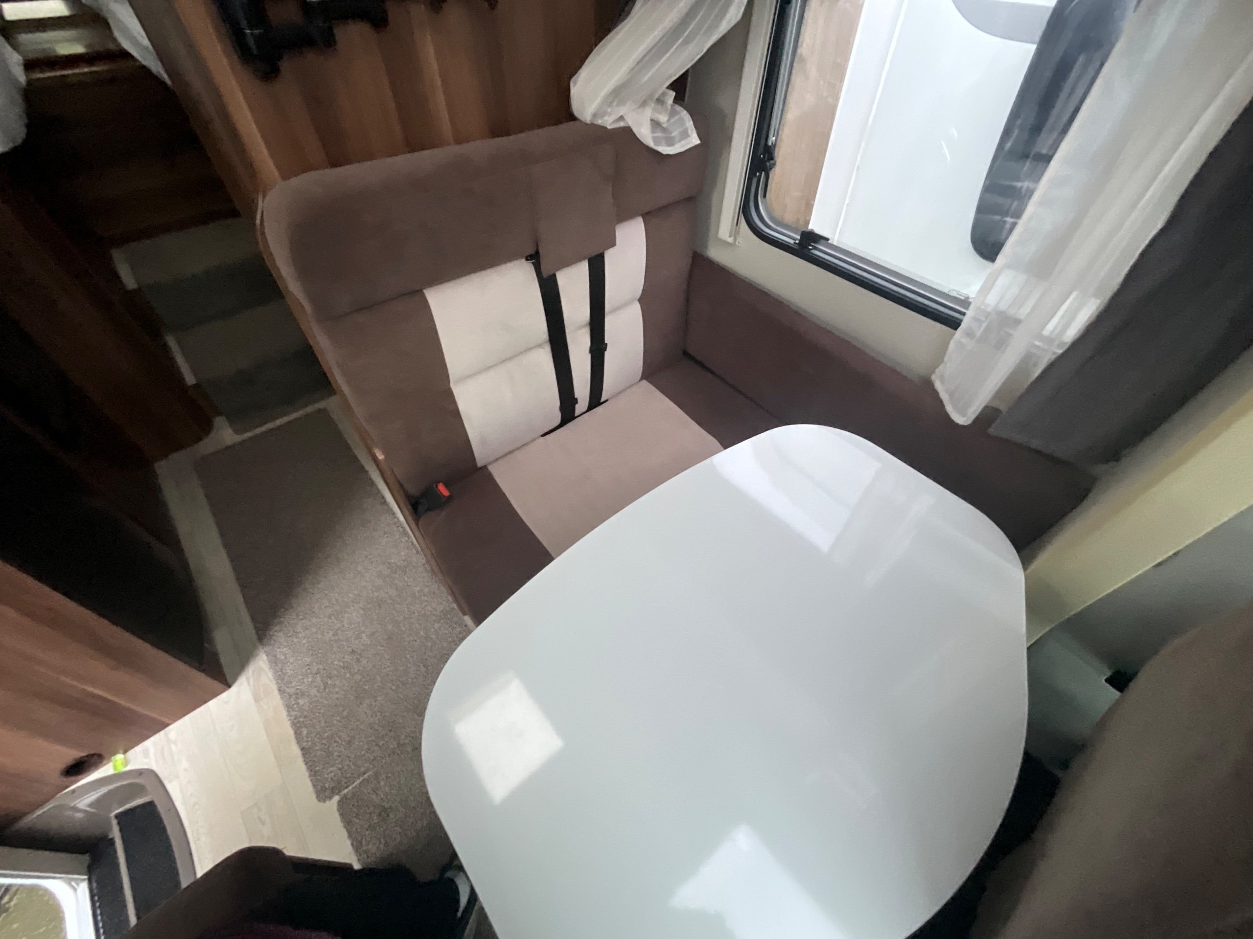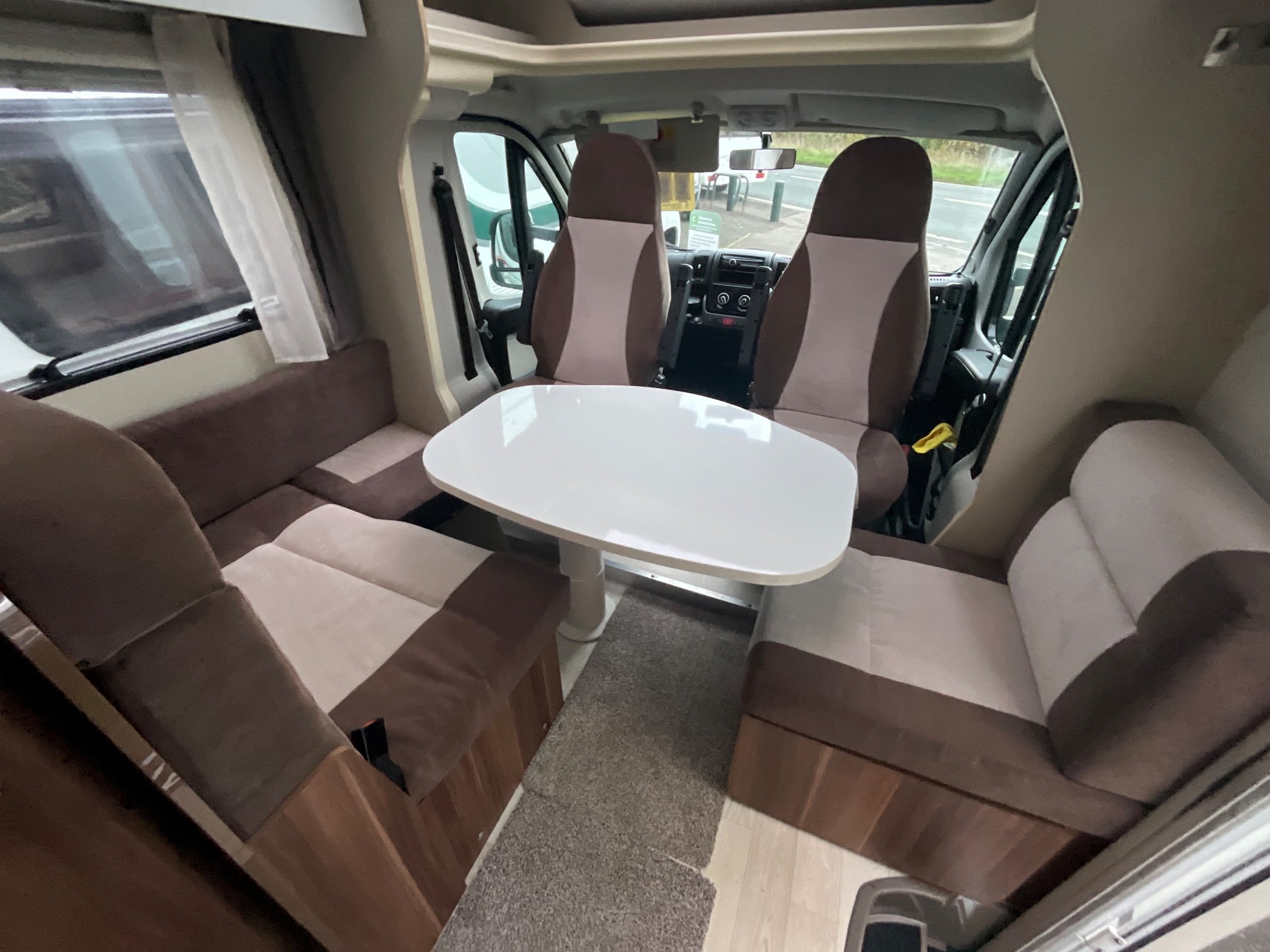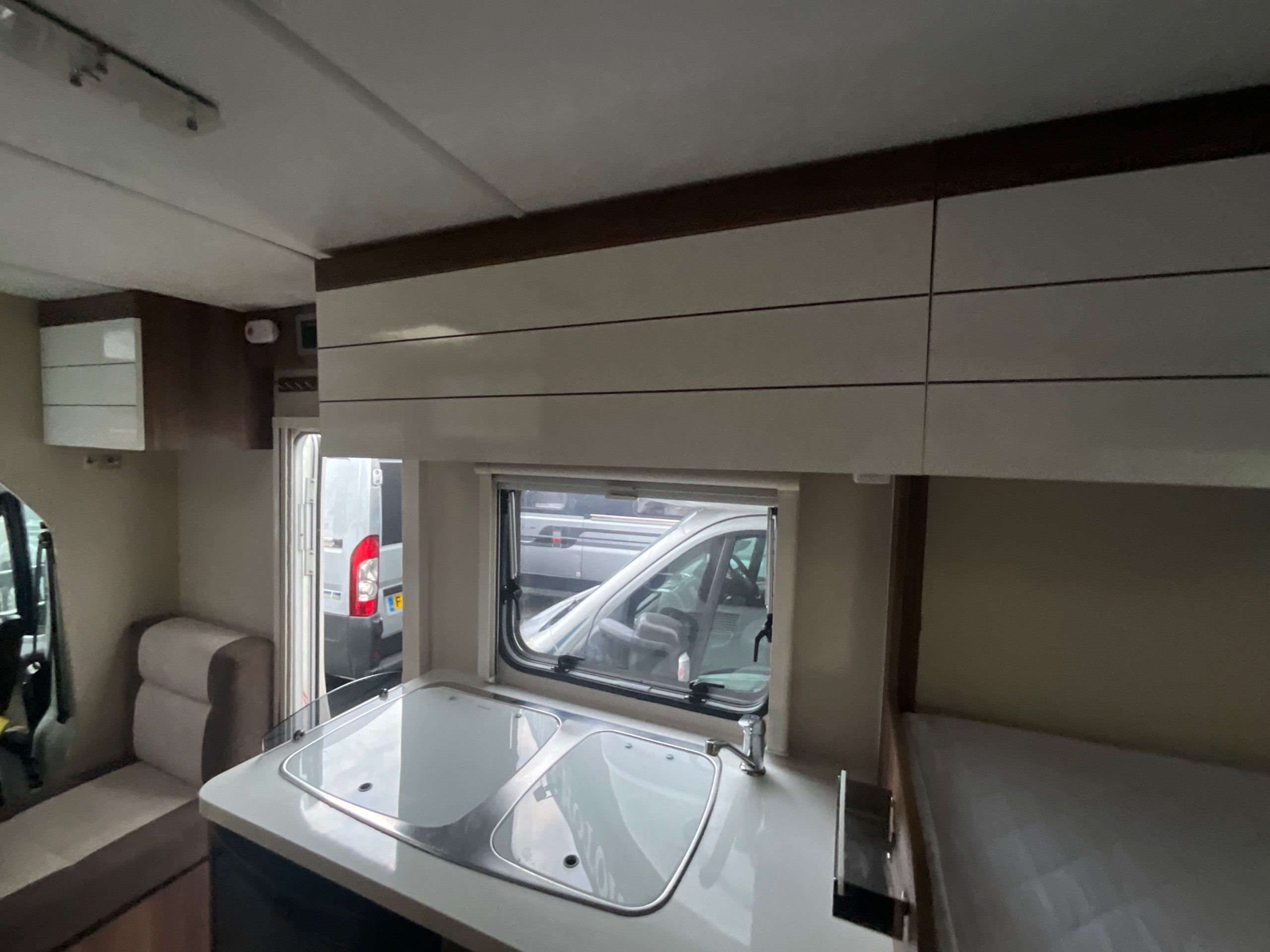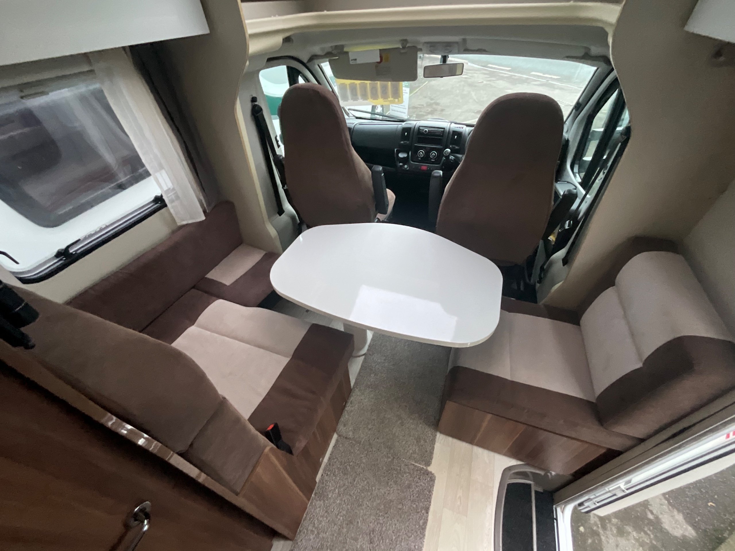 The Rollerteam 685 is a low profile, 4 Berth motorhome with Fixed Rear single Beds (which can form a double bed with the use of extensions and infill cushions) offering plenty of storage underneath the beds themselves, as well as a large garage storage underneath which can be accessed from outside with an external door on both sides. The central seating area offers many flexible options of two travelling seat belts so this Rollerteam can travel with 4 people fully belted in. This can also be a Dinette seating area with the seats (which is where the 2 seat belts are) as well as the small bench seat opposite to use for dinning when parked up with the table having sliding mechanisms to allow it to move when needed. This area can be enhanced further with both front seats having swivelling mechanisms to enlarge the seating area for dinning. Above the cab area is extra storage.