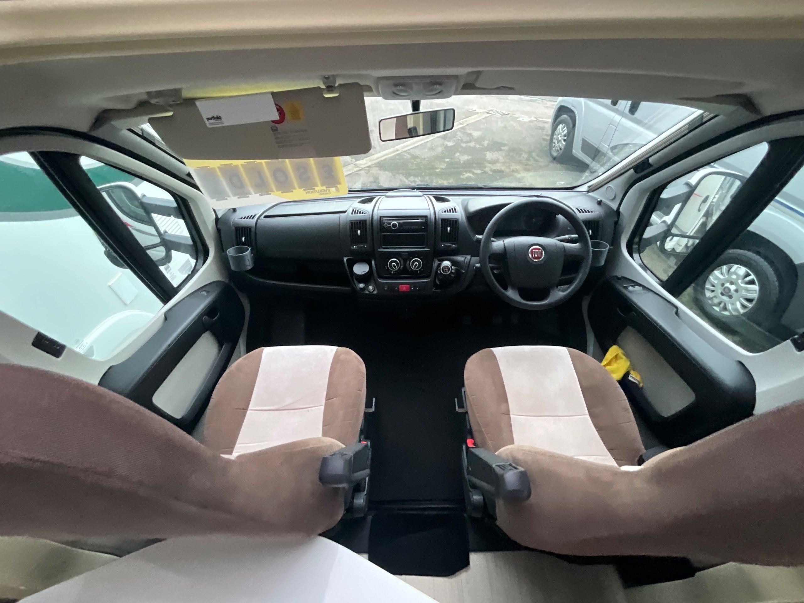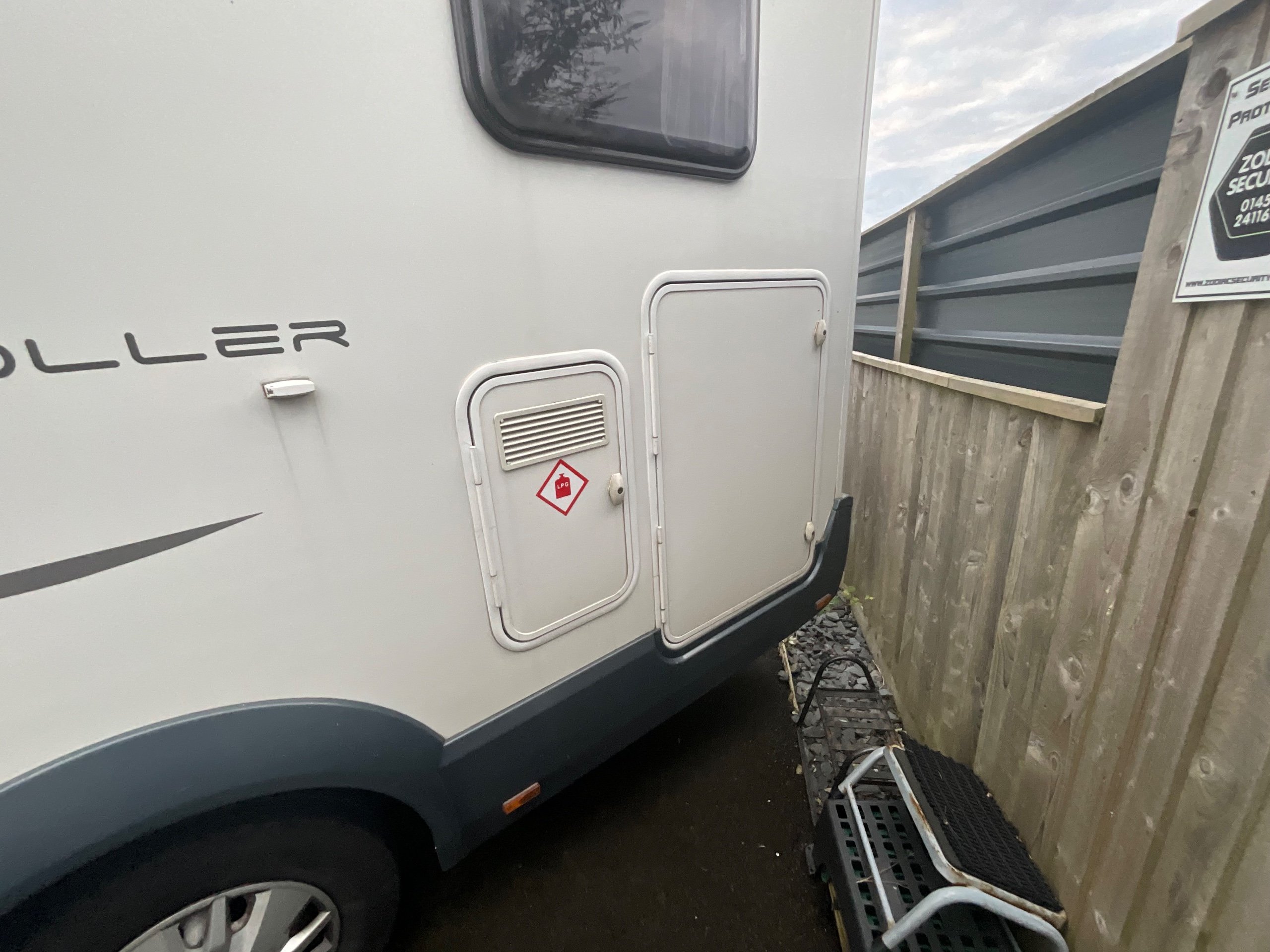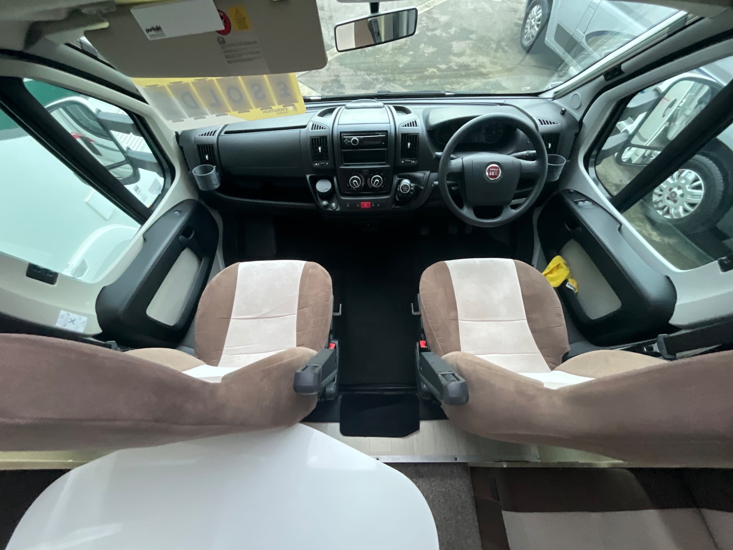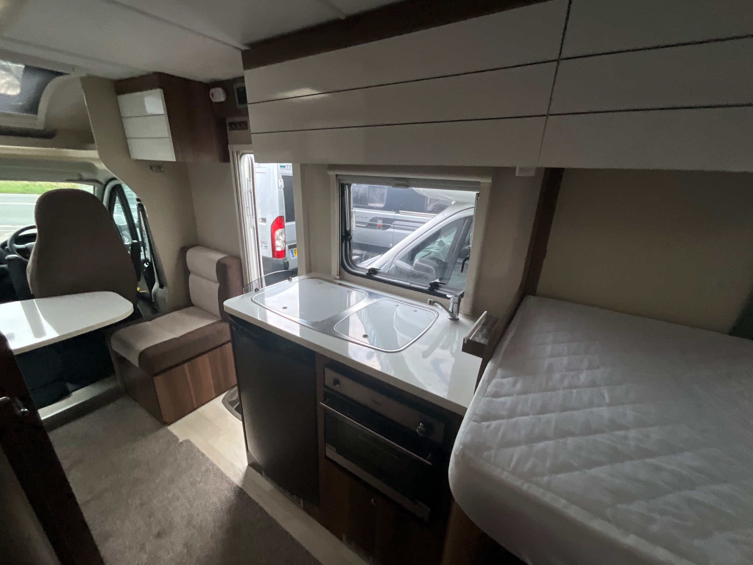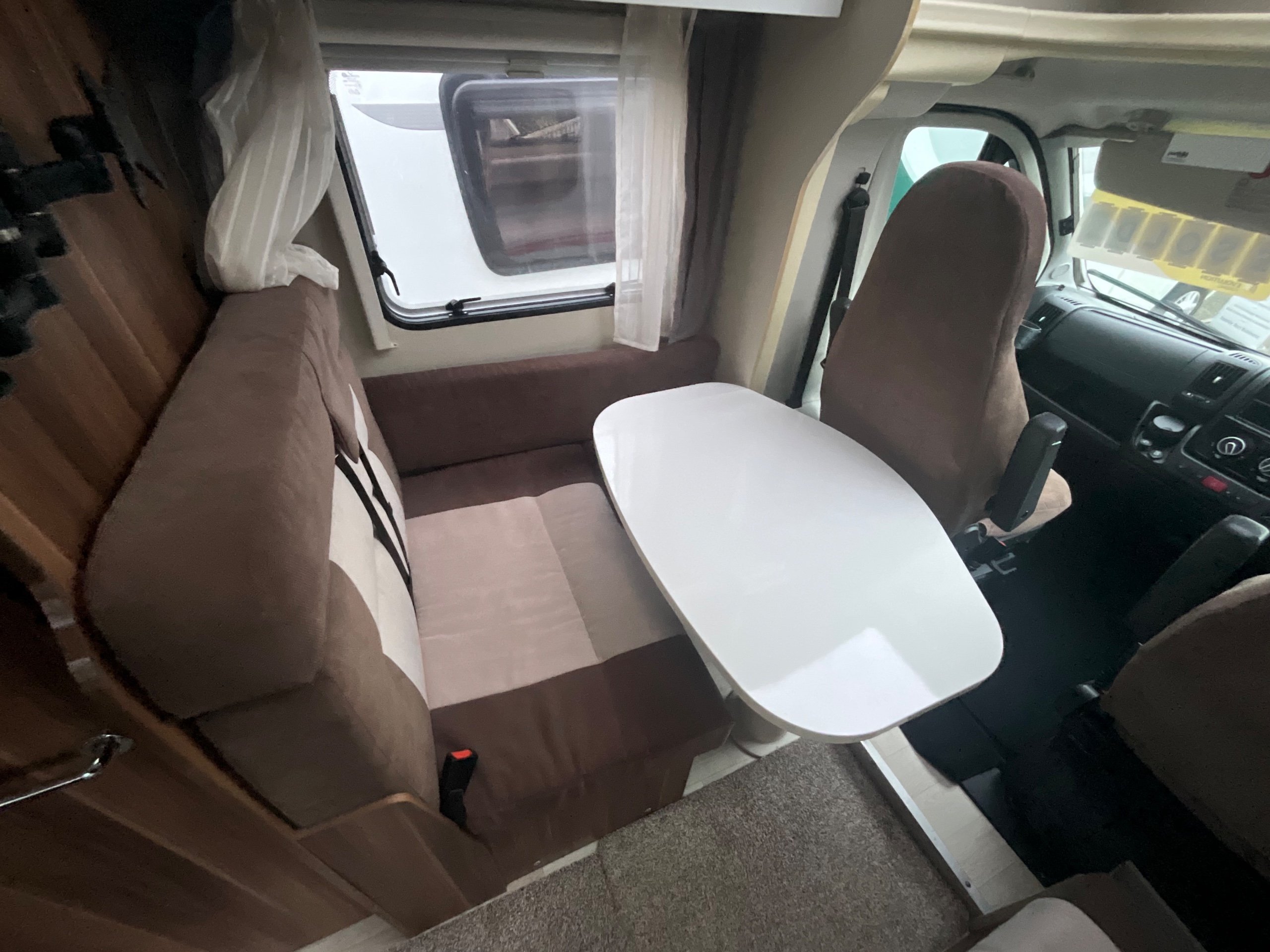 The Rollerteam 685 is a low profile, 4 Berth motorhome with Fixed Rear single Beds (which can form a double bed with the use of extensions and infill cushions) offering plenty of storage underneath the beds themselves, as well as a large garage storage underneath which can be accessed from outside with an external door on both sides. The central seating area offers many flexible options of two travelling seat belts so this Rollerteam can travel with 4 people fully belted in. This can also be a Dinette seating area with the seats (which is where the 2 seat belts are) as well as the small bench seat opposite to use for dinning when parked up with the table having sliding mechanisms to allow it to move when needed. This area can be enhanced further with both front seats having swivelling mechanisms to enlarge the seating area for dinning. Above the cab area is extra storage.